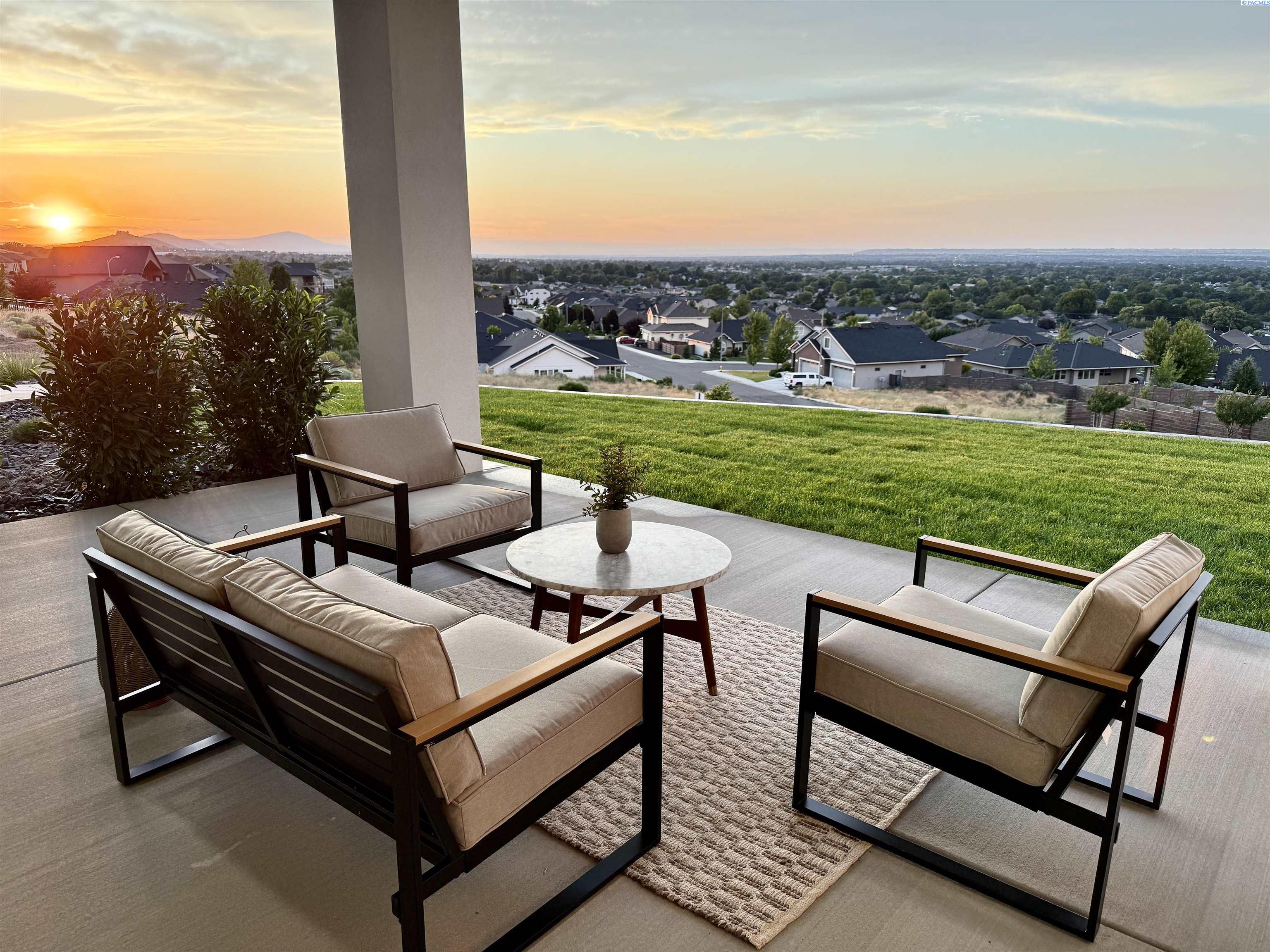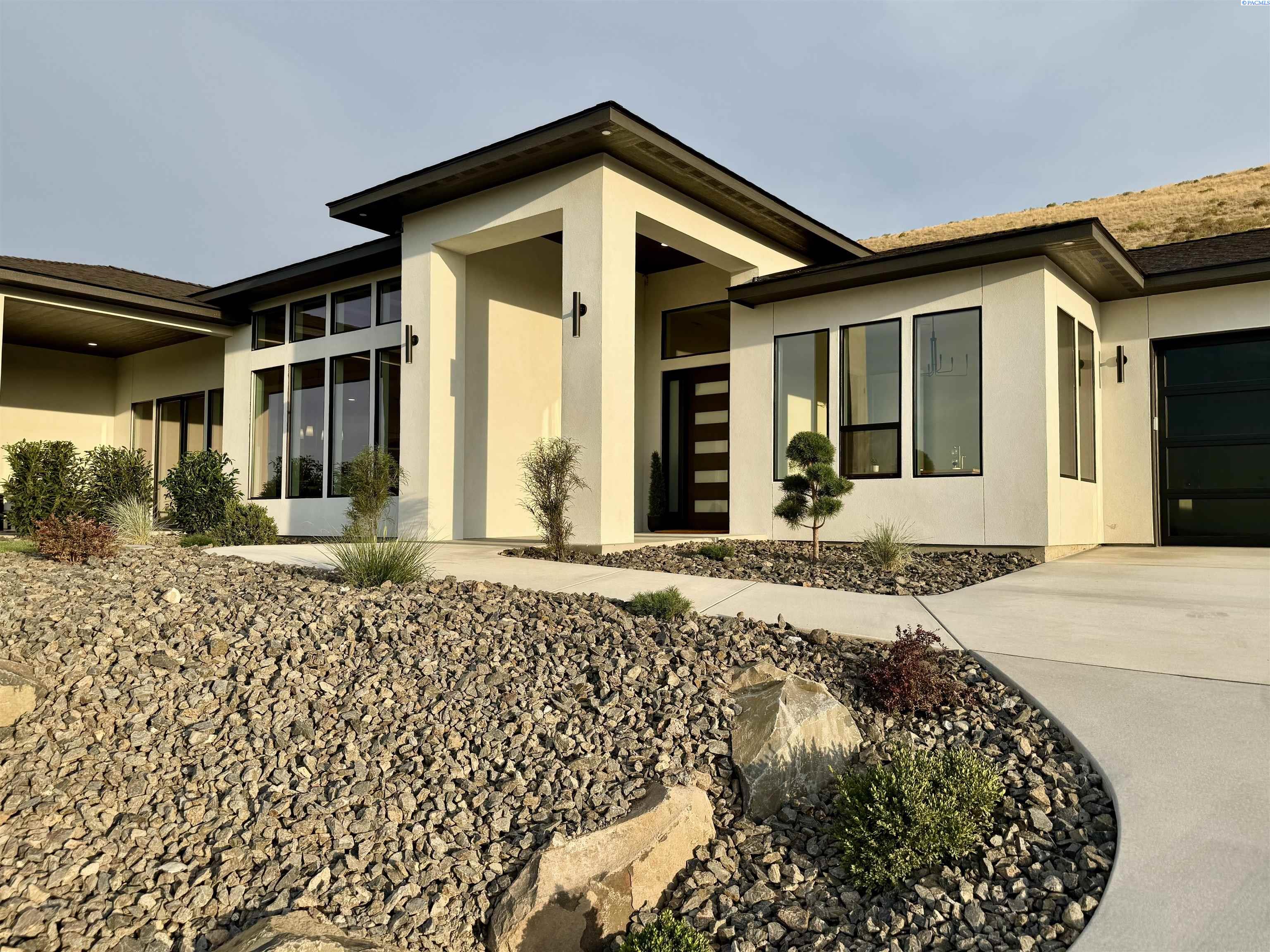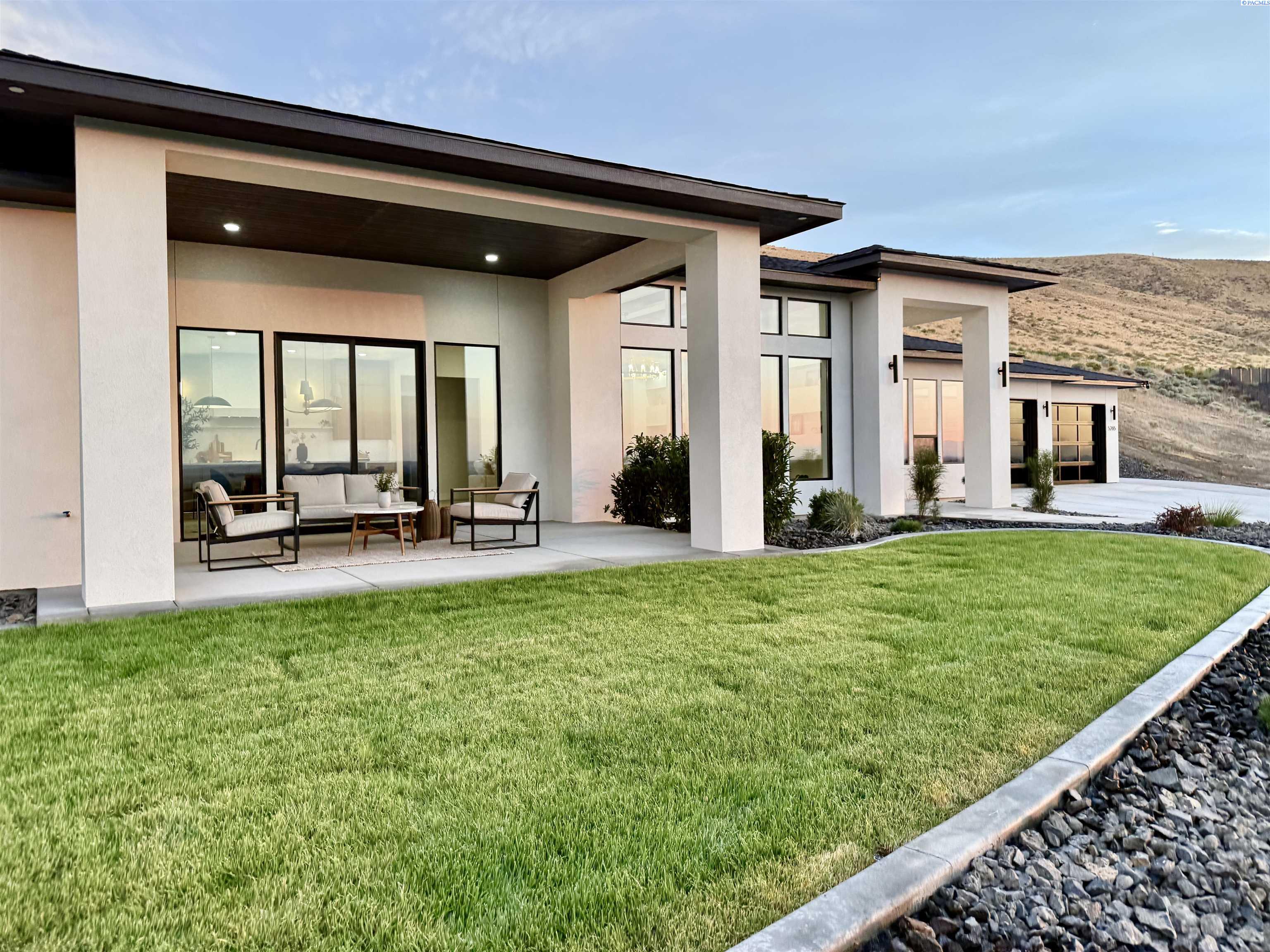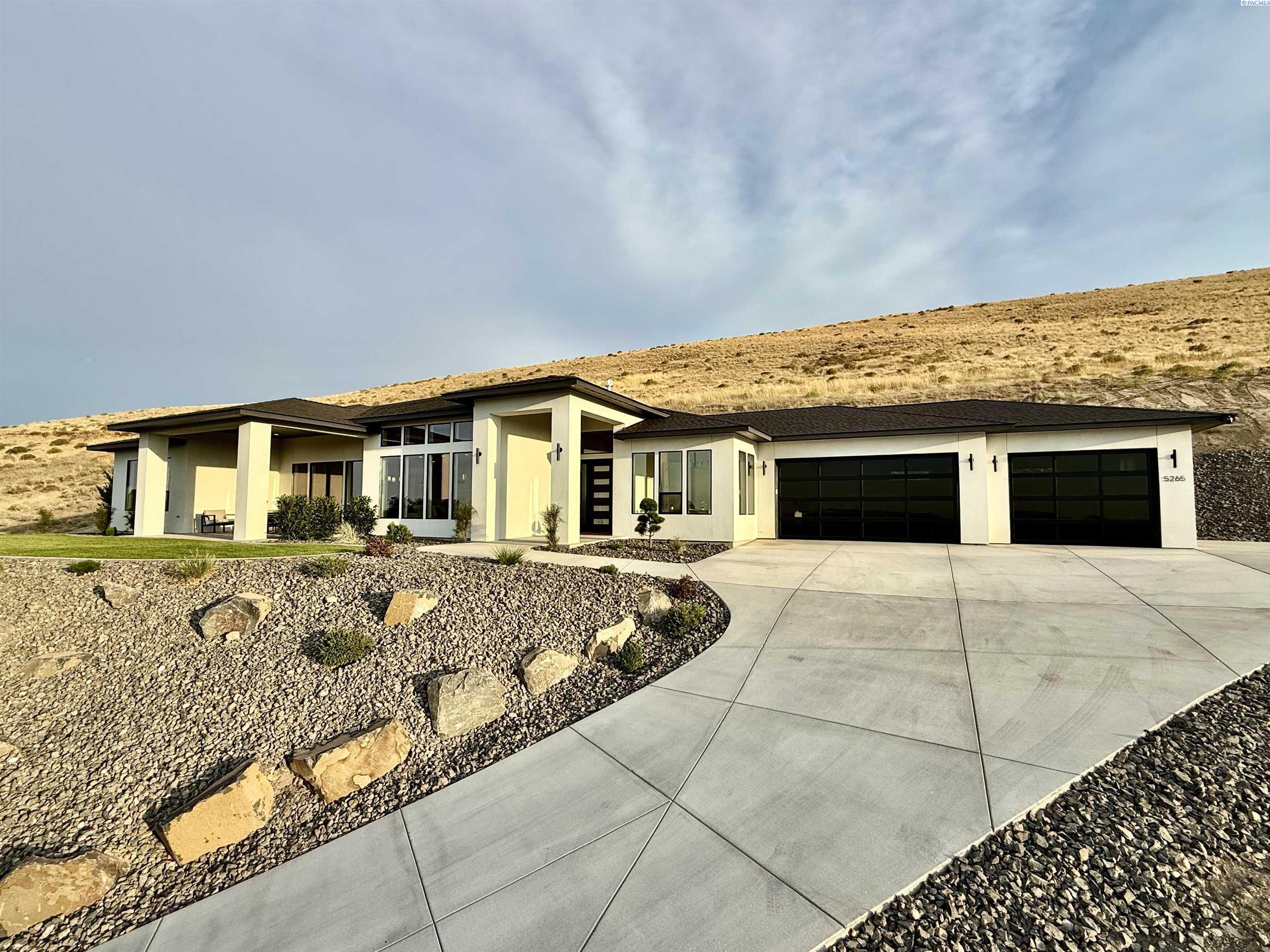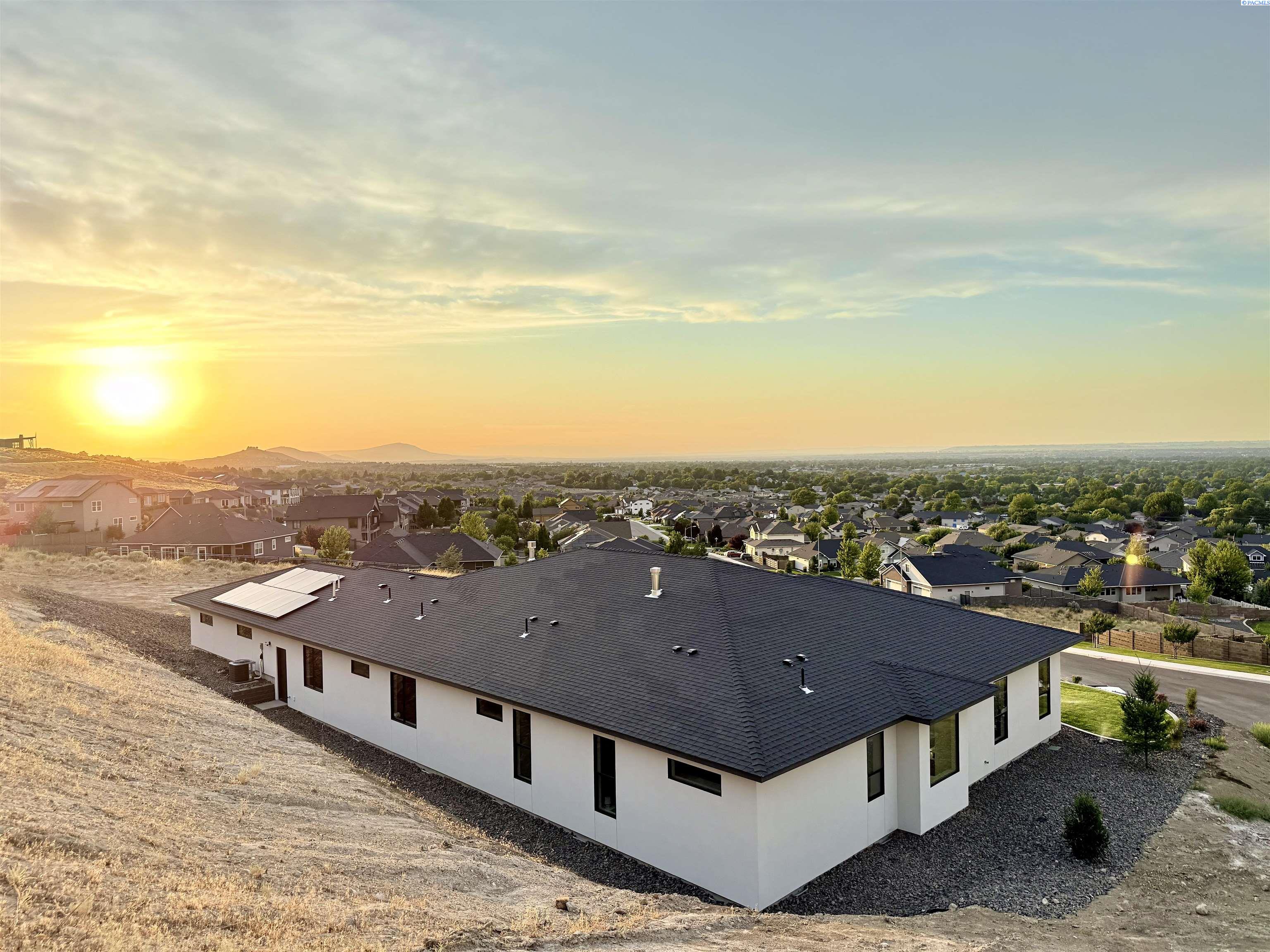 MLS# 286327 This exquisite 4-BR + Den, 3.5-BA rambler is situated in the esteemed Inspiration Estates. This home has a linear style, highlighted by black windows for you to enjoy the view sweeping from Badger Mt to the Blue Mountains, making for incredible sunrises and sunsets. The privacy-glassed, oversized garage gives extra space for projects or storage. This home comes fully landscaped with TUGS. This architectural masterpiece features a no-step entry, ensuring convenience and accessibility. The covered patio is perfect to extend your entertainment area and the BBQ stub is ready for your grill or future outdoor kitchen. The solar panels, EV outlet in garage and the tankless water heater increase energy efficiency. The designed flow starts with a grand entry foyer, leading into the Great Room with 12â ceilings, open concept with the kitchen and dining room. The fireplace is strategically placed in the hand-troweled limestone column in the Great Room with built in shelving that is illuminated by sconces. The ceiling shows off the custom beam work that shares options in an overhead lighting system and a dimmable, gold ring chandelier. Engineered white oak hardwood flooring is in main living areas and Berber carpet in the bedrooms. All bathrooms are tiled âno fiberglass here! There are Quartz countertops throughout the kitchen, bathrooms and Mudroom. Creating in this kitchen will be a total joy with the Z-Line 48â SS Professional Range/Oven with Champagne Bronze Accents. It has an electric Double oven with 6.7 cu ft for larger cooking and a side, baking oven. The 8 auto-re ignition gas burners combine the elegance of a hand-finished porcelain cooktop with an electric convection oven. Sconces are placed on either side of the limestone vent hood for ambiance. Matching Z-Line Drawer Microwave and Dishwasher compliment this impressive look. Custom stained cabinets are showcased with the toe-kick lighting, and under island lighting as well. The 10â x 4â quartz waterfall island has full cabinet storage beneath. The pantry has generous shelving. The Main BR is spacious and has breathtaking views. The Ownerâs Bath is welcoming and set apart by a privacy-tinted glass sliding door; featuring a makeup bar with lighted mirror, tiled shower with undershelf lighting, free-standing tub with chandelier, built in shelving with dimmable lighting, large closet with custom shelving, and separate area for the Owners Washer/Dryer. 2 yr snow removal included with full price.