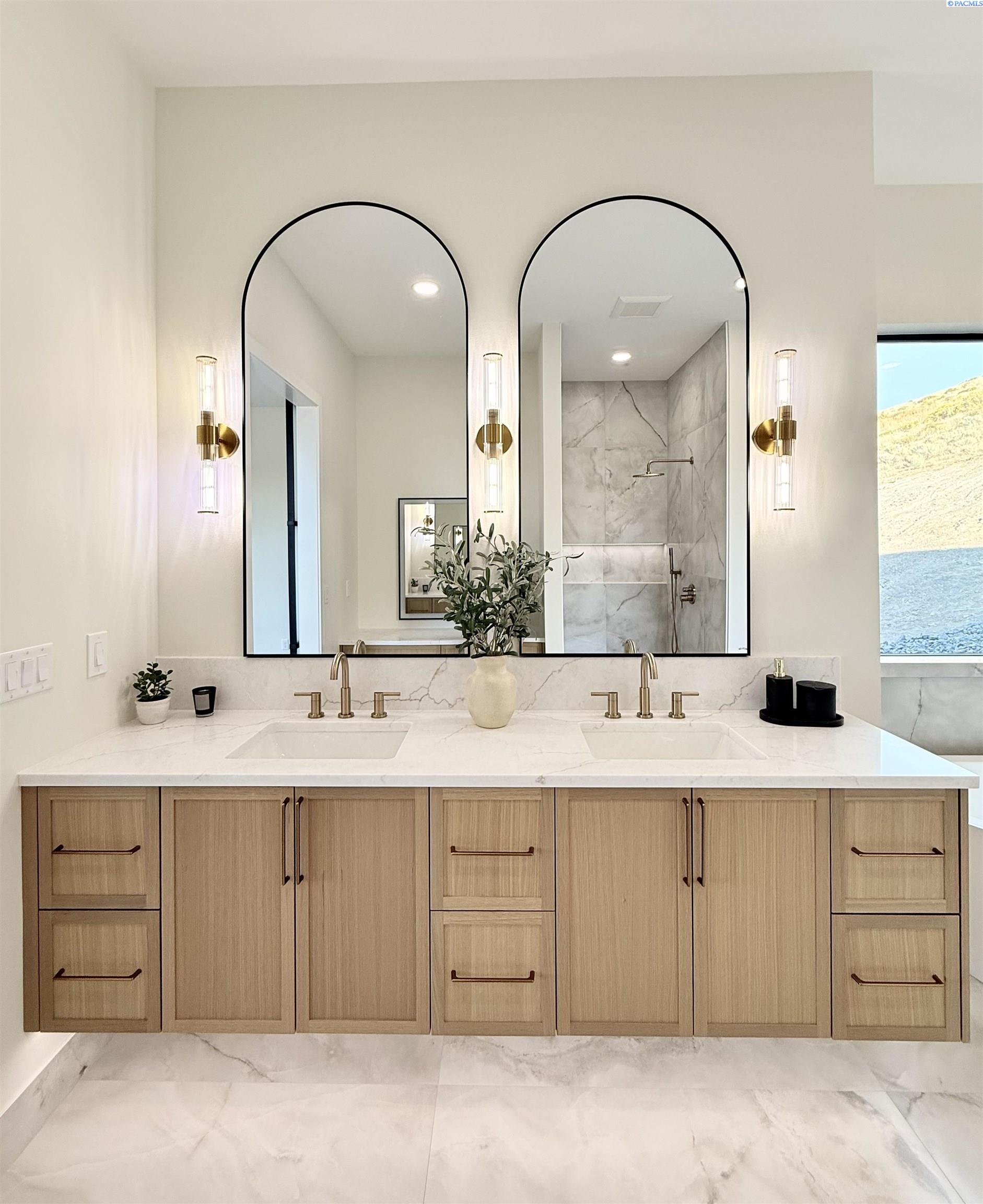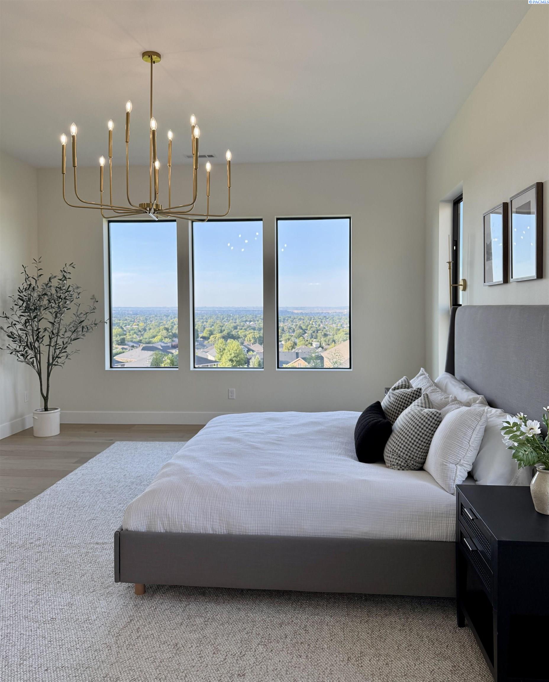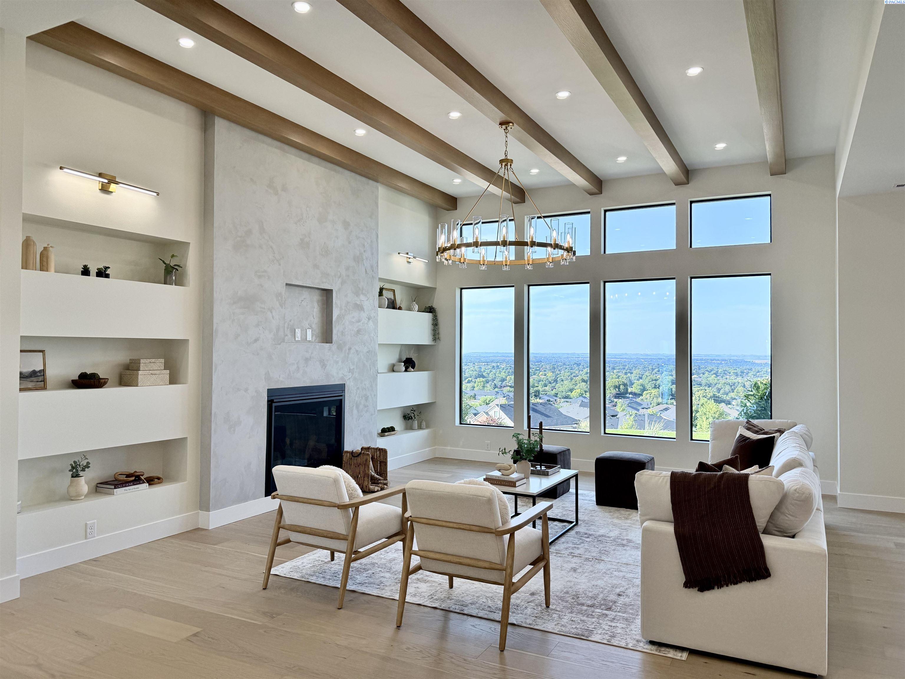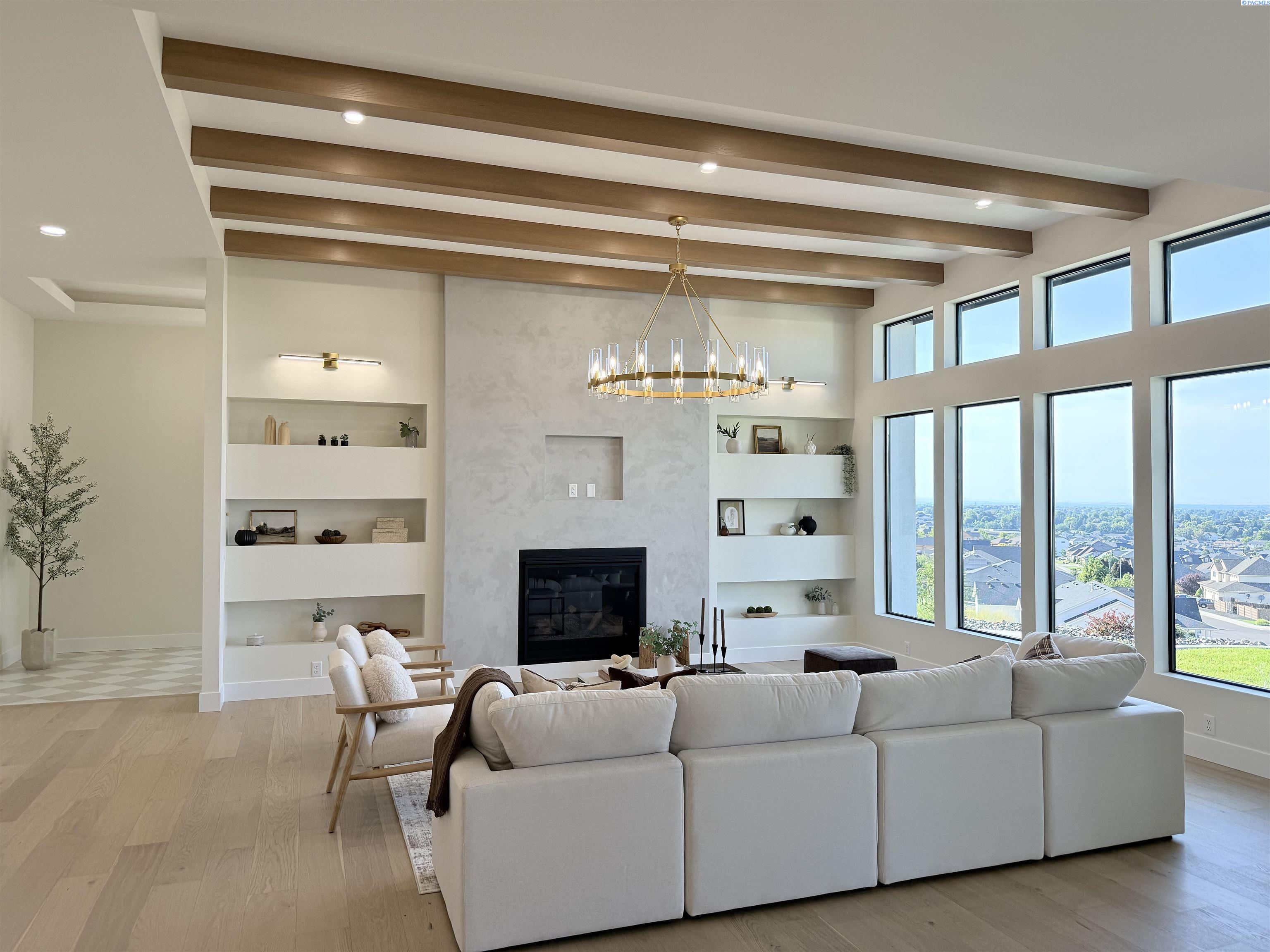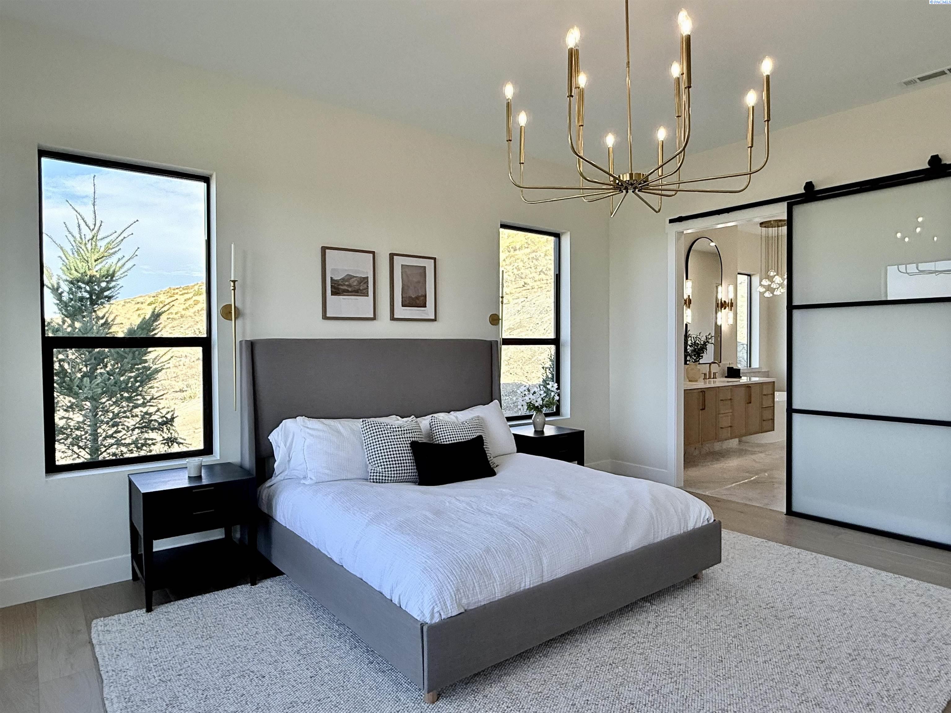 MLS# 286327 This exquisite 4-BR + Den, 3.5-BA rambler is situated in the esteemed Inspiration Estates. This home has a linear style, highlighted by black windows for you to enjoy the view sweeping from Badger Mt to the Blue Mountains, making for incredible sunrises and sunsets. The privacy-glassed, oversized garage gives extra space for projects or storage. This home comes fully landscaped with TUGS. This architectural masterpiece features a no-step entry, ensuring convenience and accessibility. The covered patio is perfect to extend your entertainment area and the BBQ stub is ready for your grill or future outdoor kitchen. The solar panels, EV outlet in garage and the tankless water heater increase energy efficiency. The designed flow starts with a grand entry foyer, leading into the Great Room with 12â ceilings, open concept with the kitchen and dining room. The fireplace is strategically placed in the hand-troweled limestone column in the Great Room with built in shelving that is illuminated by sconces. The ceiling shows off the custom beam work that shares options in an overhead lighting system and a dimmable, gold ring chandelier. Engineered white oak hardwood flooring is in main living areas and Berber carpet in the bedrooms. All bathrooms are tiled âno fiberglass here! There are Quartz countertops throughout the kitchen, bathrooms and Mudroom. Creating in this kitchen will be a total joy with the Z-Line 48â SS Professional Range/Oven with Champagne Bronze Accents. It has an electric Double oven with 6.7 cu ft for larger cooking and a side, baking oven. The 8 auto-re ignition gas burners combine the elegance of a hand-finished porcelain cooktop with an electric convection oven. Sconces are placed on either side of the limestone vent hood for ambiance. Matching Z-Line Drawer Microwave and Dishwasher compliment this impressive look. Custom stained cabinets are showcased with the toe-kick lighting, and under island lighting as well. The 10â x 4â quartz waterfall island has full cabinet storage beneath. The pantry has generous shelving. The Main BR is spacious and has breathtaking views. The Ownerâs Bath is welcoming and set apart by a privacy-tinted glass sliding door; featuring a makeup bar with lighted mirror, tiled shower with undershelf lighting, free-standing tub with chandelier, built in shelving with dimmable lighting, large closet with custom shelving, and separate area for the Owners Washer/Dryer. 2 yr snow removal included with full price.