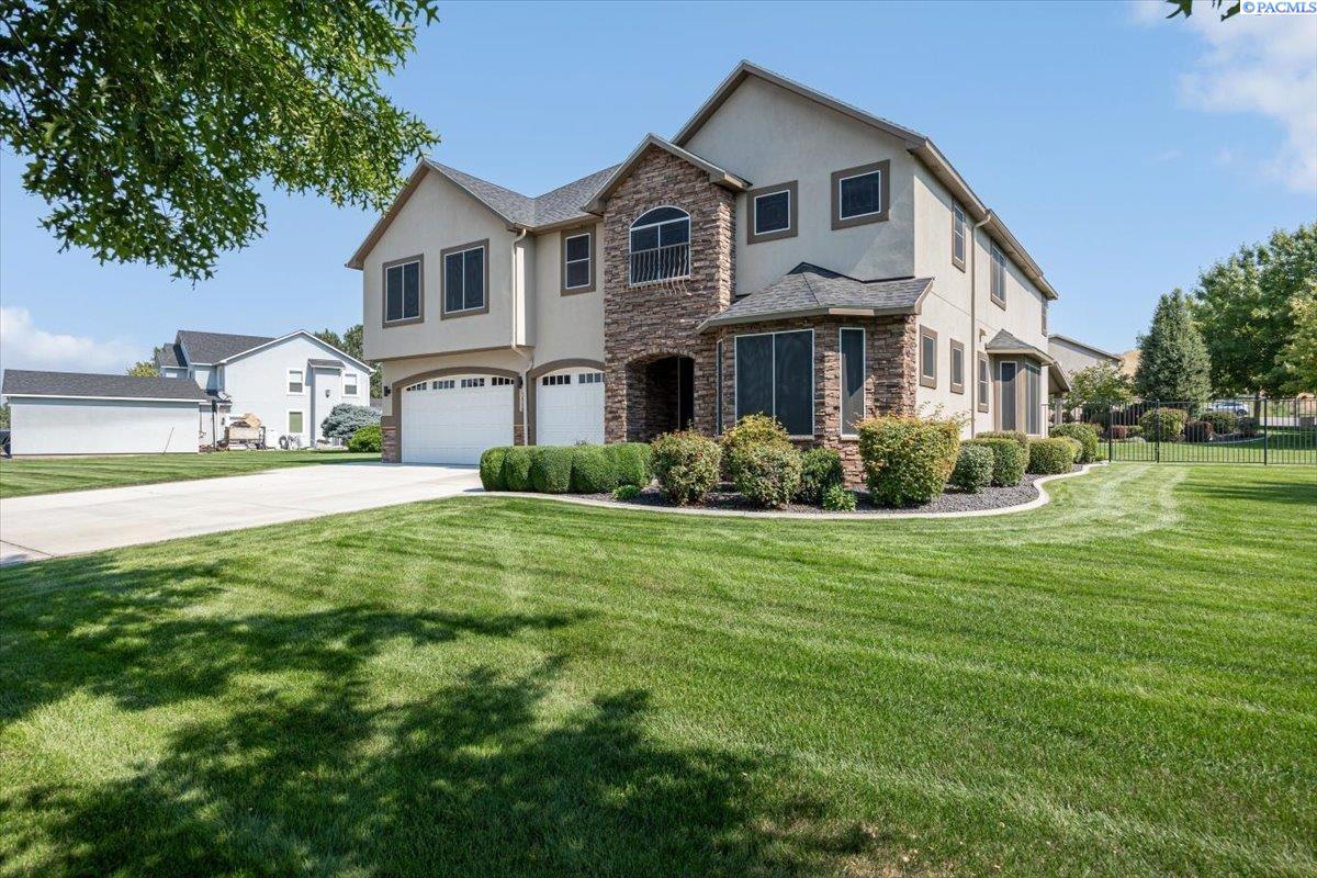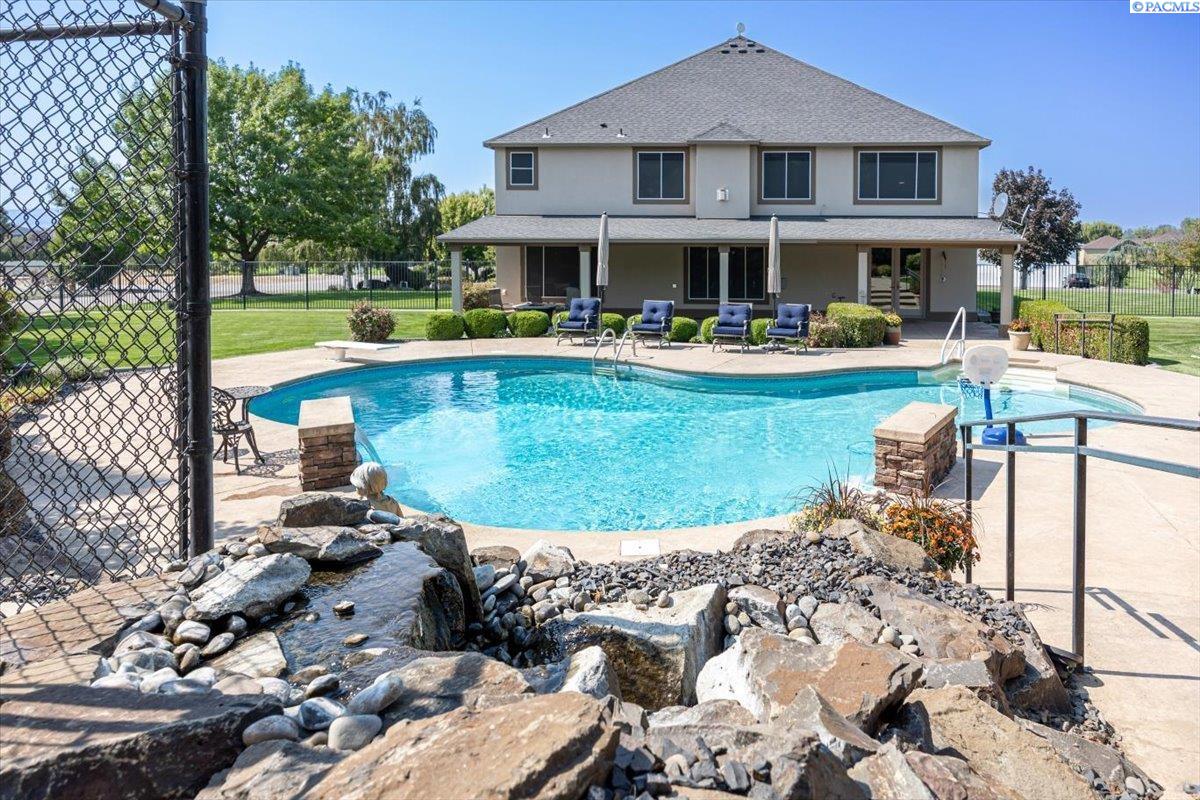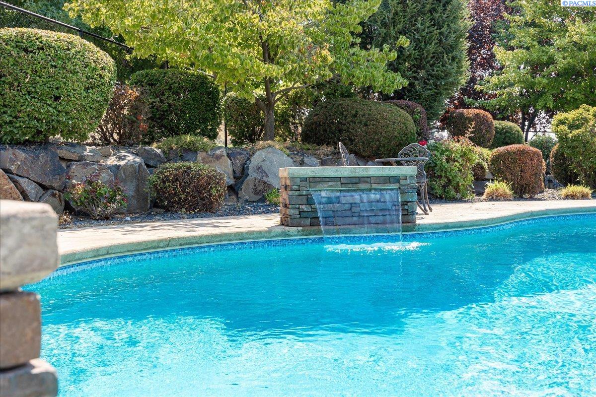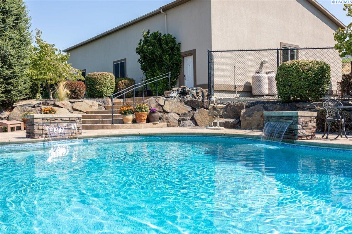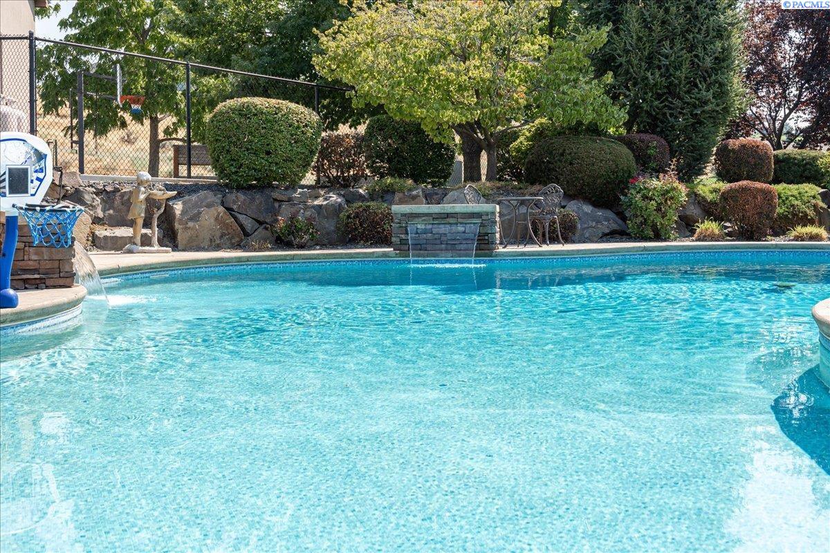 MLS #287676- Discover a stunning and spacious home on a lush one-acre lot near the river. This beautiful home features well-manicured grounds with a grand pool, serene water features, a cozy fire pit, and a covered patio perfect for entertaining. The hot tub hookup is ready for the spa of your dreams. A spacious, insulated, heated 40x60 shop with high ceilings and built-in shelves. The cul-de-sac driveway leading to the shop makes parking a breeze. Don't miss the basketball half court next to the shop. Inside, find rich hardwood floors, an open-concept kitchen with granite countertops, a pantry, two ovens, and options for eat-in or formal dining. The living room boasts a double-sided fireplace into the office, which has a built-in desk and book shelves. The master suite shines with vaulted ceilings, a sitting room, oversized bathroom, and a walk-in closet. Donât miss out on this gem!