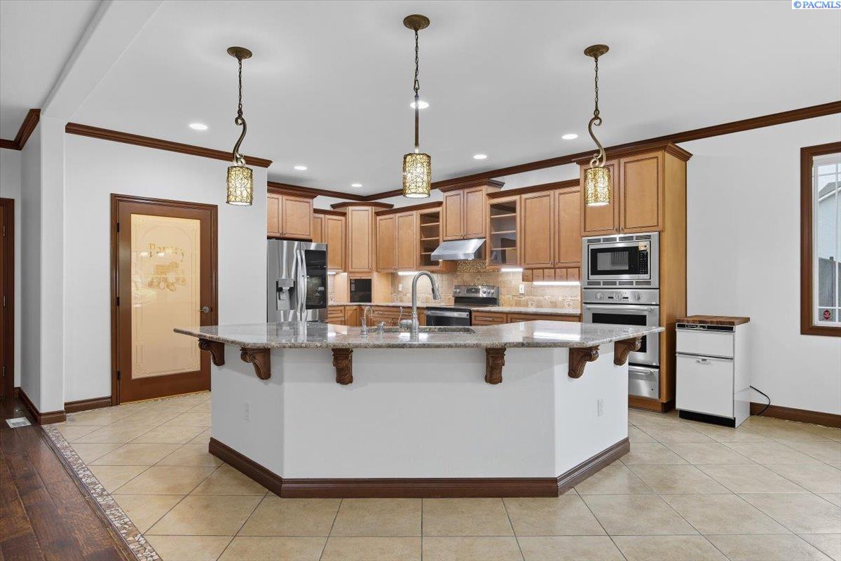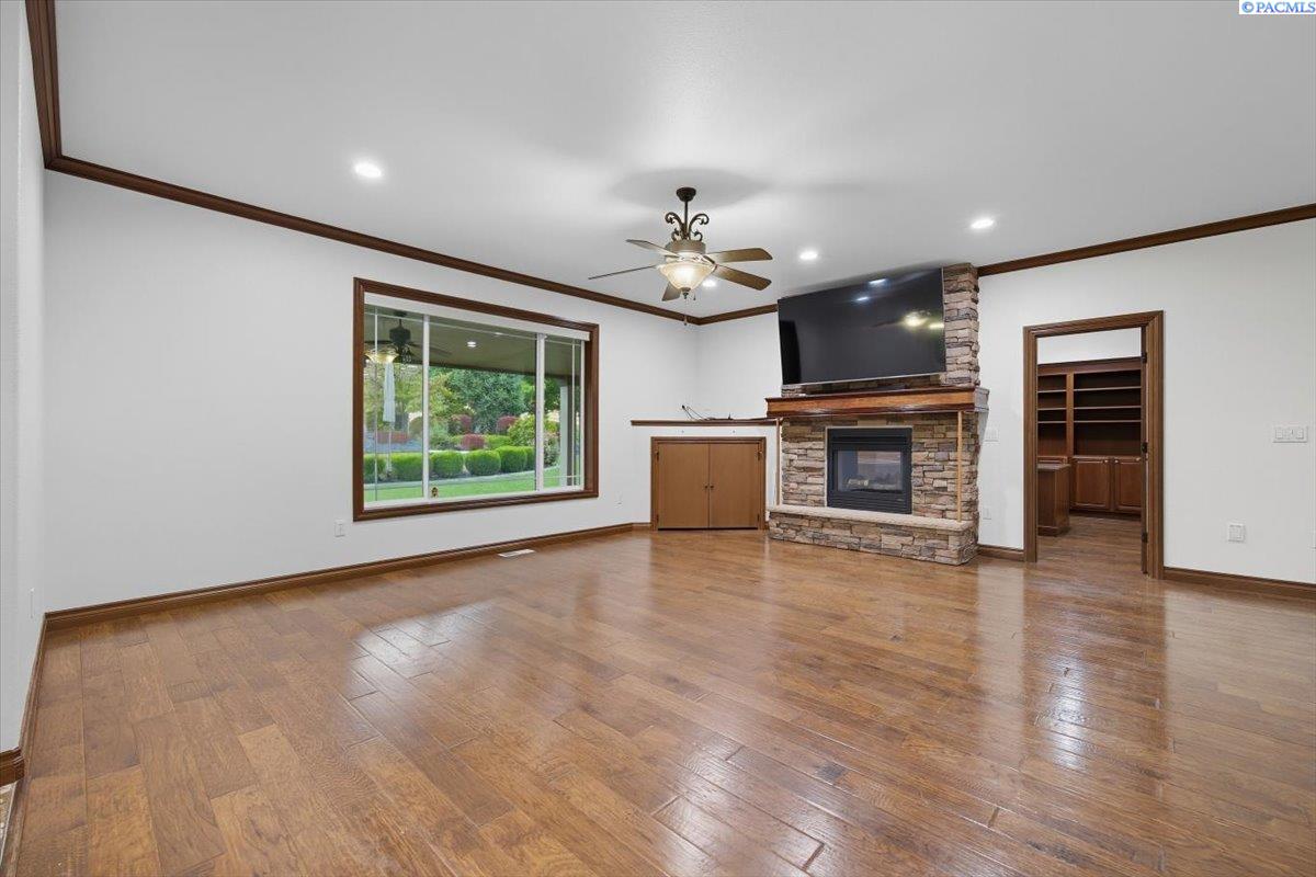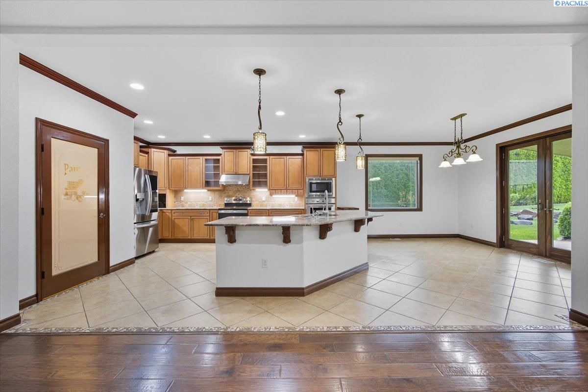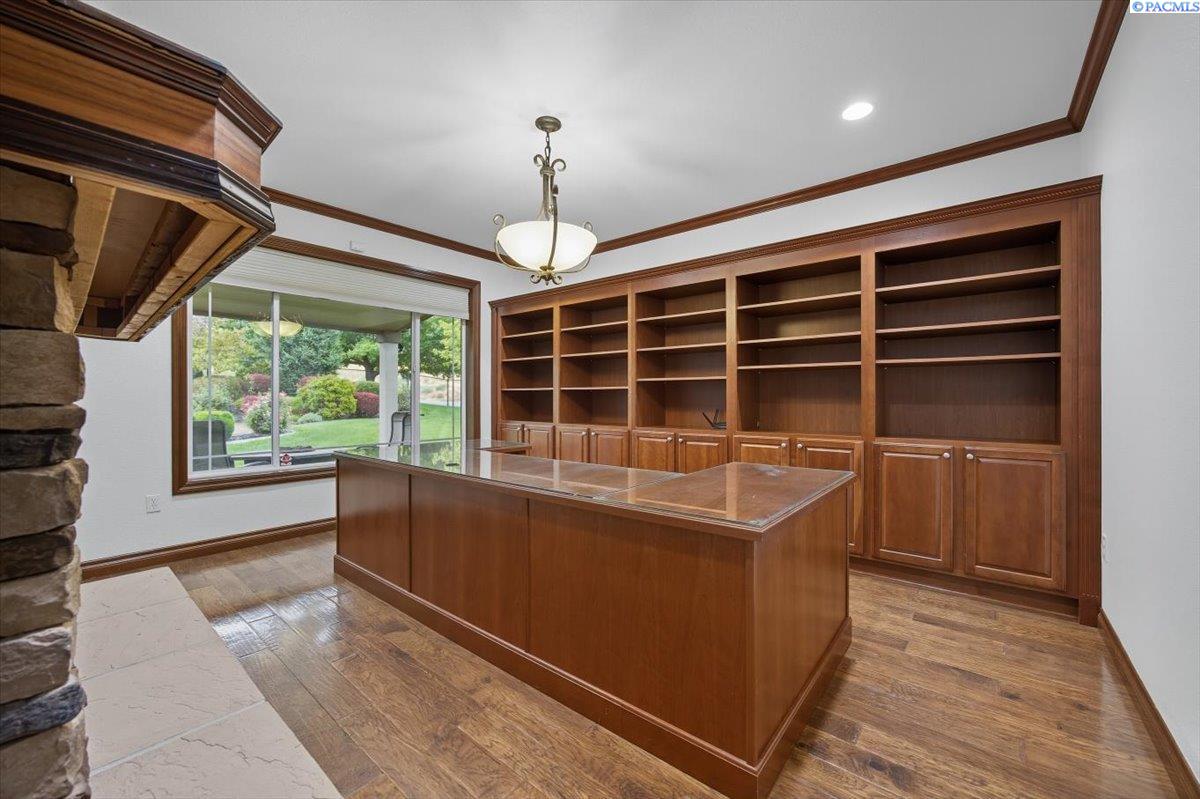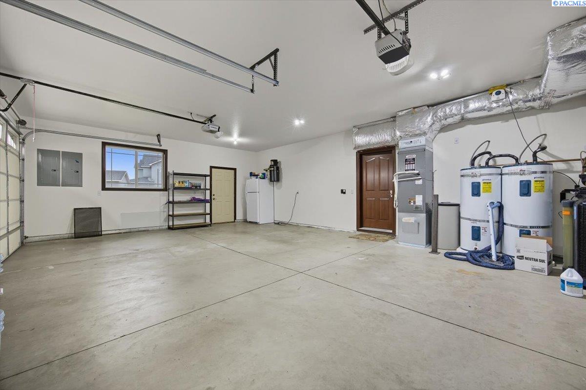 MLS #287676- Discover a stunning and spacious home on a lush one-acre lot near the river. This beautiful home features well-manicured grounds with a grand pool, serene water features, a cozy fire pit, and a covered patio perfect for entertaining. The hot tub hookup is ready for the spa of your dreams. A spacious, insulated, heated 40x60 shop with high ceilings and built-in shelves. The cul-de-sac driveway leading to the shop makes parking a breeze. Don't miss the basketball half court next to the shop. Inside, find rich hardwood floors, an open-concept kitchen with granite countertops, a pantry, two ovens, and options for eat-in or formal dining. The living room boasts a double-sided fireplace into the office, which has a built-in desk and book shelves. The master suite shines with vaulted ceilings, a sitting room, oversized bathroom, and a walk-in closet. Donât miss out on this gem!