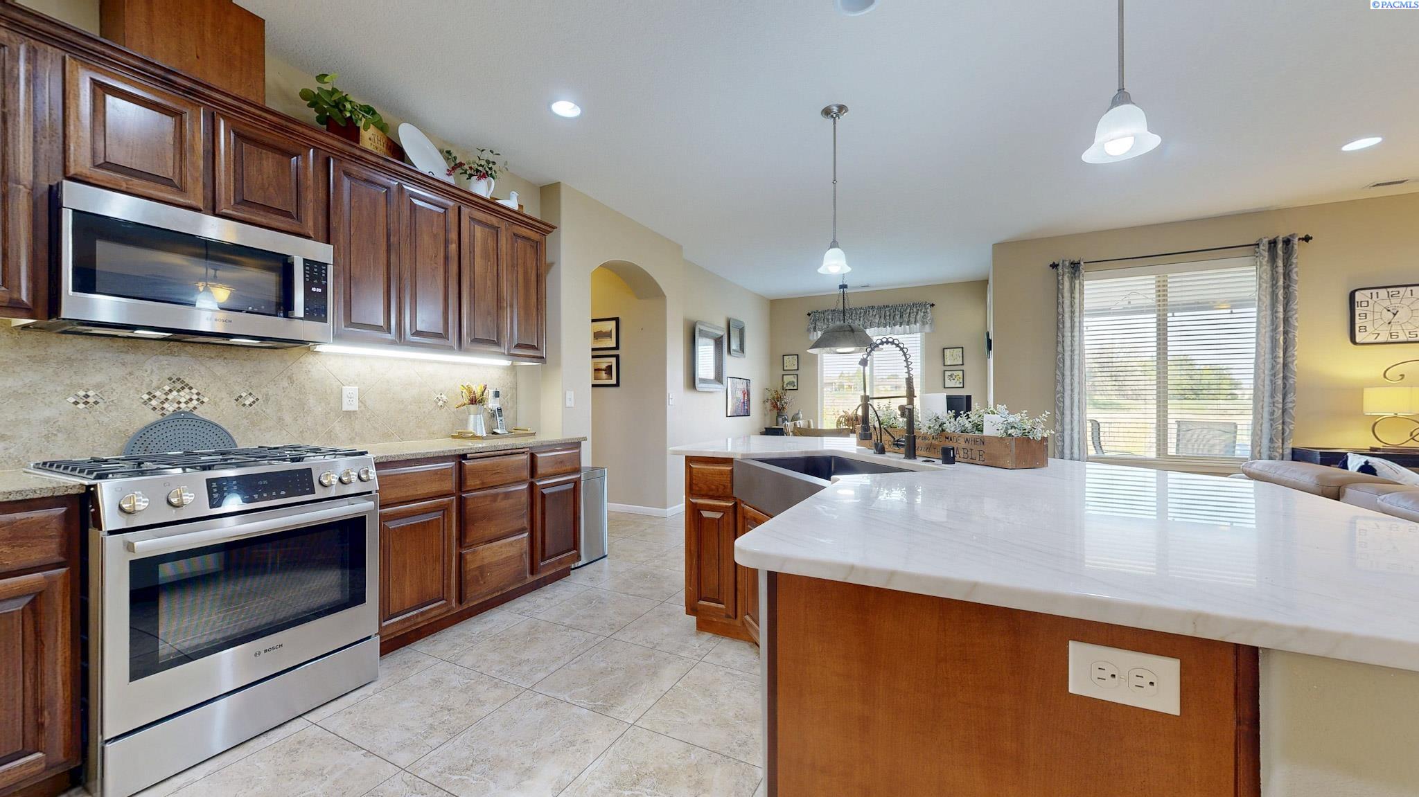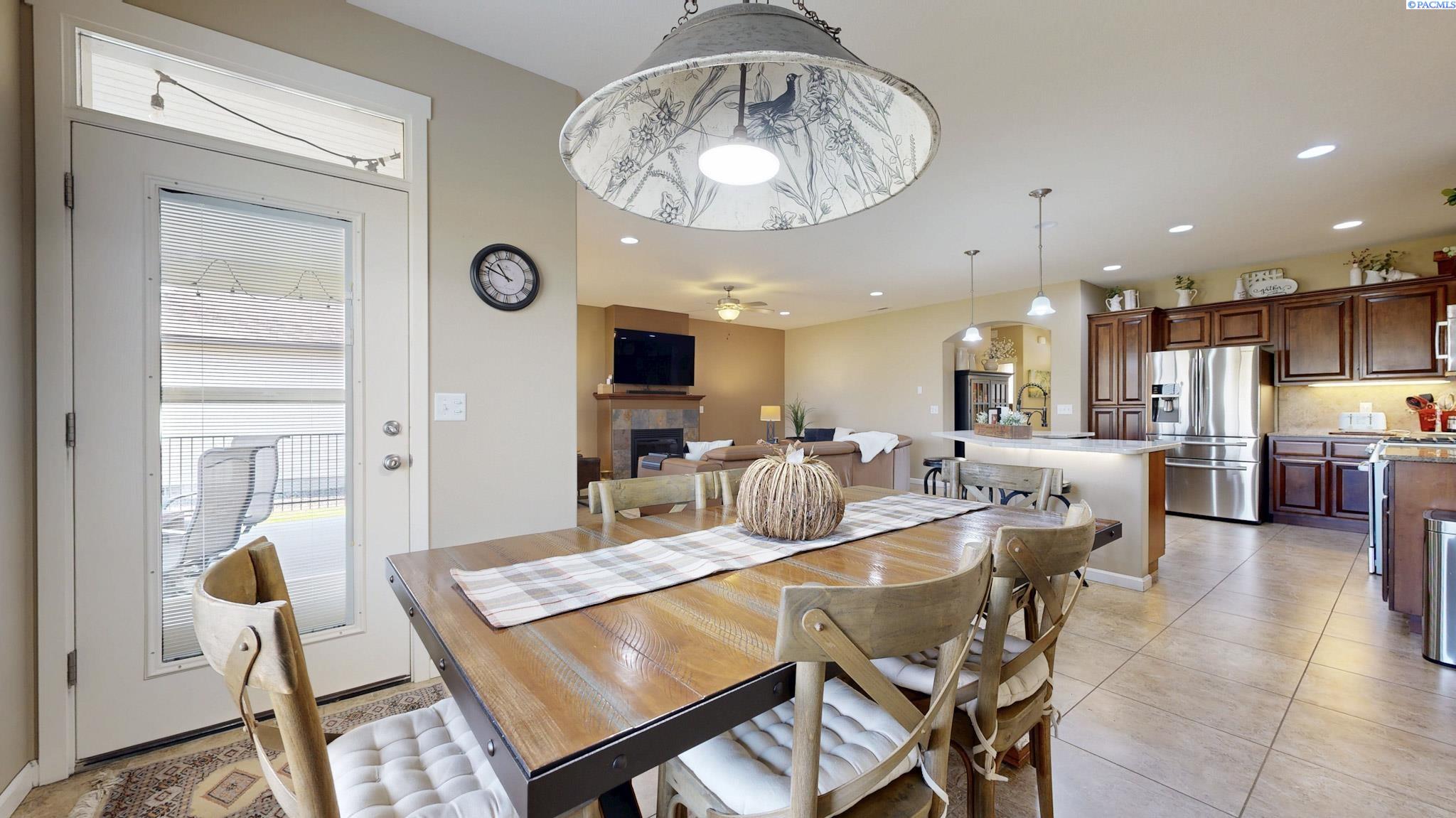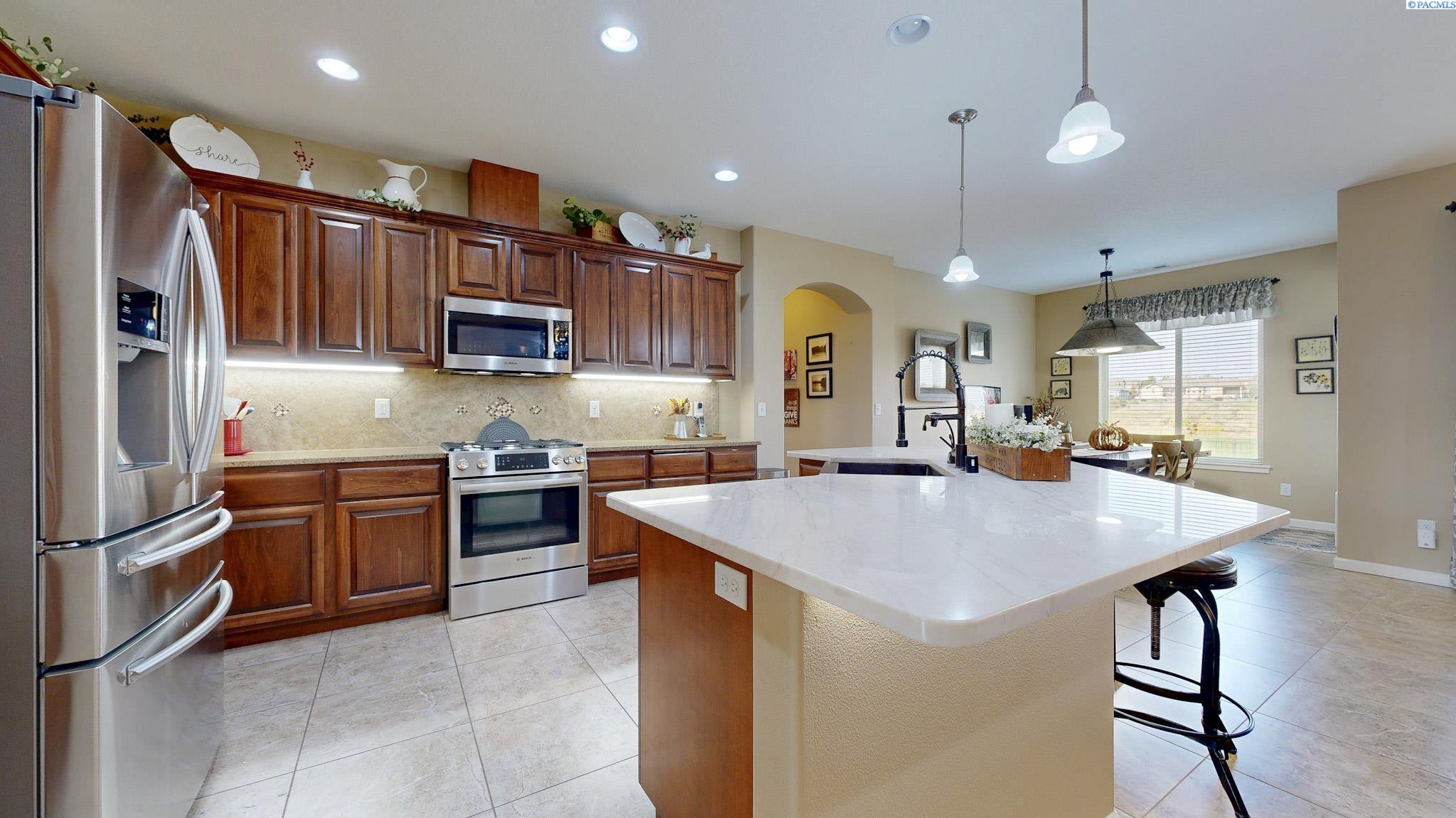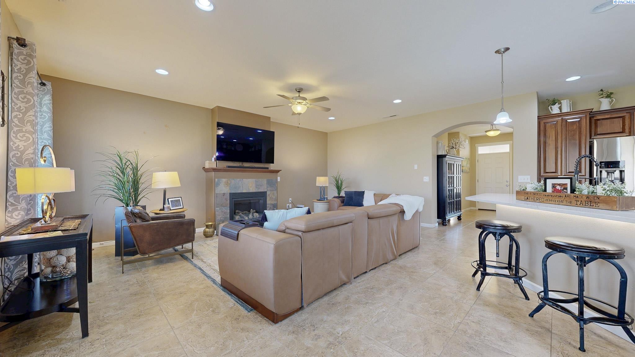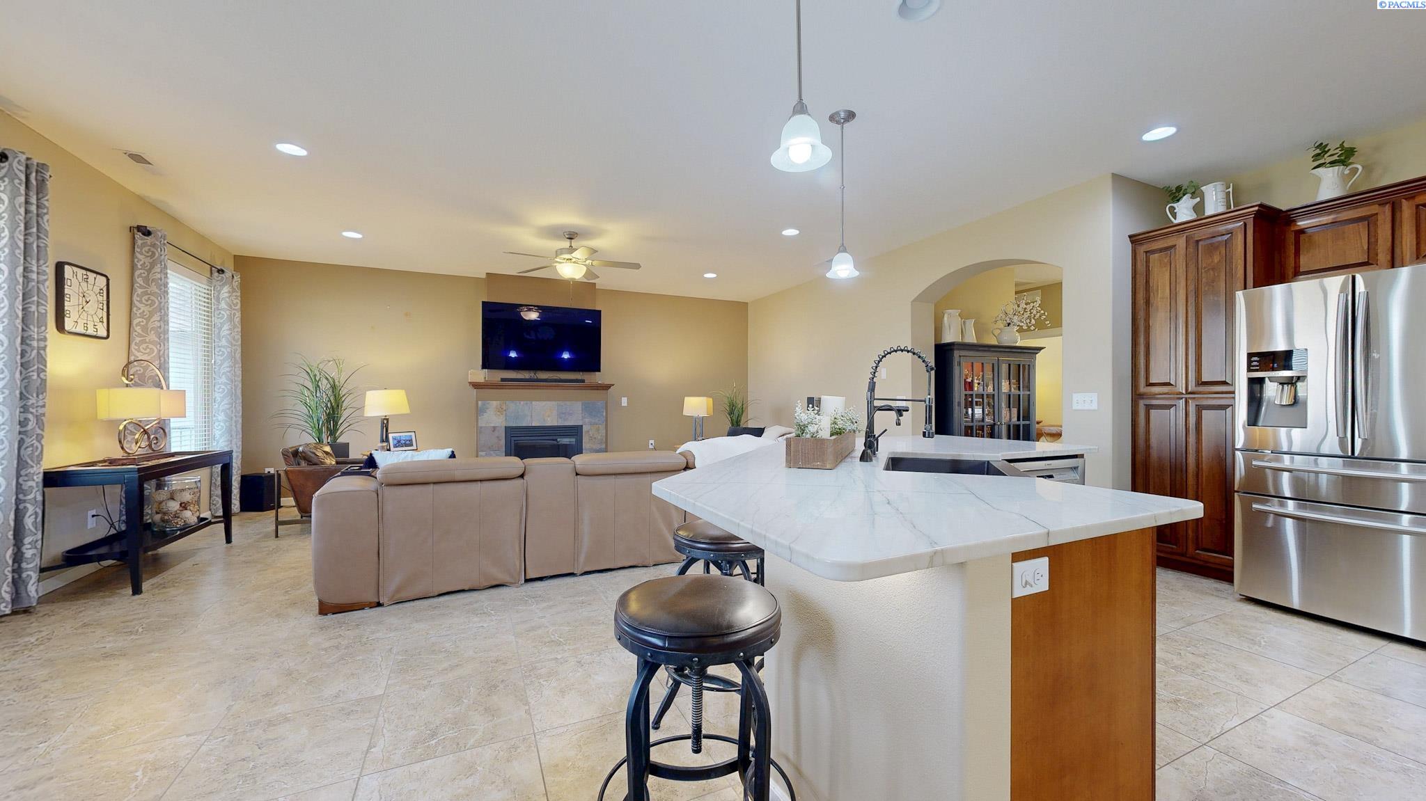 MLS# 287964 Immaculate one-story rambler located on Horn Rapids Golf Course frontage! This home offers stunning curb appeal with beautifully maintained landscaping and welcomes you with an inviting open great room design. The living room showcases a cozy gas fireplace and seamless flow into the kitchen, where youâll find a large island with granite counters, stainless steel appliances, and custom cabinetryâperfect for both everyday living and entertaining. The split-bedroom layout features a private primary suite complete with a dual-sink vanity, soaking tub, separate shower, and a spacious walk-in closet. Step outside to enjoy gorgeous golf course views from the nicely landscaped backyard, fully fenced with sleek iron fencing. Additional highlights include an oversized, finished 3-car garage and access to Horn Rapidsâ exceptional community amenitiesâpool, tennis and pickleball courts, walking paths, and RV parking. A true lifestyle property with both comfort and resort-style living!