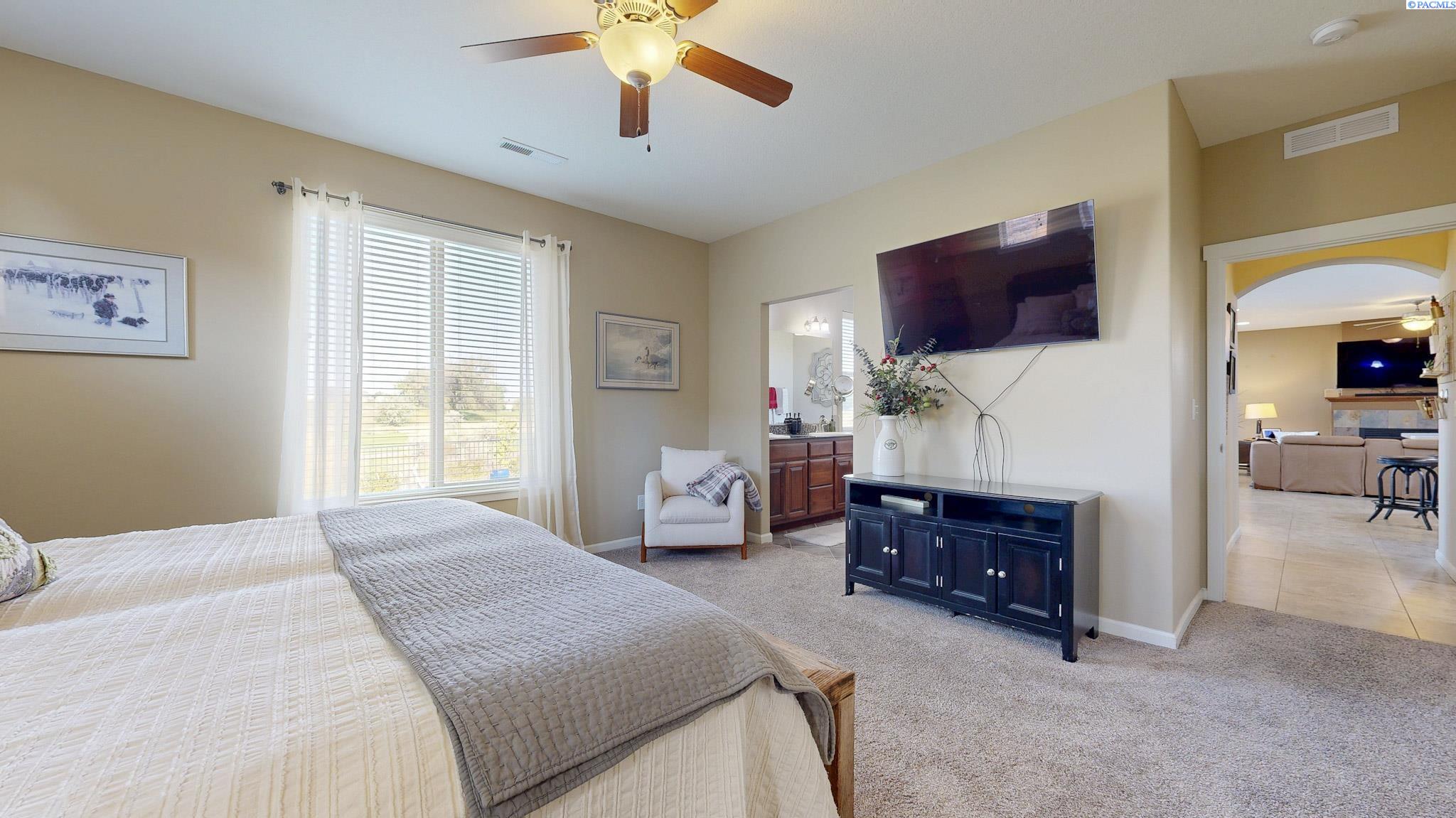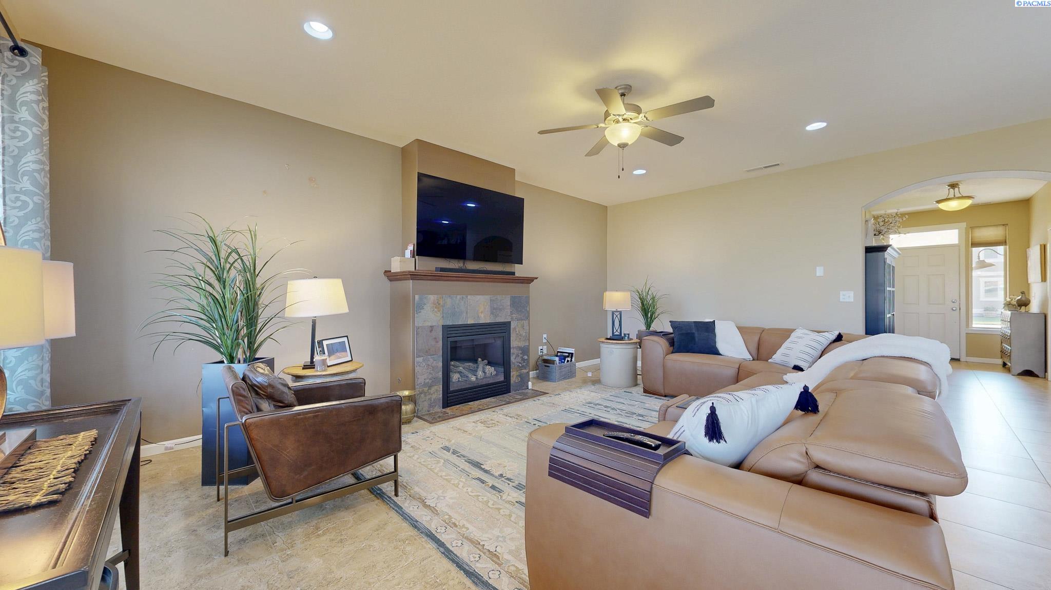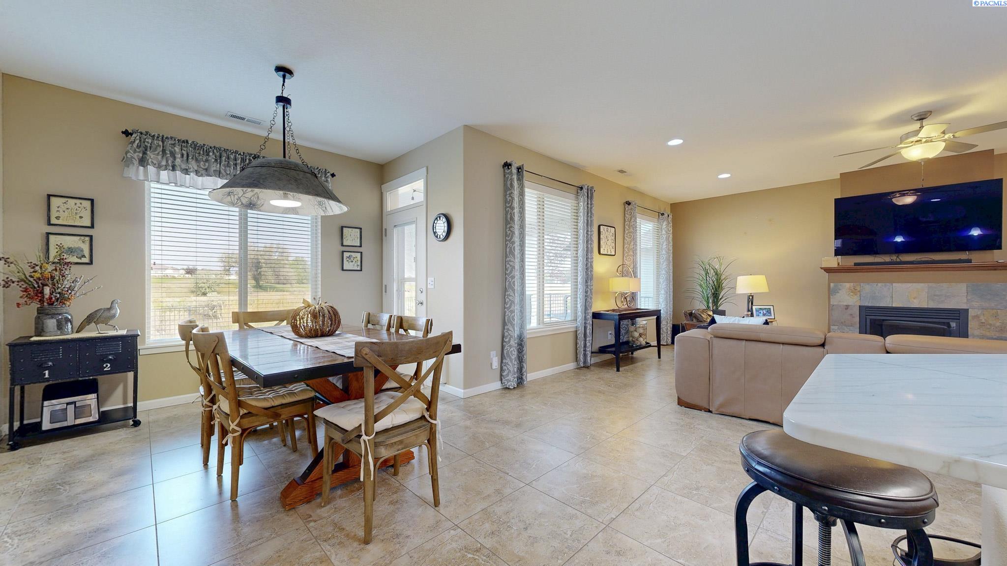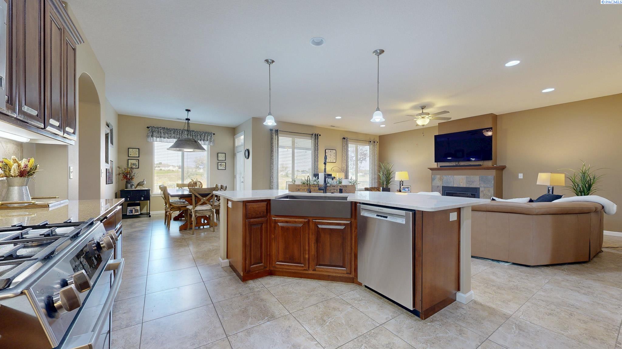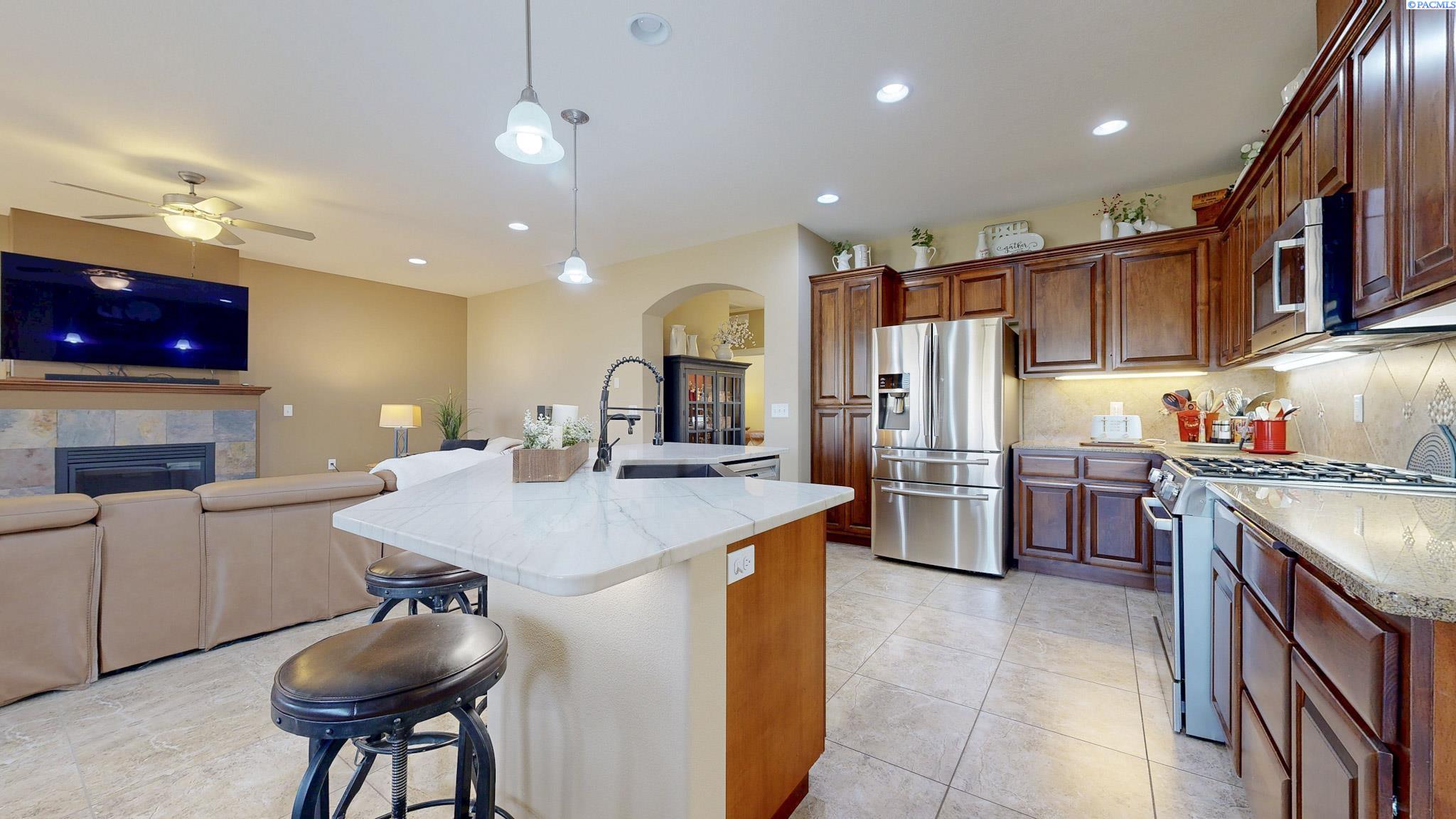 MLS# 287964 Immaculate one-story rambler located on Horn Rapids Golf Course frontage! This home offers stunning curb appeal with beautifully maintained landscaping and welcomes you with an inviting open great room design. The living room showcases a cozy gas fireplace and seamless flow into the kitchen, where youâll find a large island with granite counters, stainless steel appliances, and custom cabinetryâperfect for both everyday living and entertaining. The split-bedroom layout features a private primary suite complete with a dual-sink vanity, soaking tub, separate shower, and a spacious walk-in closet. Step outside to enjoy gorgeous golf course views from the nicely landscaped backyard, fully fenced with sleek iron fencing. Additional highlights include an oversized, finished 3-car garage and access to Horn Rapidsâ exceptional community amenitiesâpool, tennis and pickleball courts, walking paths, and RV parking. A true lifestyle property with both comfort and resort-style living!