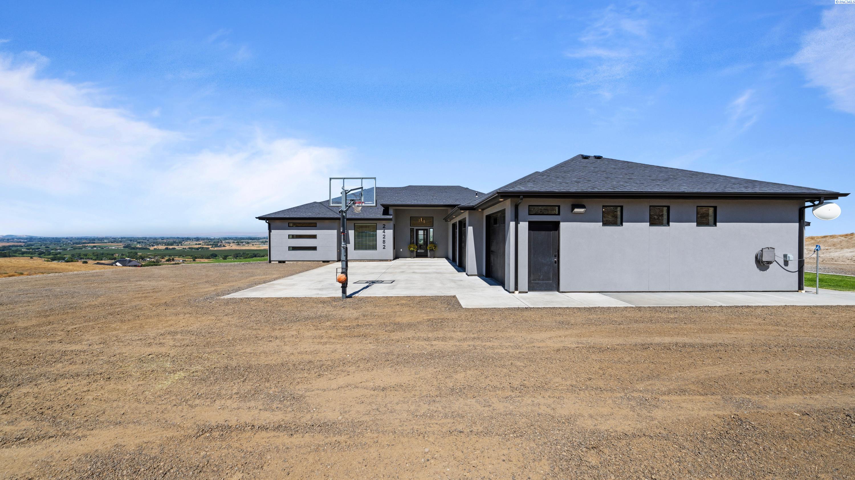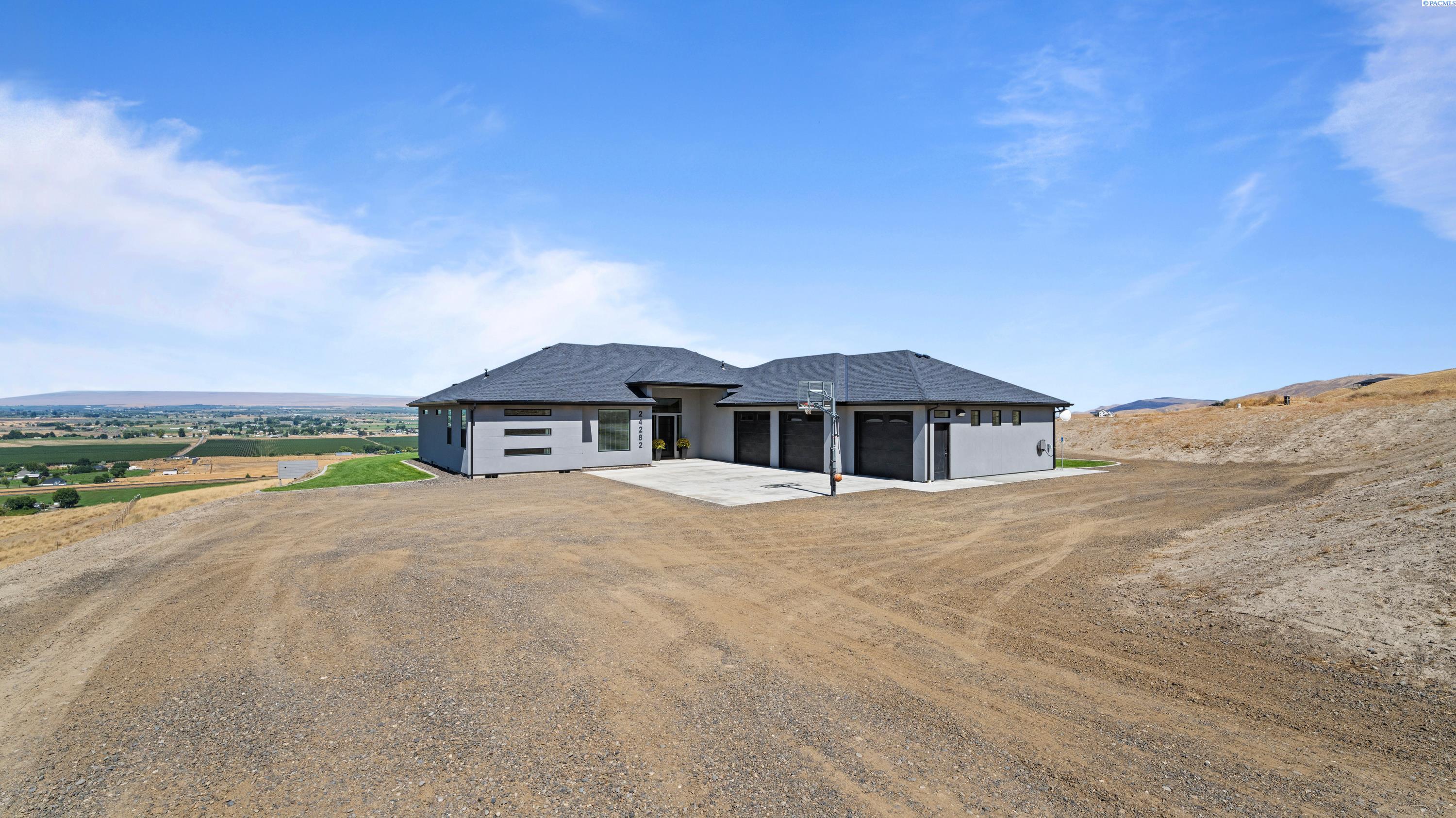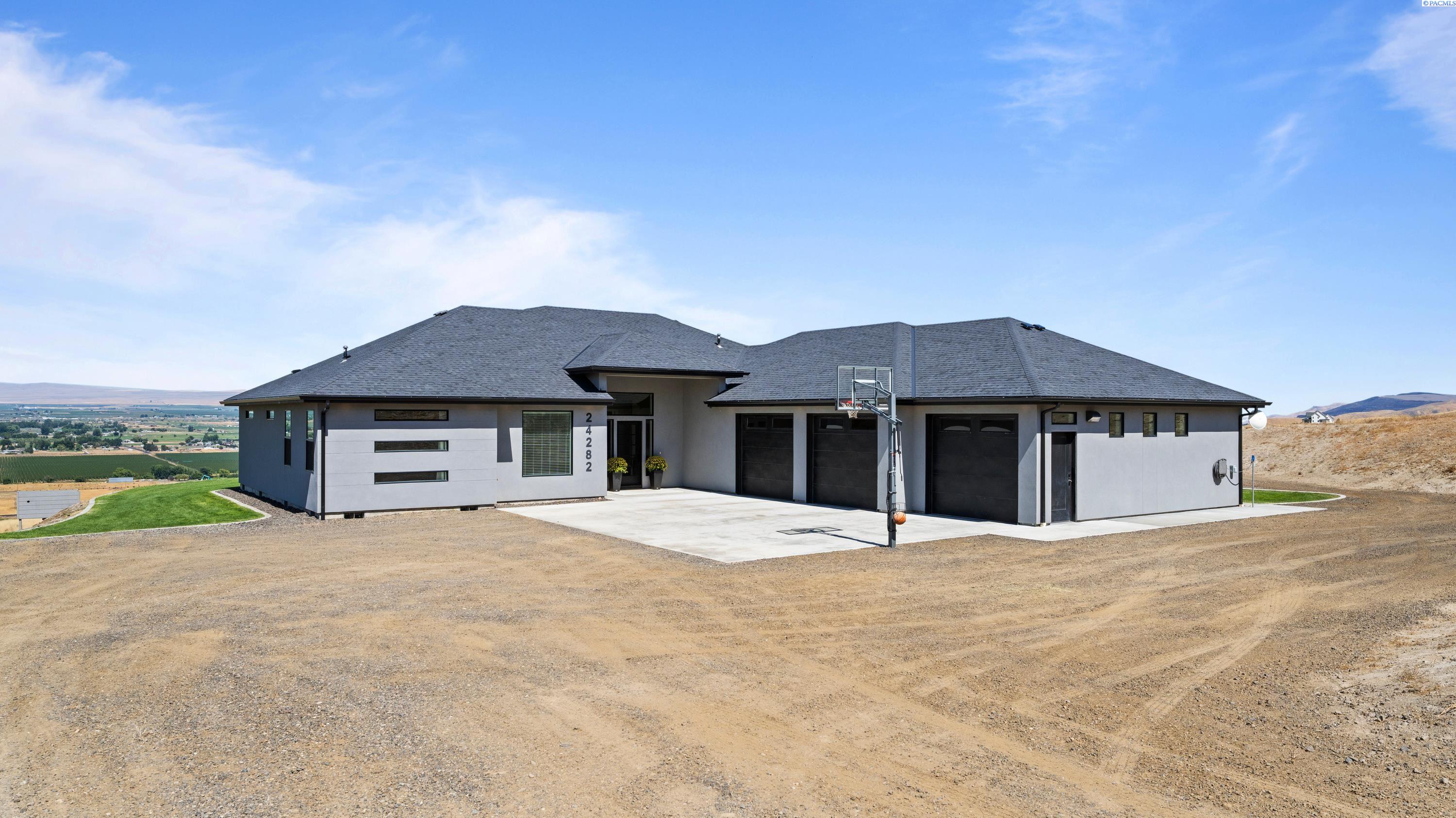 MLS# 287987 This Rambler home welcomes you with Amazing Views of Prosser. You will appreciate the Great layout of this home, 2022 year built, 3 spacious bedrooms, plus office or 4th bedroom, 2 Full Baths, 2426 Sqft & private laundry room. Beautiful kitchen with large island, granite countertops & full tiled backsplash, black stainless appliances & plenty of cabinetry w/soft close doors & walk-in pantry. Spacious master suite with large walking closet. Master bath with Granite counters, Dual vanity & tub/shower with tile walls. Spacious 1250 Sqft 3 car garage that's fully finished & insulated and has it's own mini split for climate control. Man door makes way to open RV parking area with full hookups & garden shed. Sits on 10 Acres, Room for Shop & Pool! Plenty of parking spaces, nice playground area, professionally landscaped around the home w/ ugs & curbing & fenced pasture of approx. 4 acres. Located close to downtown Prosser, Wineries and more. Schedule your showing today!
