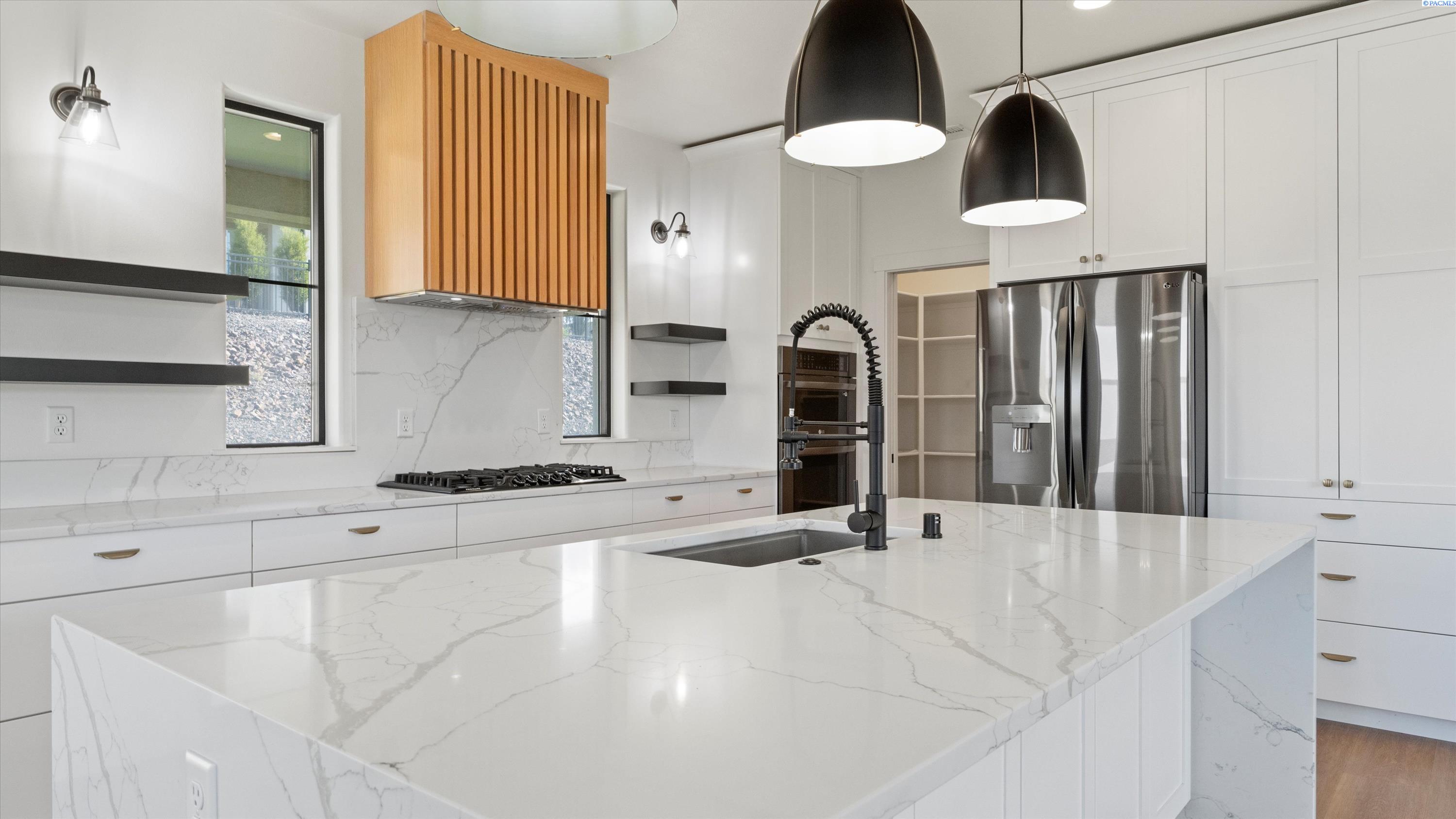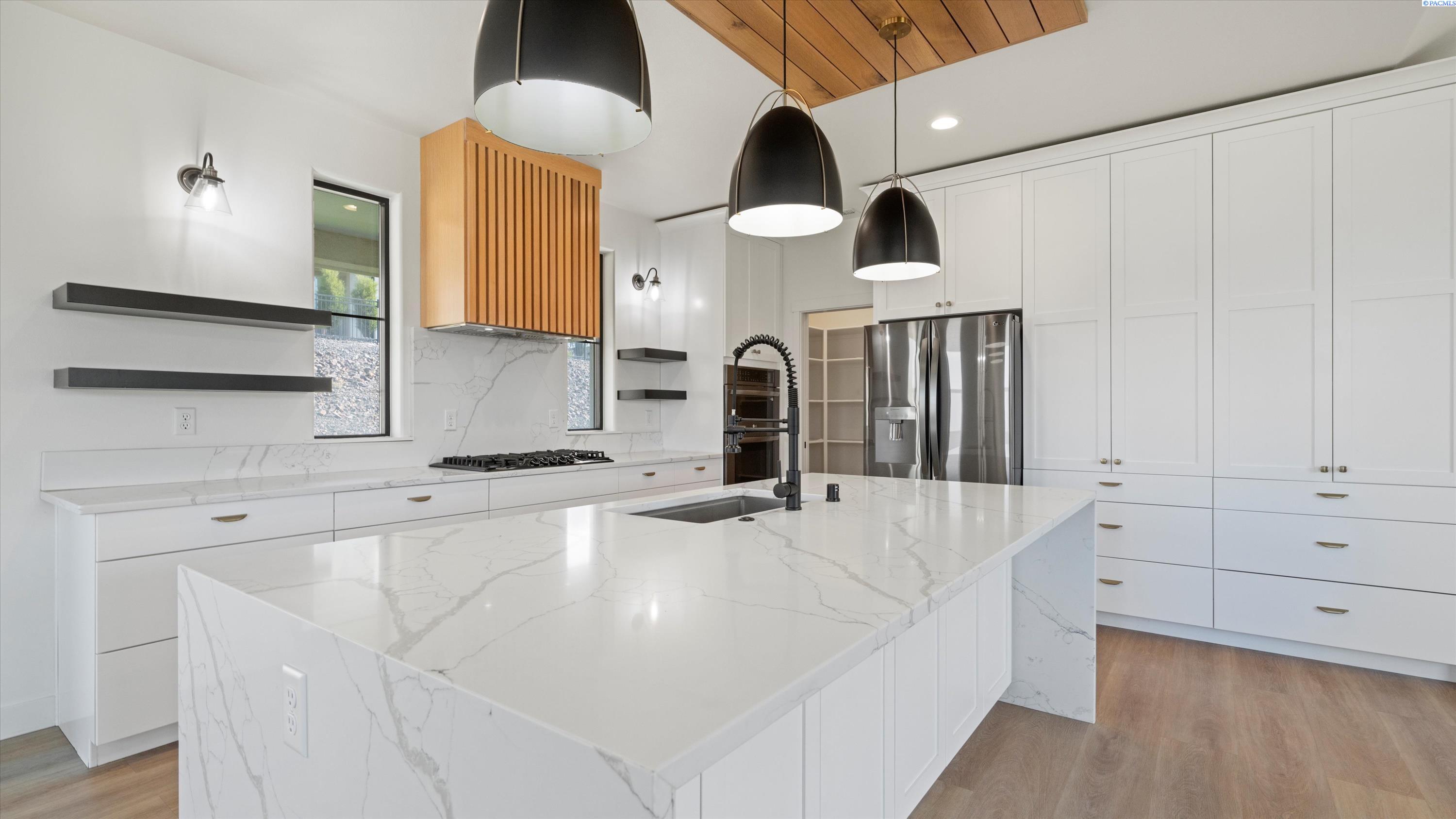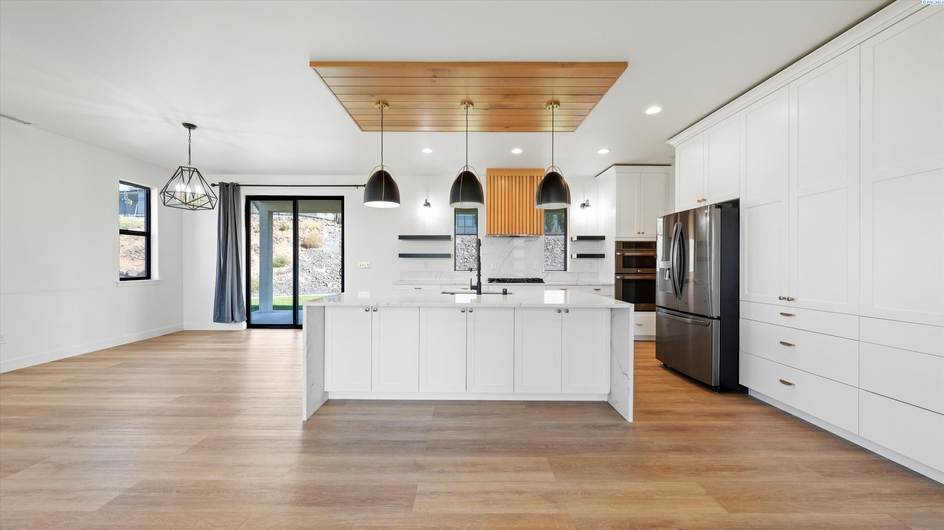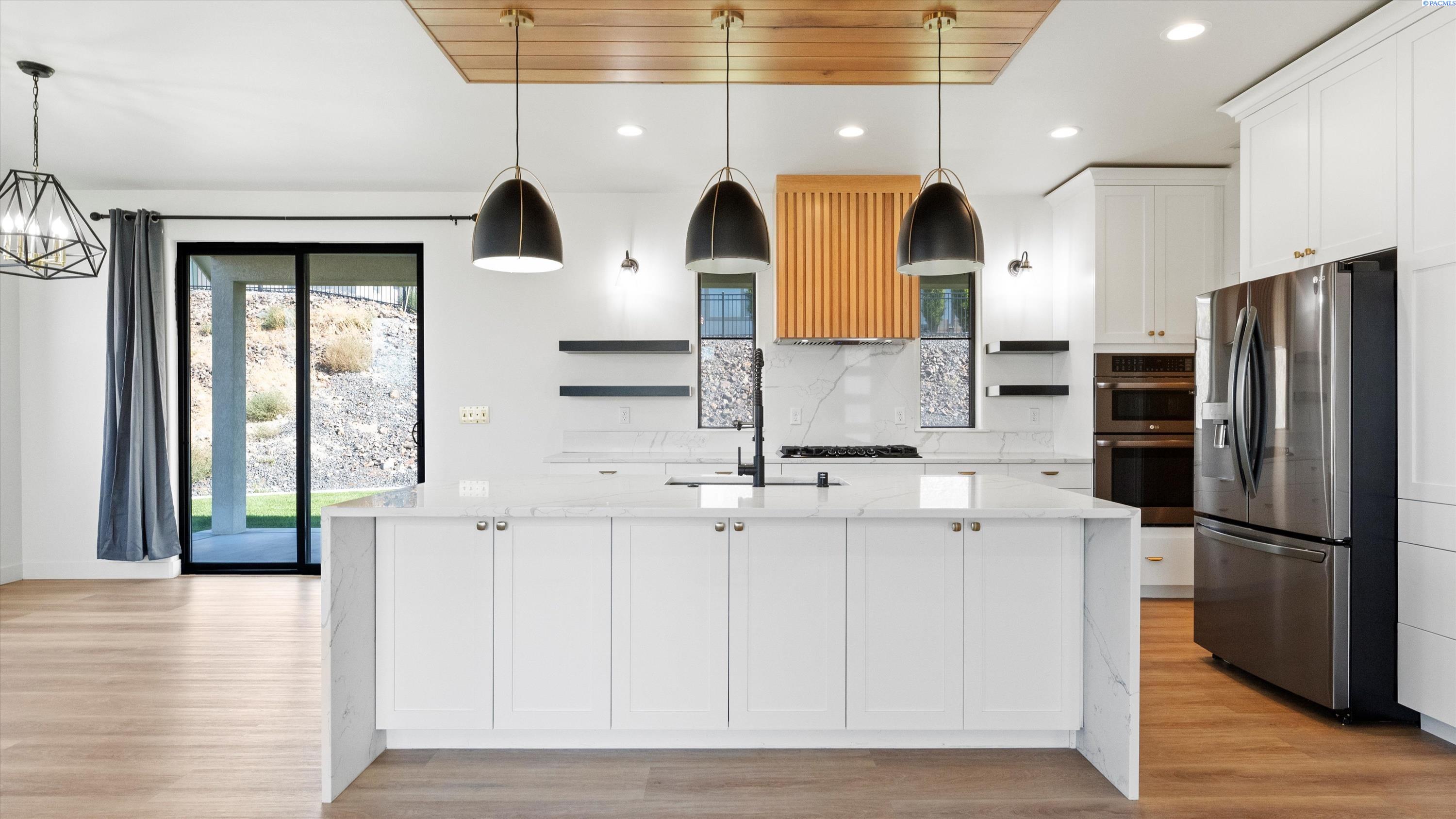 MLS# 288001 Experience designer luxury in this stunning 2022-built home nestled in Southcliffeâs most exclusive neighborhood, boasting million-dollar views of the Columbia River. This 4-bedroom, 3-bath residence showcases exceptional craftsmanship and sophisticated finishes throughout. The interior features wide-plank LVP wood flooring and matching wood accents that create a seamless, contemporary aesthetic. The gourmet kitchen is a true centerpiece, featuring a large island with a striking waterfall granite countertop, open shelving, and a generous bank of cabinets that offer both beauty and functionality. Designer-selected tile accents in all three bathrooms elevate the interiors into a true masterpiece. Thoughtfully designed for todayâs lifestyle, one bedroom easily serves as a den or home office. Modern comforts include geothermal heating and cooling, a soft water system, and reverse osmosis filtration. Whether youâre looking for your first home or a retirement retreat, this property offers low-maintenance, single-level living with no stepsâperfect for ease and comfort. Sit back and enjoy the envious views while entertaining friends and family in style. From its elegant interiors to its energy-efficient systems, every detail of this home embodies refined Northwest living.