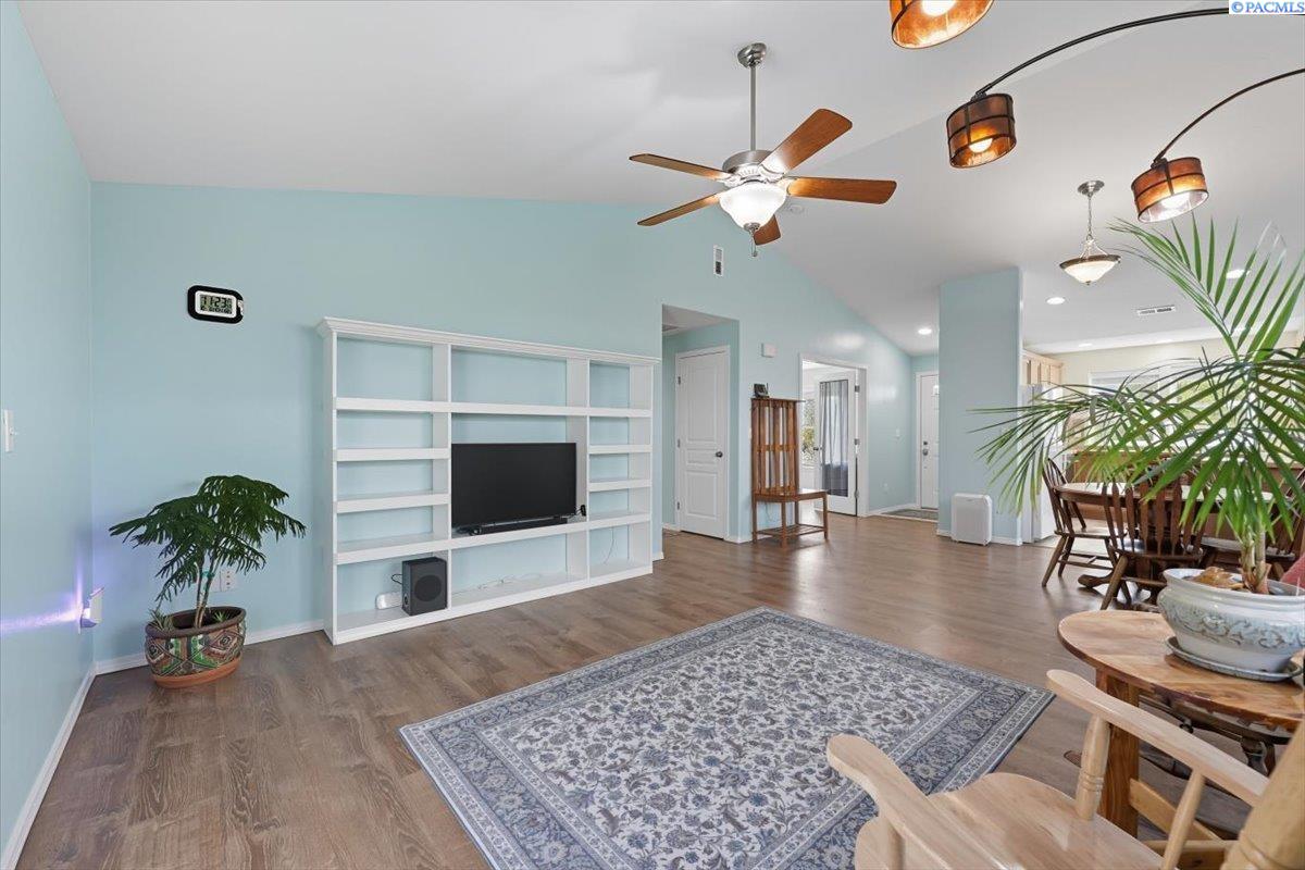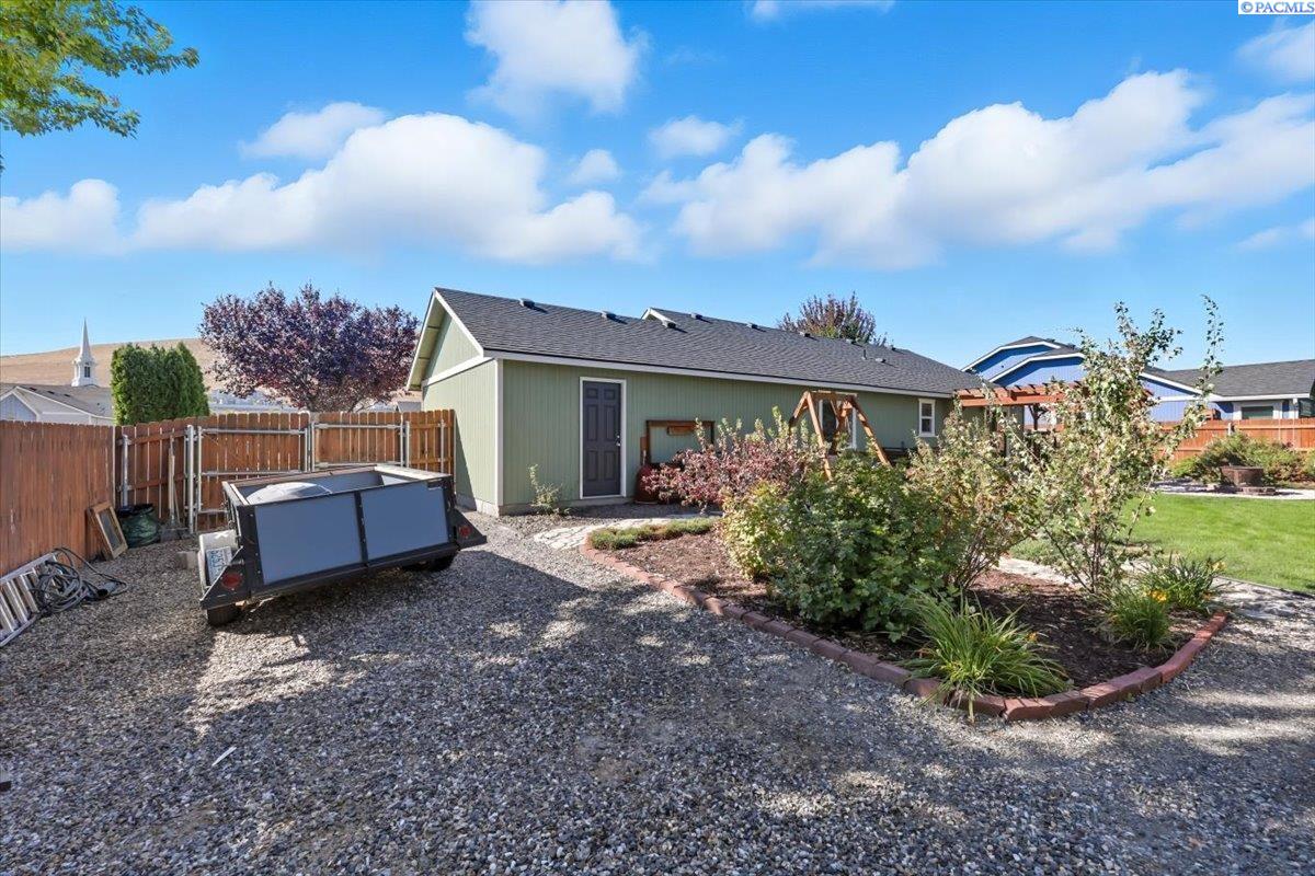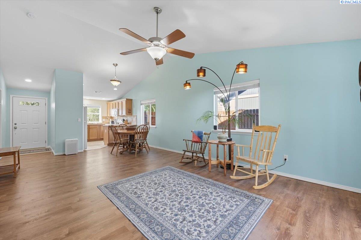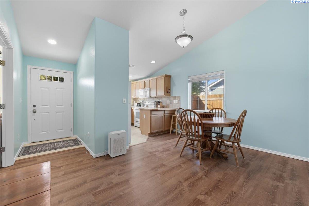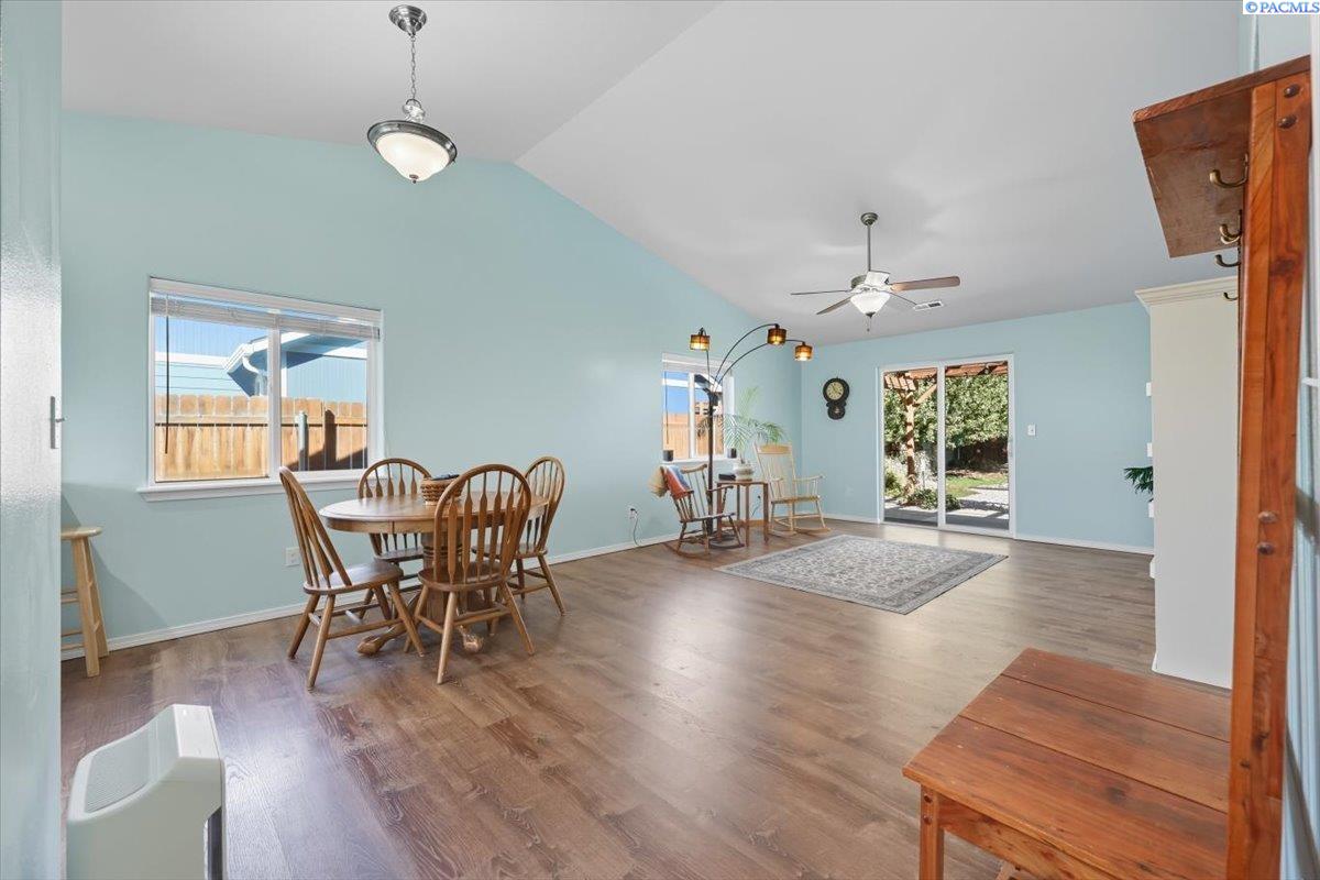 Welcome home to this charming West Richland rambler featuring 3 bedrooms and 2 bathrooms. Enjoy easy-care landscaping, fresh exterior paint, and convenient RV parking. Inside, youâll find beautiful wood LVP flooring throughout, vaulted ceilings, and an open-concept layout that connects the kitchen, dining, and living areas. The kitchen includes all appliancesâplus a newer refrigerator, dishwasher, faucet, tile backsplash, and laminate counters. The versatile front room with French doors can serve as an office or additional bedroom. Interior paint is fresh and bright. The main bath features a vanity with a tub and surround, while the primary suite offers dual closets and a bath with new shower doors and dual sinks. The laundry room leads directly to the 2 car garage with a sink and includes a newer hot water heater. Step outside to your backyard oasis with a covered patio and a 22x16 shop complete with a loft. Surrounded by beautiful Native plants, this property offers comfort, functionality, and tranquility all in one.