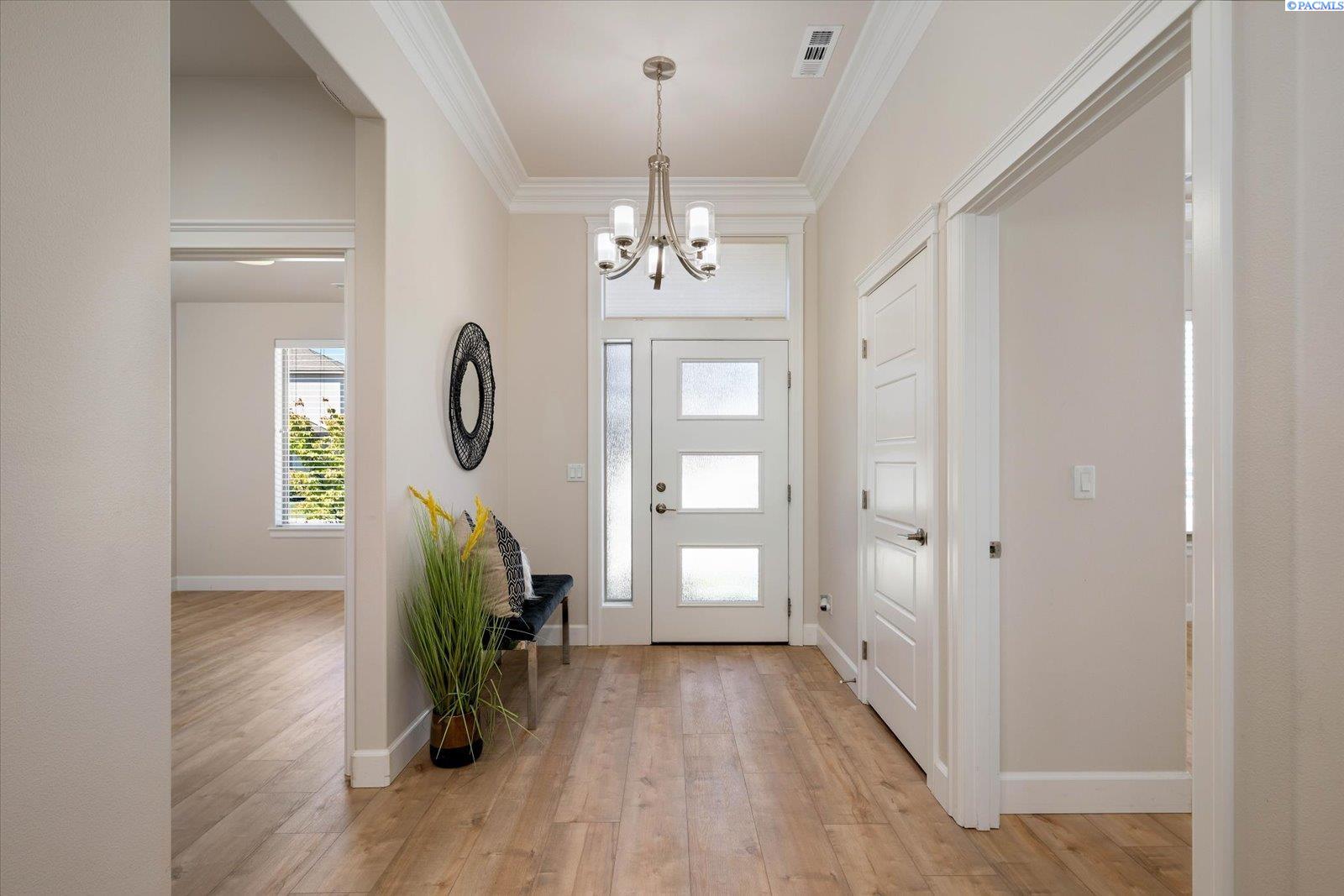 MLS# 288119 An immaculate property showcasing numerous premium new upgrades throughout its thoughtfully designed living space. Nestled on a quiet half court in a desirable community, this home offers it all! Step inside to experience a bright, open concept layout enhanced by neutral tones and gorgeous new luxury vinyl plank flooring throughout. The inviting living area features a stunning floor-to-ceiling tiled horizontal fireplace with upgraded programmable settings, creating an elegant focal point for entertaining or relaxation. The kitchen is truly exceptional, boasting an oversized island perfect for culinary creativity and casual dining. Highlights include a spacious walk-in pantry with automatic lighting, new high-end GE Cafe Range with gas stovetop, new maximum capacity French door refrigerator, and a full glass mosaic tile backsplash which pairs beautifully with the granite countertops. Even the under-sink area reflects thoughtful design, with drop-down drawers maximizing use of space. This three-bedroom split floor plan ensures privacy, with two of the bedrooms featuring sophisticated recessed ceilings with ambient lighting. The Primary bedroom creates a private retreat with refined finishes. The ensuite bathroom is a showstopper, featuring herringbone tile flooring, a floor-to-ceiling tiled walk-in shower, elegant soaking tub, & an extended granite vanity. Additional amenities include a beautiful & generous laundry area with utility sink and a 3-car garage with built-in overhead storage. Recent upgrades demonstrate meticulous attention to detail: new rain gutters with heat trace technology to prevent ice buildup, updated security system, premium new Kohler showerheads, fixtures & convenient easy-sit toilets, new undermount kitchen lighting, enhanced deadbolts, & new patio sunshade screen. The heating, ventilation, air conditioning system, water heater, & ductwork have all been just recently serviced. Outside, low maintenance professional landscaping surrounds the property, maintained effortlessly with an updated in-ground sprinkler system. Pre-plumbed gas line for outdoor BBQ or firepit. The exceptional neighborhood offers an impressive array of recreational amenities, including a golf course, walking paths, community pool, and tennis courts. With Ziply fiber connectivity ready for installation, this property represents the epitome of modern, convenient living in a sought-after location. Pride of ownership is evident throughout this remarkable re