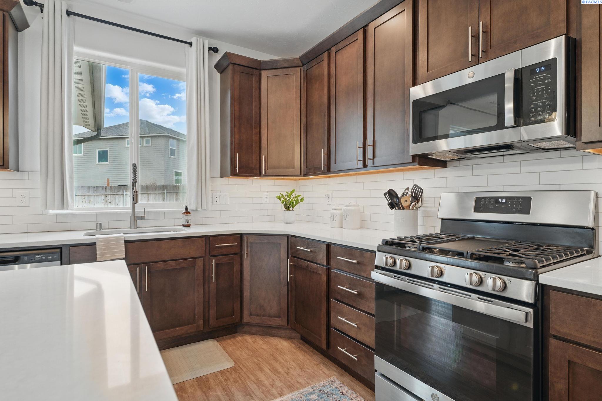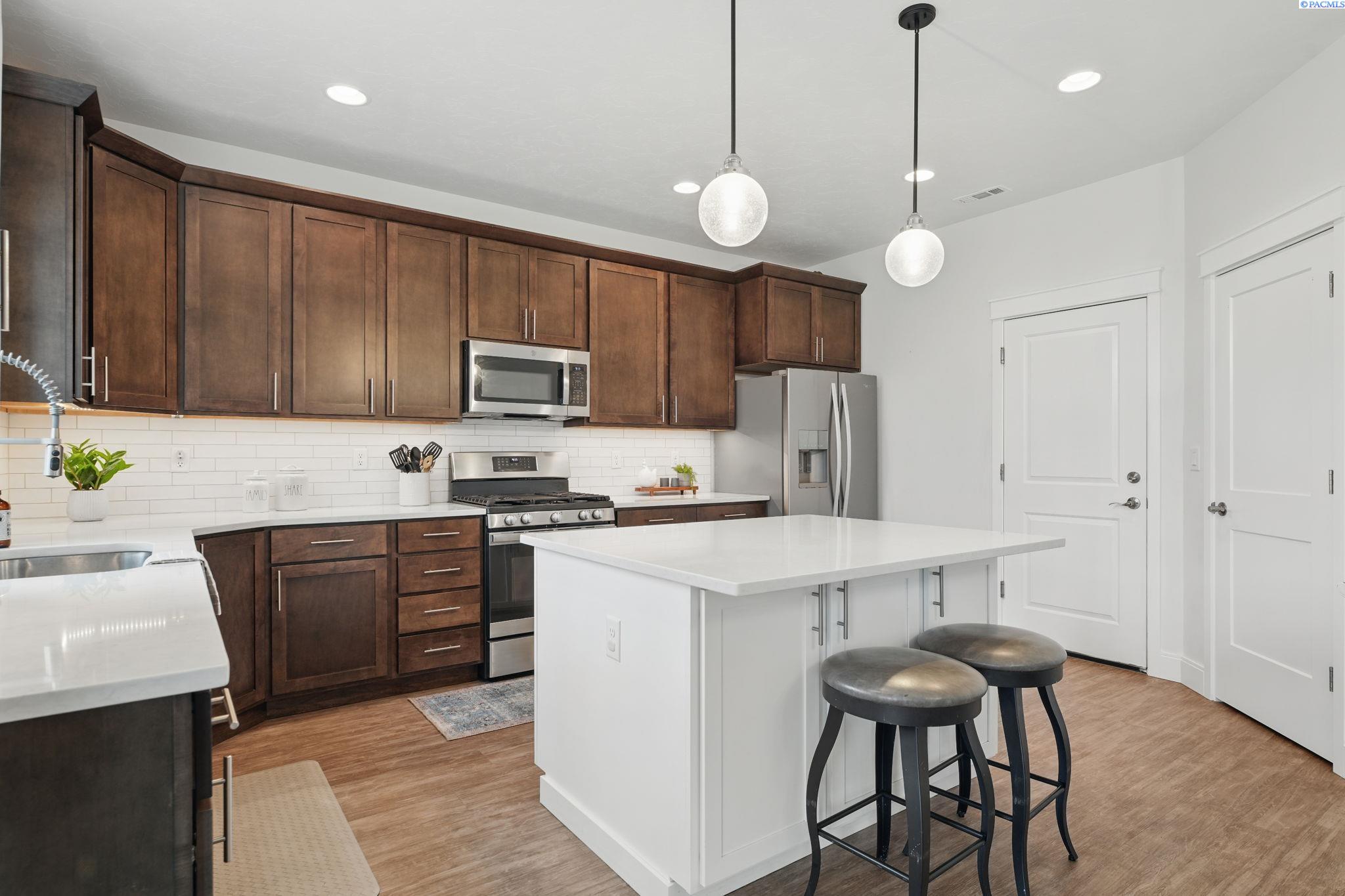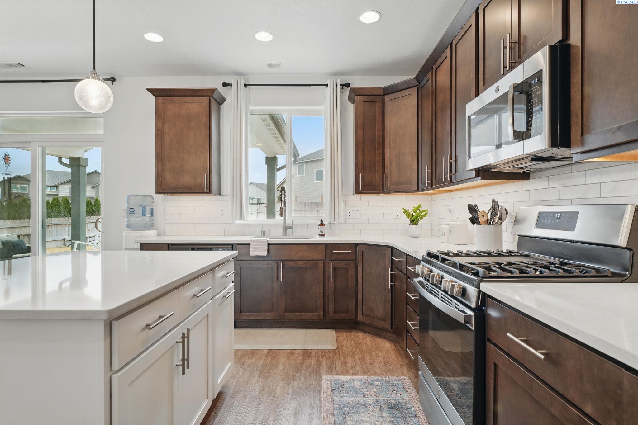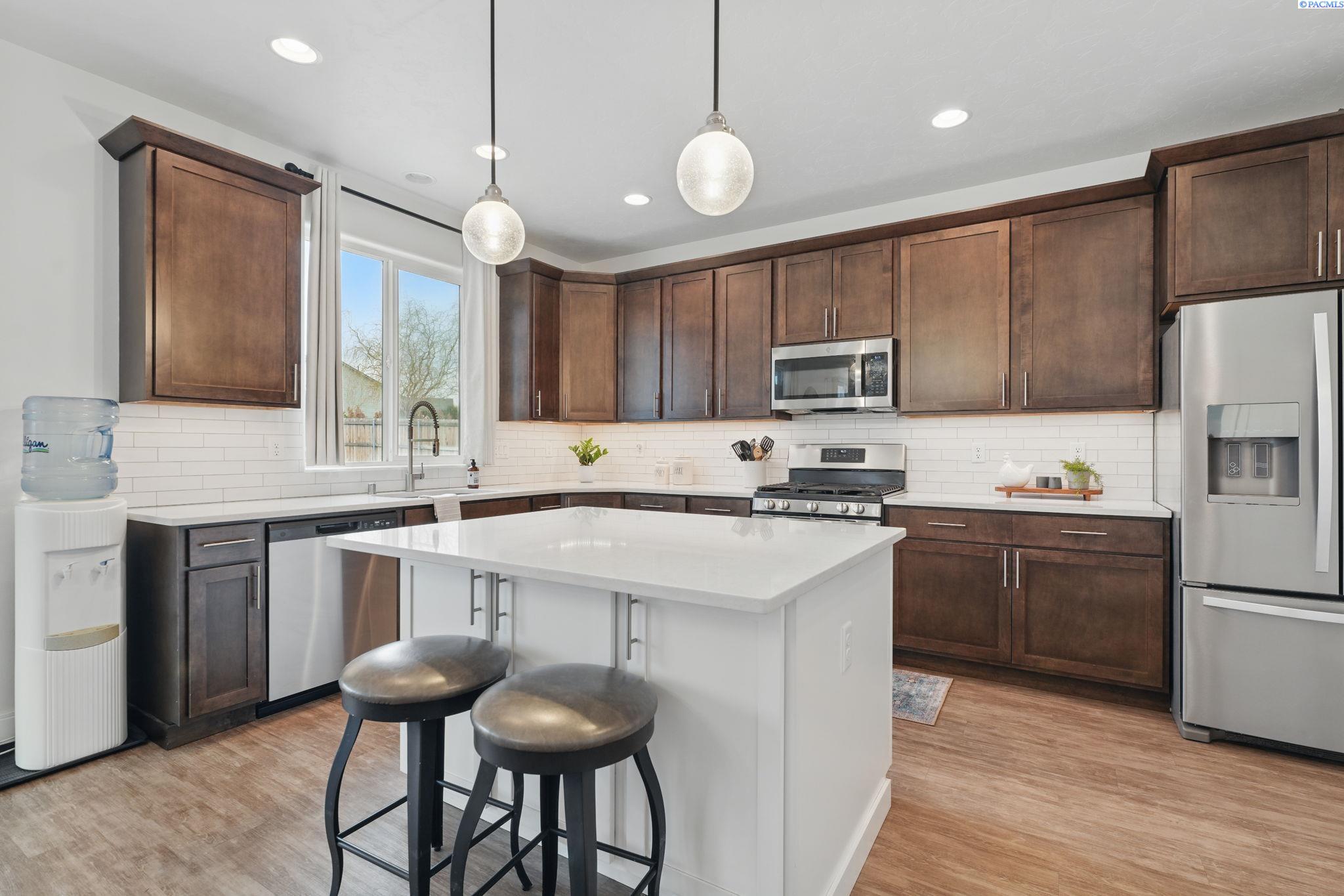 MLS# 288169 MLS# 282305 Welcome to this like-new home in the desirable Madison Park area of West Pasco! Built in 2021, this beautifully maintained home sits on a spacious almost 1/4-acre lot. The inviting front entry features a charming covered porch. Step inside to find a spacious layout that includes a large office and an open-concept family room, kitchen and dining area. The kitchen is a true highlight with an island, a full pantry, full backsplash, and quartz countertops while LVP flooring flows seamlessly throughout the main living areas. Upstairs, you'll find four generously-sized bedrooms, each offering ample closet space and plenty of natural light. A loft area provides extra living space, ideal for a playroom, office, or lounge area. The upper level also includes a conveniently located laundry room and full bathroom. The backyard is truly the gem of this home, featuring a large covered patio and an extensive concrete pad that is perfect for outdoor activities like riding bikes or playing basketball. A double gate provides extra space for parking your toys, making this the ideal home for those who need extra storage or have recreational vehicles.