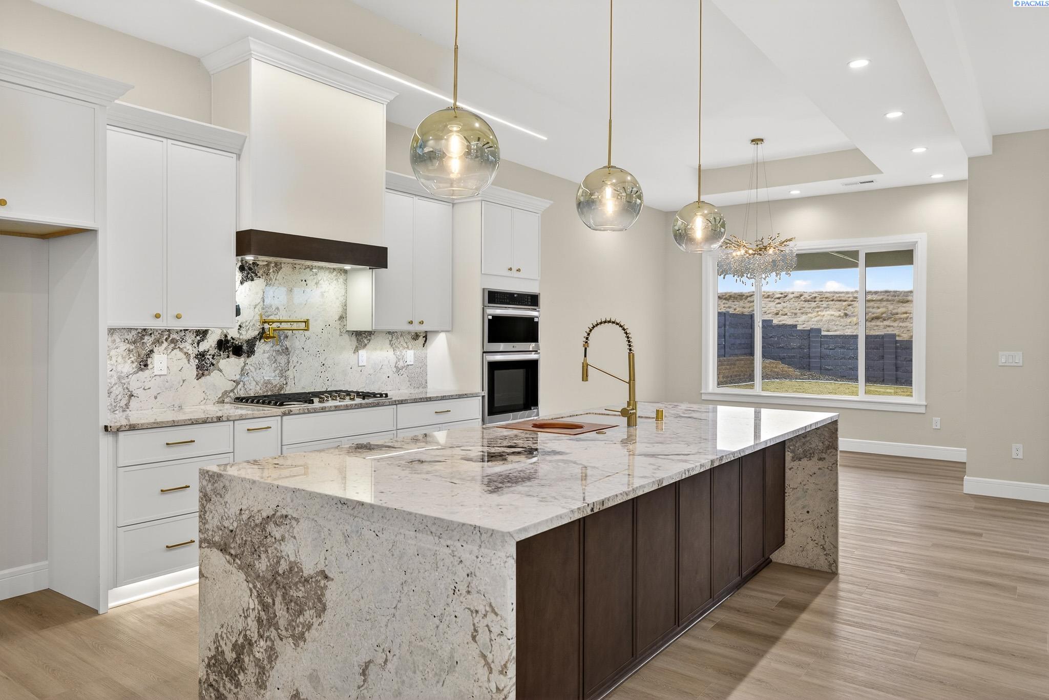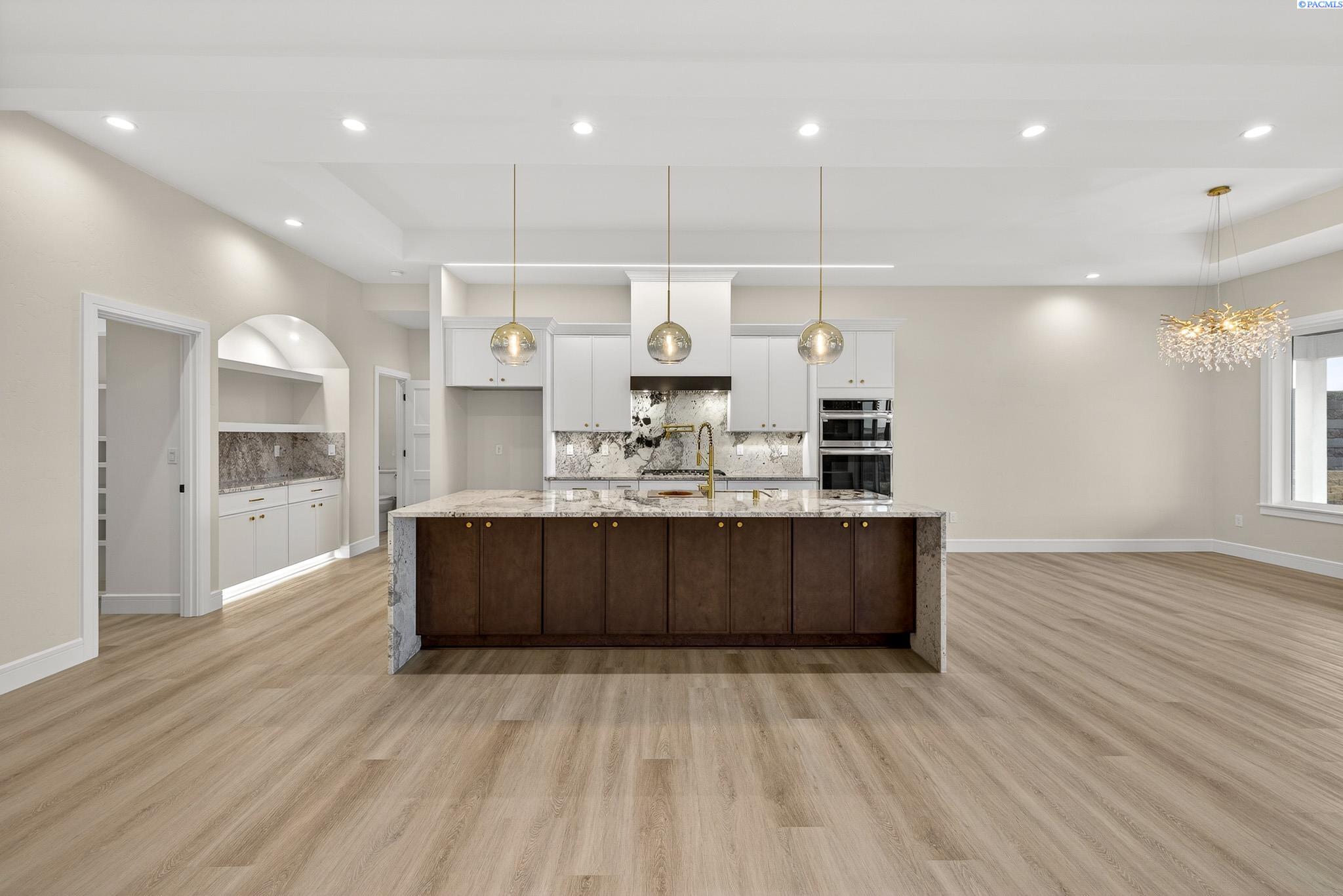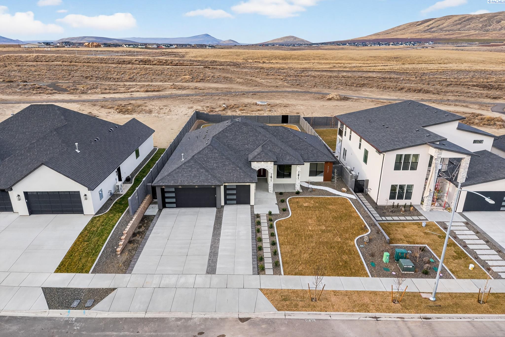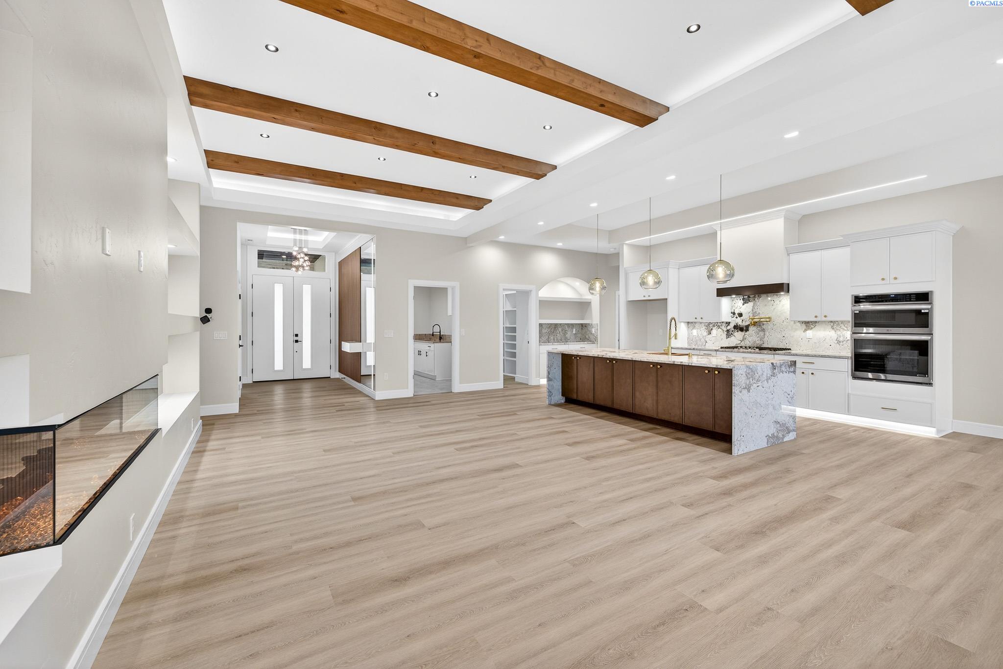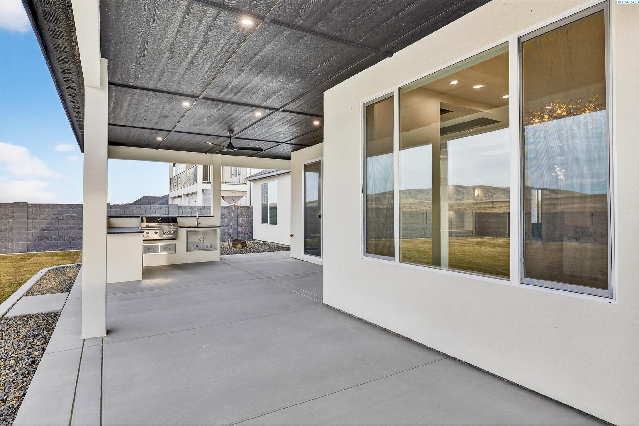 MLS# 288216 This single-story home in the South Orchard community of Richland blends modern architecture, intentional design, and high-end craftsmanship. Set on over a third of an acre, it offers three bedrooms, 3 bathrooms, a dedicated office, a spacious recreation room, and a three-car garage. Step into the foyer and youâre welcomed by eleven-foot ceilings that carry throughout the home. Oversized windows flood the space with natural light, while coffered ceilings with LED lighting in the living room and primary bedroom add a modern, elevated touch. A cozy fireplace anchors the great room, and a large sliding glass door opens to the covered back patio. The chef-inspired kitchen features a striking fourteen-foot waterfall island, a large double-sided sink, stainless steel appliances, a double oven, under-cabinet lighting, and a walk-in pantry. A built-in arched beverage center with display shelving, cabinetry, and accent lighting adds a custom touch. The primary suite includes a walk-in closet designed to impress, featuring built-in shelving on every wall, integrated LED lighting, and a built-in mirror. The spa-like en-suite offers a beautifully tiled walk-in shower with a full-length bench and recessed shelves, a soaking tub, double sinks, and a linen closet. The two additional bedrooms each include their own walk-in closet. The laundry room is thoughtfully designed with a built-in bench and folding table. Step out to the covered back patio, complete with a ceiling fan and built-in lighting, and take in the fully landscaped backyard surrounded by a block wall. Built for entertaining, the outdoor space includes a custom outdoor kitchen with a fridge, sink, and gas grill. Every detail has been thoughtfully selected to blend quality, comfort, and beauty, creating a home that feels both luxurious and welcoming.
