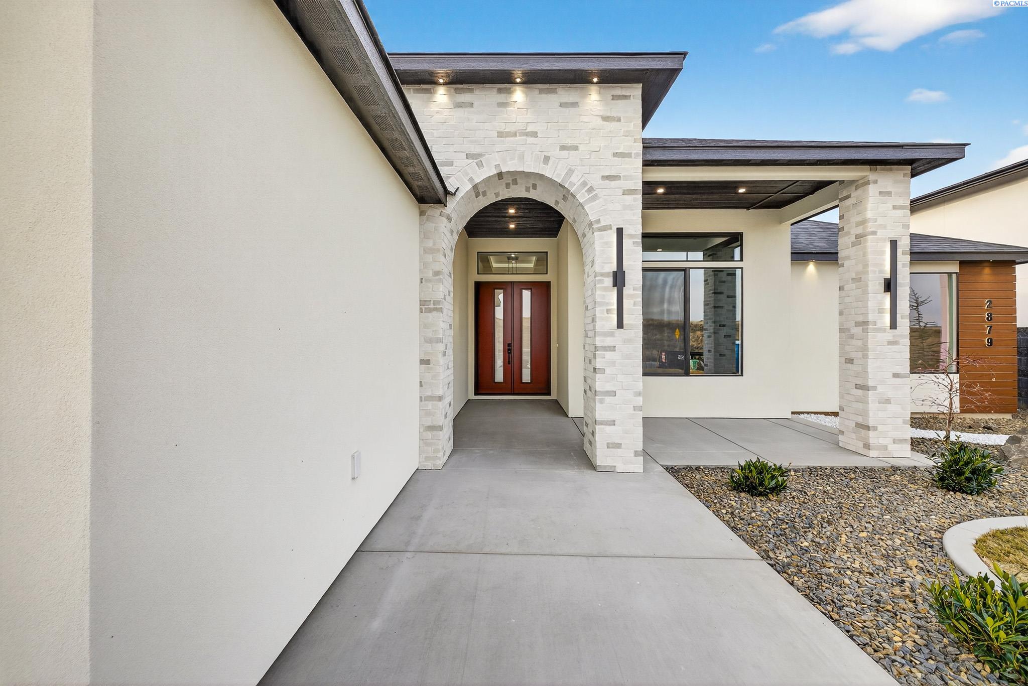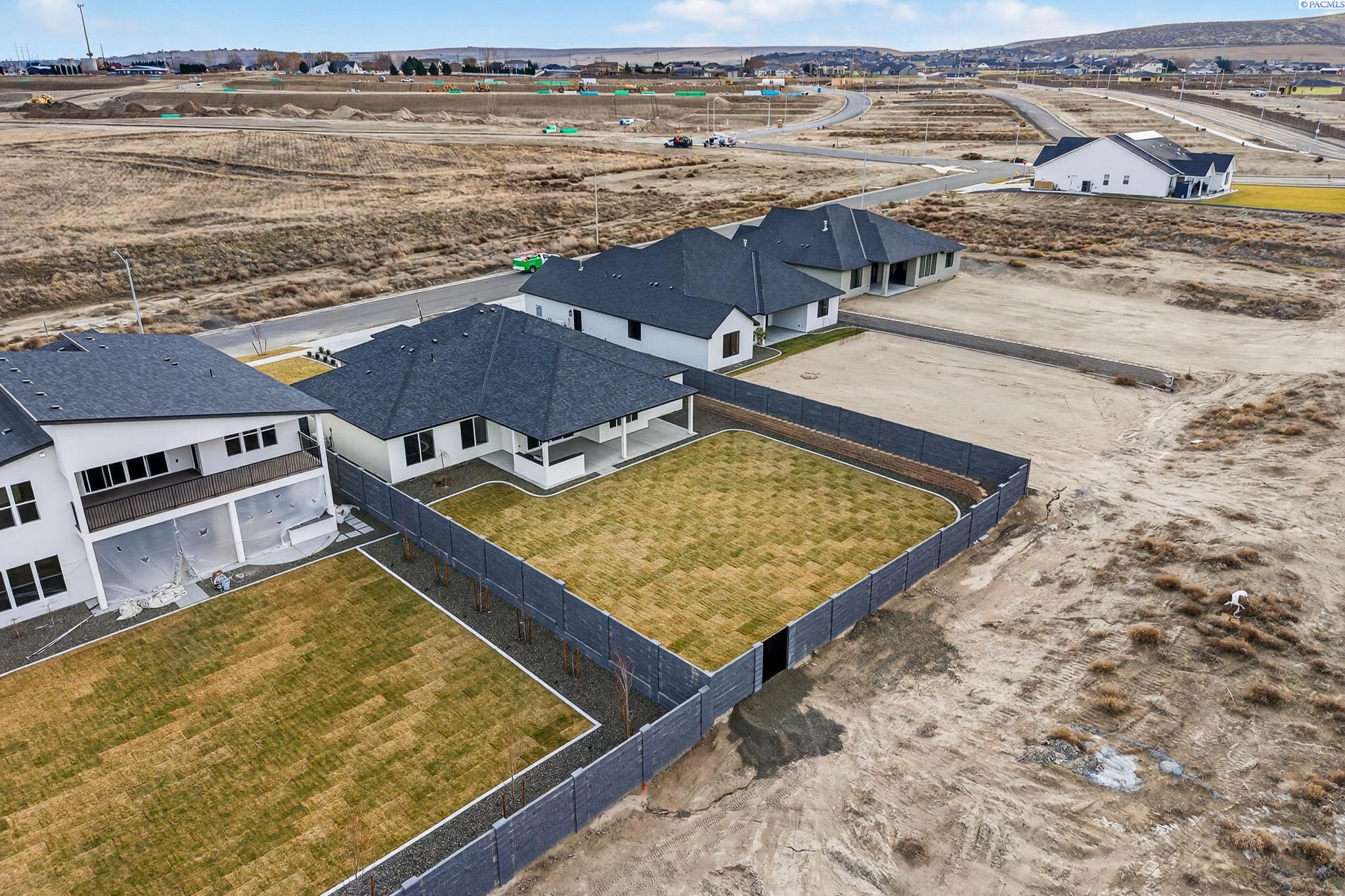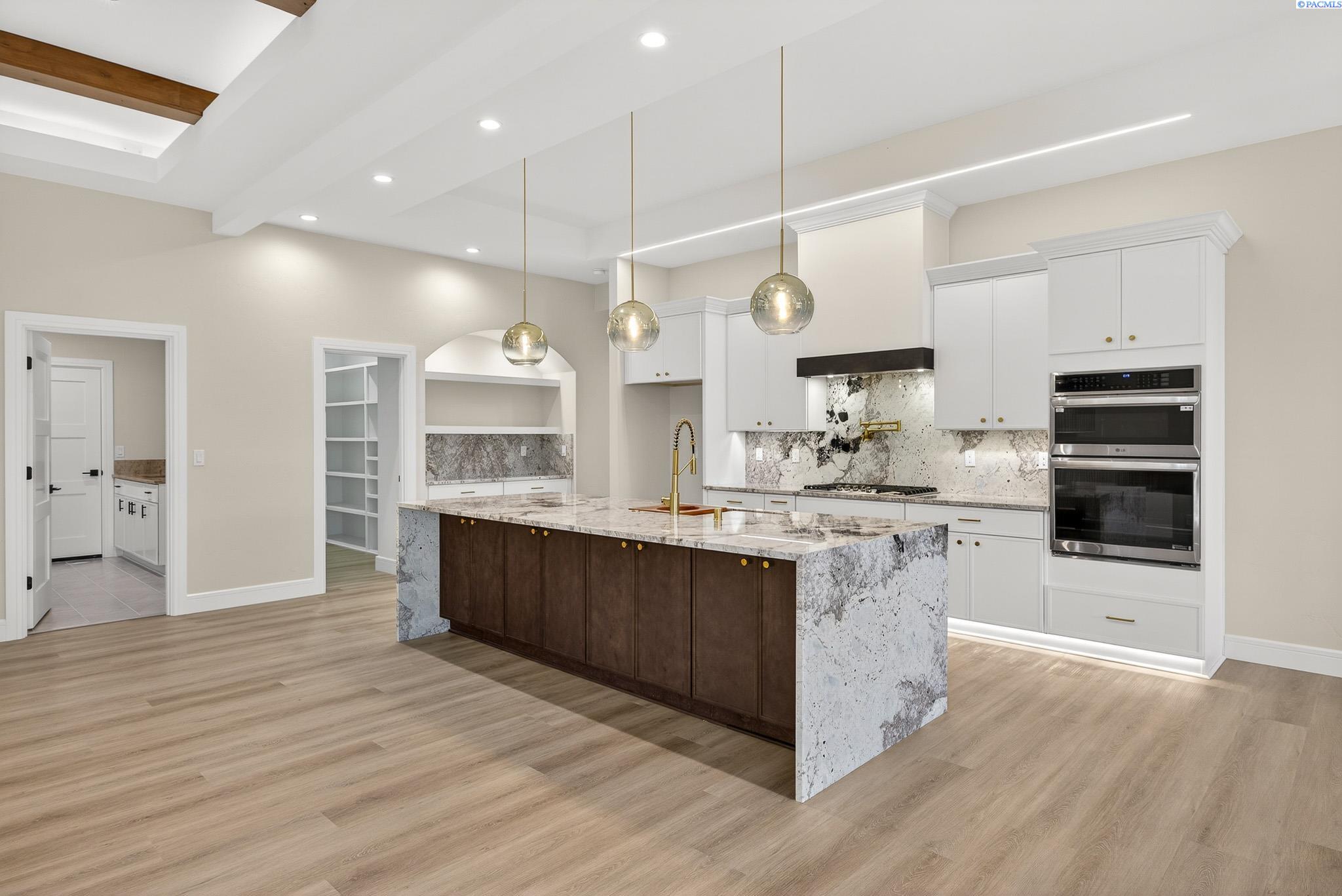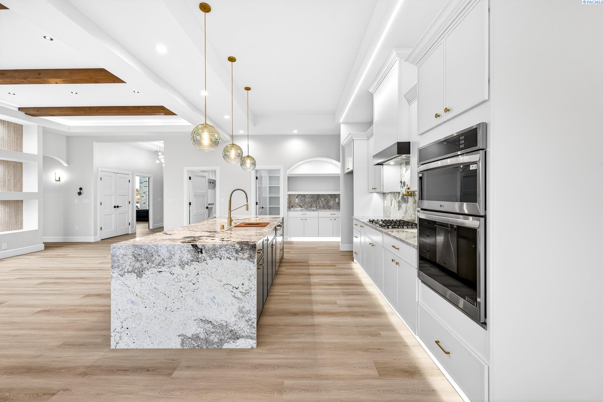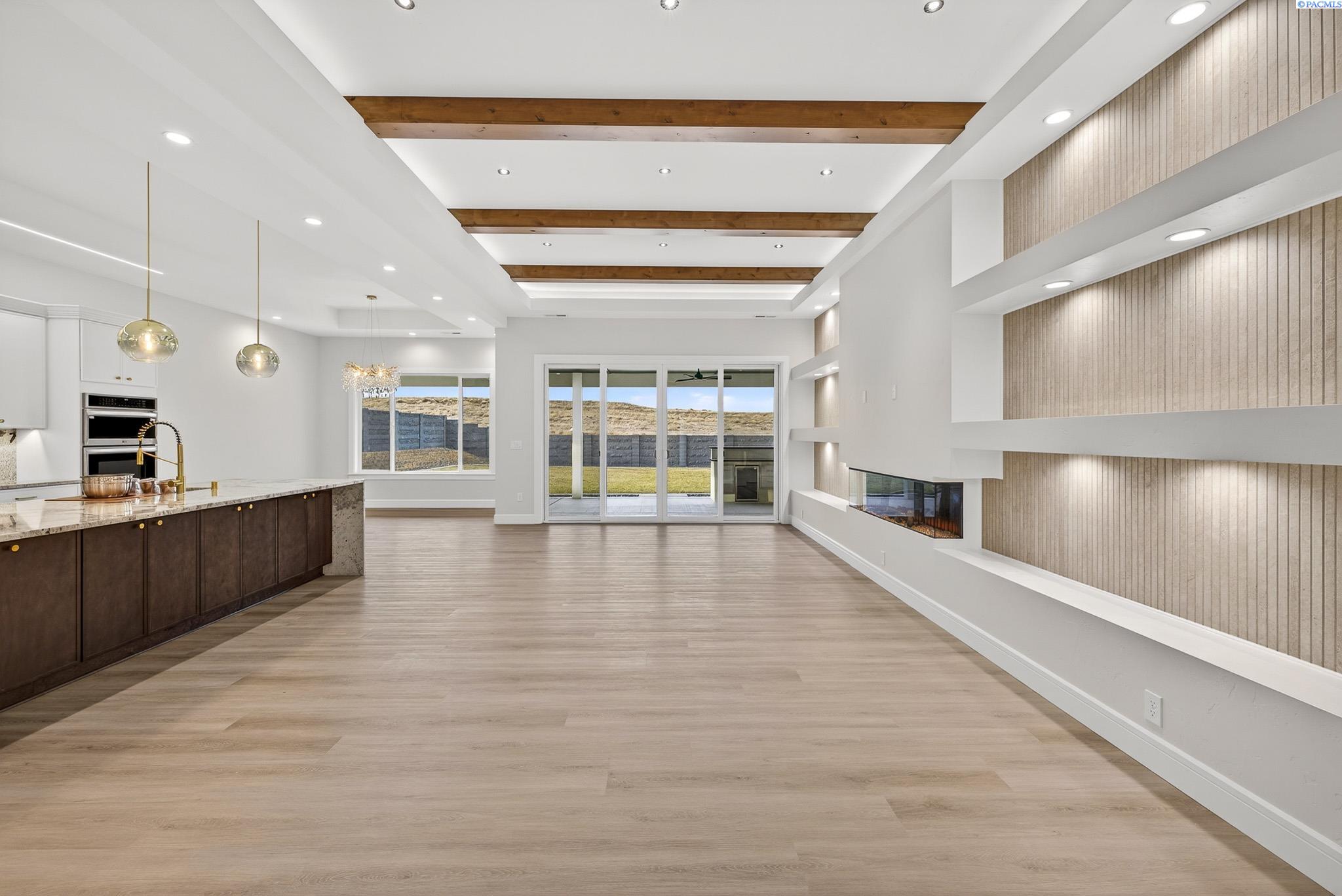 MLS# 288216 This single-story home in the South Orchard community of Richland blends modern architecture, intentional design, and high-end craftsmanship. Set on over a third of an acre, it offers three bedrooms, 3 bathrooms, a dedicated office, a spacious recreation room, and a three-car garage. Step into the foyer and youâre welcomed by eleven-foot ceilings that carry throughout the home. Oversized windows flood the space with natural light, while coffered ceilings with LED lighting in the living room and primary bedroom add a modern, elevated touch. A cozy fireplace anchors the great room, and a large sliding glass door opens to the covered back patio. The chef-inspired kitchen features a striking fourteen-foot waterfall island, a large double-sided sink, stainless steel appliances, a double oven, under-cabinet lighting, and a walk-in pantry. A built-in arched beverage center with display shelving, cabinetry, and accent lighting adds a custom touch. The primary suite includes a walk-in closet designed to impress, featuring built-in shelving on every wall, integrated LED lighting, and a built-in mirror. The spa-like en-suite offers a beautifully tiled walk-in shower with a full-length bench and recessed shelves, a soaking tub, double sinks, and a linen closet. The two additional bedrooms each include their own walk-in closet. The laundry room is thoughtfully designed with a built-in bench and folding table. Step out to the covered back patio, complete with a ceiling fan and built-in lighting, and take in the fully landscaped backyard surrounded by a block wall. Built for entertaining, the outdoor space includes a custom outdoor kitchen with a fridge, sink, and gas grill. Every detail has been thoughtfully selected to blend quality, comfort, and beauty, creating a home that feels both luxurious and welcoming.