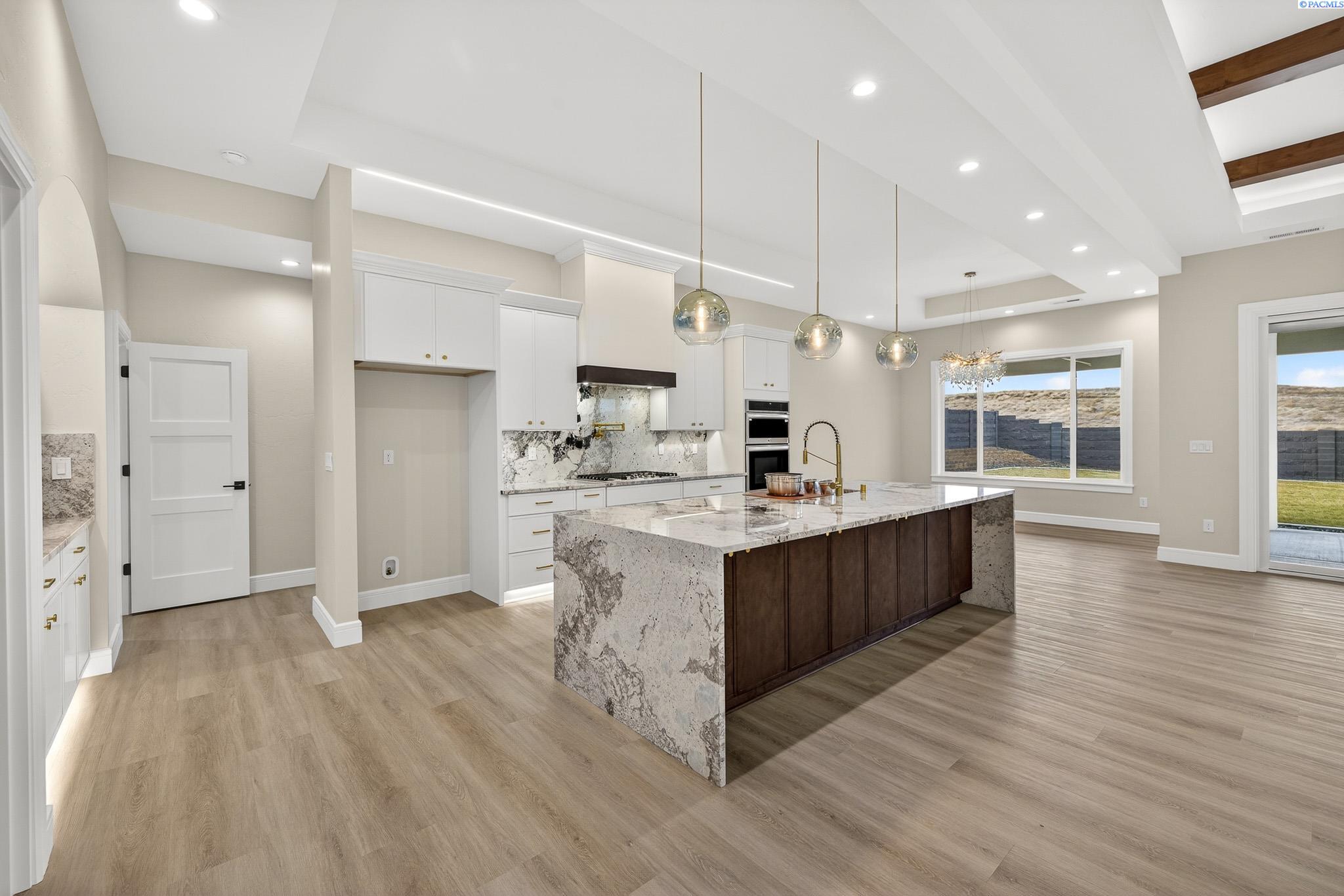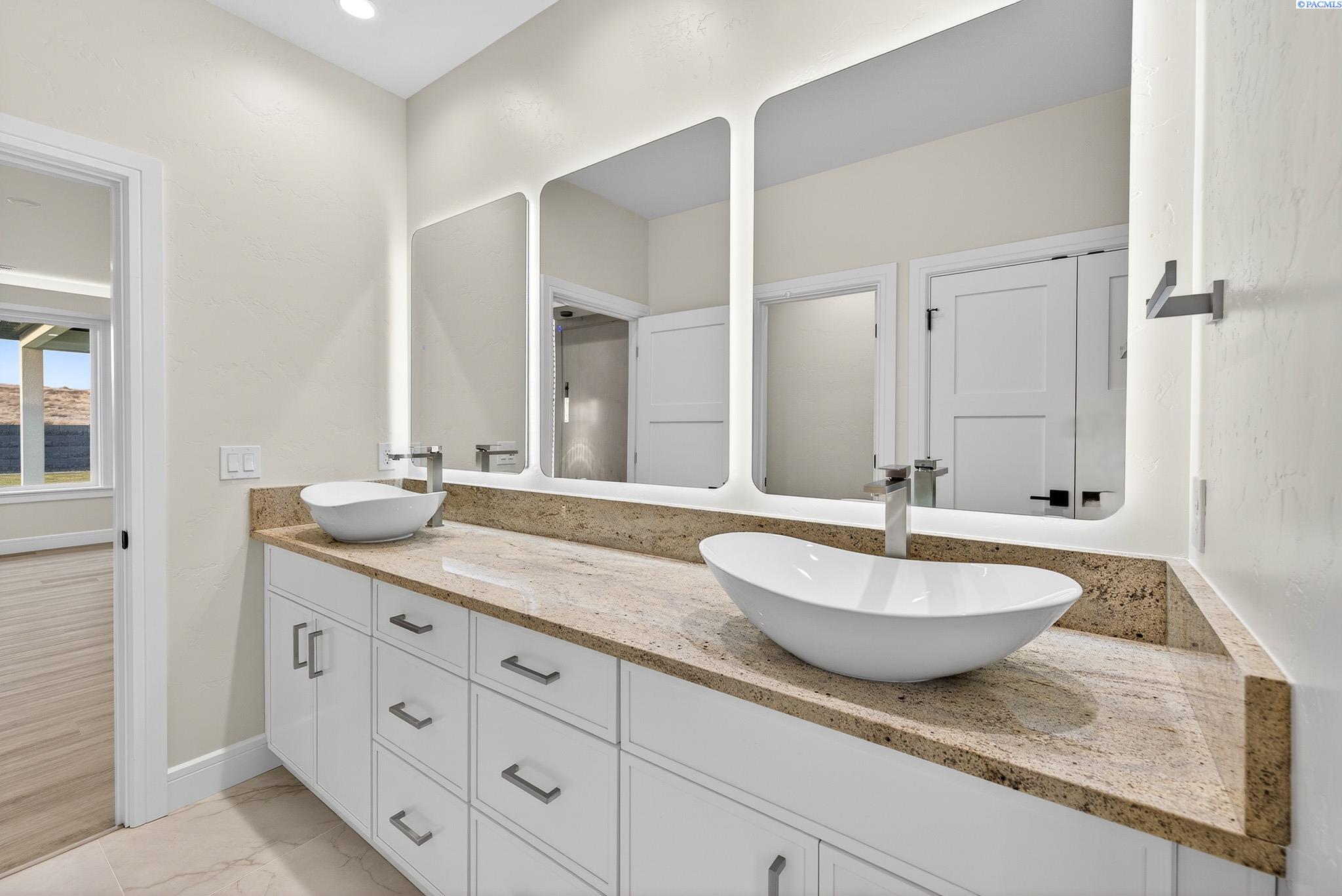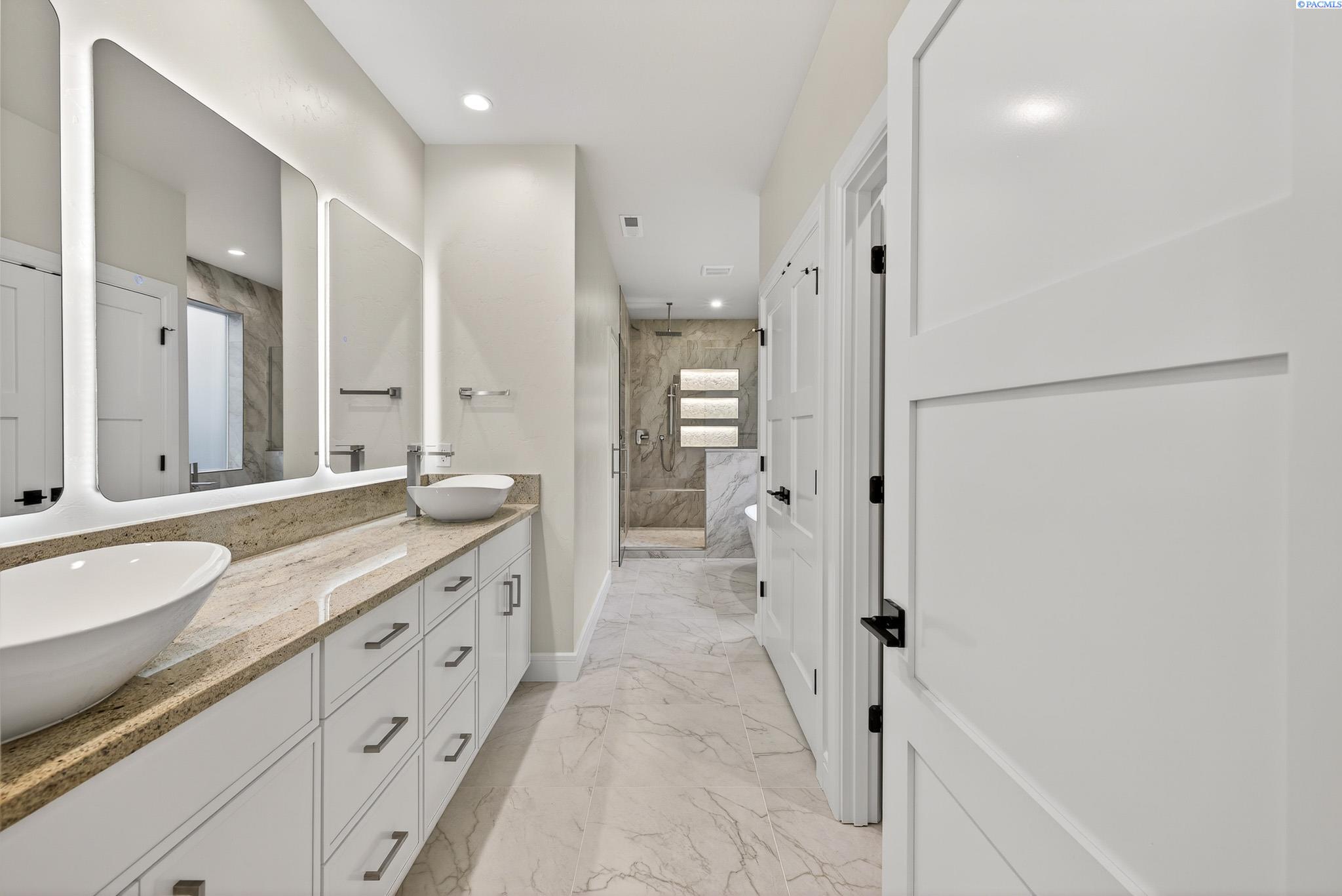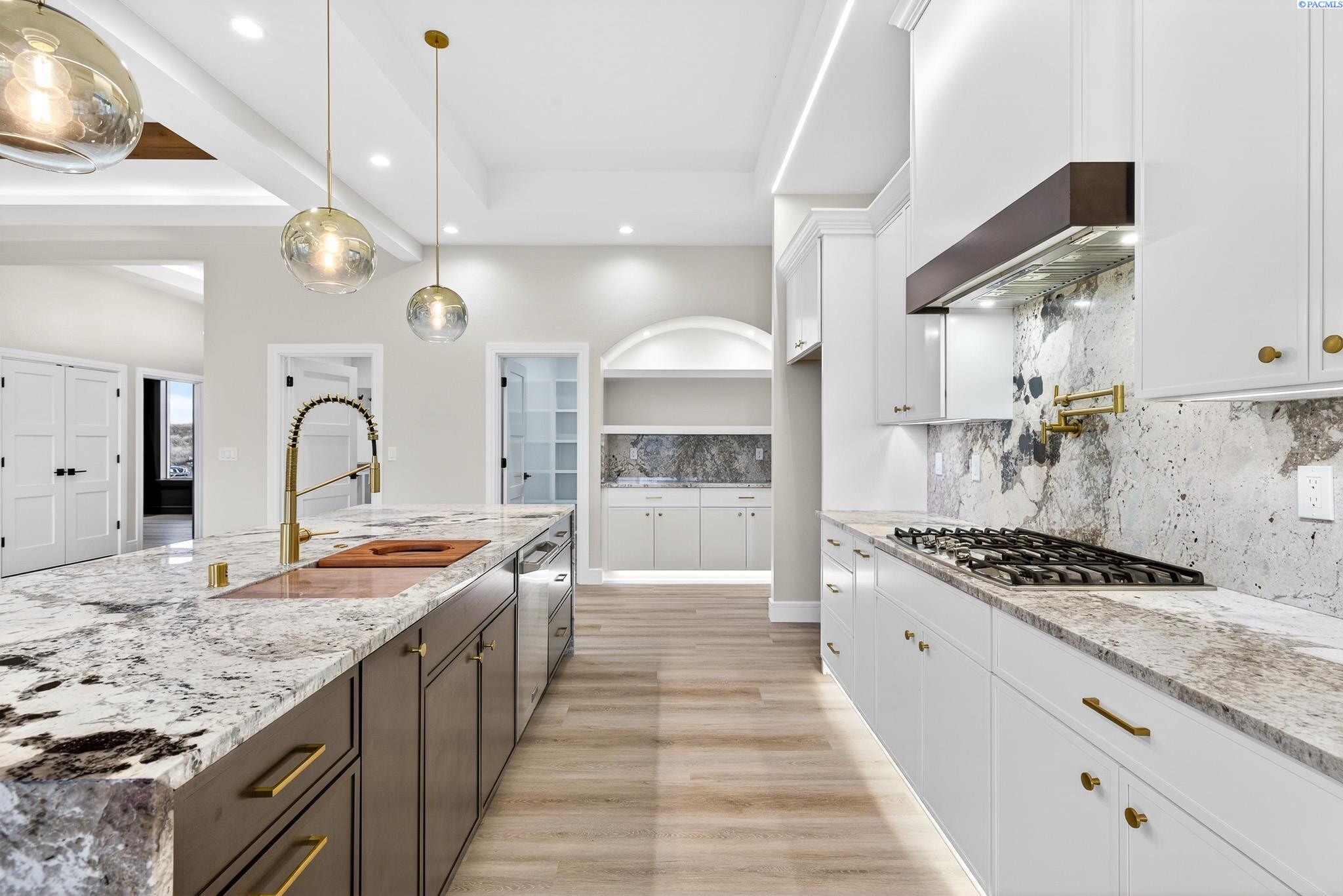 MLS# 288216 This single-story home in the South Orchard community of Richland blends modern architecture, intentional design, and high-end craftsmanship. Set on over a third of an acre, it offers three bedrooms, 3 bathrooms, a dedicated office, a spacious recreation room, and a three-car garage. Step into the foyer and youâre welcomed by eleven-foot ceilings that carry throughout the home. Oversized windows flood the space with natural light, while coffered ceilings with LED lighting in the living room and primary bedroom add a modern, elevated touch. A cozy fireplace anchors the great room, and a large sliding glass door opens to the covered back patio. The chef-inspired kitchen features a striking fourteen-foot waterfall island, a large double-sided sink, stainless steel appliances, a double oven, under-cabinet lighting, and a walk-in pantry. A built-in arched beverage center with display shelving, cabinetry, and accent lighting adds a custom touch. The primary suite includes a walk-in closet designed to impress, featuring built-in shelving on every wall, integrated LED lighting, and a built-in mirror. The spa-like en-suite offers a beautifully tiled walk-in shower with a full-length bench and recessed shelves, a soaking tub, double sinks, and a linen closet. The two additional bedrooms each include their own walk-in closet. The laundry room is thoughtfully designed with a built-in bench and folding table. Step out to the covered back patio, complete with a ceiling fan and built-in lighting, and take in the fully landscaped backyard surrounded by a block wall. Built for entertaining, the outdoor space includes a custom outdoor kitchen with a fridge, sink, and gas grill. Every detail has been thoughtfully selected to blend quality, comfort, and beauty, creating a home that feels both luxurious and welcoming.
