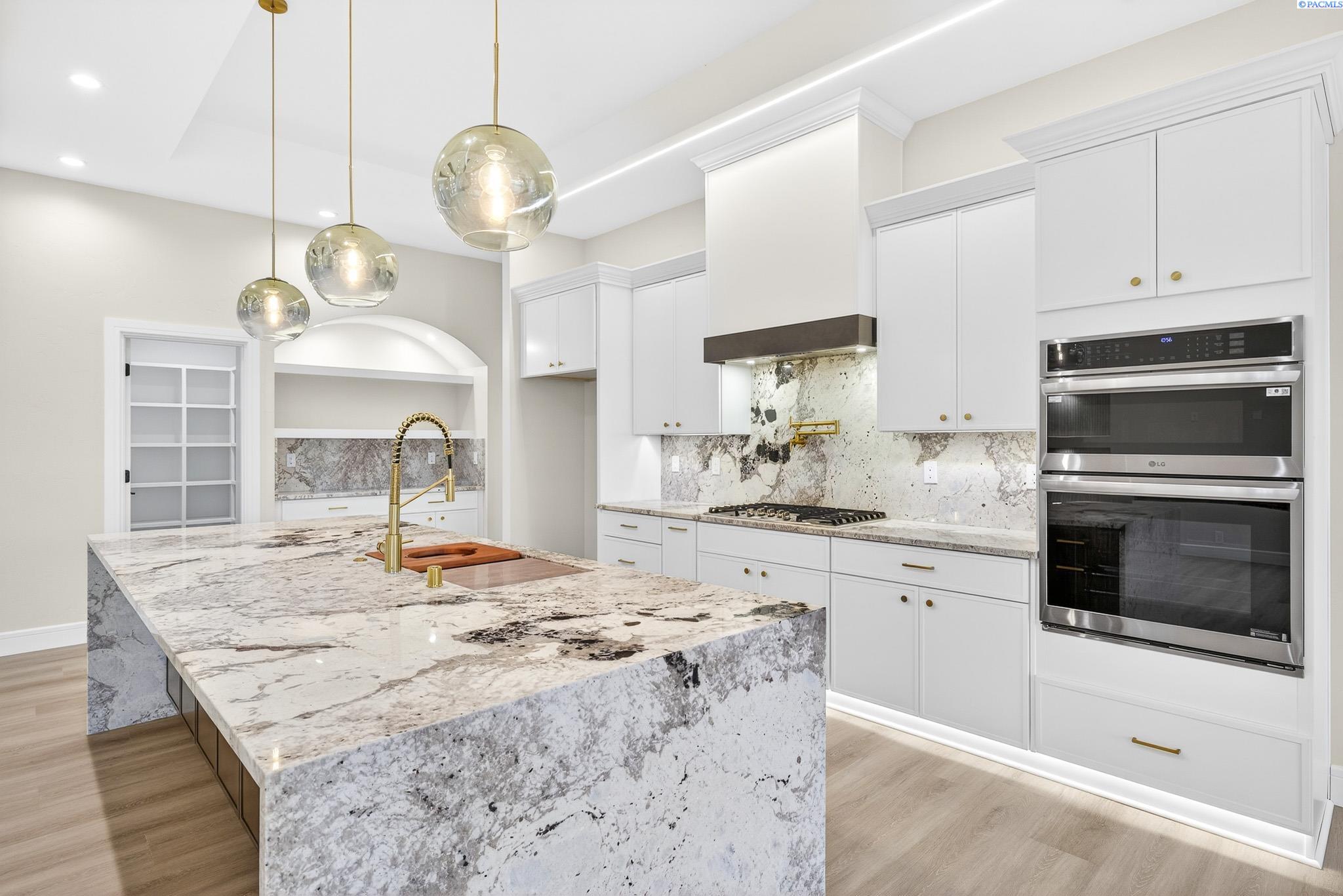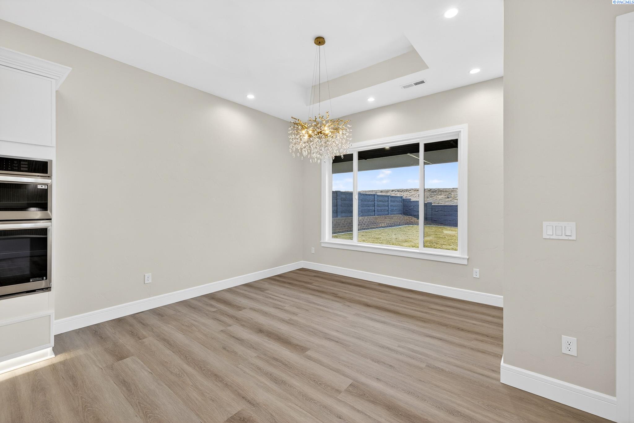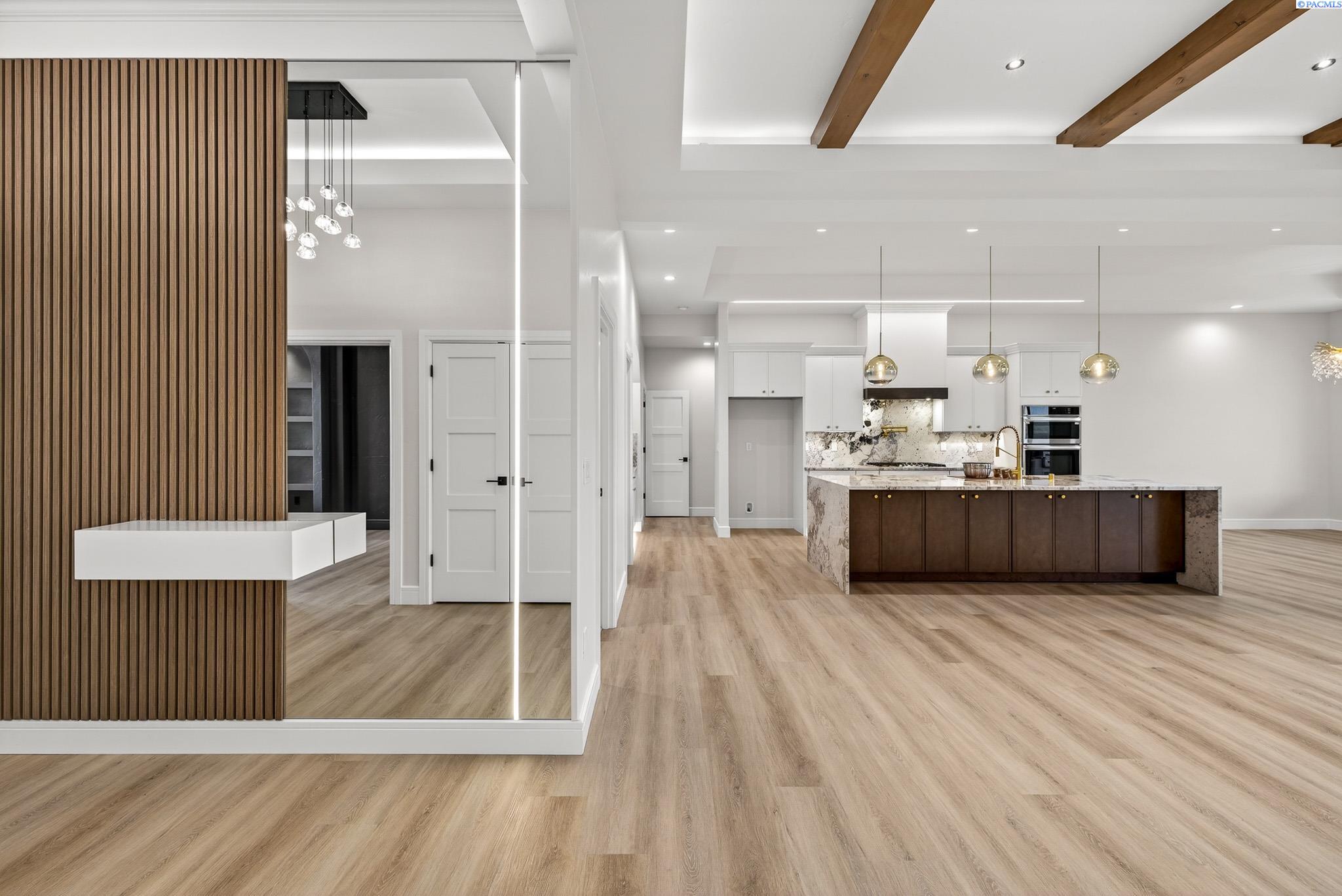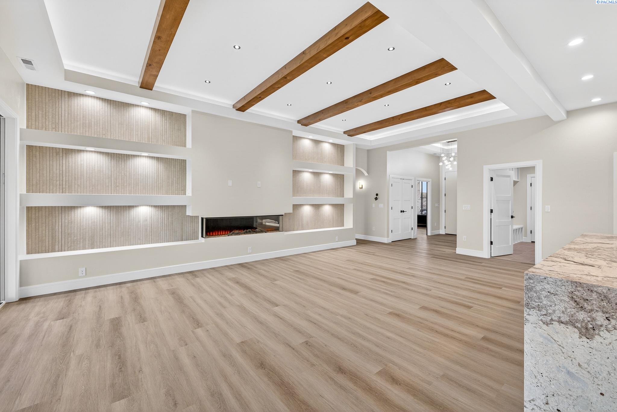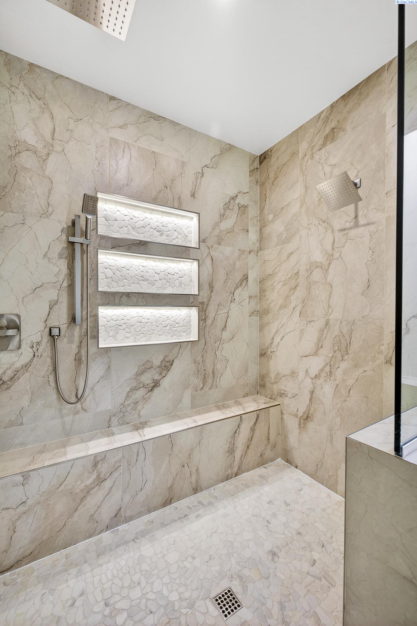 MLS# 288216 This single-story home in the South Orchard community of Richland blends modern architecture, intentional design, and high-end craftsmanship. Set on over a third of an acre, it offers three bedrooms, 3 bathrooms, a dedicated office, a spacious recreation room, and a three-car garage. Step into the foyer and youâre welcomed by eleven-foot ceilings that carry throughout the home. Oversized windows flood the space with natural light, while coffered ceilings with LED lighting in the living room and primary bedroom add a modern, elevated touch. A cozy fireplace anchors the great room, and a large sliding glass door opens to the covered back patio. The chef-inspired kitchen features a striking fourteen-foot waterfall island, a large double-sided sink, stainless steel appliances, a double oven, under-cabinet lighting, and a walk-in pantry. A built-in arched beverage center with display shelving, cabinetry, and accent lighting adds a custom touch. The primary suite includes a walk-in closet designed to impress, featuring built-in shelving on every wall, integrated LED lighting, and a built-in mirror. The spa-like en-suite offers a beautifully tiled walk-in shower with a full-length bench and recessed shelves, a soaking tub, double sinks, and a linen closet. The two additional bedrooms each include their own walk-in closet. The laundry room is thoughtfully designed with a built-in bench and folding table. Step out to the covered back patio, complete with a ceiling fan and built-in lighting, and take in the fully landscaped backyard surrounded by a block wall. Built for entertaining, the outdoor space includes a custom outdoor kitchen with a fridge, sink, and gas grill. Every detail has been thoughtfully selected to blend quality, comfort, and beauty, creating a home that feels both luxurious and welcoming.