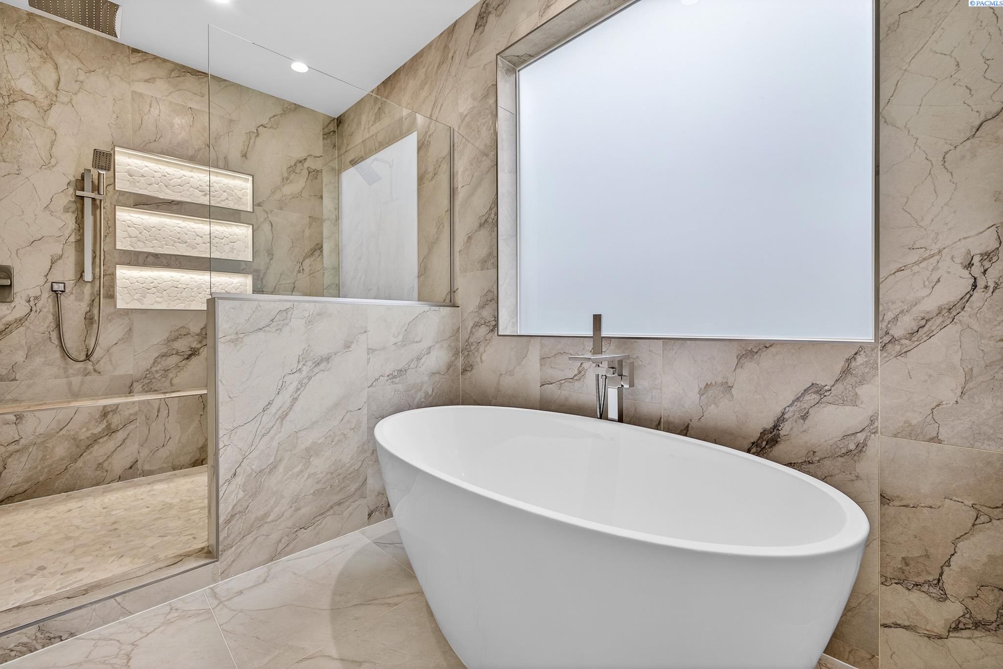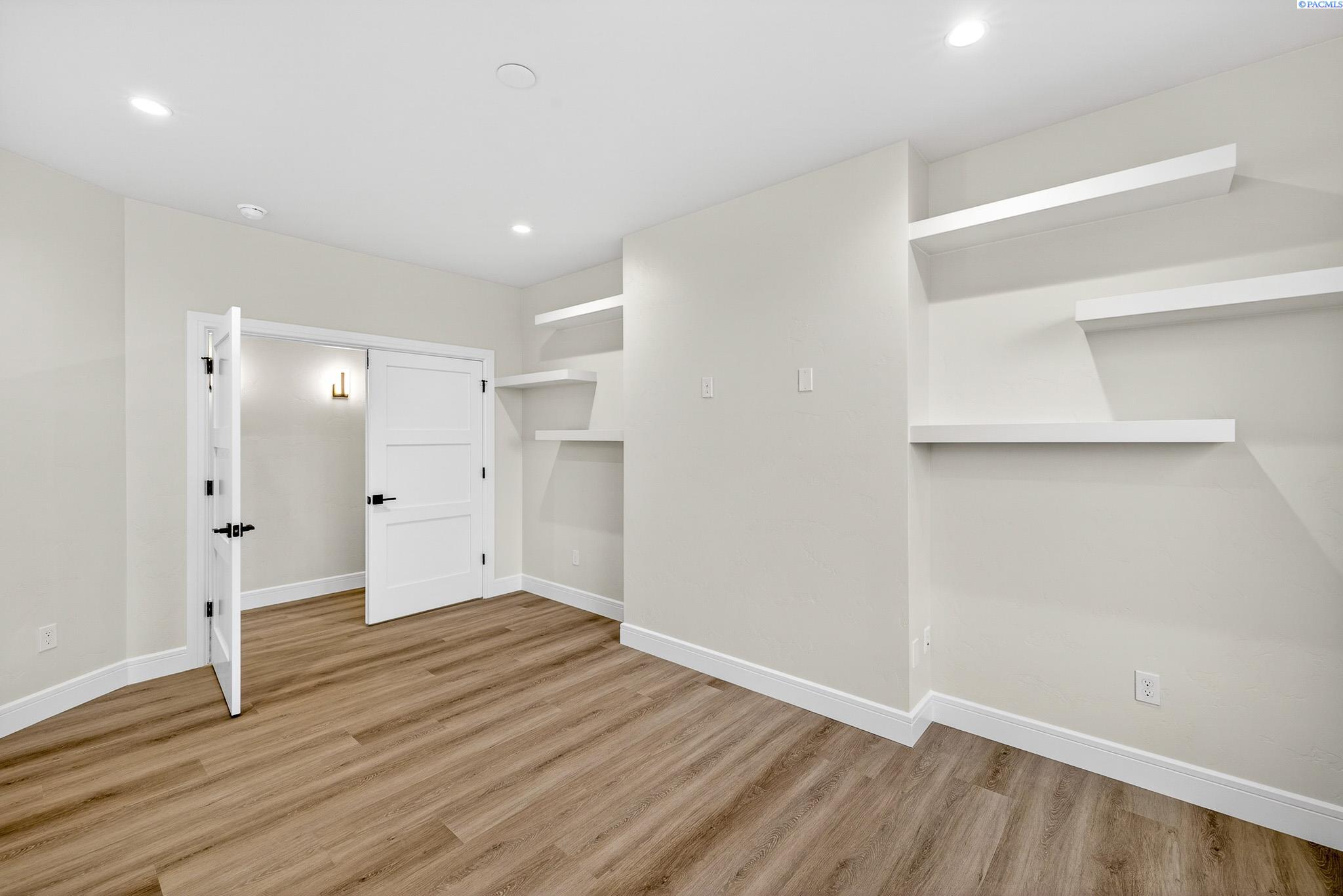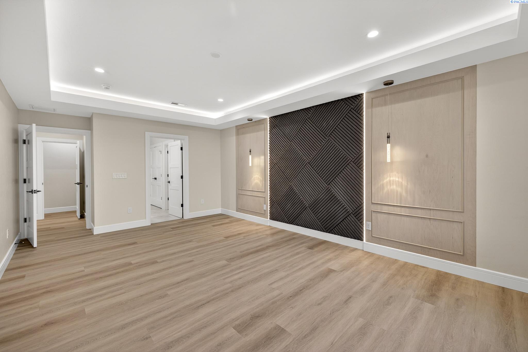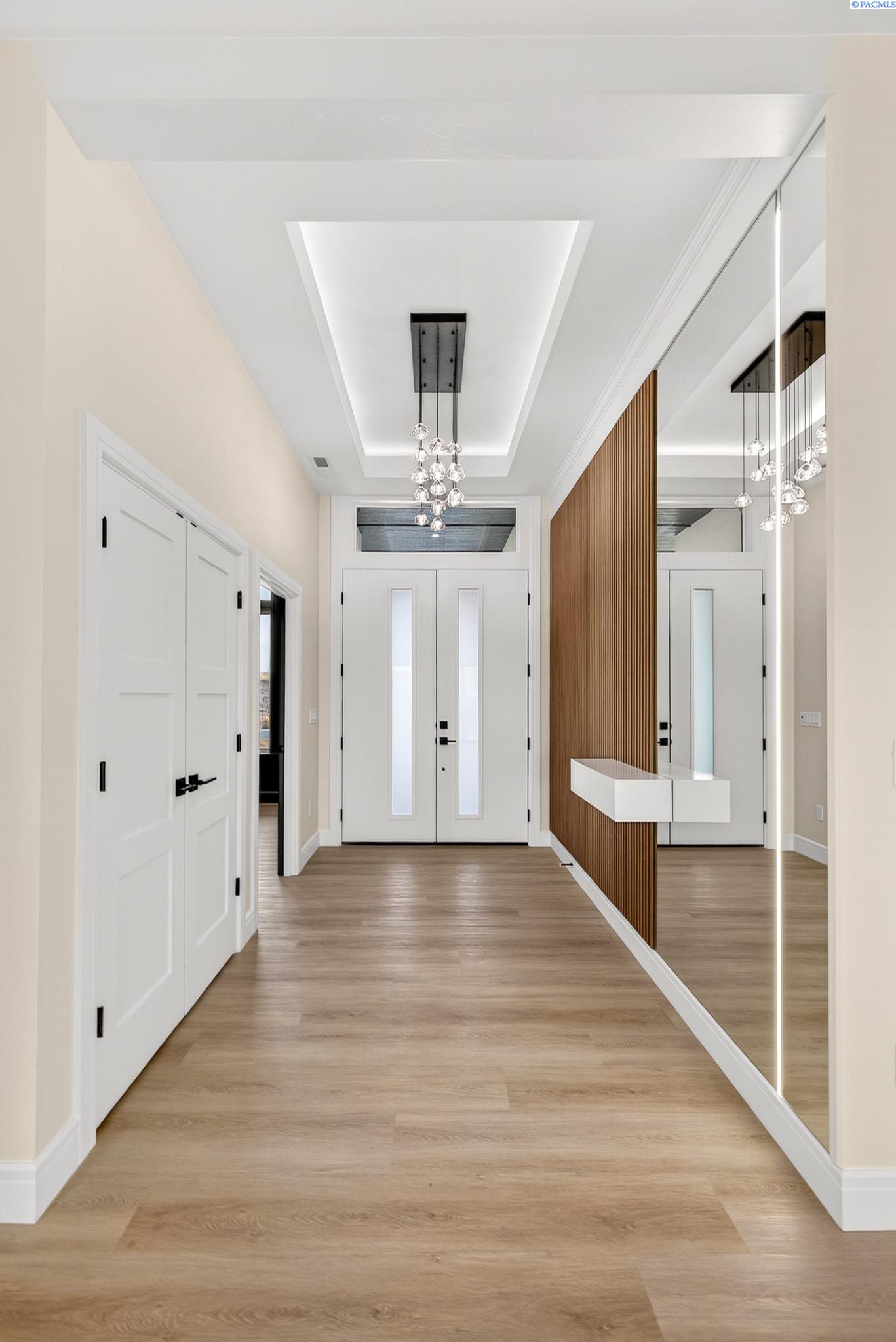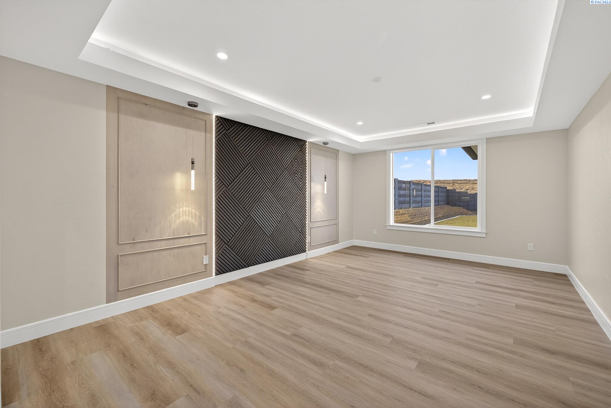 MLS# 288216 This single-story home in the South Orchard community of Richland blends modern architecture, intentional design, and high-end craftsmanship. Set on over a third of an acre, it offers three bedrooms, 3 bathrooms, a dedicated office, a spacious recreation room, and a three-car garage. Step into the foyer and youâre welcomed by eleven-foot ceilings that carry throughout the home. Oversized windows flood the space with natural light, while coffered ceilings with LED lighting in the living room and primary bedroom add a modern, elevated touch. A cozy fireplace anchors the great room, and a large sliding glass door opens to the covered back patio. The chef-inspired kitchen features a striking fourteen-foot waterfall island, a large double-sided sink, stainless steel appliances, a double oven, under-cabinet lighting, and a walk-in pantry. A built-in arched beverage center with display shelving, cabinetry, and accent lighting adds a custom touch. The primary suite includes a walk-in closet designed to impress, featuring built-in shelving on every wall, integrated LED lighting, and a built-in mirror. The spa-like en-suite offers a beautifully tiled walk-in shower with a full-length bench and recessed shelves, a soaking tub, double sinks, and a linen closet. The two additional bedrooms each include their own walk-in closet. The laundry room is thoughtfully designed with a built-in bench and folding table. Step out to the covered back patio, complete with a ceiling fan and built-in lighting, and take in the fully landscaped backyard surrounded by a block wall. Built for entertaining, the outdoor space includes a custom outdoor kitchen with a fridge, sink, and gas grill. Every detail has been thoughtfully selected to blend quality, comfort, and beauty, creating a home that feels both luxurious and welcoming.