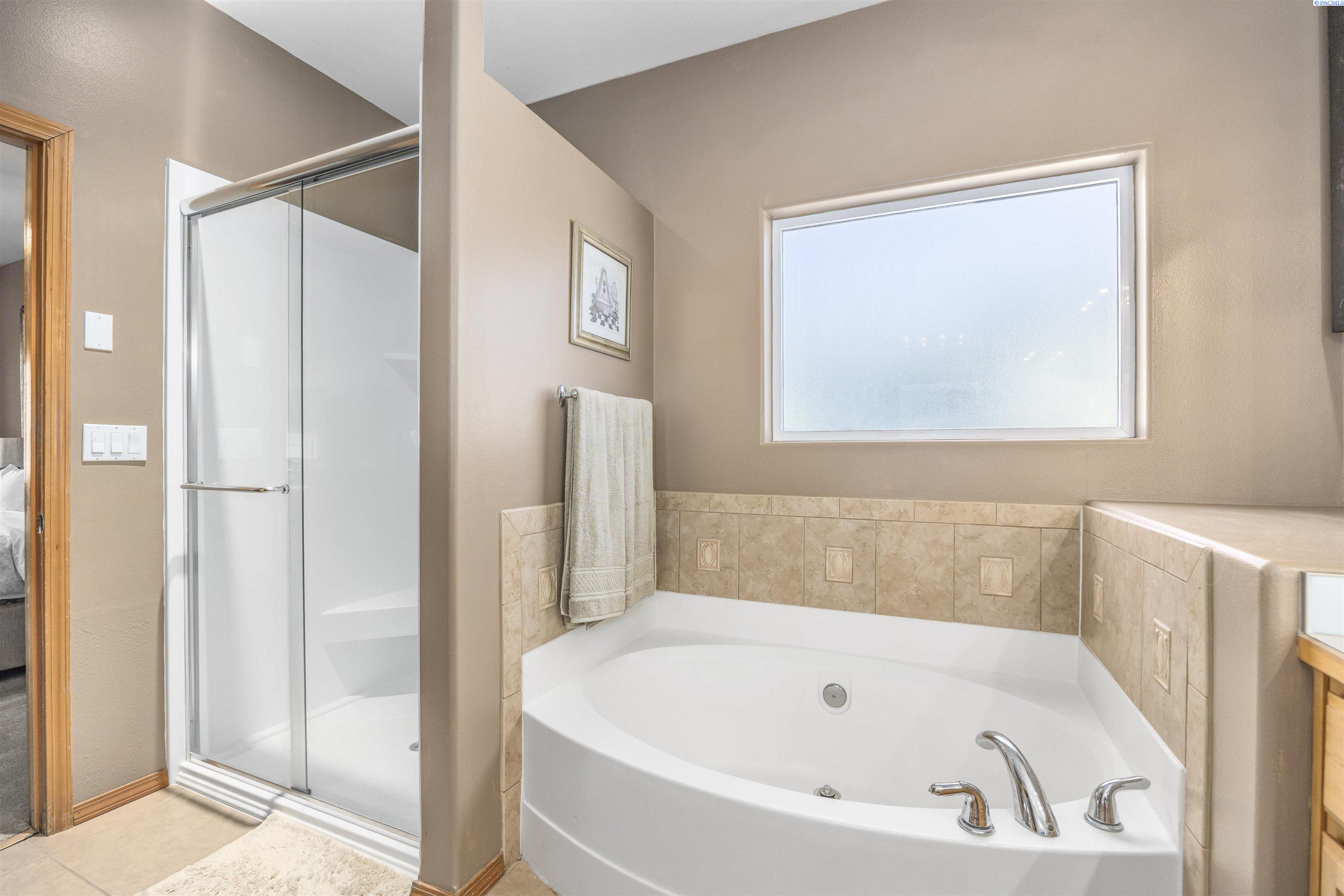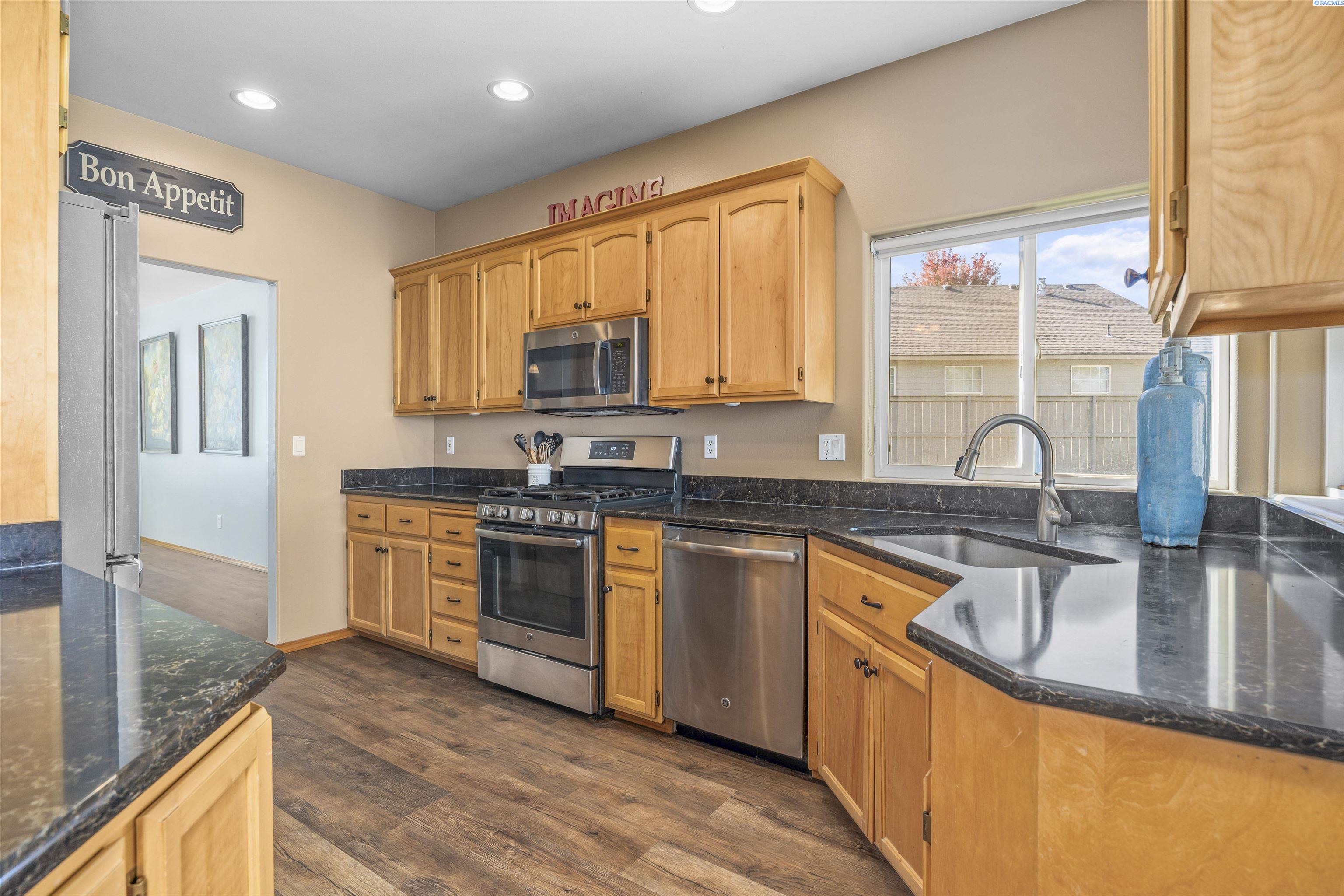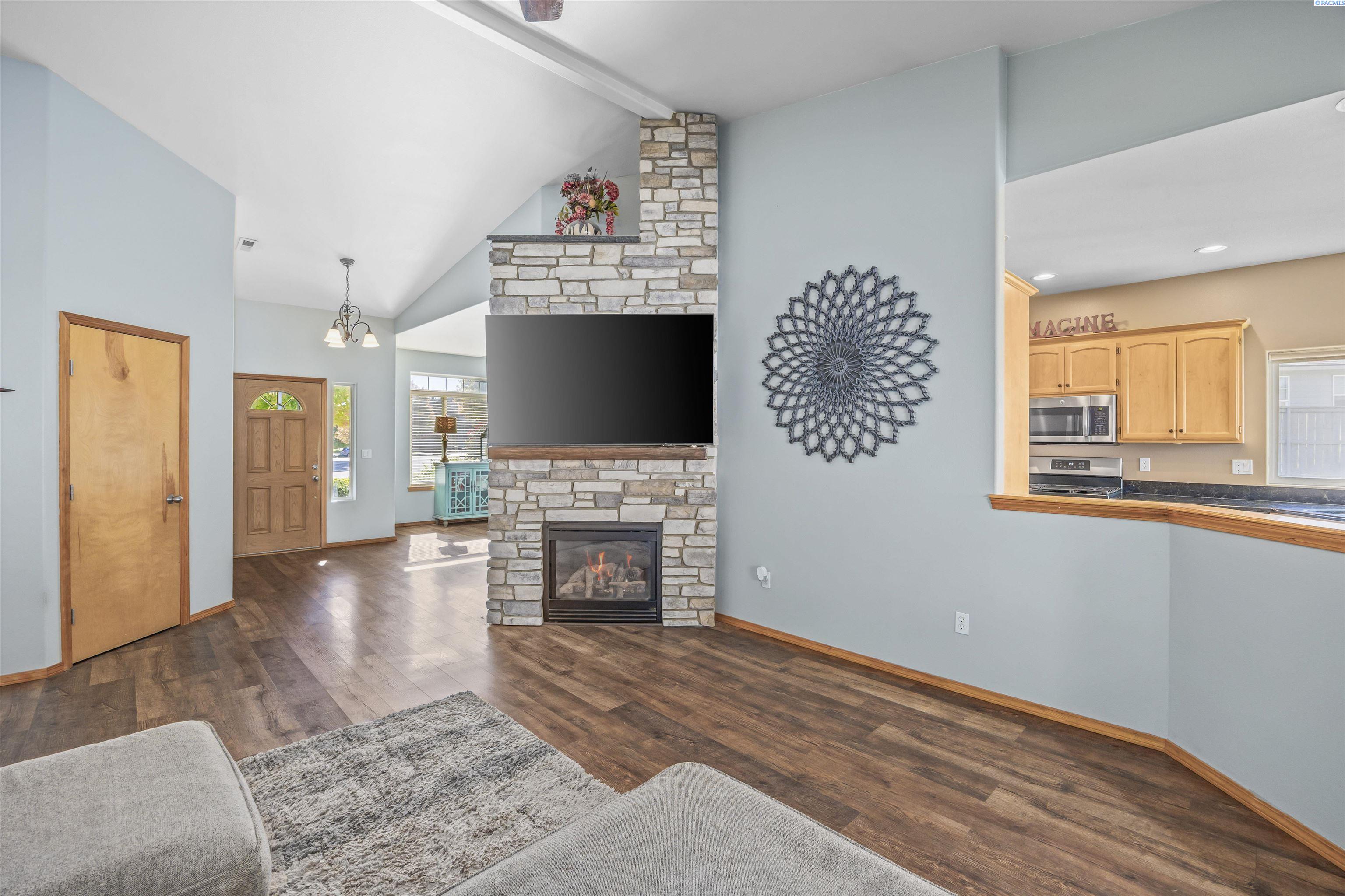 MLS# 288262 Your Next Chapter Begins in Creekstone, West Kennewick! This beautiful single-story home is nestled in the highly sought-after Creekstone community, offering 2,121 sq. ft. of well-designed living space all on one level. With 4 bedrooms and 2 bathrooms, this home combines comfort, style, and functionality. Step inside to discover an open-concept layout featuring vaulted ceilings, a cozy gas fireplace, and large windows that fill the home with natural light. Beautiful laminate wood flooring flows through the main living areas, creating a warm and inviting atmosphere. The kitchen boasts quartz countertops, abundant cabinet and counter space, and a welcoming dining areaâperfect for everyday meals and entertaining alike. Retreat to the spacious primary suite, complete with a generous closet and a private bath featuring a dual-sink vanity, soaking tub, and separate shower. Enjoy outdoor living in the fully fenced backyard with a covered patio, ideal for relaxing or hosting gatherings. The attached 3-car garage offers plenty of room for vehicles, storage, and hobbies. Residents of Creekstone appreciate a vibrant lifestyle with beautifully maintained walking paths, multiple parks, gated RV storage area, nearby schools, and convenient access to shopping, dining, and entertainment. This home truly offers the perfect blend of comfort, elegance, and locationâ Come experience the charm and convenience that make Creekstone the perfect place to call home!