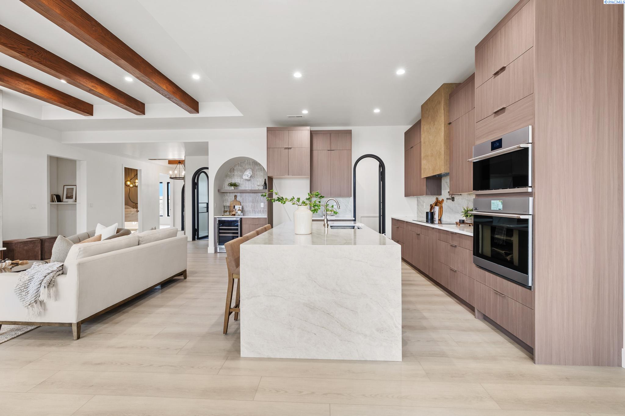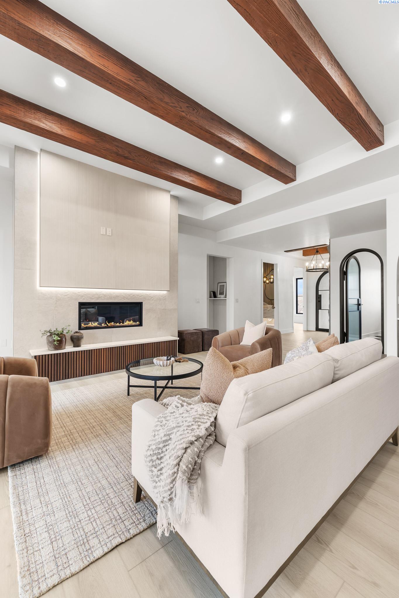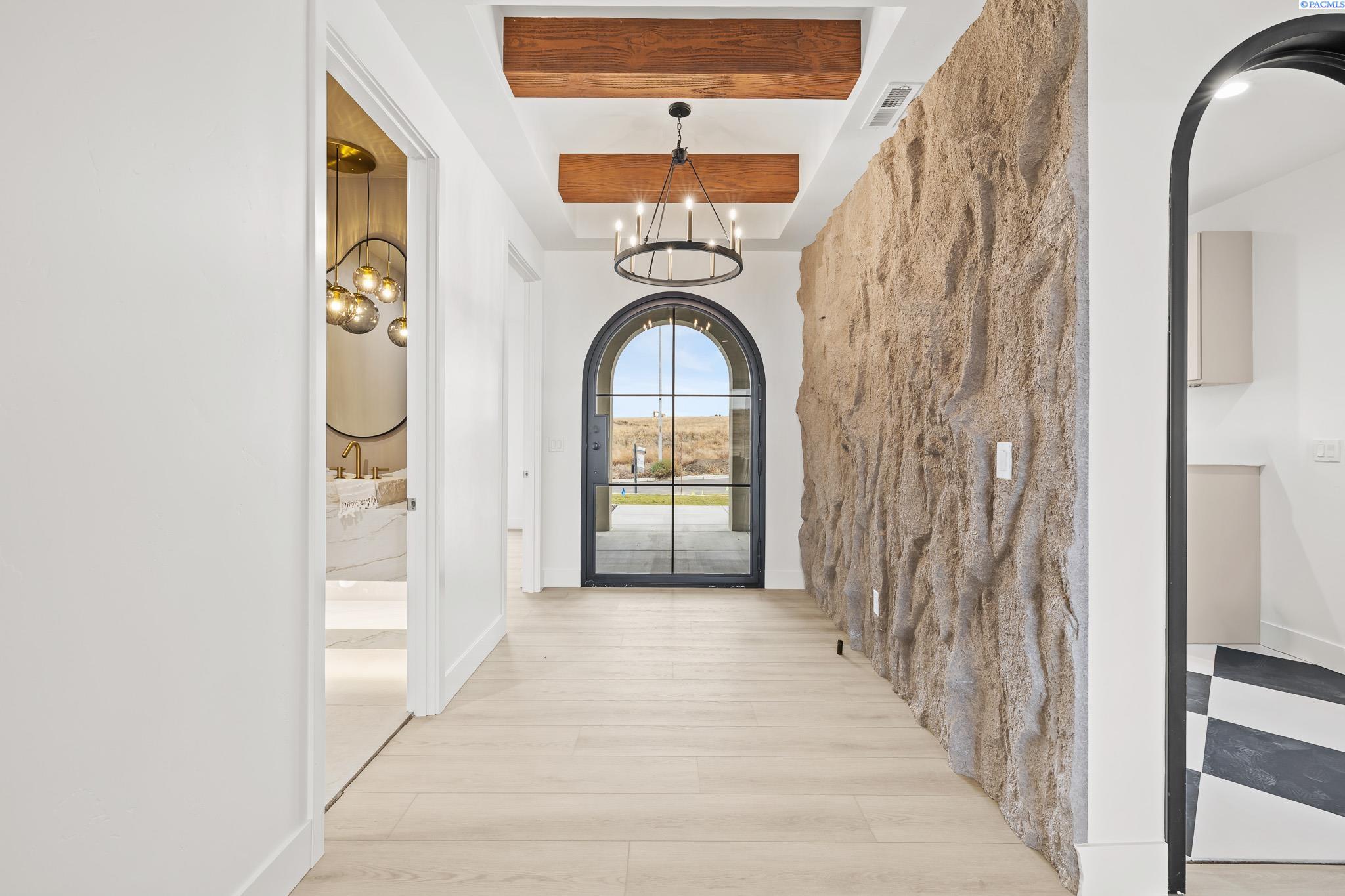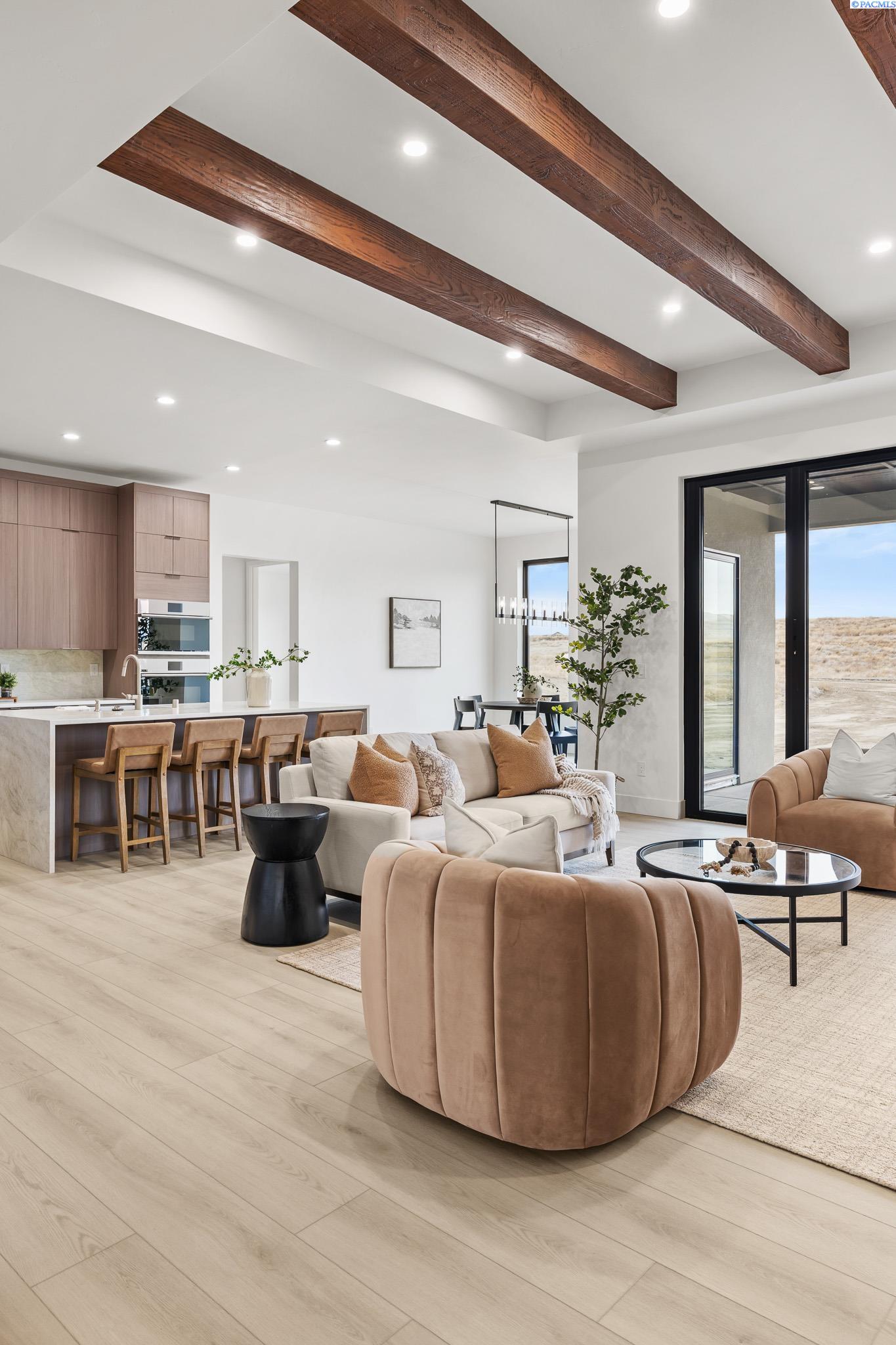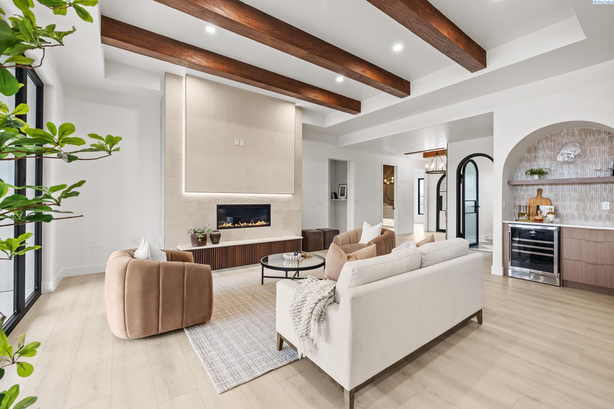 MLS# 289188 Designed with a modern organic style, this beautifully crafted 3-bedroom home with a dedicated office sits on a spacious 1/3-acre lot and offers just under 2,500 sq. ft. of thoughtfully designed living space. The office includes a large closet and can serve as a 4th bedroom, providing excellent flexibility. The home features 2.5 bathrooms, including a full en suite in the primary suite, a shared full bath for the guest bedrooms, and a half bath near the entry. Interior details include arched hallways and doors, rock accent walls, layered LED lighting, and black Andersen window frames. The living room offers exposed ceiling beams and black-framed accordion doors that connect the indoor and outdoor spaces. The kitchen includes modern soft-close cabinetry, a coffee bar with a wine fridge, tile backsplash, and an expansive chefâs pantry with built-in cabinetry, shelving, and countertop workspace. The laundry room provides additional built-in storage and a utility sink. The primary suite includes a fully tiled walk-in shower, freestanding soaking tub, and floor-to-ceiling tile. The guest bath also features full tile and upgraded finishes. The primary closet is equipped with custom shelving and built-ins. Additional features include clear-glass garage doors, a âCostco-styleâ pantry door for easy grocery access from the garage, exposed beams, designer accent walls, upgraded fixtures, and warm LED lighting throughout. This home showcases intentional design and quality craftsmanship throughout.