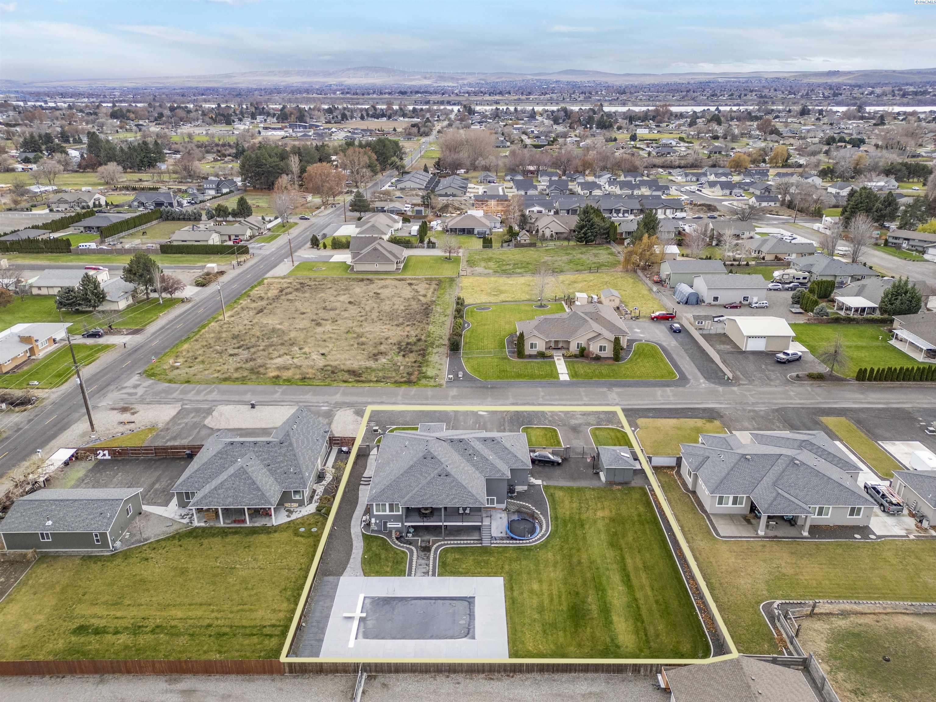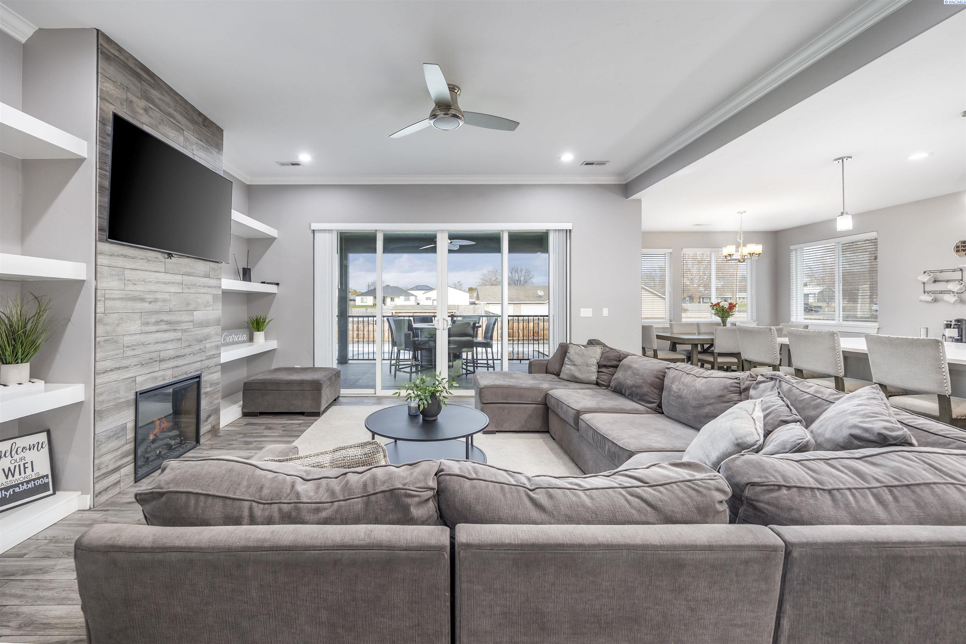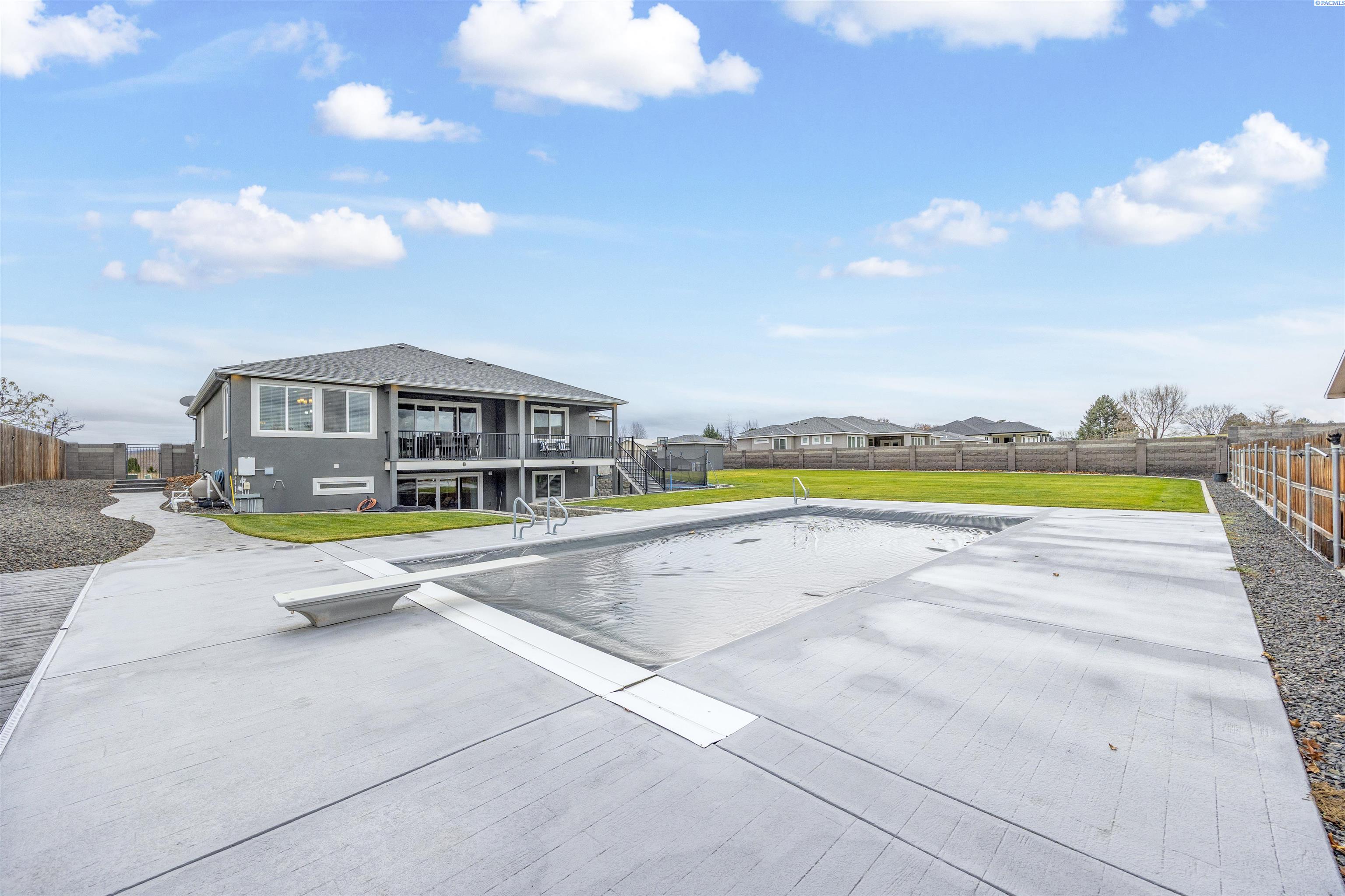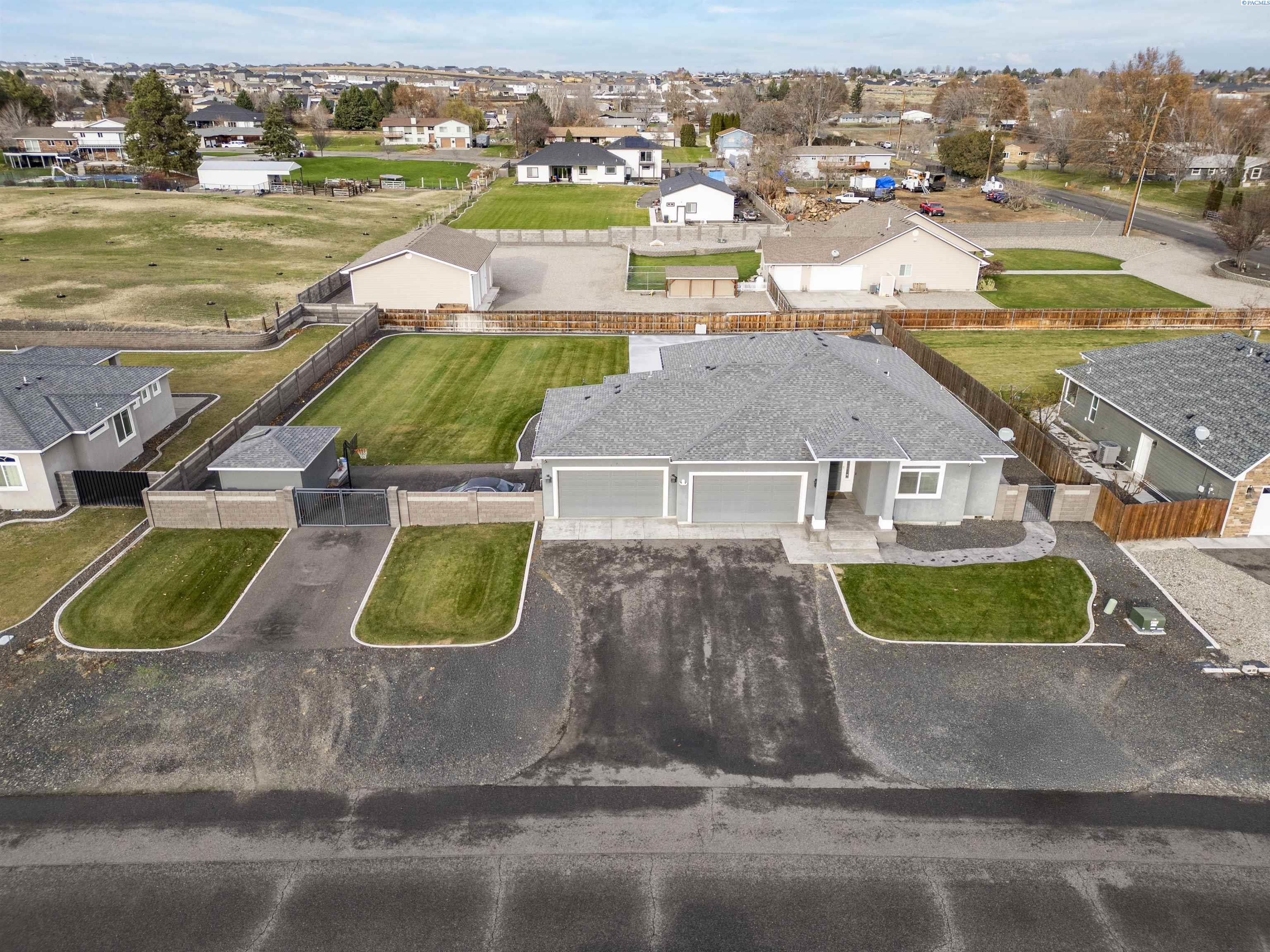 MLS# 289322 Nestled on a peaceful ½-acre lot in Pasco, this stunning property offers exceptional space, comfort, and outdoor livingâincluding a 4-car garage and a sparkling inground pool! Built in 2018, the home features 3,614 sq. ft. of beautifully designed living space in a well-planned 1-level with daylight basement layout, offering 6 bedrooms and 3 bathrooms. The inviting great room showcases a cozy fireplace with built-in shelving, a bright interior with large windows & slider access to the deck, and tile flooring that runs throughout the main level living areas. The chefâs kitchen is equipped with white cabinetry, quartz countertops, a full tile backsplash, island with breakfast bar and beverage fridge, stainless steel appliances, and a generous pantry with a glass door. Enjoy both casual meals and special occasions in the spacious dining area. The main-level primary suite includes a recessed ceiling with ceiling fan, a spacious custom closet, and a private spa-inspired ensuite featuring a dual-sink vanity, jetted tub, and massive tiled shower. The laundry room adds convenience with cabinetry, a utility sink, and a built-in bench for extra storage. The daylight basement expands your living space with the 6th bedroom that is large enough to be a bonus/theater room, and a large family room with laminate flooring, a wet bar, and direct access to the backyardâperfect for entertaining or multi-generational living. Step outside to a fully fenced backyard that feels like a retreat: gate access for boat or RV parking, covered patio and deck areas for year-round enjoyment, a spectacular 20x40 in-ground pool with a brand-new liner (2024), and an electric automatic pool cover for safe and easy maintenance. A generous lawn area and matching storage shed complete the outdoor space. With an attached 4-car garage, plenty of off-street parking, and a serene setting just minutes from premier West Pasco amenities, this rare property offers the perfect blend of country-like tranquility and modern convenience.