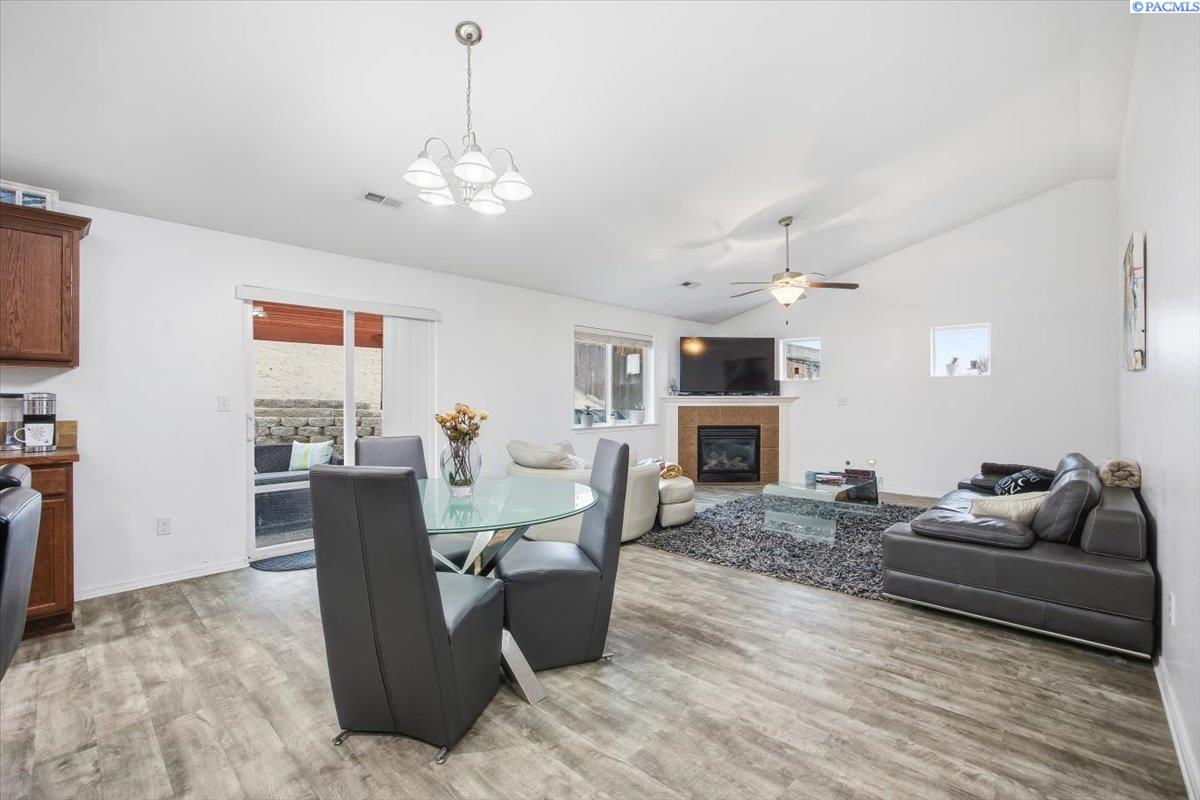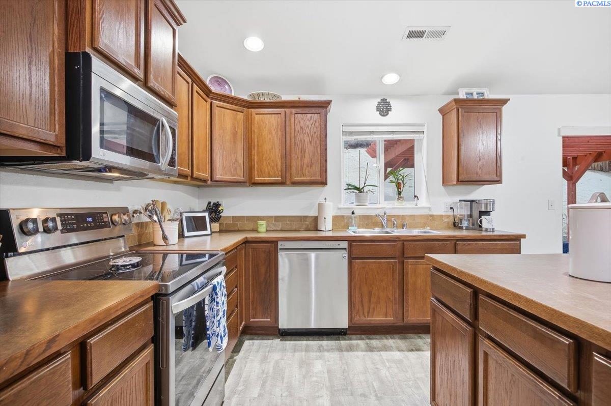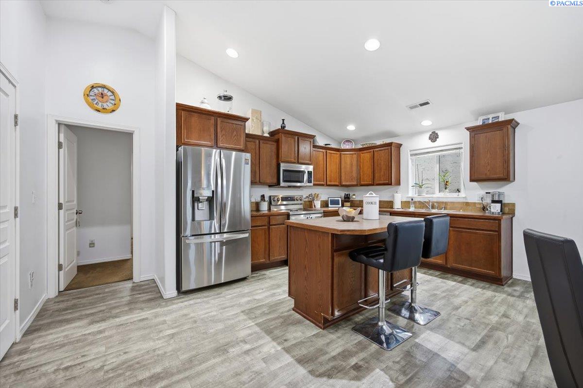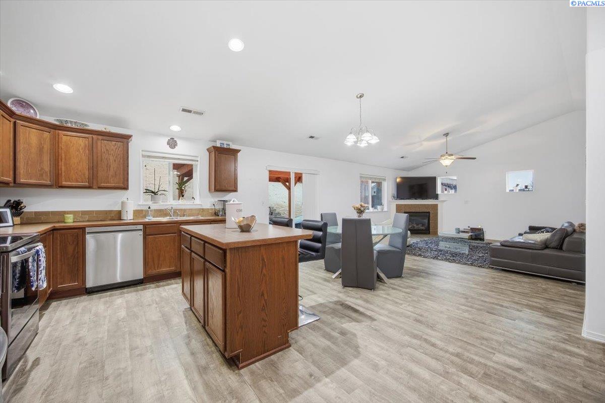 Welcome to 5002 Blue Sage Ln in West Pasco! Built on an oversized cul-de-sac for privacy without sacrificing convenience. This 4-bed, 2-bath home offers 1,600+ sq ft with an open layout, vaulted ceilings, and a seamless flow from the foyer to the kitchen and great room ideal for everyday living and entertaining. Three bedrooms share a full bath, while the primary suite is tucked away for privacy and features dual vanities and two closets. The front yard is beautifully maintained with a producing fruit tree (nectarines, peaches, plums, apricots). Out back, enjoy a blank-slate yard with a fire pit and pergola ready for your imagination. Quiet location, close to West Pasco shopping and dining. Come and make this your new home today!