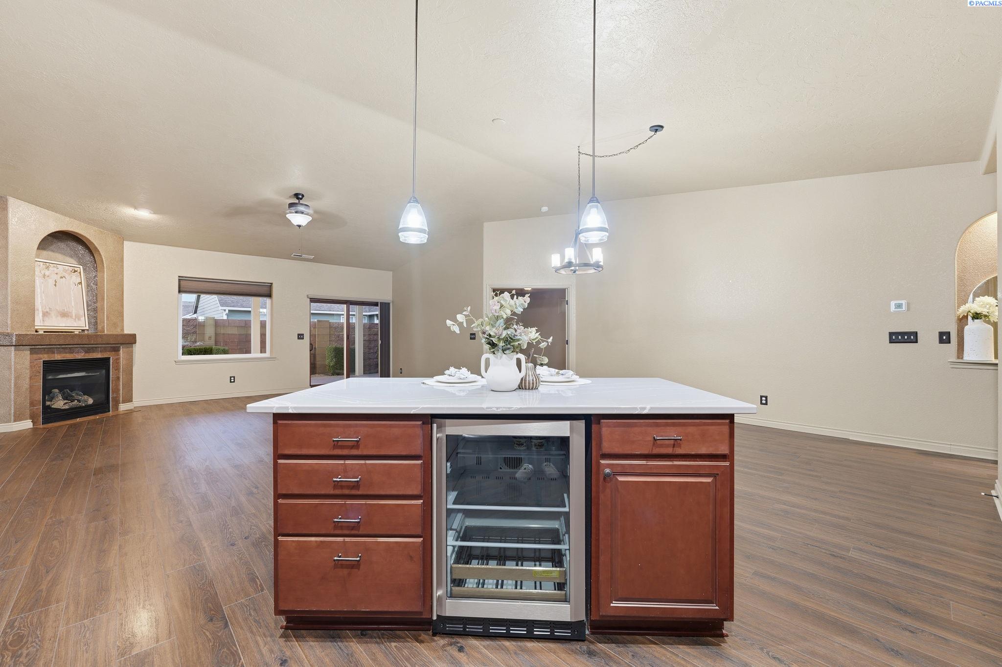 Enjoy easy, one level living in this well-crafted townhouse designed for comfort, space, and simplicity. Offering 3 bedrooms, 2 bathrooms, and 1,803 sq ft of living space, this home also includes a 2-car attached garage and a layout that feels both open and functional. The spacious great room features a tile accented fireplace that serves as a natural gathering point and adds warmth to the living space. The kitchen is thoughtfully designed with custom cabinetry, display shelving, and quartz countertops, providing ample storage and workspace for everyday living or entertaining. The primary suite offers a private escape with tile flooring, dual vessel sinks, a walk-in tile shower, and a large walk-in closet with custom built ins. Durable LVP and tile flooring extend throughout the home, complemented by custom built-in niches that add character and practical storage. With lawncare included, this townhome offers low maintenance living in a convenient setting, perfect for those seeking space, quality, and ease all in one!
