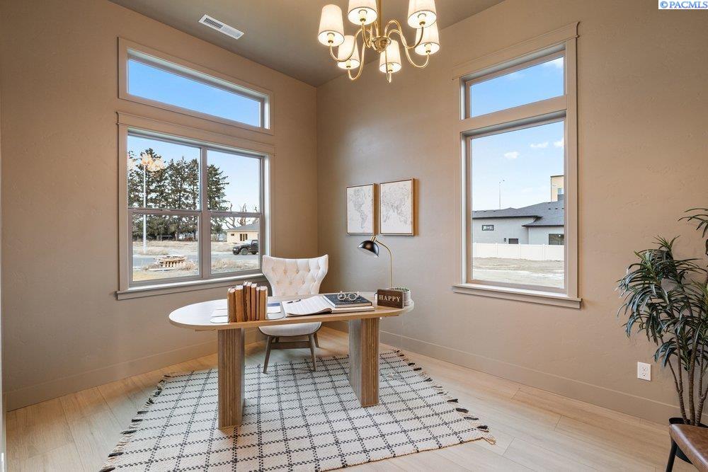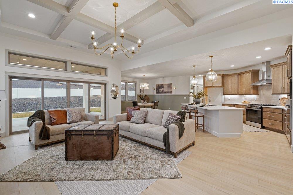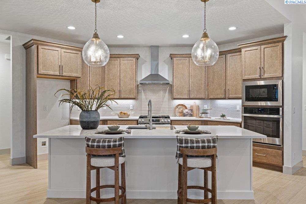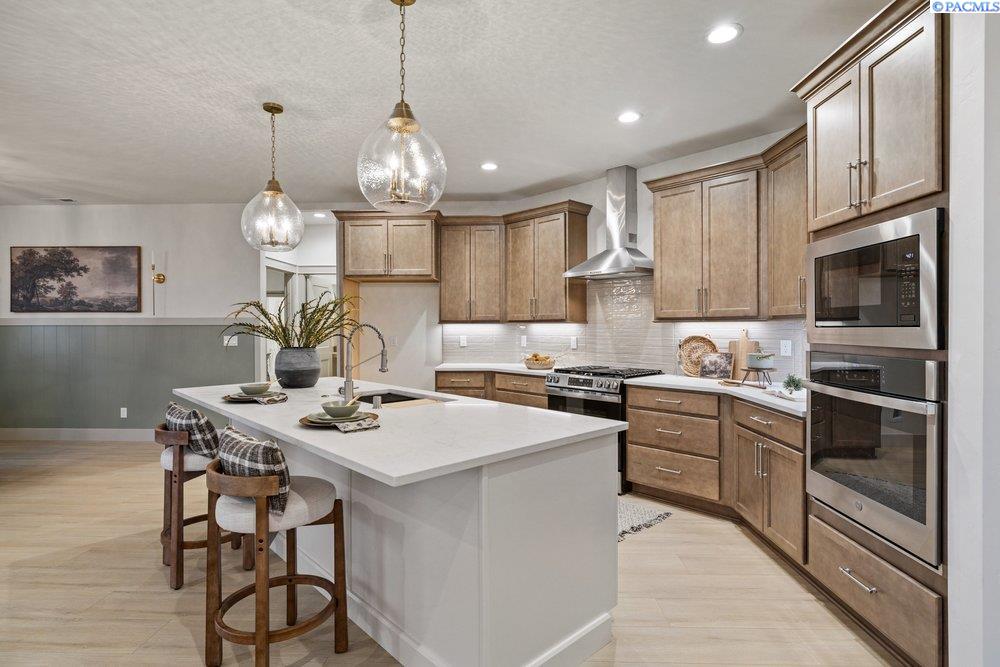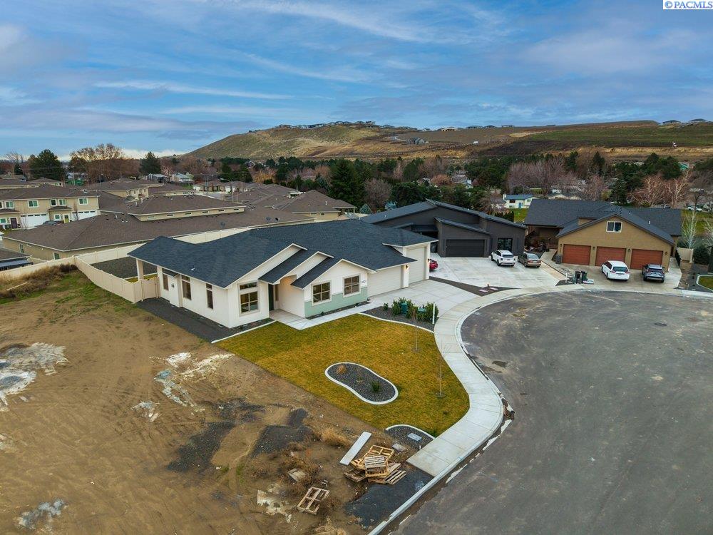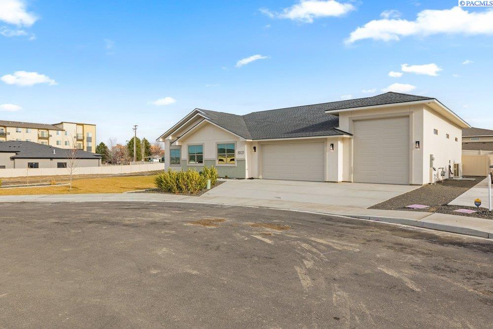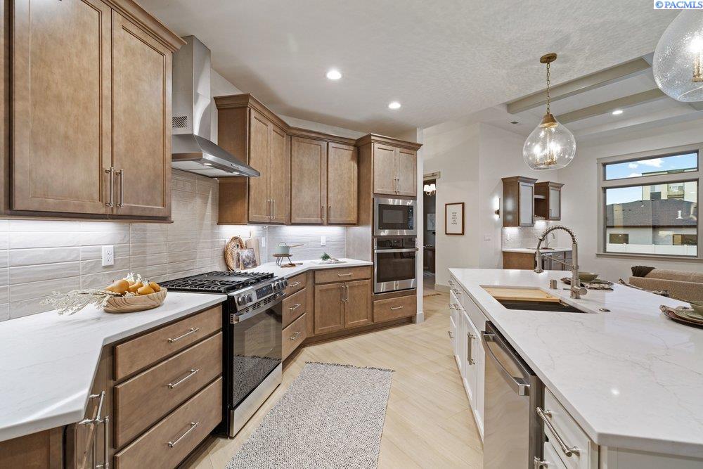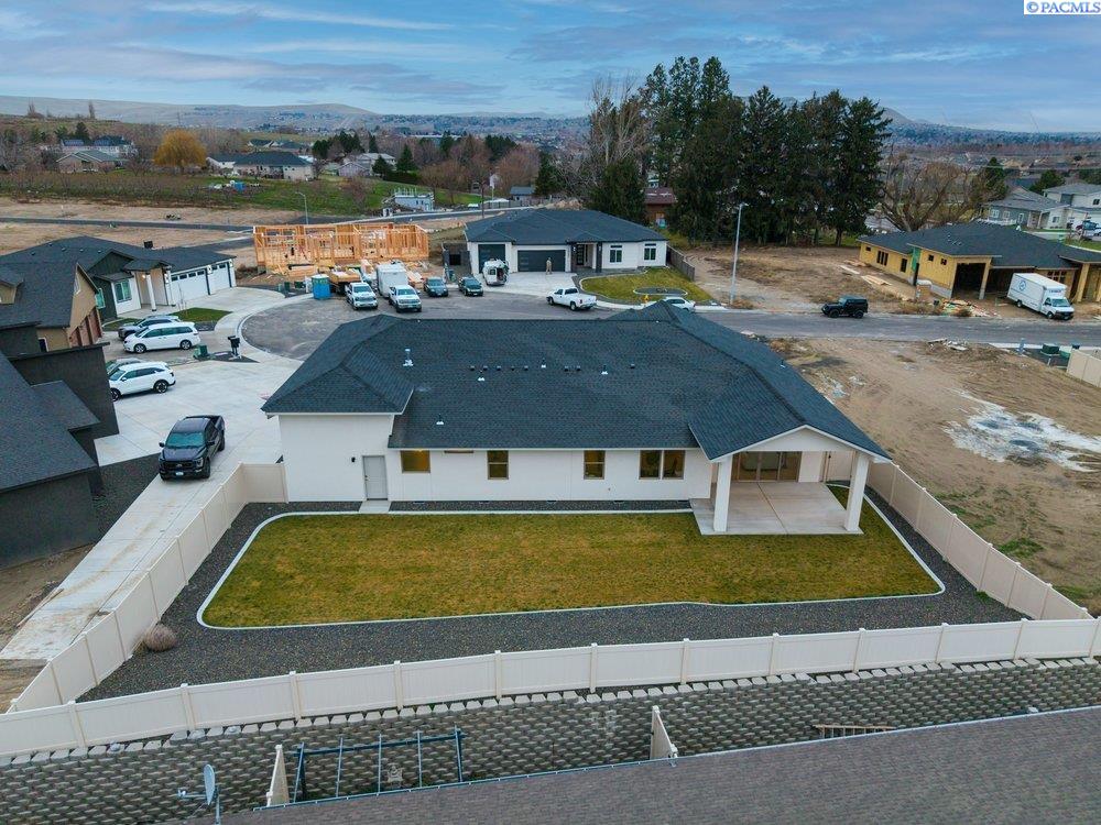 MLS#289745. NO HOA!! Brand-new 2025 construction located in the heart of West Kennewick. This thoughtfully designed 2,421 sq ft home offers 3 bedrooms, a large, dedicated office, and a functional, open floor plan. Features include soaring 11-foot ceilings with box-beam details in the family room, wide-plank flooring, and an extensive triple-pane window package with transom windows that provide an abundance of natural light. The kitchen is equipped with quartz countertops, double ovens, stainless steel appliances, and timeless finishes ideal for everyday living and entertaining. The laundry room is generously sized and includes upper cabinetry for added storage. Spacious bedrooms throughout, including a second primary bedroom/in-law suite with an ensuite bathroom for added privacy. The exterior features a stucco finish, professionally landscaped and a fully fenced backyard, and an expansive covered patio perfect for outdoor enjoyment. 3-car tandem garage with an oversized third bay measuring 49 feet deep, ideal for RV/Boat parking, a workshop, or additional storage. Conveniently located near shopping, dining, schools, and all city amenities. This home sits in a quiet cul-de-sac and the backyard is a private oasis. Garage is 21'6 wide by 29'6 deep on the 2-car side and 14 feet wide by 49 feet deep on the 3rd tandem bay.