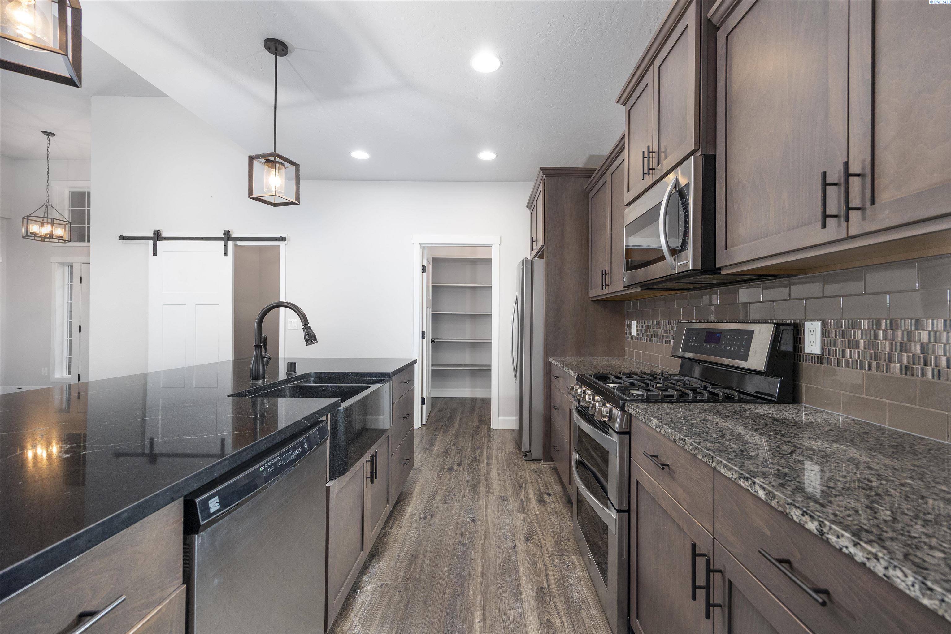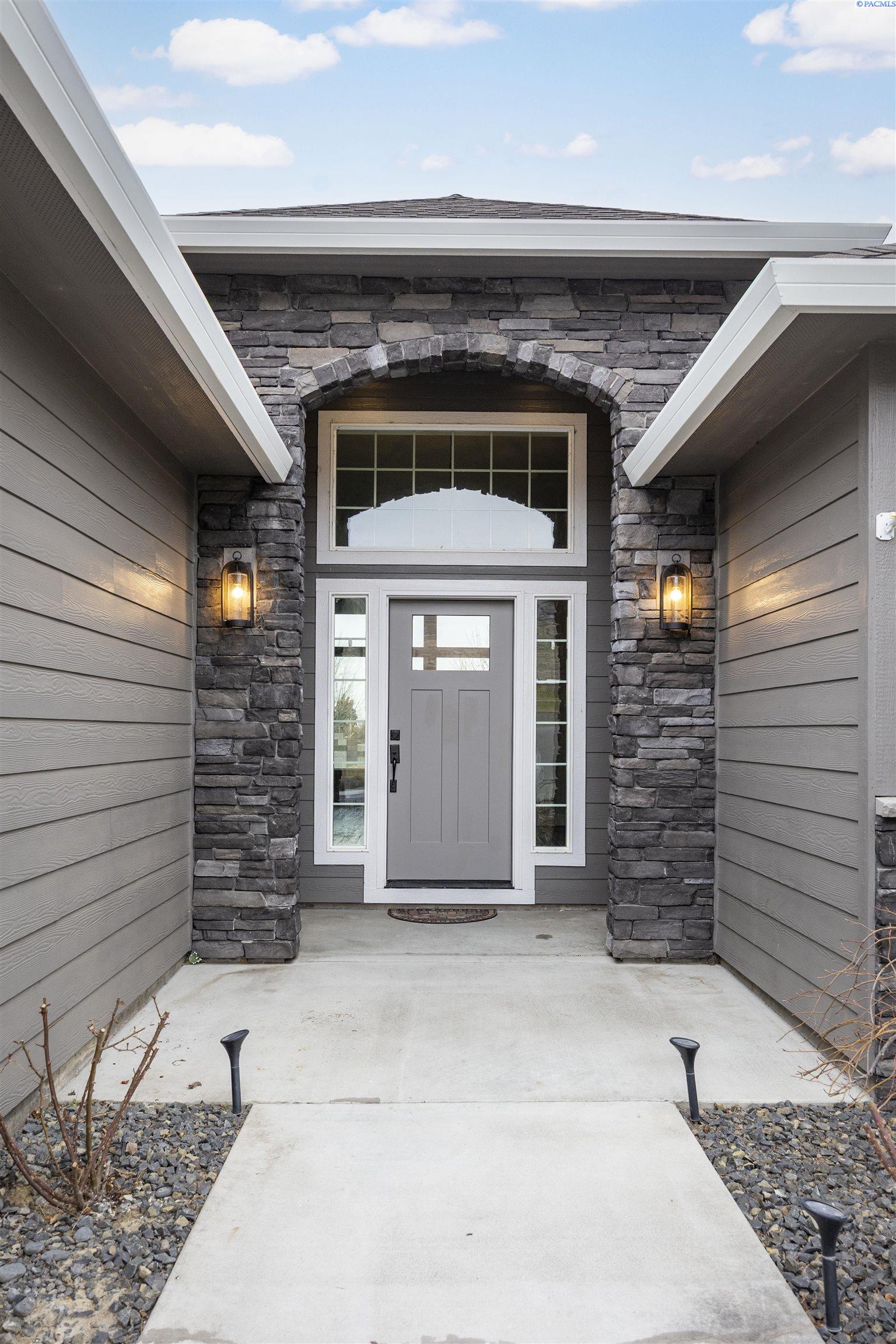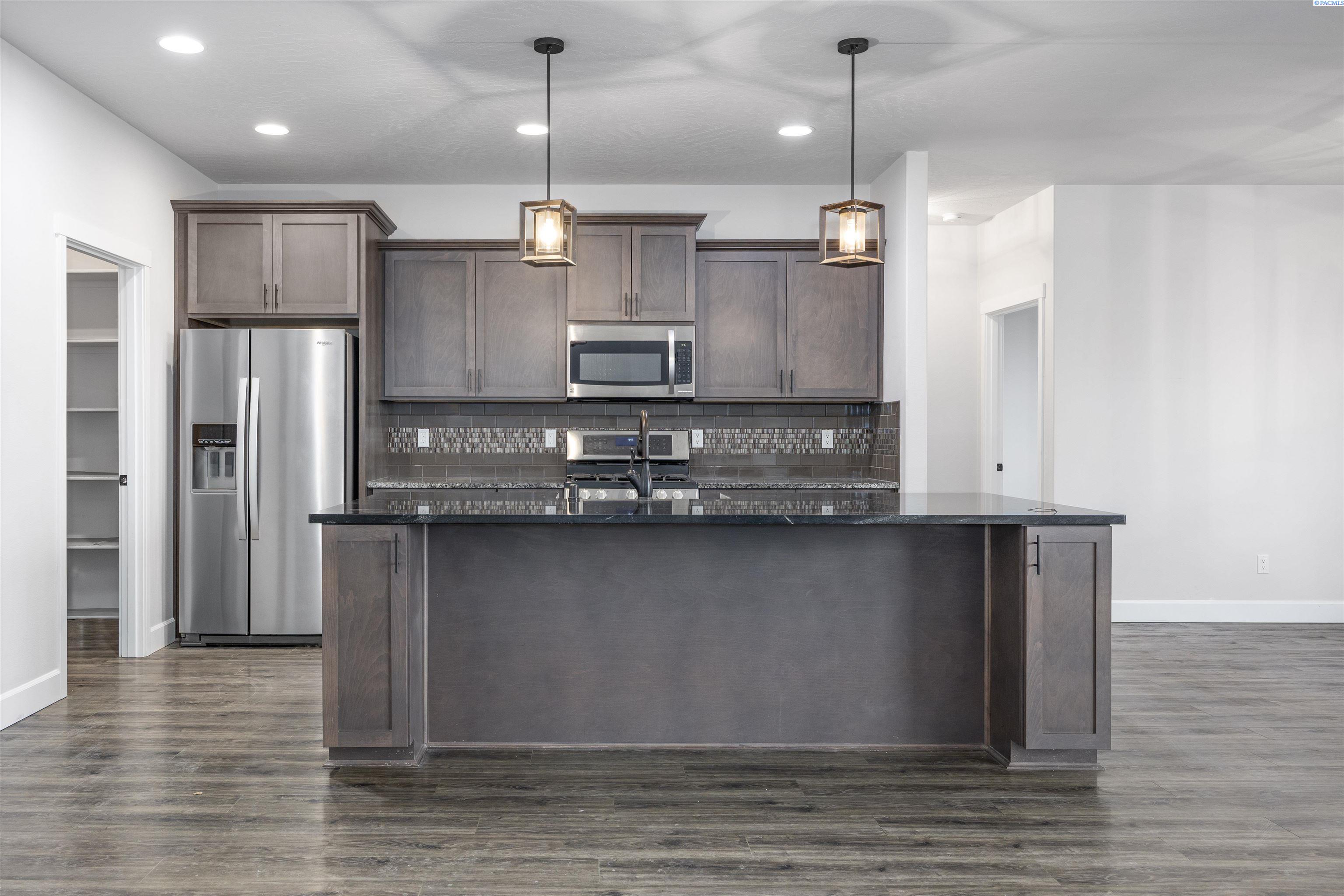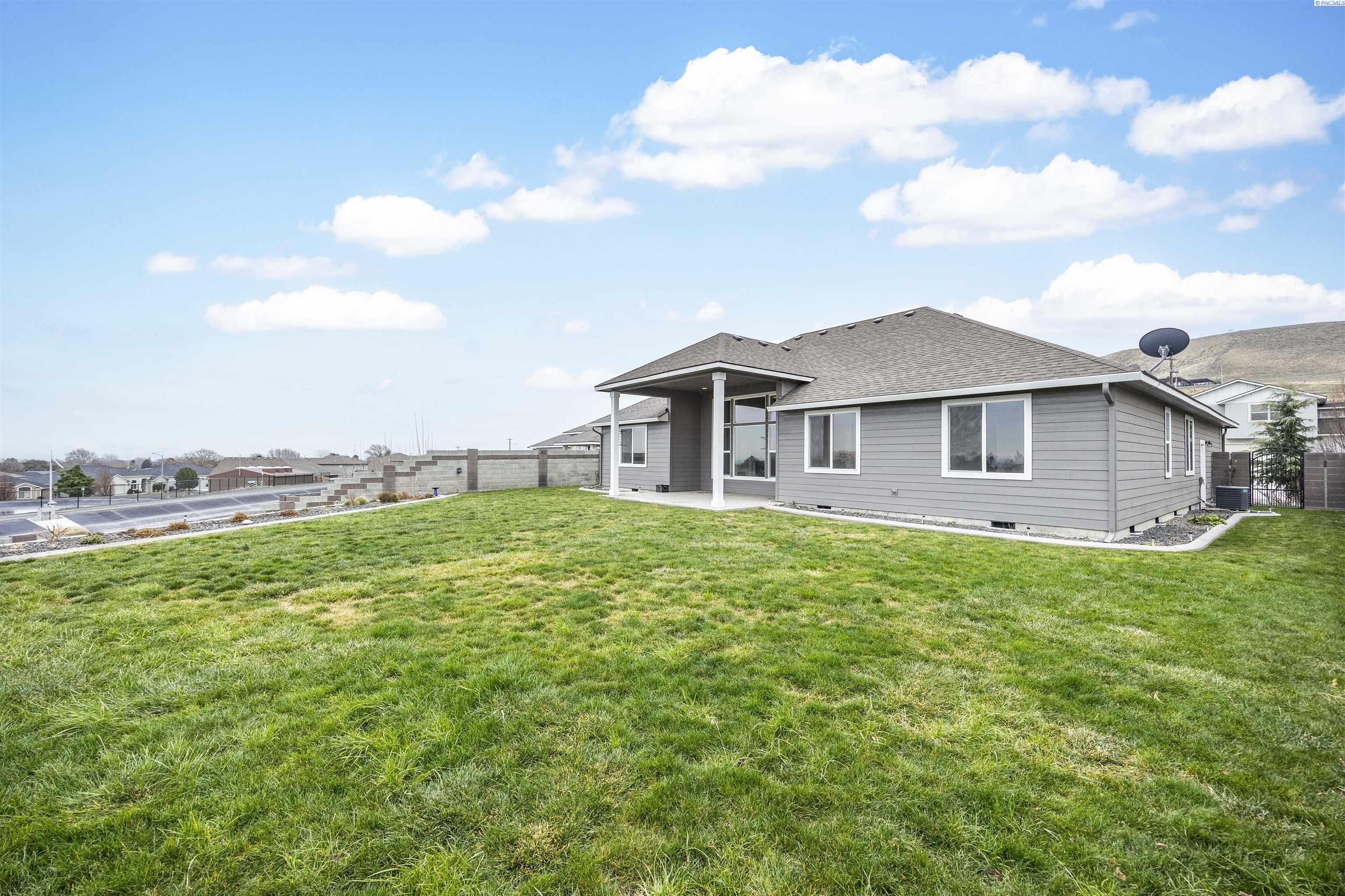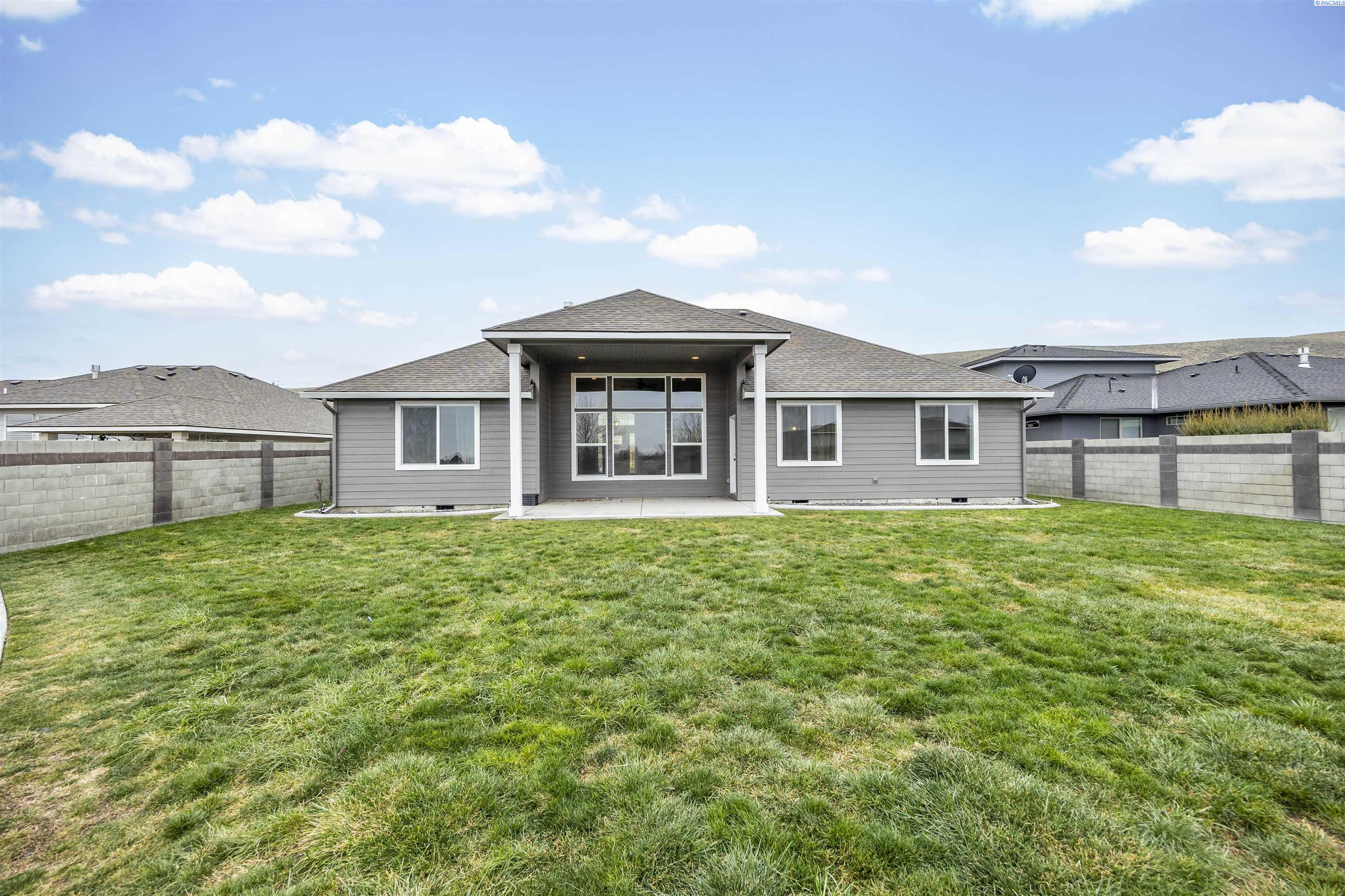 Nestled in Kennewickâs Cherry Creek neighborhood, this beautiful home is move-in ready and waiting for new owners. Offering 2,057 sq. ft. of well-designed living space, the home features 3 bedrooms, 2 bathrooms, a spacious den, and a 3-car garage. Soaring 14â and 10â ceilings throughout create an open, airy feel from the moment you step inside. The inviting great room is filled with natural light from large windows and anchored by a elegant gas fireplace. The chefâs kitchen is a standout, featuring a large island, granite countertops, tiled backsplash, beautiful wood cabinetry with soft-close drawers, a slide-out garbage cabinet, large pantry, and all appliances includedâeven double ovens and a refrigerator with an extended warranty through 2027. Adjacent to the kitchen is a dining area with access to the patio, perfect for indoor and outdoor dining and entertaining. The primary suite offers a tray ceiling, a generous closet, and a private ensuite bath with an oversized walk-in shower, and a dual sink vanity. Ceiling fans in the bedrooms and living room add comfort and efficiency throughout the home. Step outside to enjoy a spacious covered patio, terraced and professionally landscaped yard, full fencing, and a gate with direct access to the walking trail and scenic views. CCR approval is available if youâd like to add a pool. Located in a fantastic neighborhood with nearby parks, schools, golf course, medical facilities, and more, this home truly has it all. For added peace of mind, it comes complete with a comprehensive home inspection and a 1-year home warranty.