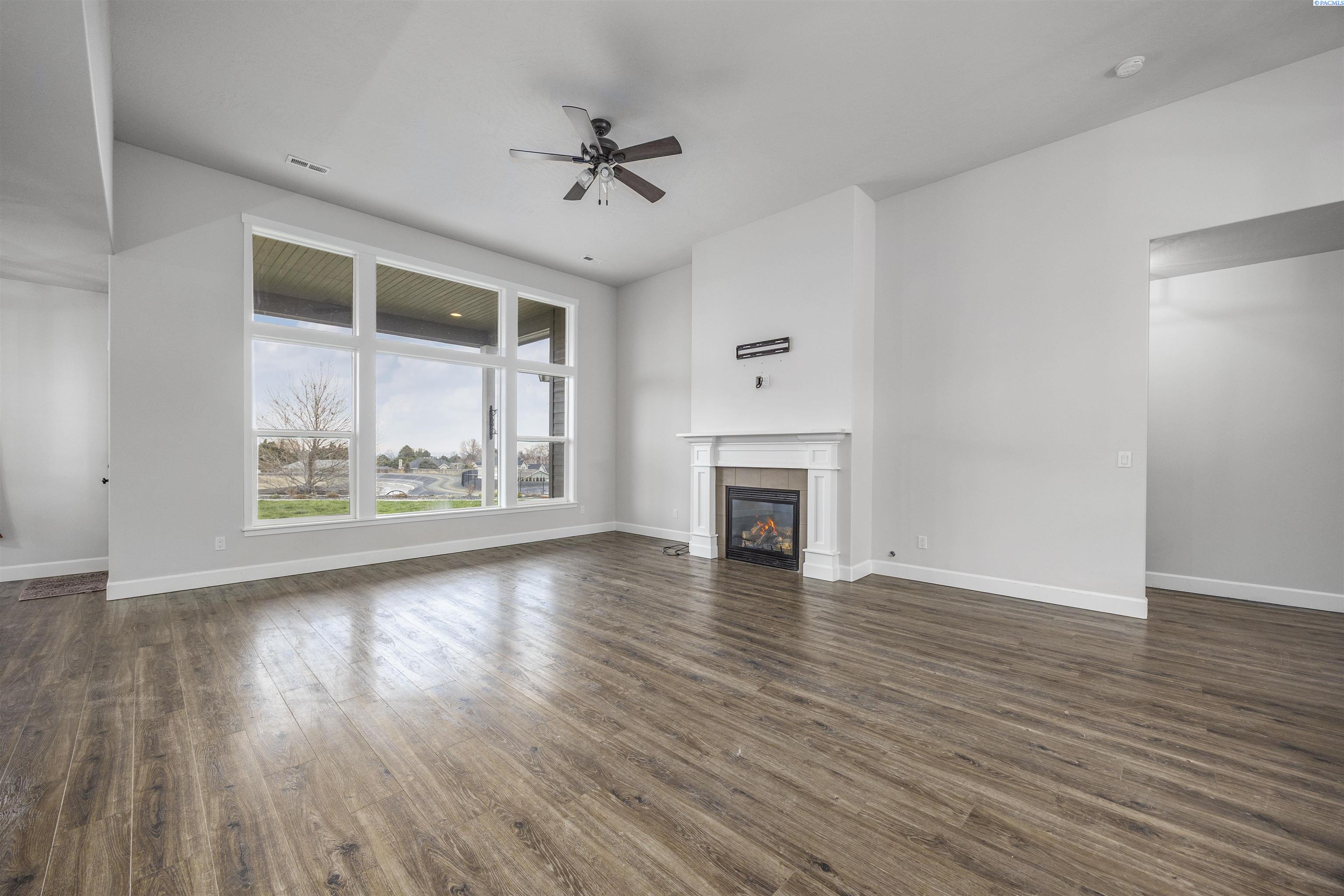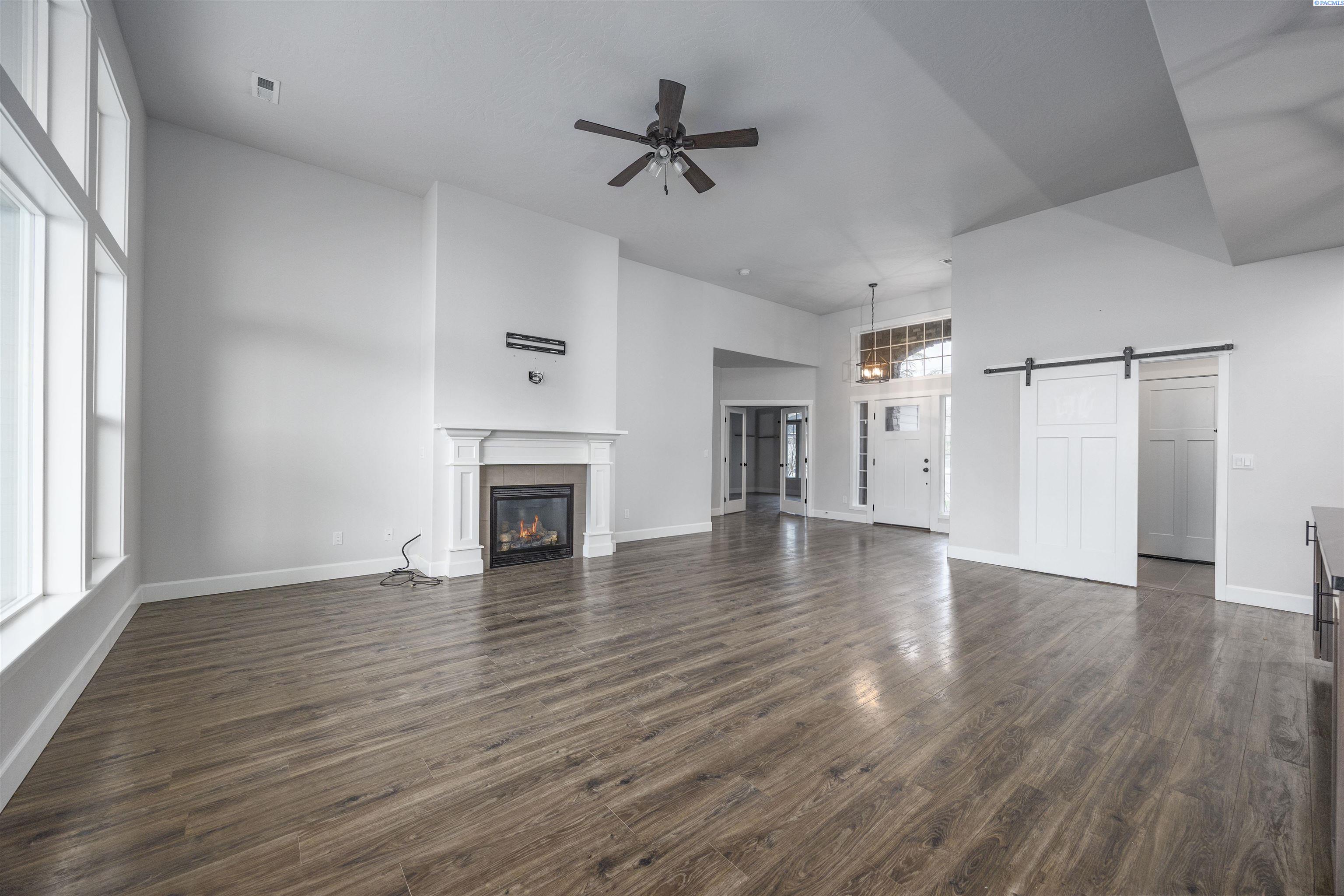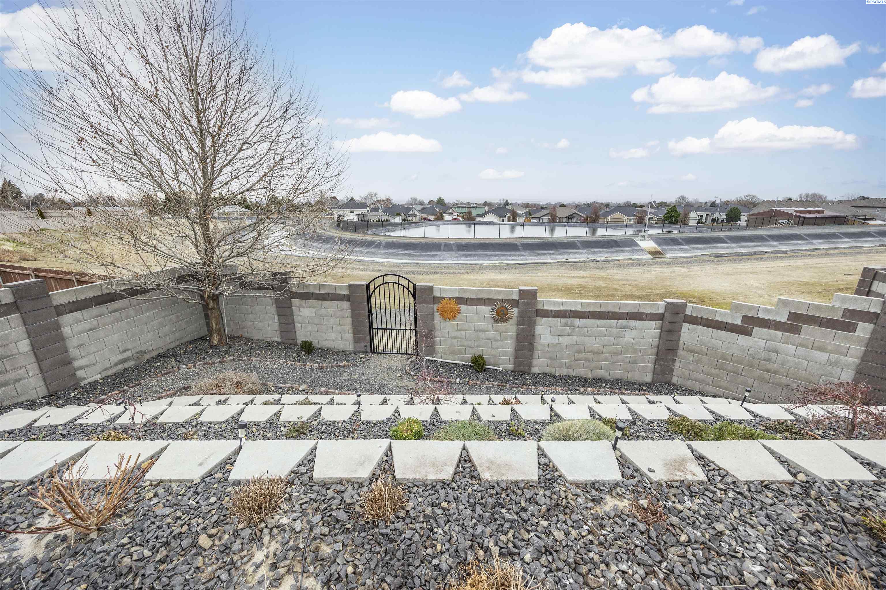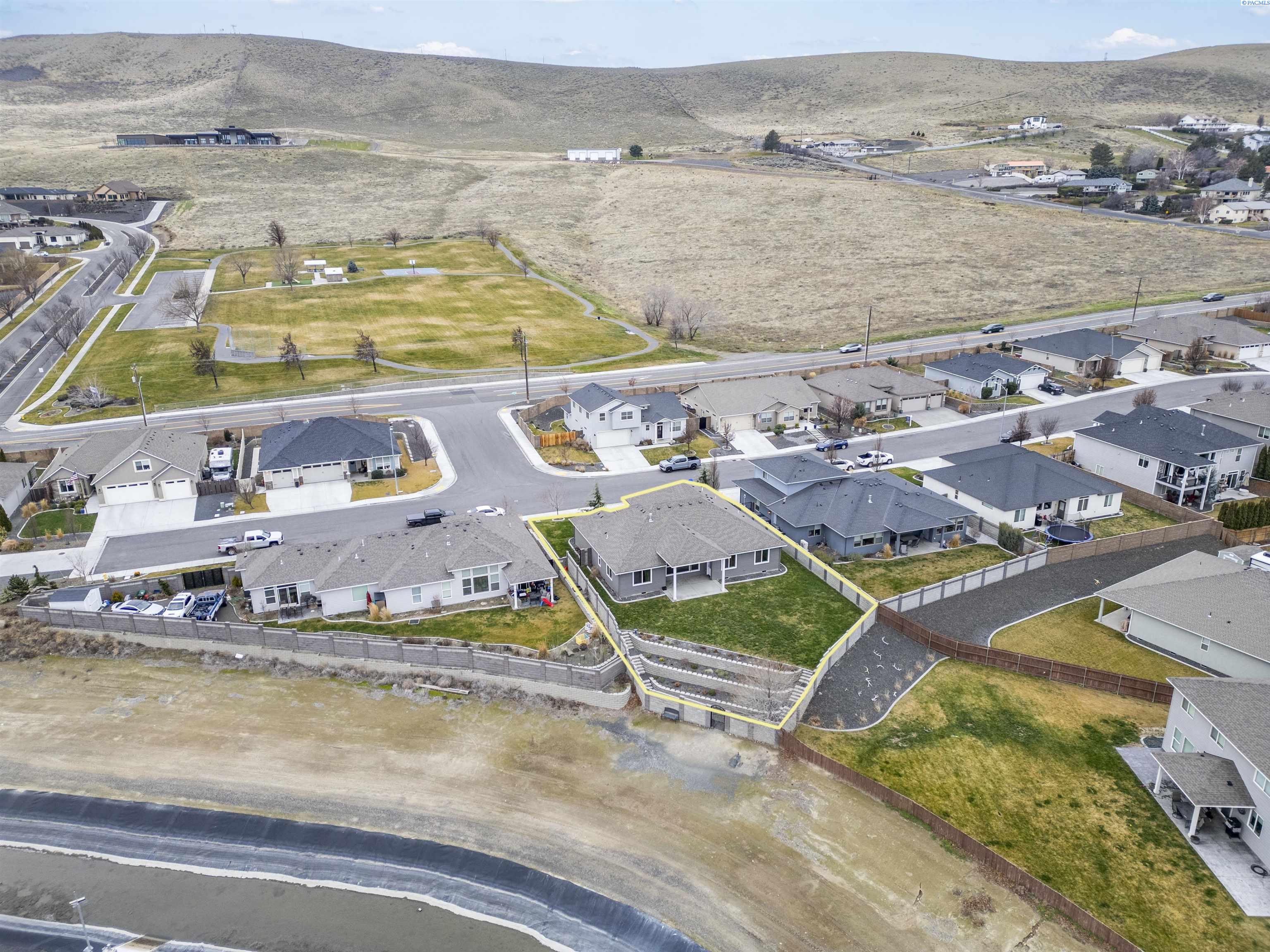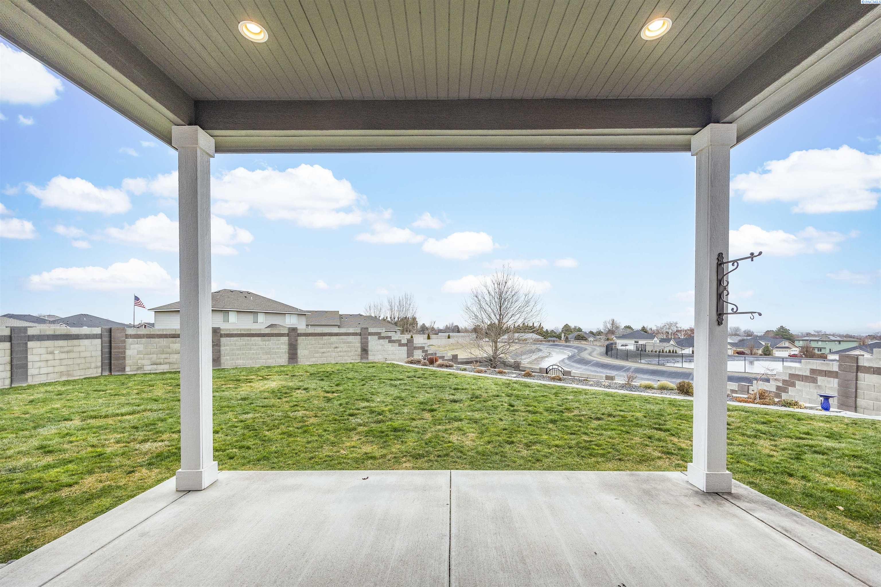 Nestled in Kennewickâs Cherry Creek neighborhood, this beautiful home is move-in ready and waiting for new owners. Offering 2,057 sq. ft. of well-designed living space, the home features 3 bedrooms, 2 bathrooms, a spacious den, and a 3-car garage. Soaring 14â and 10â ceilings throughout create an open, airy feel from the moment you step inside. The inviting great room is filled with natural light from large windows and anchored by a elegant gas fireplace. The chefâs kitchen is a standout, featuring a large island, granite countertops, tiled backsplash, beautiful wood cabinetry with soft-close drawers, a slide-out garbage cabinet, large pantry, and all appliances includedâeven double ovens and a refrigerator with an extended warranty through 2027. Adjacent to the kitchen is a dining area with access to the patio, perfect for indoor and outdoor dining and entertaining. The primary suite offers a tray ceiling, a generous closet, and a private ensuite bath with an oversized walk-in shower, and a dual sink vanity. Ceiling fans in the bedrooms and living room add comfort and efficiency throughout the home. Step outside to enjoy a spacious covered patio, terraced and professionally landscaped yard, full fencing, and a gate with direct access to the walking trail and scenic views. CCR approval is available if youâd like to add a pool. Located in a fantastic neighborhood with nearby parks, schools, golf course, medical facilities, and more, this home truly has it all. For added peace of mind, it comes complete with a comprehensive home inspection and a 1-year home warranty.
