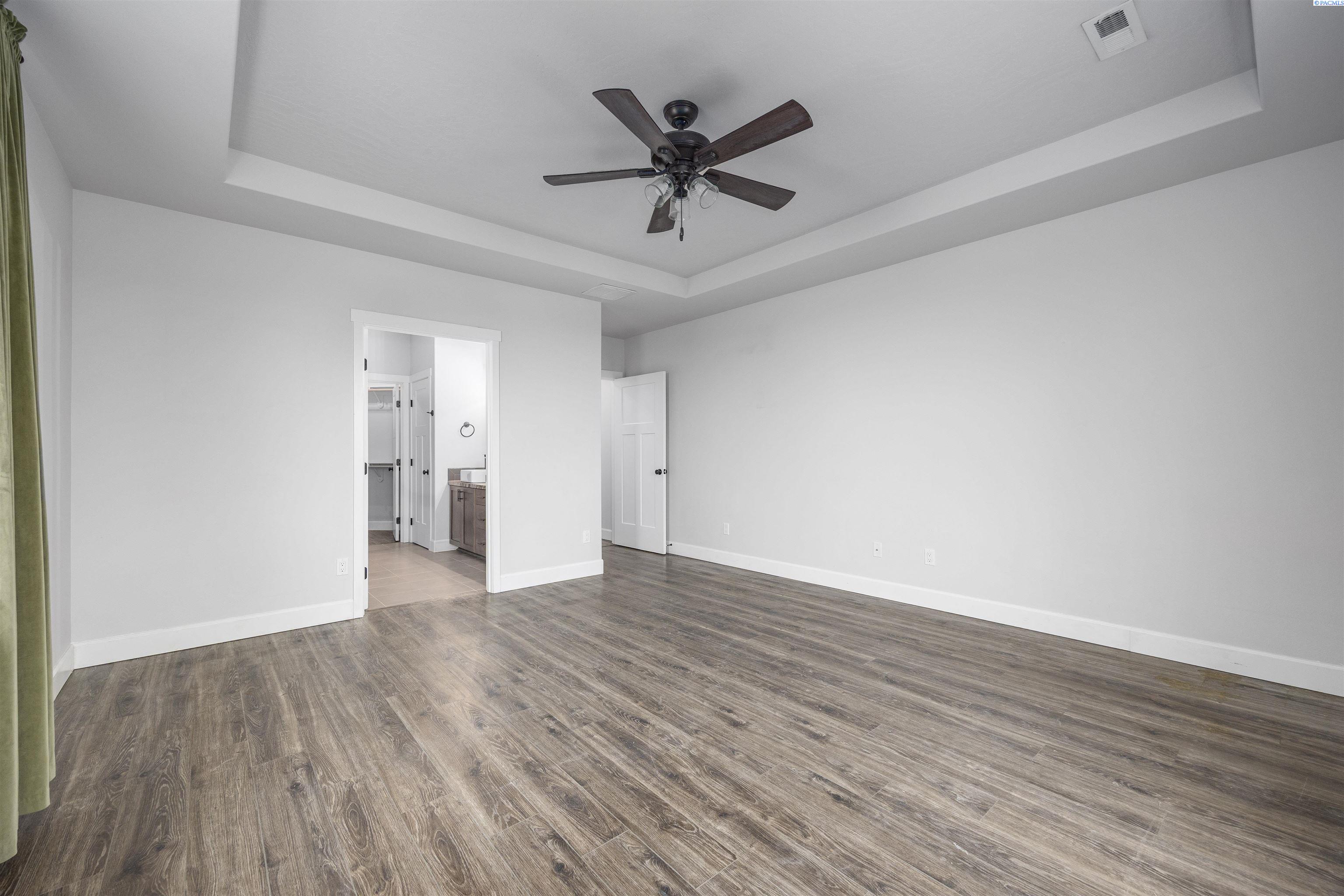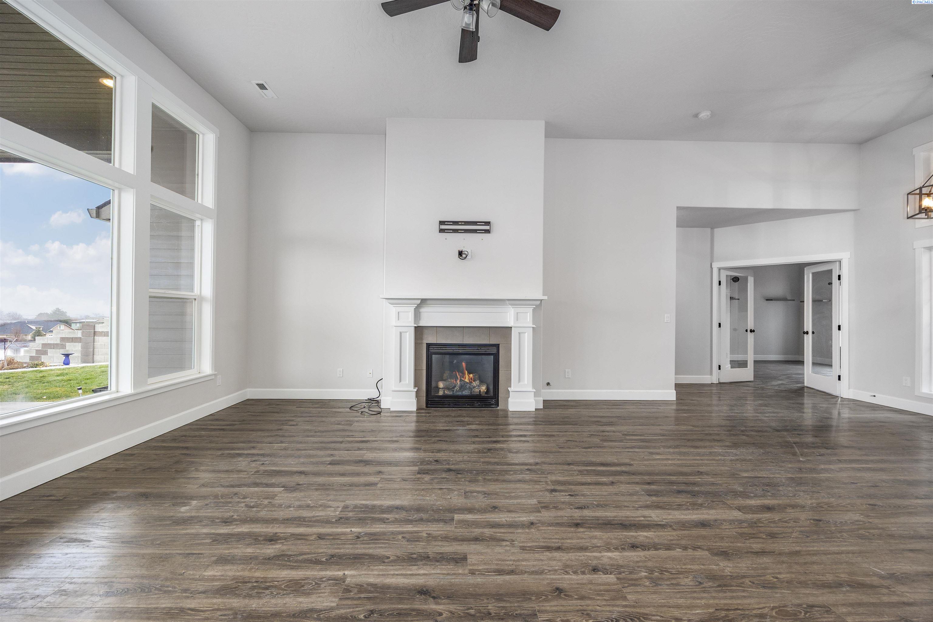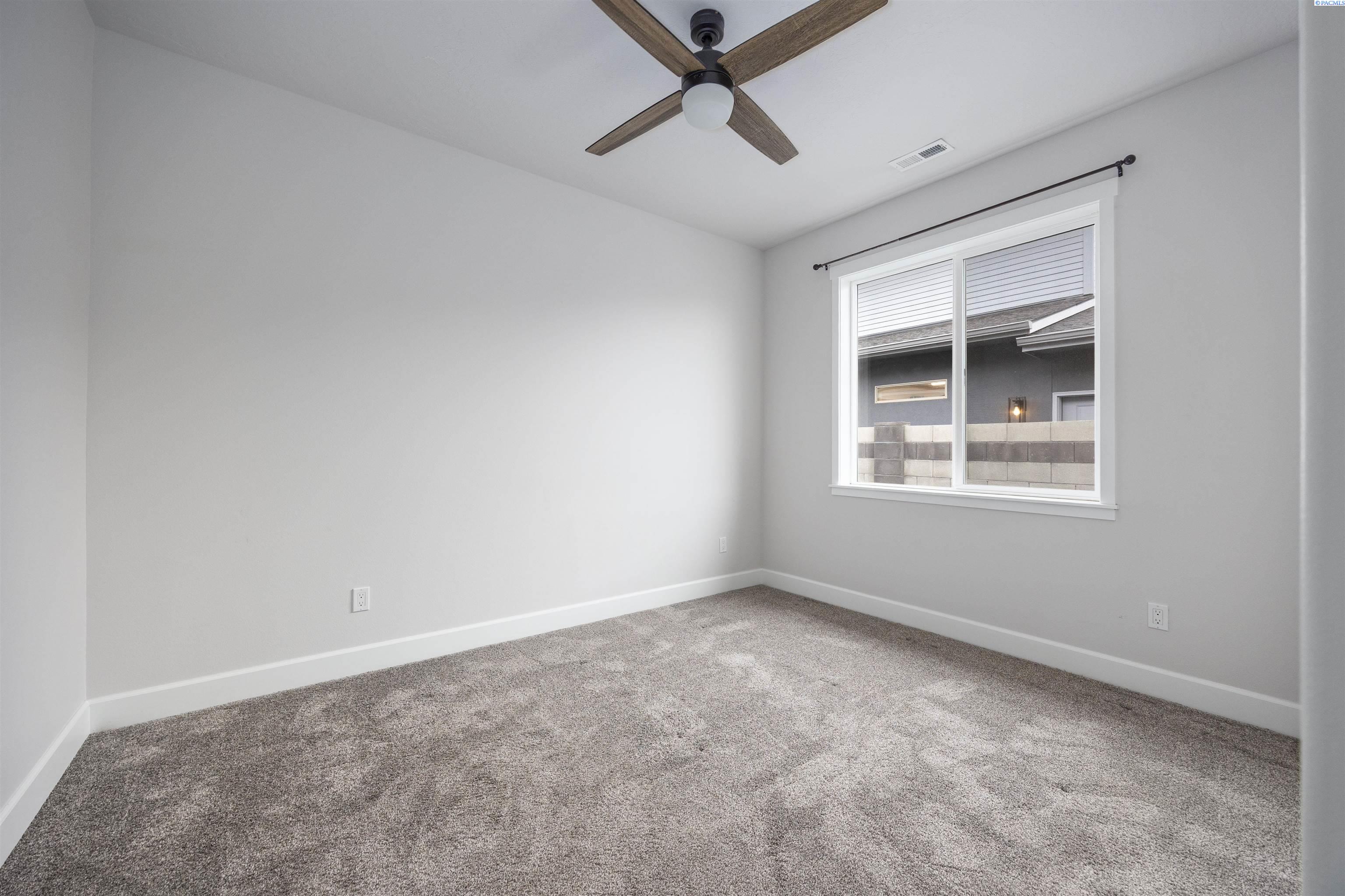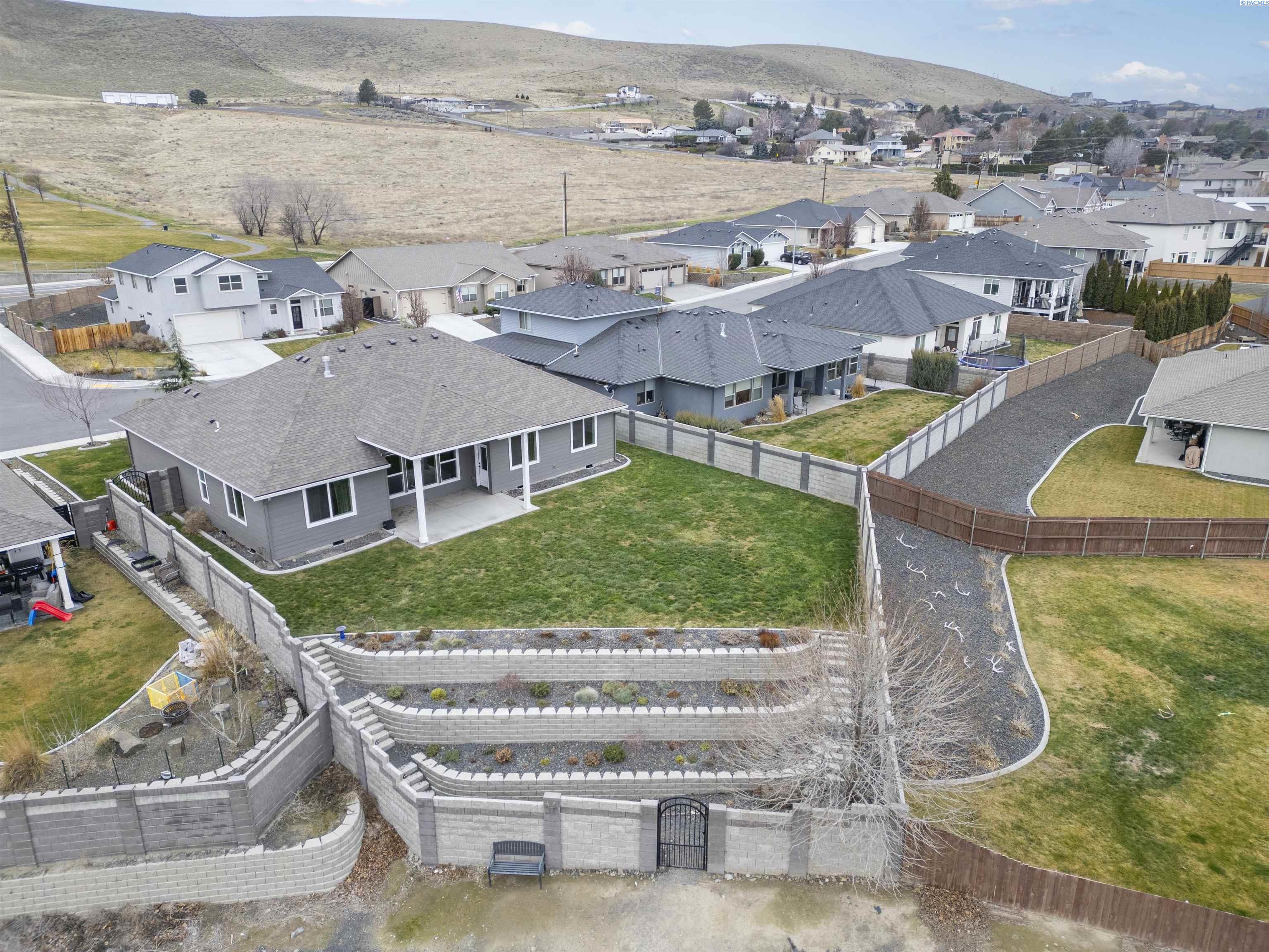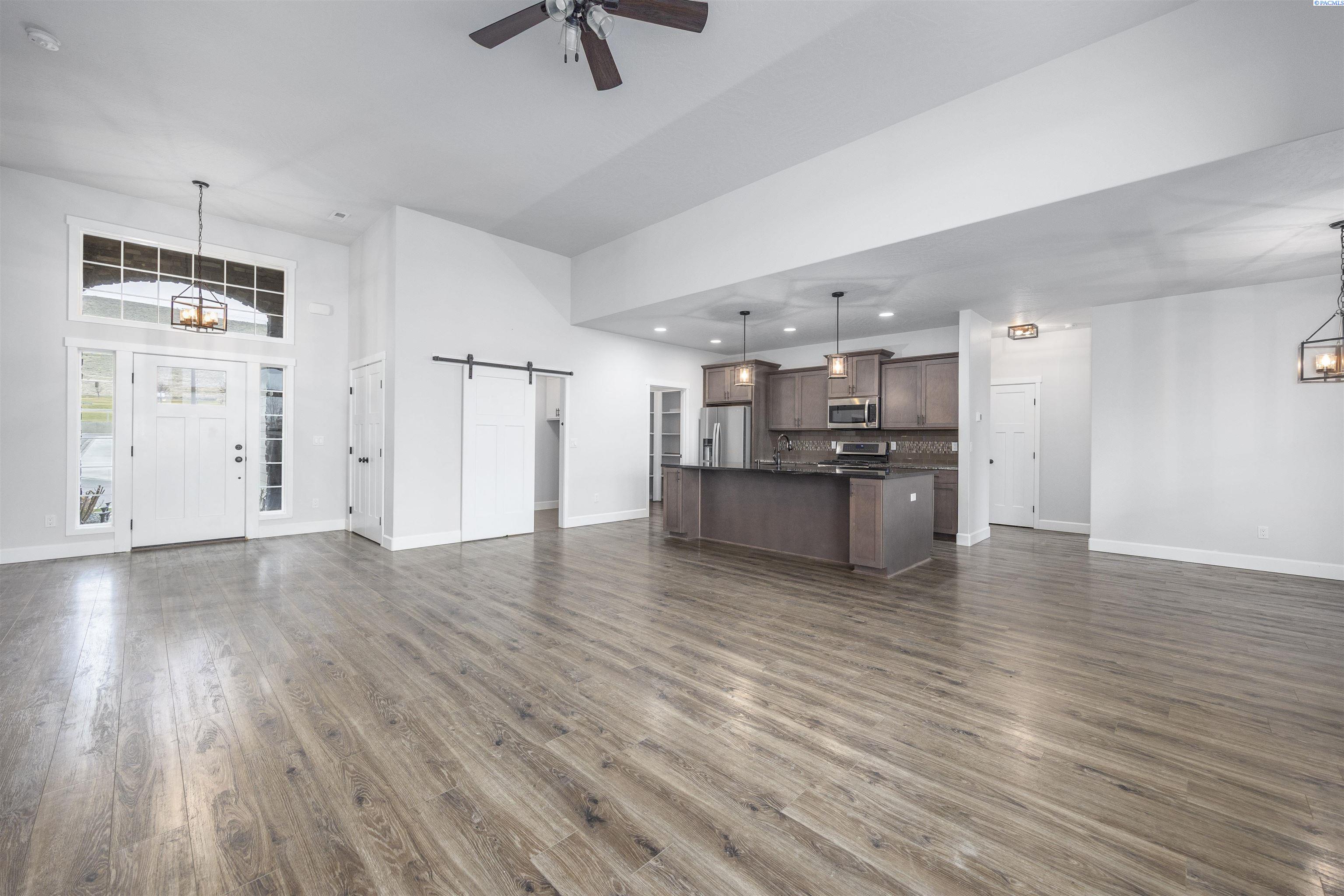 Nestled in Kennewickâs Cherry Creek neighborhood, this beautiful home is move-in ready and waiting for new owners. Offering 2,057 sq. ft. of well-designed living space, the home features 3 bedrooms, 2 bathrooms, a spacious den, and a 3-car garage. Soaring 14â and 10â ceilings throughout create an open, airy feel from the moment you step inside. The inviting great room is filled with natural light from large windows and anchored by a elegant gas fireplace. The chefâs kitchen is a standout, featuring a large island, granite countertops, tiled backsplash, beautiful wood cabinetry with soft-close drawers, a slide-out garbage cabinet, large pantry, and all appliances includedâeven double ovens and a refrigerator with an extended warranty through 2027. Adjacent to the kitchen is a dining area with access to the patio, perfect for indoor and outdoor dining and entertaining. The primary suite offers a tray ceiling, a generous closet, and a private ensuite bath with an oversized walk-in shower, and a dual sink vanity. Ceiling fans in the bedrooms and living room add comfort and efficiency throughout the home. Step outside to enjoy a spacious covered patio, terraced and professionally landscaped yard, full fencing, and a gate with direct access to the walking trail and scenic views. CCR approval is available if youâd like to add a pool. Located in a fantastic neighborhood with nearby parks, schools, golf course, medical facilities, and more, this home truly has it all. For added peace of mind, it comes complete with a comprehensive home inspection and a 1-year home warranty.