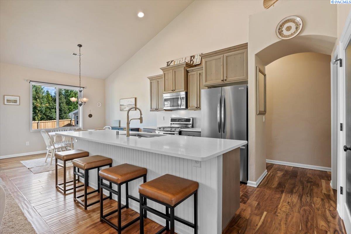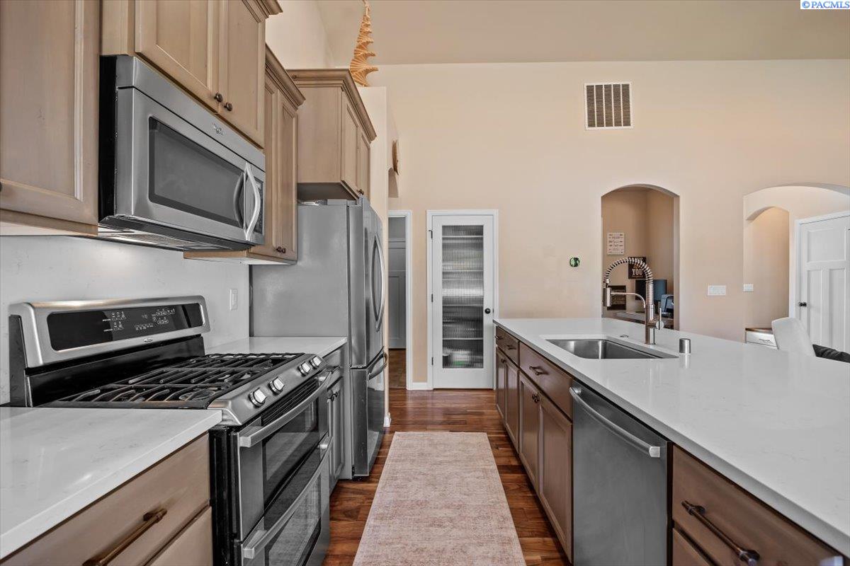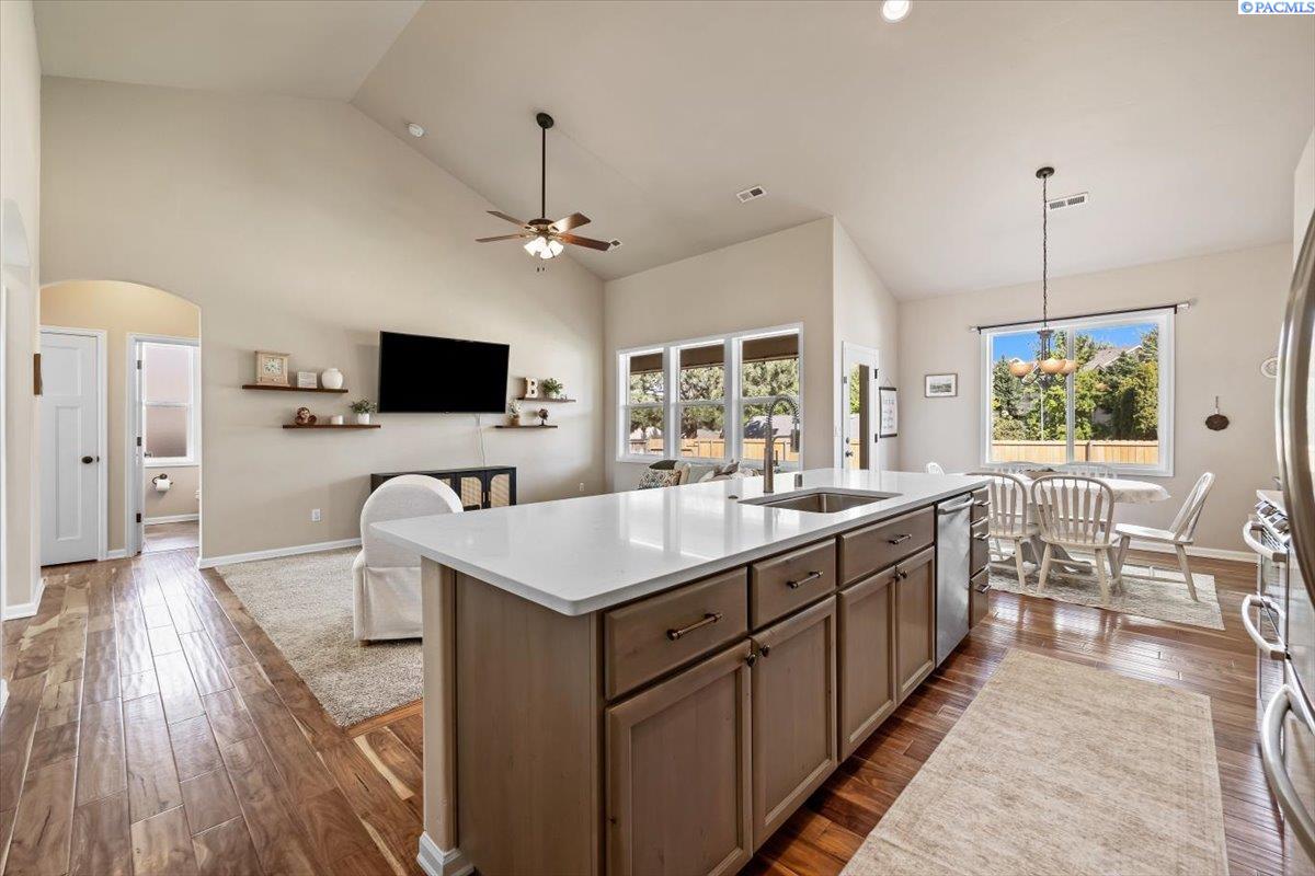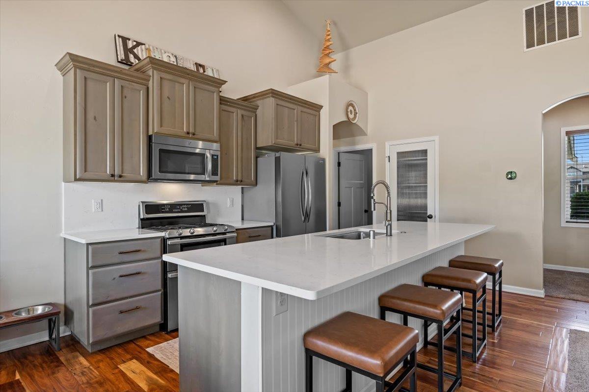 MLS# 290103 *Seller is offering up to $9,600 toward buyer concessions!* Situated in Kennewickâs esteemed Fountain Hills community, this 3-bedroom, 2-bath Bella home blends refined finishes with exceptional livability in one of the cityâs most convenient locations. Built in 2013, the home showcases hardwood flooring, vaulted ceilings, wood-wrapped windows, and newly upgraded quartz countertops that add a clean, modern elegance to the kitchen. Thoughtful functionality begins at the entry with a tall drop-zone and workspace niche. Upstairs, a generous bonus room crowns the residenceâideal for a private guest retreat, sophisticated home office, or media lounge. A standout feature is the oversized, fully insulated 25Ã28 garage, offering impressive flexibility with a dedicated room for a gym, hobby space, or secure storage. Outdoors, the fully fenced yard includes a newer storage shed and room to unwind. Perfectly positioned near Costco, premier shopping, dining, and daily amenities, this residence offers a rare combination of elevated finishes, versatile spaces, and coveted placement within one of Kennewickâs most desirable neighborhoods.