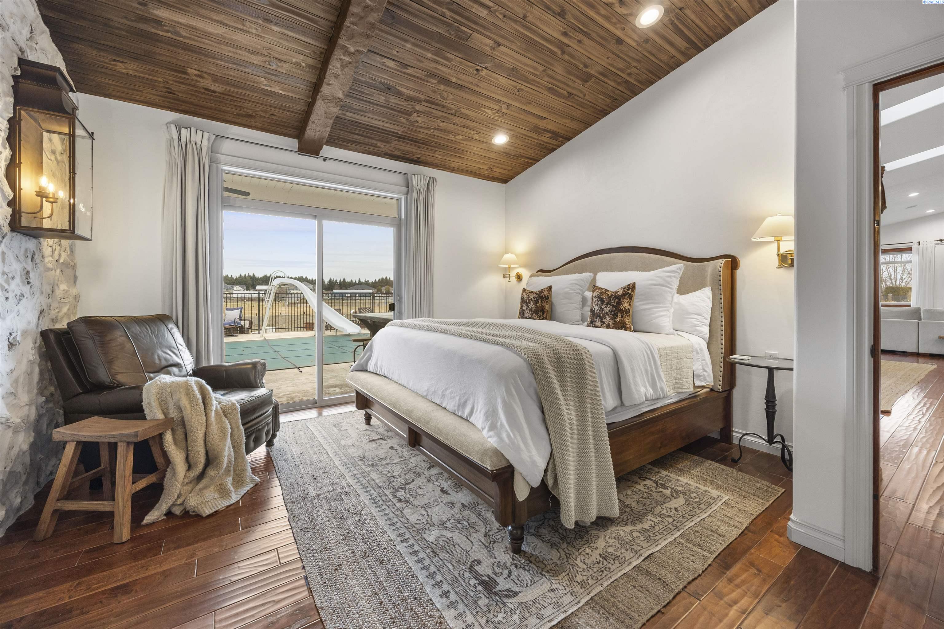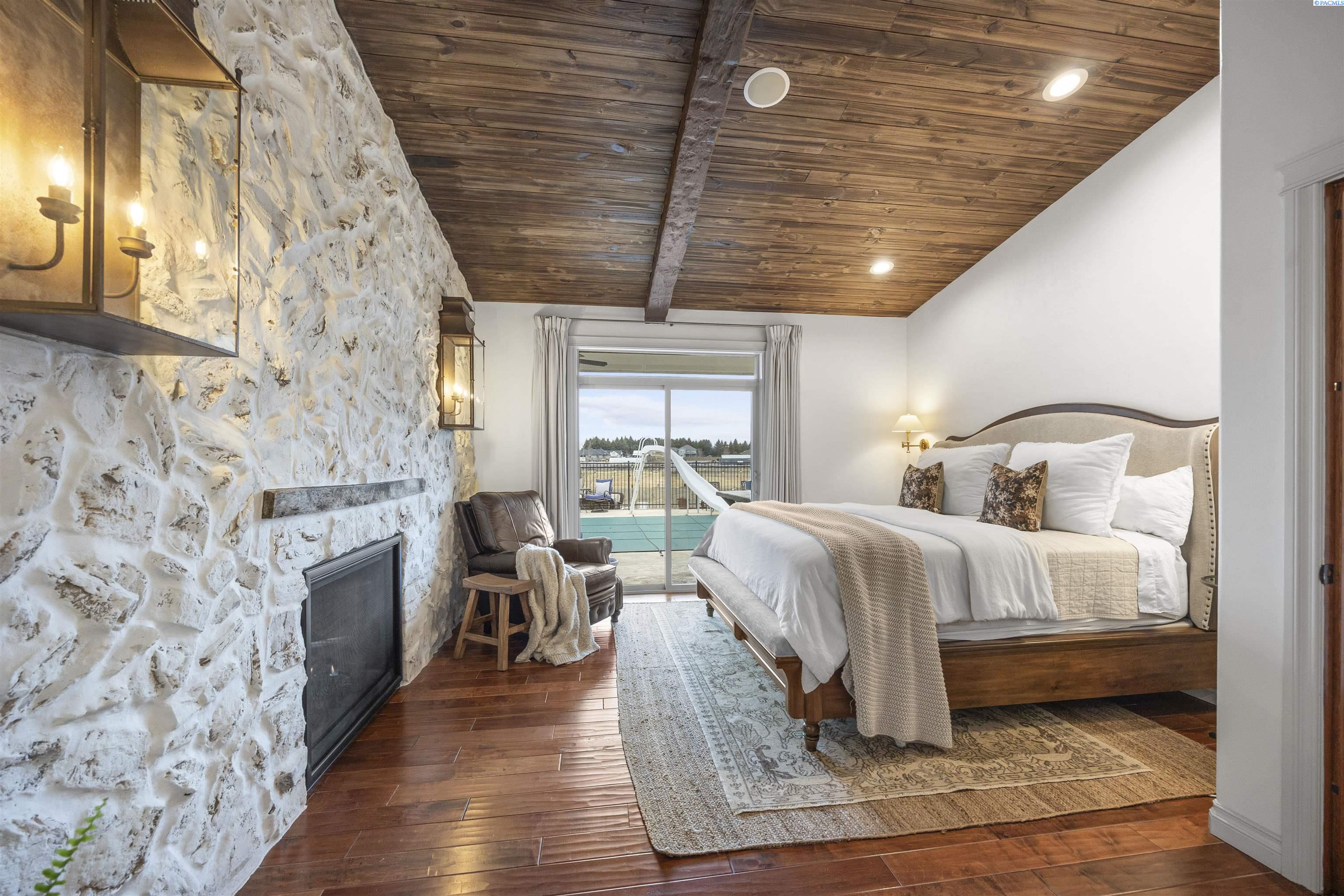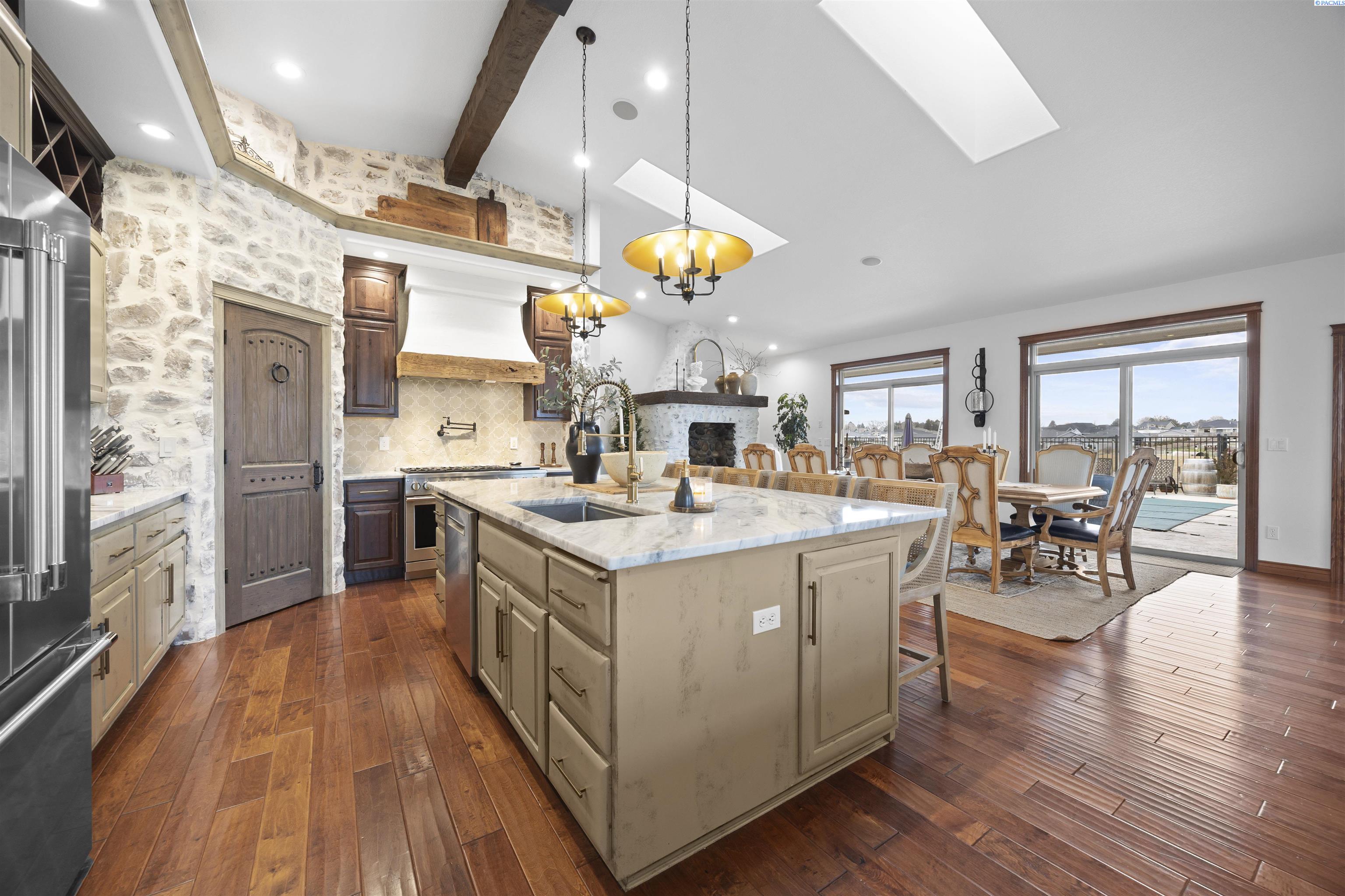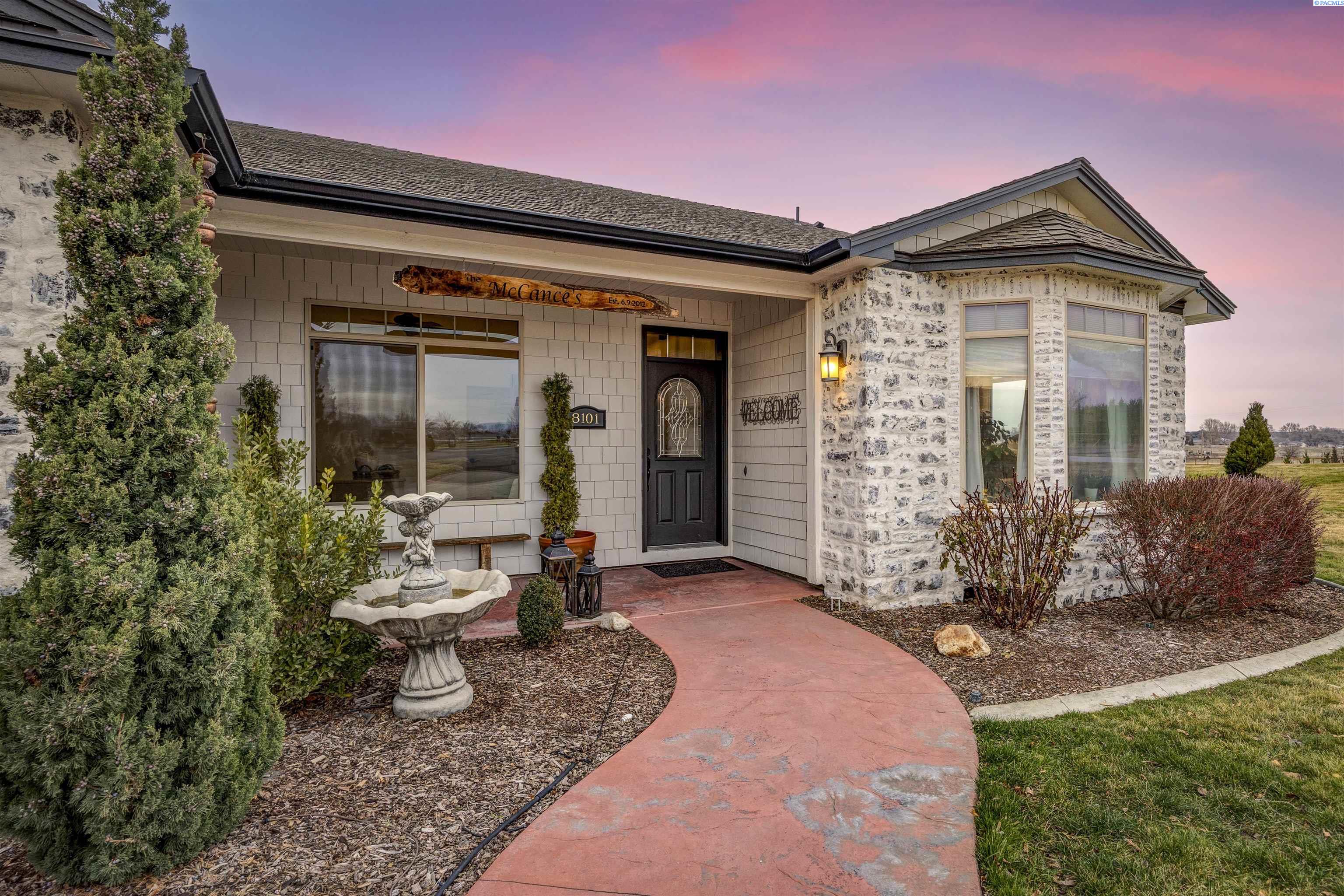 MLS# 290135 Nestled on a 1.24-acre lot at the end of a quiet cul-de-sac in Pasco, this stunning single-level home has been beautifully renovated with top-of-the-line finishes and exceptional attention to detail. The exterior showcases elegant cobblestone brick accents, a circular driveway, and pristine landscaping that create impressive curb appeal. Offering 2,992 sq. ft. of thoughtfully designed living space, the home features 4 bedrooms +office and 3.5 bathrooms. Inside, youâll find a beautiful blend of limestone tile and hardwood flooring, soaring ceilings, wood beams and expansive windows that flood the open great room with natural light. The adjacent dining area is equally striking, highlighted by a custom fireplace and serene backyard views. The chefâs kitchen is truly a showpiece, equipped with premium Bosch appliances, granite countertops, a large island, custom cabinetry, and a pantry with designer door. Retreat to the luxurious primary suite, where a vaulted wood-beamed ceiling, slider access to the pool & patio, and a dramatic stone fireplace create a private sanctuary. The spa-like ensuite bath features Sante Fe texture, a dual-sink vanity, an oversized zero-entry shower with waterproof Venetian plaster, and incredible custom his-and-hers closets. The home also includes a dedicated sauna room with a new heater and shower for ultimate relaxation. The 3.5 baths are finished with granite countertops, and 3 additional bedrooms are filled with natural light, while the office/den features French doors and a vaulted ceiling. The laundry room provides ample cabinetry, a utility sink, and includes the washer &Â dryer. Car enthusiasts and hobbyists will appreciate the massive 6+ car garage with an RV door and abundant storage. Step outside to your own private oasis, highlighted by an in-ground heated pool with new liner &Â pump, expansive pool decking, an outdoor kitchen, full fencing, and a large terraced patioâperfect for hosting unforgettable gatherings. The property also features a newly planted vineyard with raised garden beds, adding both charm and function. For added fun, the backyard even includes a dirt bike track for hours of enjoyment. Located in a sought-after West Pasco neighborhood of beautiful homes, this peaceful setting is just minutes from the river, Chiawana Park, schools, and excellent amenities. This exceptional property is a true showstopper, offering countless custom features both indoors and out!
