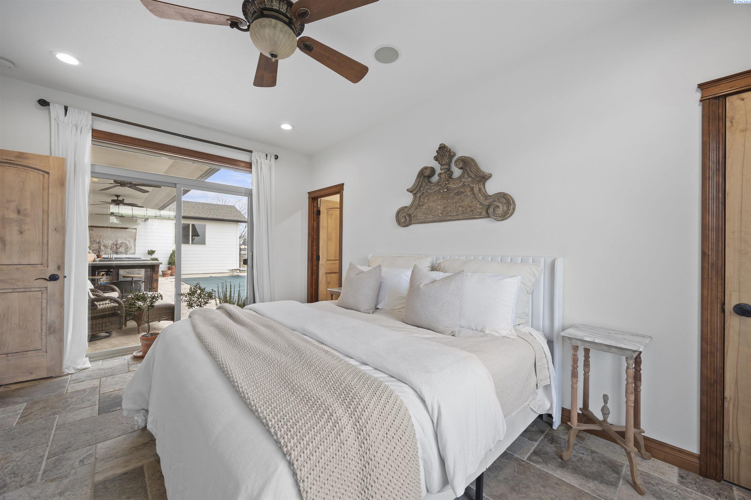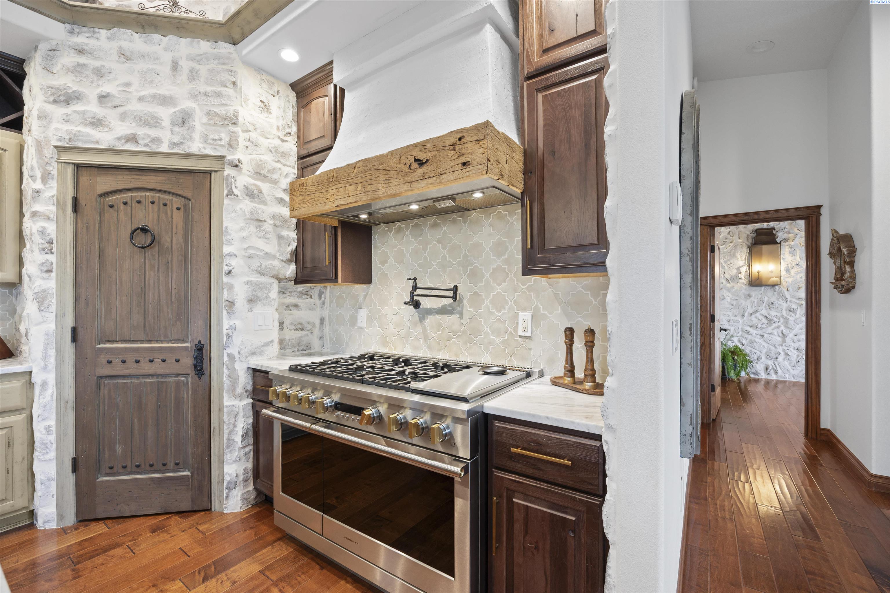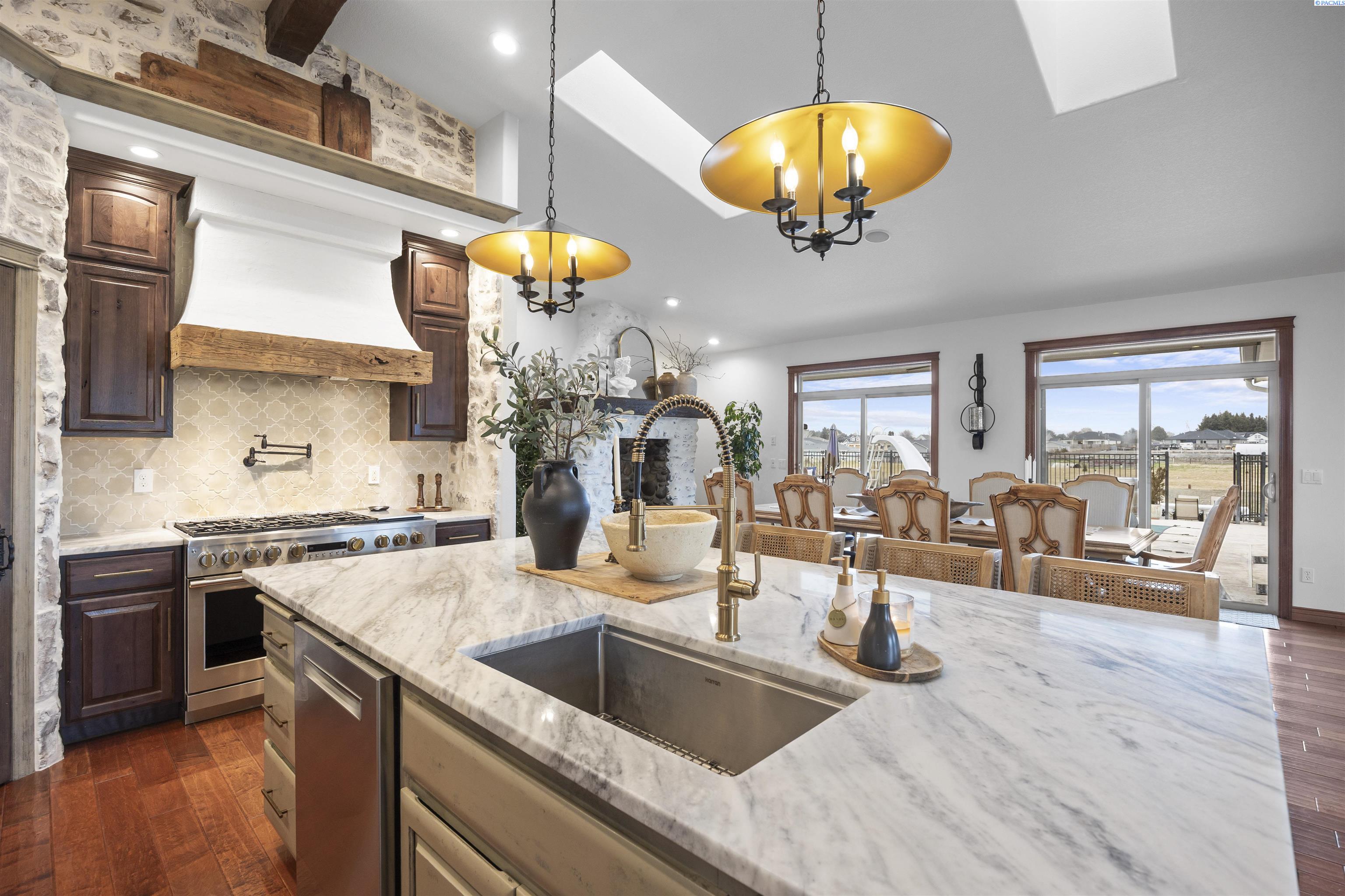 MLS# 290135 Nestled on a 1.24-acre lot at the end of a quiet cul-de-sac in Pasco, this stunning single-level home has been beautifully renovated with top-of-the-line finishes and exceptional attention to detail. The exterior showcases elegant cobblestone brick accents, a circular driveway, and pristine landscaping that create impressive curb appeal. Offering 2,992 sq. ft. of thoughtfully designed living space, the home features 4 bedrooms +office and 3.5 bathrooms. Inside, youâll find a beautiful blend of limestone tile and hardwood flooring, soaring ceilings, wood beams and expansive windows that flood the open great room with natural light. The adjacent dining area is equally striking, highlighted by a custom fireplace and serene backyard views. The chefâs kitchen is truly a showpiece, equipped with premium Bosch appliances, granite countertops, a large island, custom cabinetry, and a pantry with designer door. Retreat to the luxurious primary suite, where a vaulted wood-beamed ceiling, slider access to the pool & patio, and a dramatic stone fireplace create a private sanctuary. The spa-like ensuite bath features Sante Fe texture, a dual-sink vanity, an oversized zero-entry shower with waterproof Venetian plaster, and incredible custom his-and-hers closets. The home also includes a dedicated sauna room with a new heater and shower for ultimate relaxation. The 3.5 baths are finished with granite countertops, and 3 additional bedrooms are filled with natural light, while the office/den features French doors and a vaulted ceiling. The laundry room provides ample cabinetry, a utility sink, and includes the washer &Â dryer. Car enthusiasts and hobbyists will appreciate the massive 6+ car garage with an RV door and abundant storage. Step outside to your own private oasis, highlighted by an in-ground heated pool with new liner &Â pump, expansive pool decking, an outdoor kitchen, full fencing, and a large terraced patioâperfect for hosting unforgettable gatherings. The property also features a newly planted vineyard with raised garden beds, adding both charm and function. For added fun, the backyard even includes a dirt bike track for hours of enjoyment. Located in a sought-after West Pasco neighborhood of beautiful homes, this peaceful setting is just minutes from the river, Chiawana Park, schools, and excellent amenities. This exceptional property is a true showstopper, offering countless custom features both indoors and out!