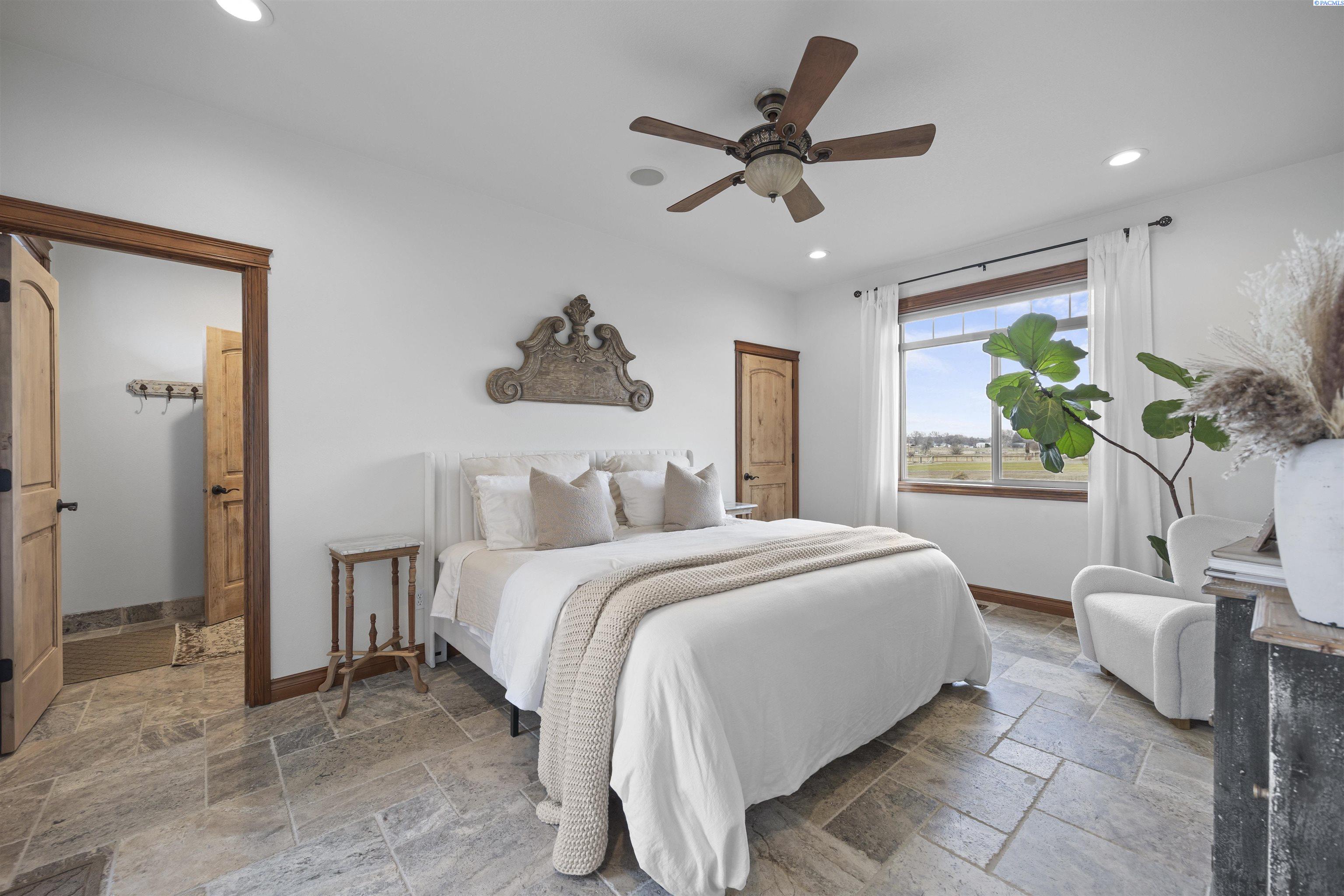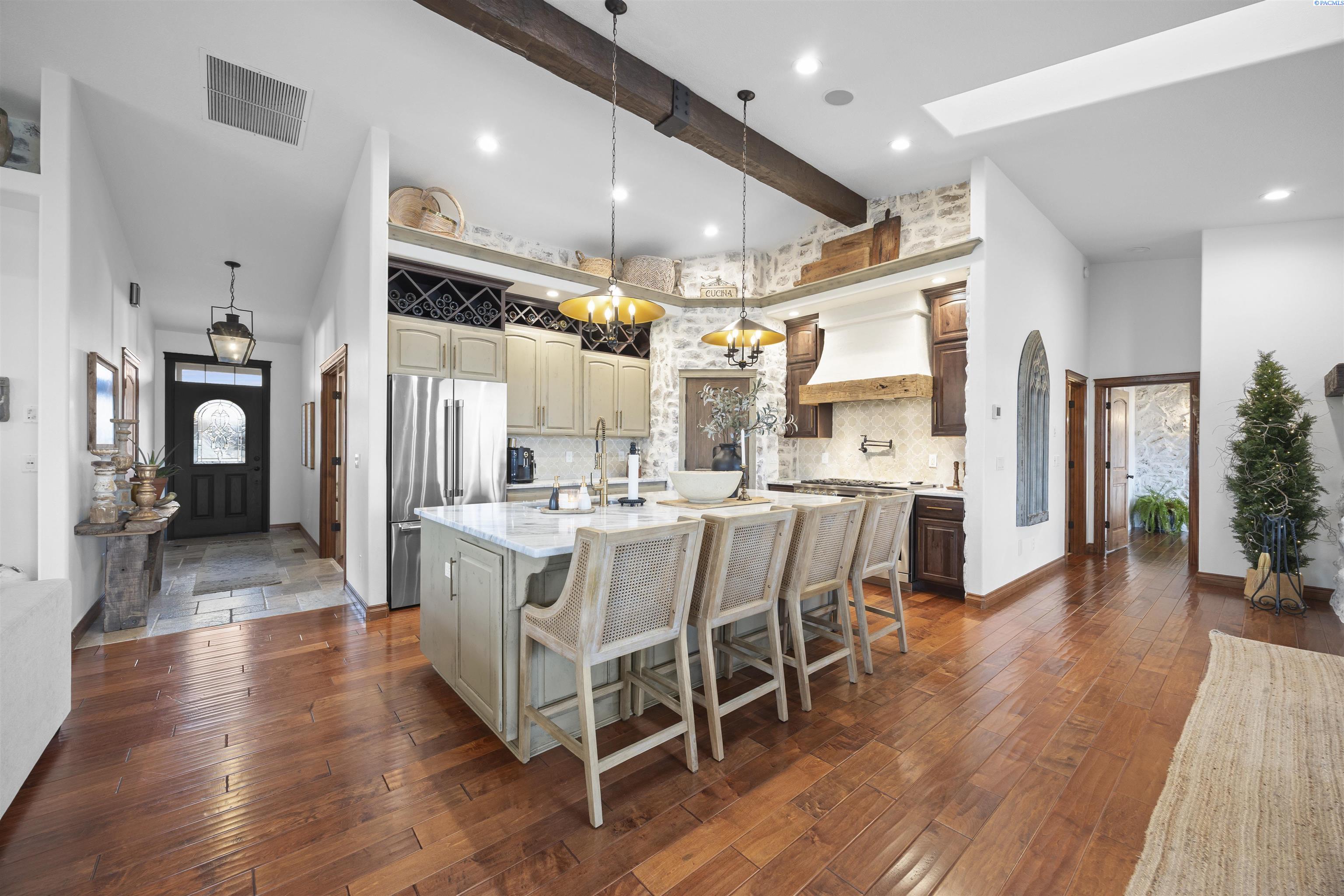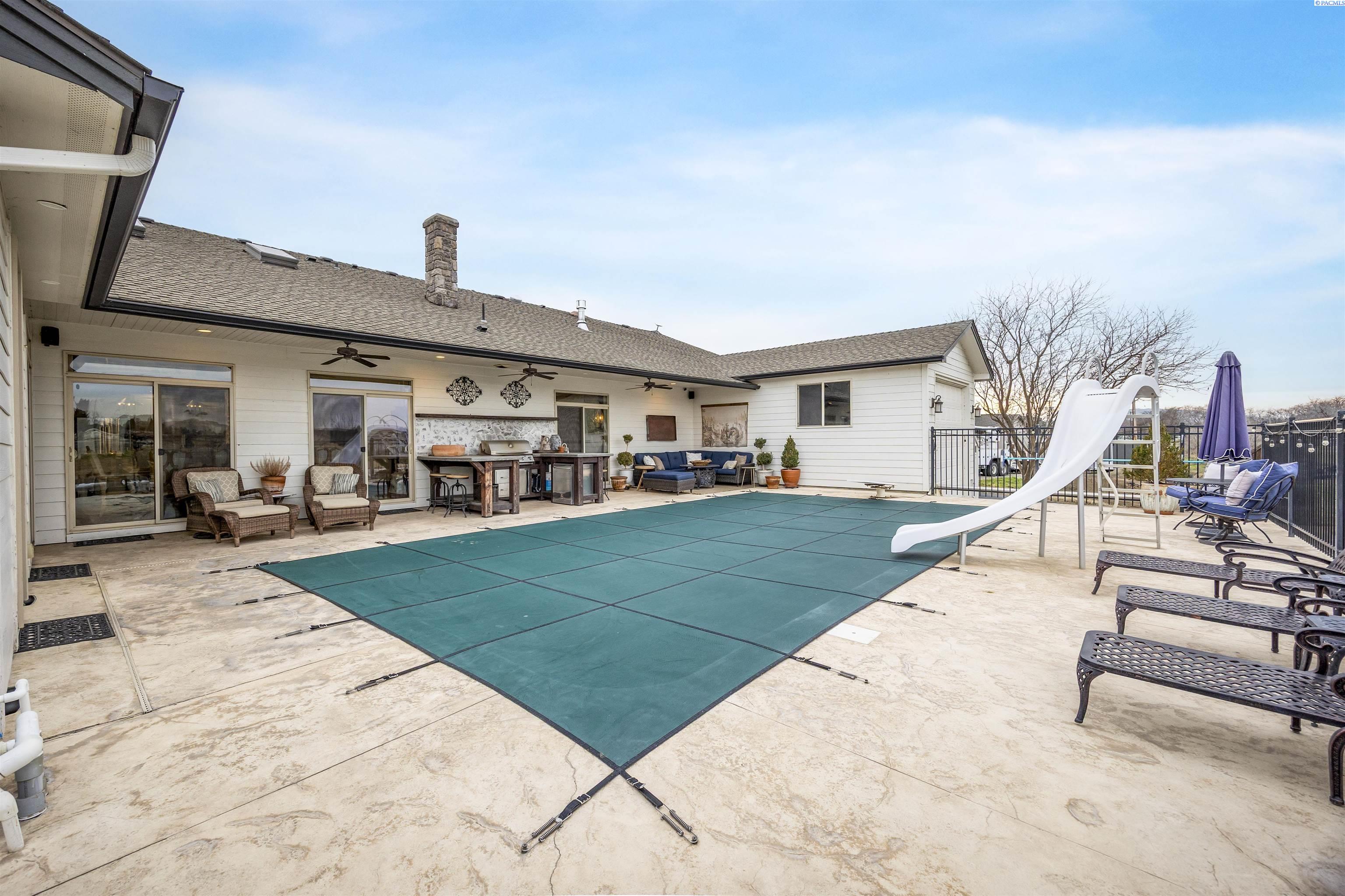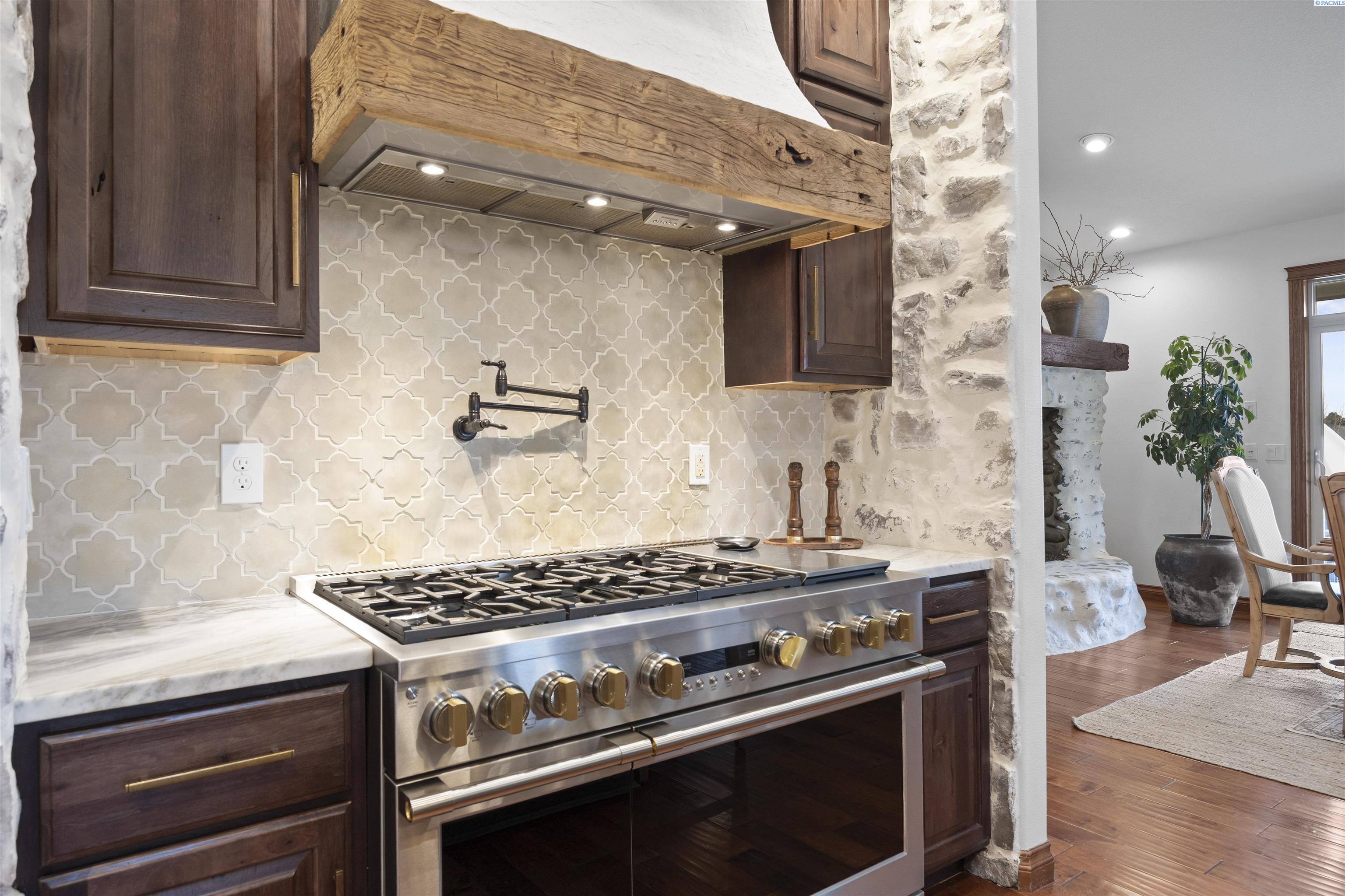 MLS# 290135 Nestled on a 1.24-acre lot at the end of a quiet cul-de-sac in Pasco, this stunning single-level home has been beautifully renovated with top-of-the-line finishes and exceptional attention to detail. The exterior showcases elegant cobblestone brick accents, a circular driveway, and pristine landscaping that create impressive curb appeal. Offering 2,992 sq. ft. of thoughtfully designed living space, the home features 4 bedrooms +office and 3.5 bathrooms. Inside, youâll find a beautiful blend of limestone tile and hardwood flooring, soaring ceilings, wood beams and expansive windows that flood the open great room with natural light. The adjacent dining area is equally striking, highlighted by a custom fireplace and serene backyard views. The chefâs kitchen is truly a showpiece, equipped with premium Bosch appliances, granite countertops, a large island, custom cabinetry, and a pantry with designer door. Retreat to the luxurious primary suite, where a vaulted wood-beamed ceiling, slider access to the pool & patio, and a dramatic stone fireplace create a private sanctuary. The spa-like ensuite bath features Sante Fe texture, a dual-sink vanity, an oversized zero-entry shower with waterproof Venetian plaster, and incredible custom his-and-hers closets. The home also includes a dedicated sauna room with a new heater and shower for ultimate relaxation. The 3.5 baths are finished with granite countertops, and 3 additional bedrooms are filled with natural light, while the office/den features French doors and a vaulted ceiling. The laundry room provides ample cabinetry, a utility sink, and includes the washer &Â dryer. Car enthusiasts and hobbyists will appreciate the massive 6+ car garage with an RV door and abundant storage. Step outside to your own private oasis, highlighted by an in-ground heated pool with new liner &Â pump, expansive pool decking, an outdoor kitchen, full fencing, and a large terraced patioâperfect for hosting unforgettable gatherings. The property also features a newly planted vineyard with raised garden beds, adding both charm and function. For added fun, the backyard even includes a dirt bike track for hours of enjoyment. Located in a sought-after West Pasco neighborhood of beautiful homes, this peaceful setting is just minutes from the river, Chiawana Park, schools, and excellent amenities. This exceptional property is a true showstopper, offering countless custom features both indoors and out!