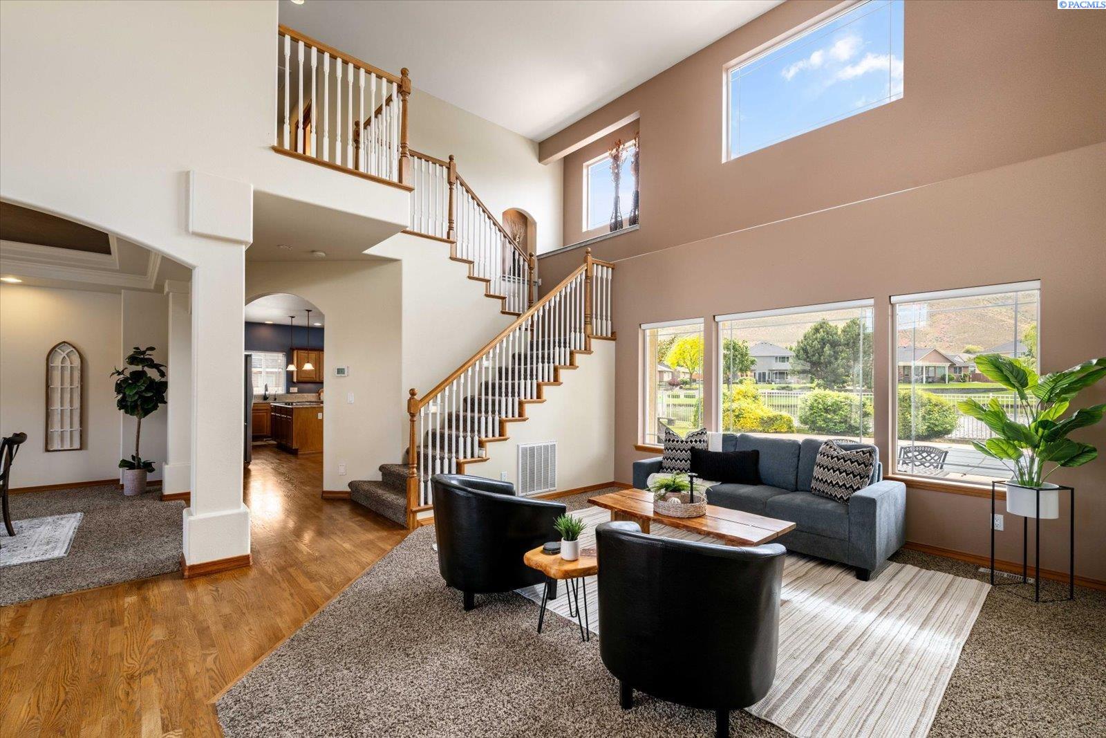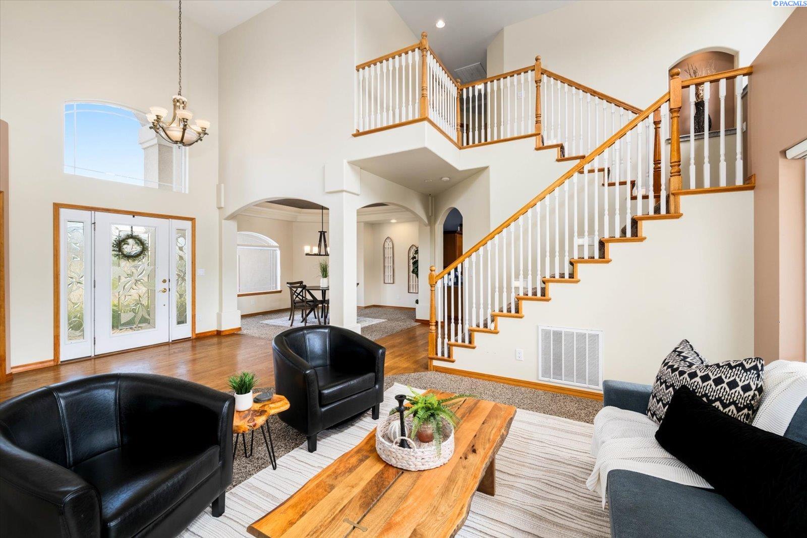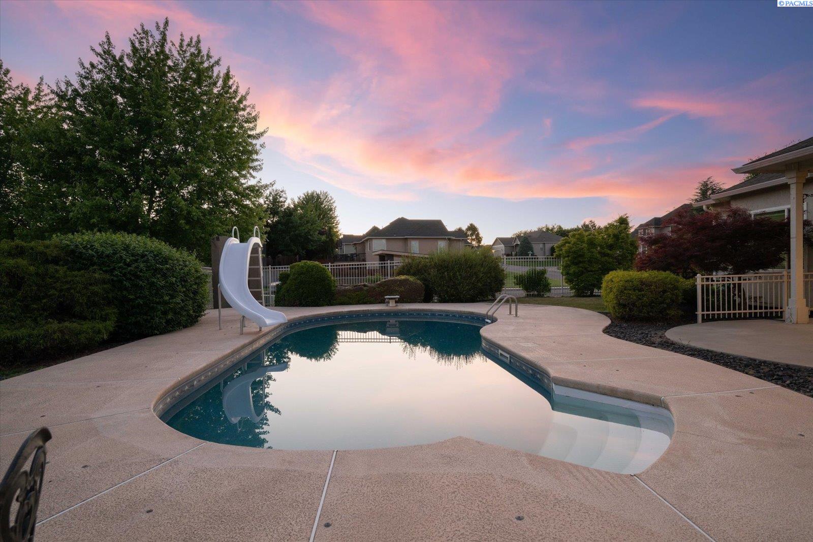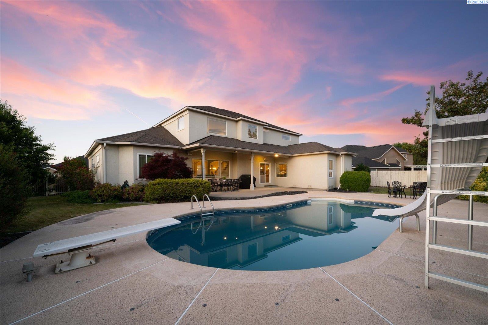 Welcome to this beautifully appointed 4-bedroom, 3-bath home located in a highly desirable South Richland neighborhood, just minutes from the Queensgate shopping area and convenient freeway access. Step through the grand entrance into a bright and airy foyer featuring soaring vaulted ceilings, a striking staircase, and elegant formal dining and living areas - perfect for entertaining. A dedicated office on the main floor provides an ideal space for remote work or study. The spacious main-floor primary suite is a true treat, complete with a double-sided fireplace, spa-like ensuite bathroom, and a custom walk-in closet. The heart of the home is the open-concept kitchen and family room, where a cozy fireplace, eat-in dining area, built-in wine cellar, and ample counterspace-including a built0in desk - make everyday living both functional and inviting. Upstairs, you'll find three generously sized bedrooms and a full bathroom, providing space and privacy for family or guests. Situated on a beautifully landscaped 1/3-acre lot, the backyard is your private oasis. Enjoy summer days on the expansive covered patio or by the in-ground pool, surrounded by serene pond views and professionally designed landscaping featuring rare basalt columns. Recent updates include a brand-new HVAC system installed in 2025, ensuring comfort and efficiency for years to come. Don't miss this rare opportunity to own a luxurious and well-maintained home in one of Richland's most sought-after locations.
