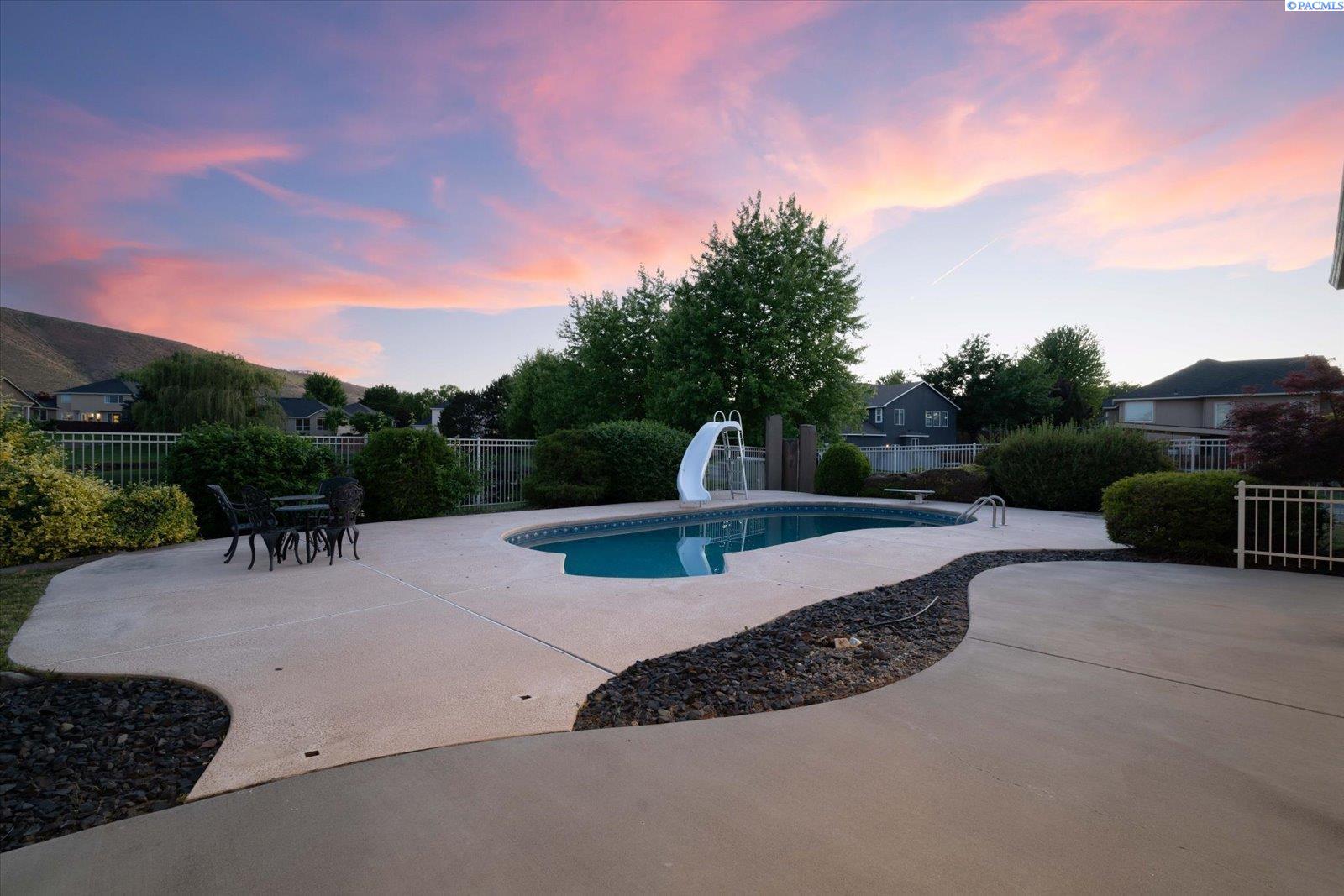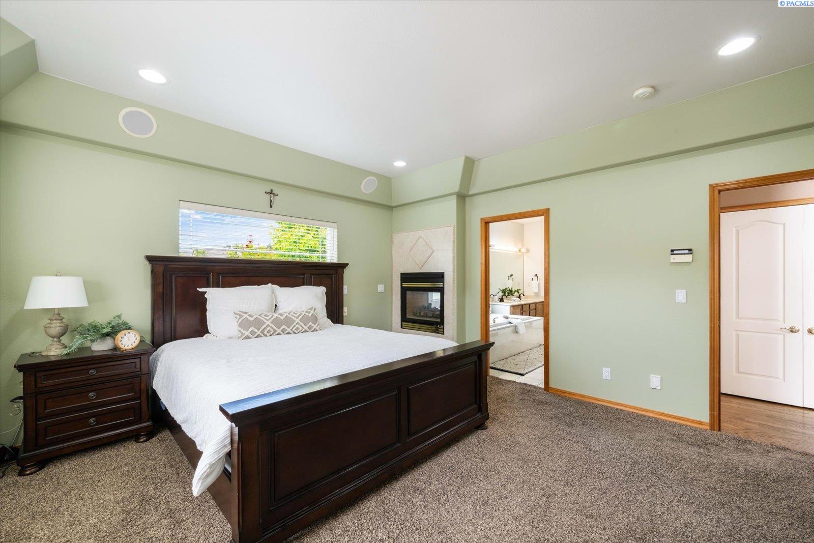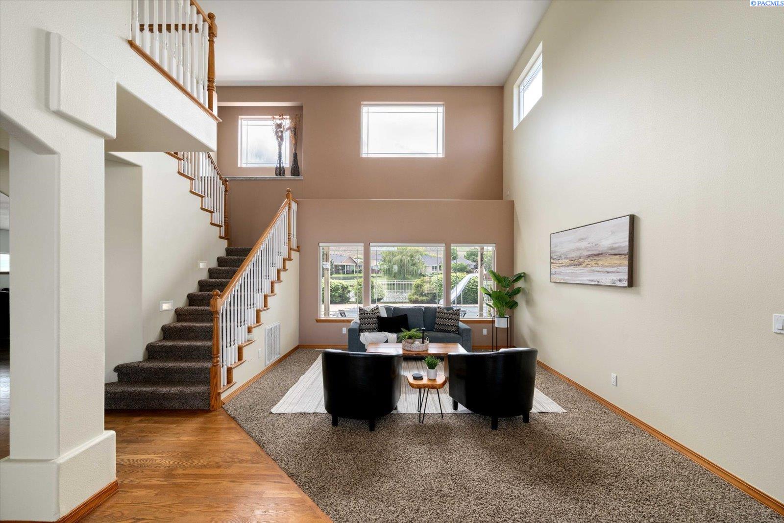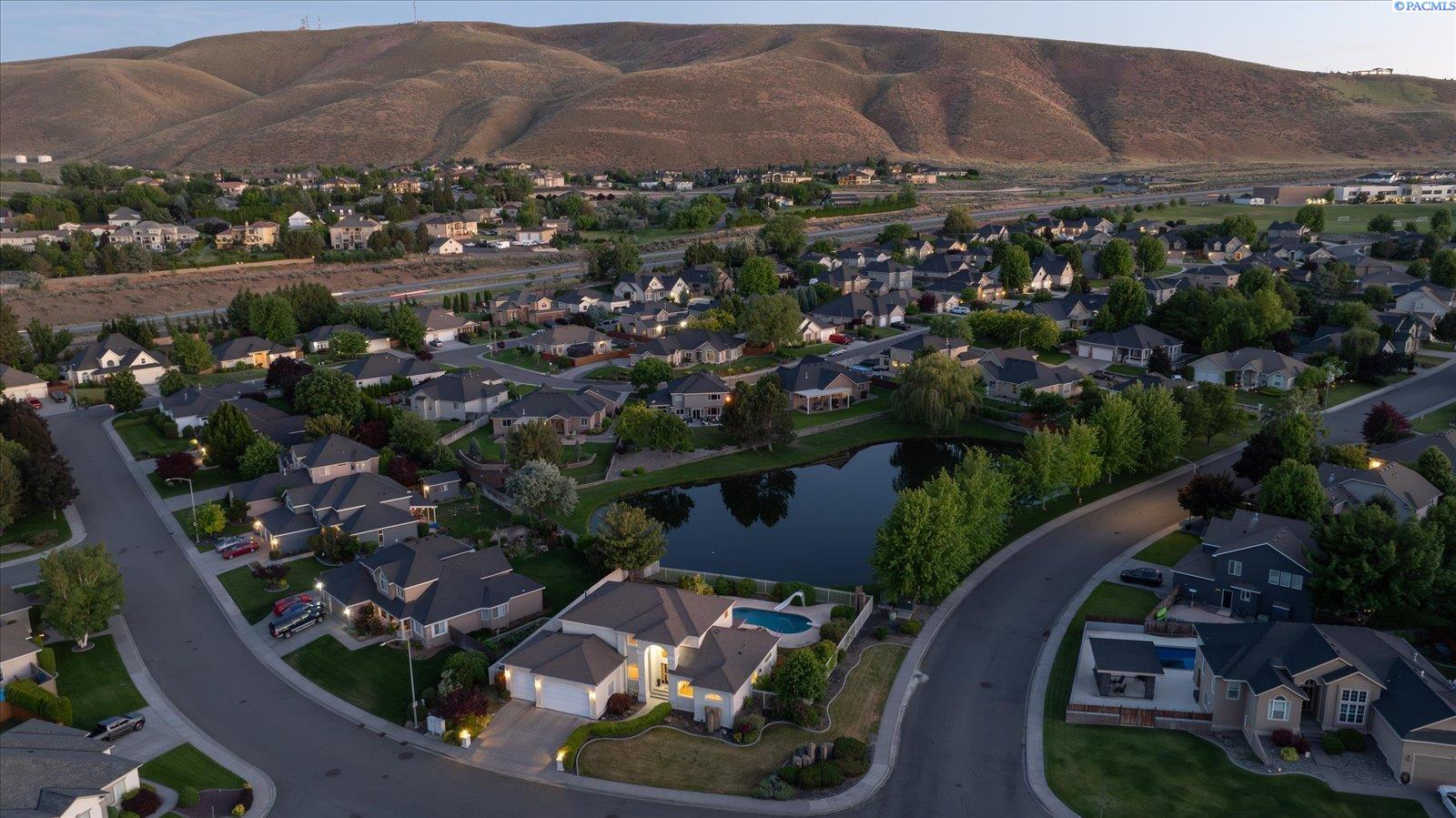 Welcome to this beautifully appointed 4-bedroom, 3-bath home located in a highly desirable South Richland neighborhood, just minutes from the Queensgate shopping area and convenient freeway access. Step through the grand entrance into a bright and airy foyer featuring soaring vaulted ceilings, a striking staircase, and elegant formal dining and living areas - perfect for entertaining. A dedicated office on the main floor provides an ideal space for remote work or study. The spacious main-floor primary suite is a true treat, complete with a double-sided fireplace, spa-like ensuite bathroom, and a custom walk-in closet. The heart of the home is the open-concept kitchen and family room, where a cozy fireplace, eat-in dining area, built-in wine cellar, and ample counterspace-including a built0in desk - make everyday living both functional and inviting. Upstairs, you'll find three generously sized bedrooms and a full bathroom, providing space and privacy for family or guests. Situated on a beautifully landscaped 1/3-acre lot, the backyard is your private oasis. Enjoy summer days on the expansive covered patio or by the in-ground pool, surrounded by serene pond views and professionally designed landscaping featuring rare basalt columns. Recent updates include a brand-new HVAC system installed in 2025, ensuring comfort and efficiency for years to come. Don't miss this rare opportunity to own a luxurious and well-maintained home in one of Richland's most sought-after locations.