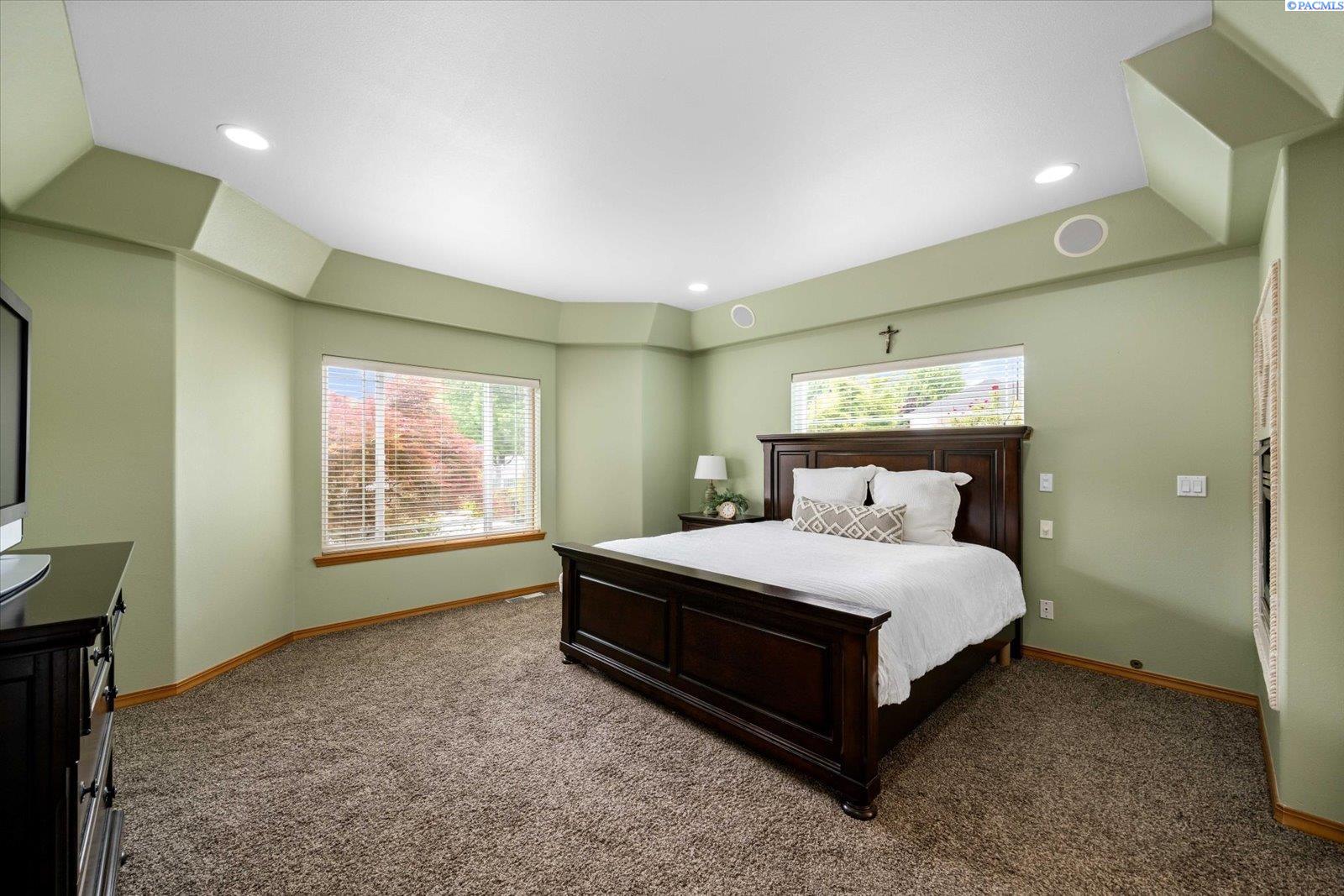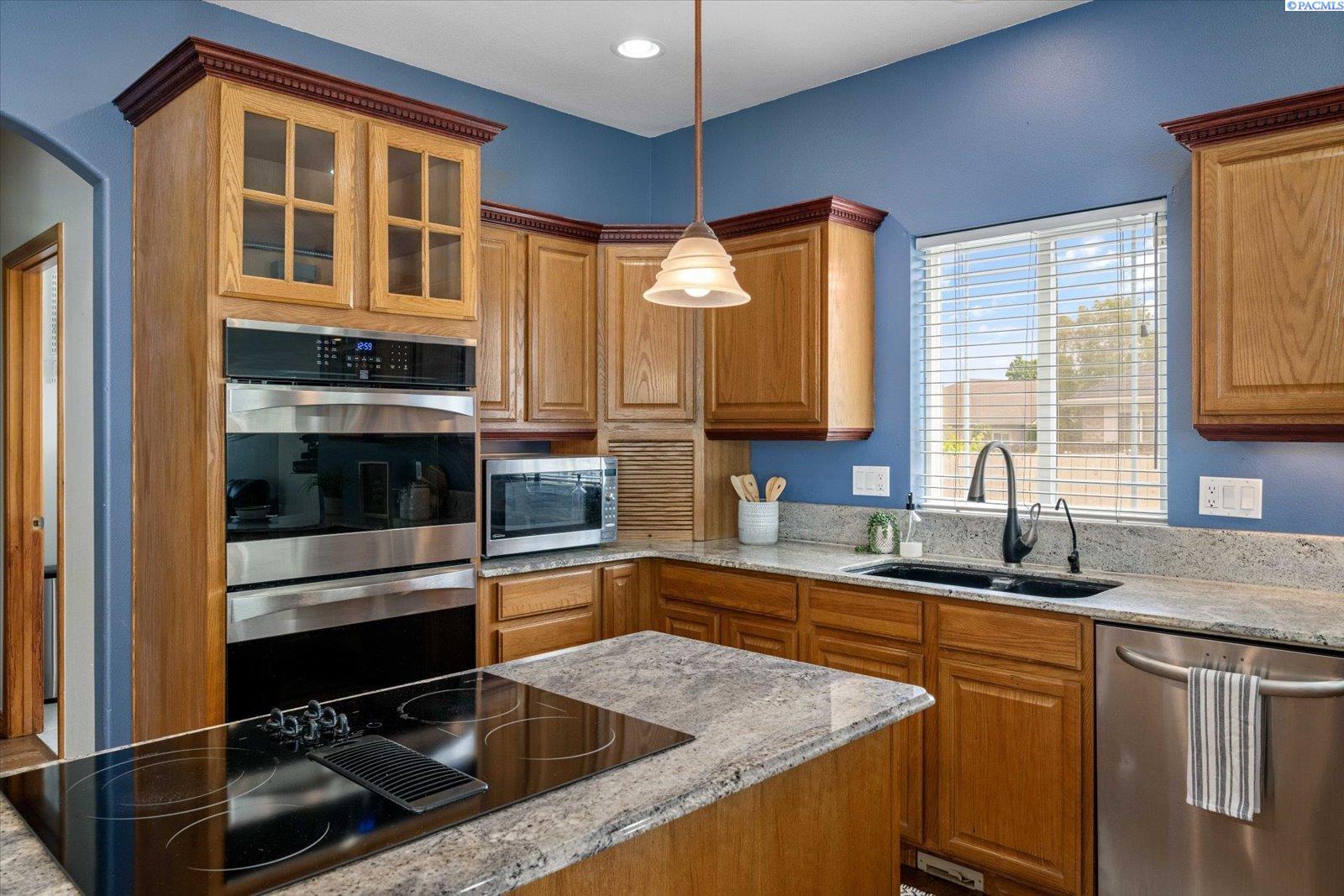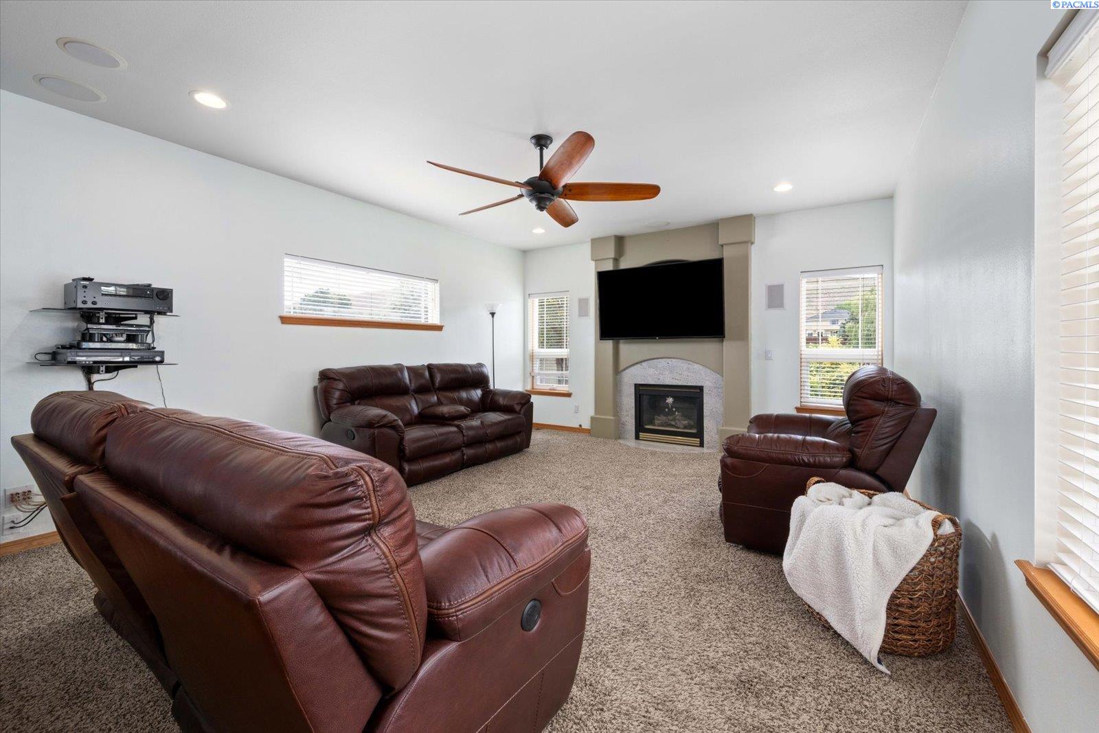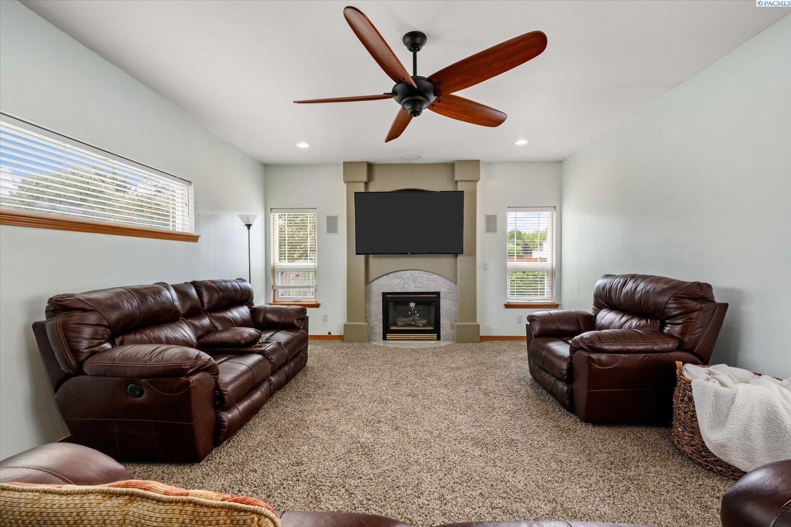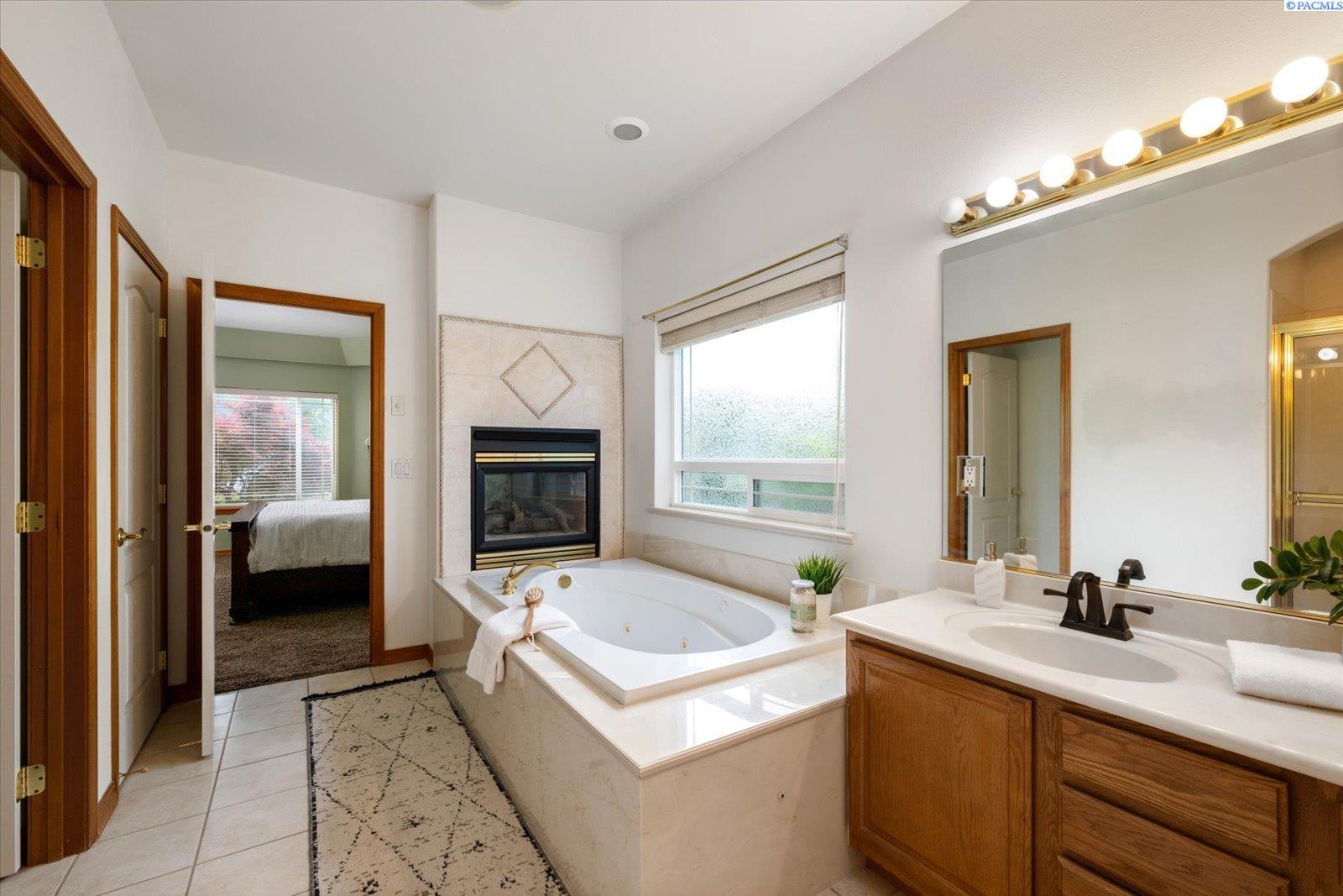Welcome to this beautifully appointed 4-bedroom, 3-bath home located in a highly desirable South Richland neighborhood, just minutes from the Queensgate shopping area and convenient freeway access. Step through the grand entrance into a bright and airy foyer featuring soaring vaulted ceilings, a striking staircase, and elegant formal dining and living areas - perfect for entertaining. A dedicated office on the main floor provides an ideal space for remote work or study. The spacious main-floor primary suite is a true treat, complete with a double-sided fireplace, spa-like ensuite bathroom, and a custom walk-in closet. The heart of the home is the open-concept kitchen and family room, where a cozy fireplace, eat-in dining area, built-in wine cellar, and ample counterspace-including a built0in desk - make everyday living both functional and inviting. Upstairs, you'll find three generously sized bedrooms and a full bathroom, providing space and privacy for family or guests. Situated on a beautifully landscaped 1/3-acre lot, the backyard is your private oasis. Enjoy summer days on the expansive covered patio or by the in-ground pool, surrounded by serene pond views and professionally designed landscaping featuring rare basalt columns. Recent updates include a brand-new HVAC system installed in 2025, ensuring comfort and efficiency for years to come. Don't miss this rare opportunity to own a luxurious and well-maintained home in one of Richland's most sought-after locations.