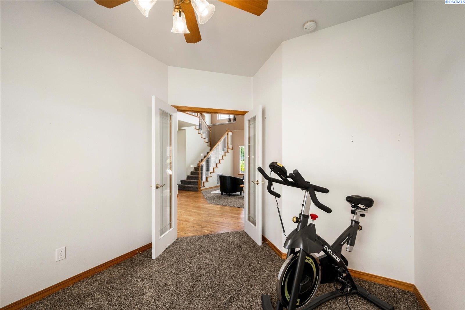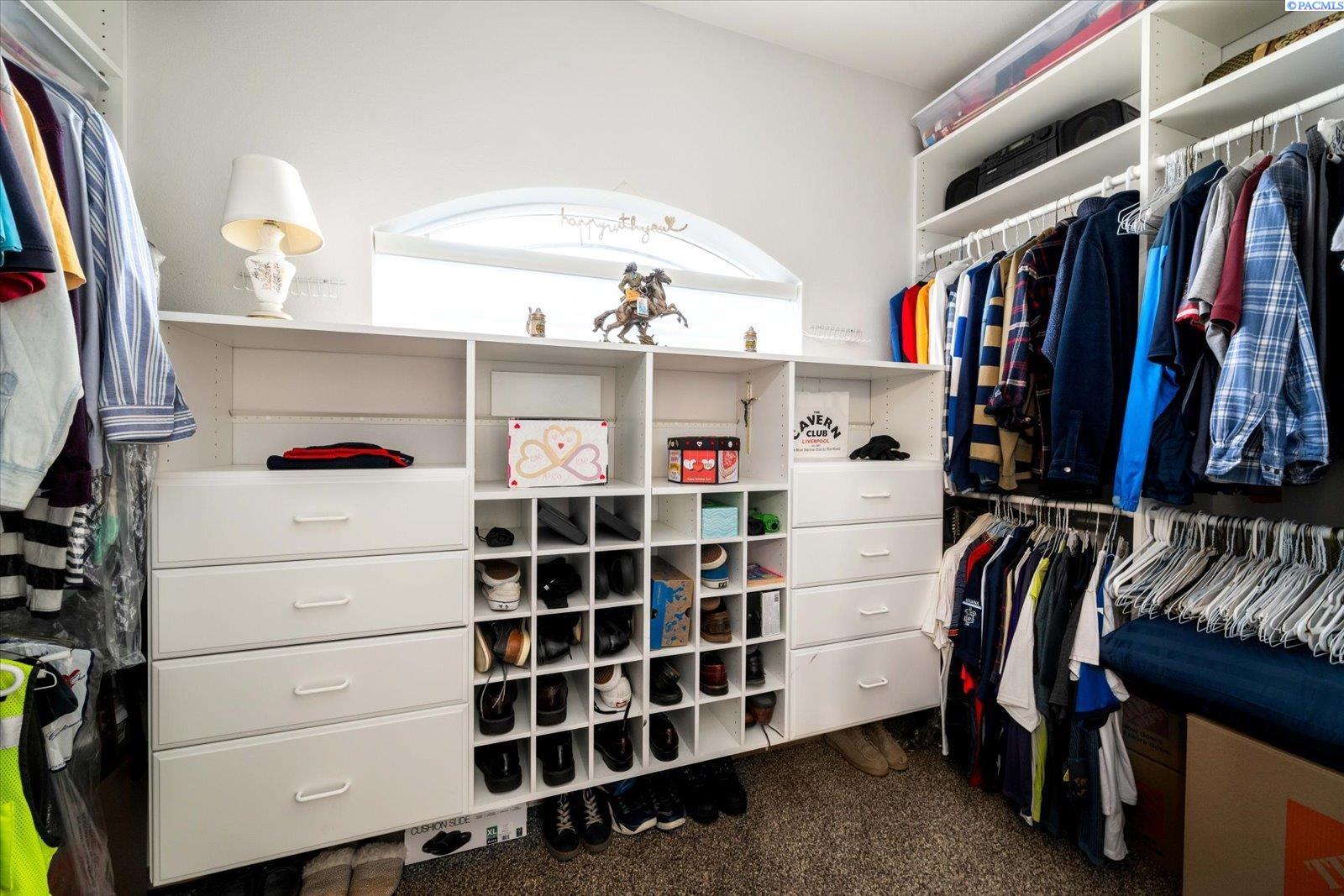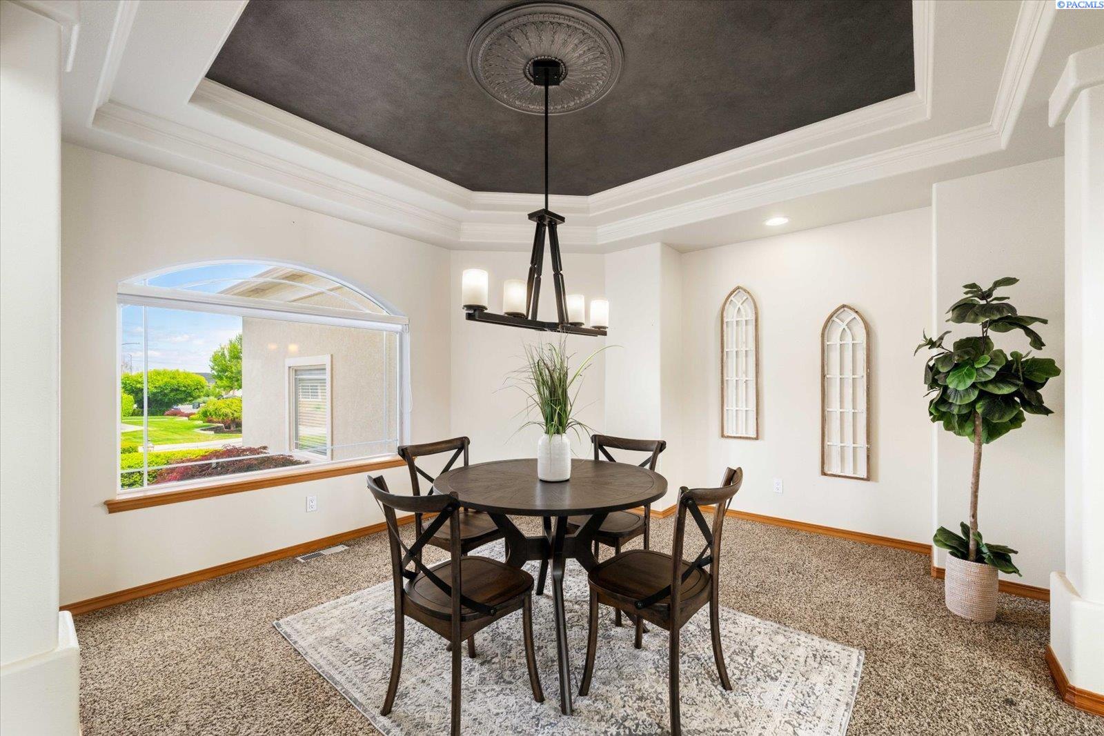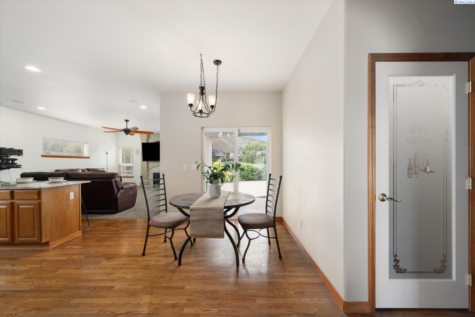 Welcome to this beautifully appointed 4-bedroom, 3-bath home located in a highly desirable South Richland neighborhood, just minutes from the Queensgate shopping area and convenient freeway access. Step through the grand entrance into a bright and airy foyer featuring soaring vaulted ceilings, a striking staircase, and elegant formal dining and living areas - perfect for entertaining. A dedicated office on the main floor provides an ideal space for remote work or study. The spacious main-floor primary suite is a true treat, complete with a double-sided fireplace, spa-like ensuite bathroom, and a custom walk-in closet. The heart of the home is the open-concept kitchen and family room, where a cozy fireplace, eat-in dining area, built-in wine cellar, and ample counterspace-including a built0in desk - make everyday living both functional and inviting. Upstairs, you'll find three generously sized bedrooms and a full bathroom, providing space and privacy for family or guests. Situated on a beautifully landscaped 1/3-acre lot, the backyard is your private oasis. Enjoy summer days on the expansive covered patio or by the in-ground pool, surrounded by serene pond views and professionally designed landscaping featuring rare basalt columns. Recent updates include a brand-new HVAC system installed in 2025, ensuring comfort and efficiency for years to come. Don't miss this rare opportunity to own a luxurious and well-maintained home in one of Richland's most sought-after locations.