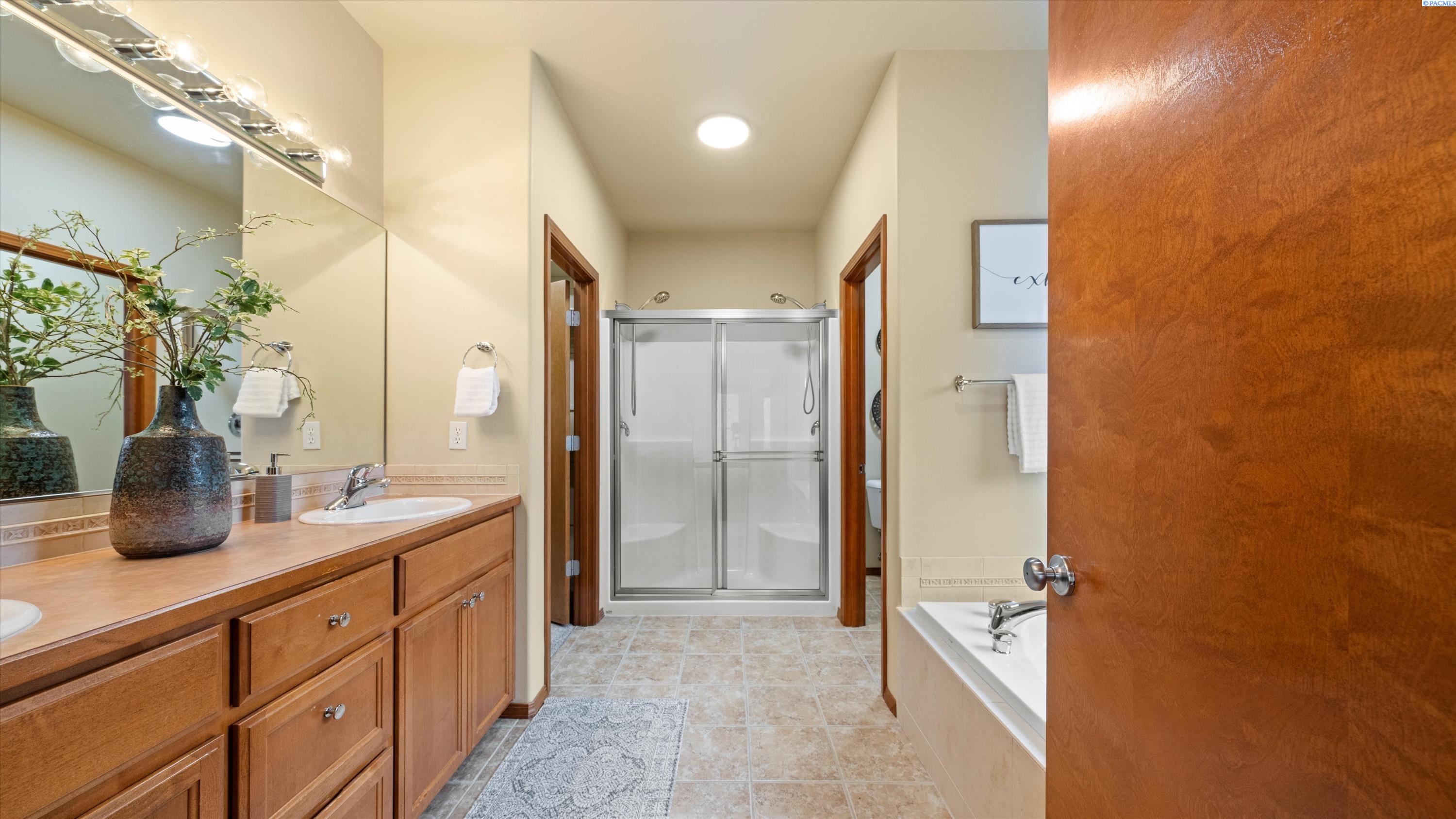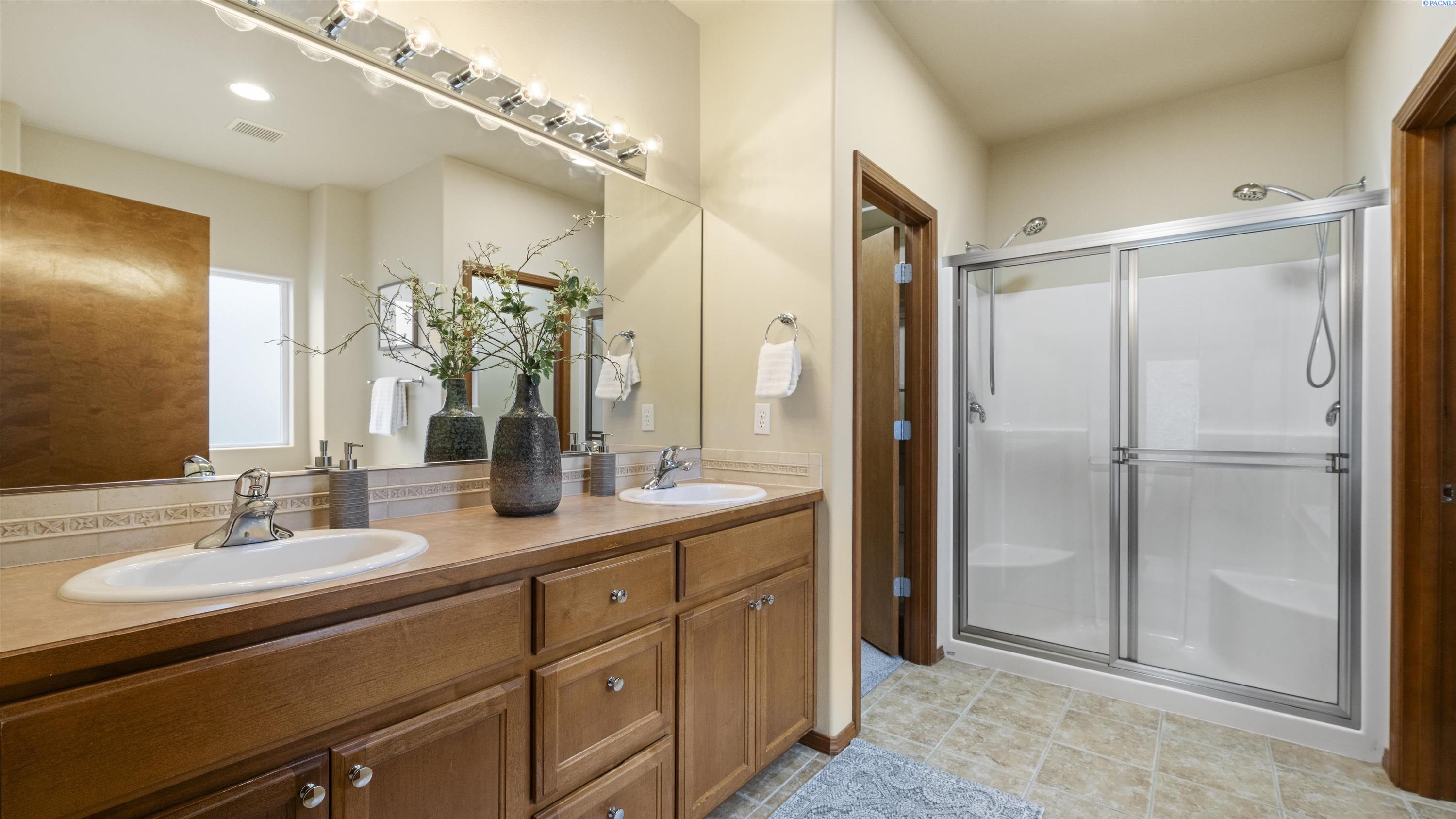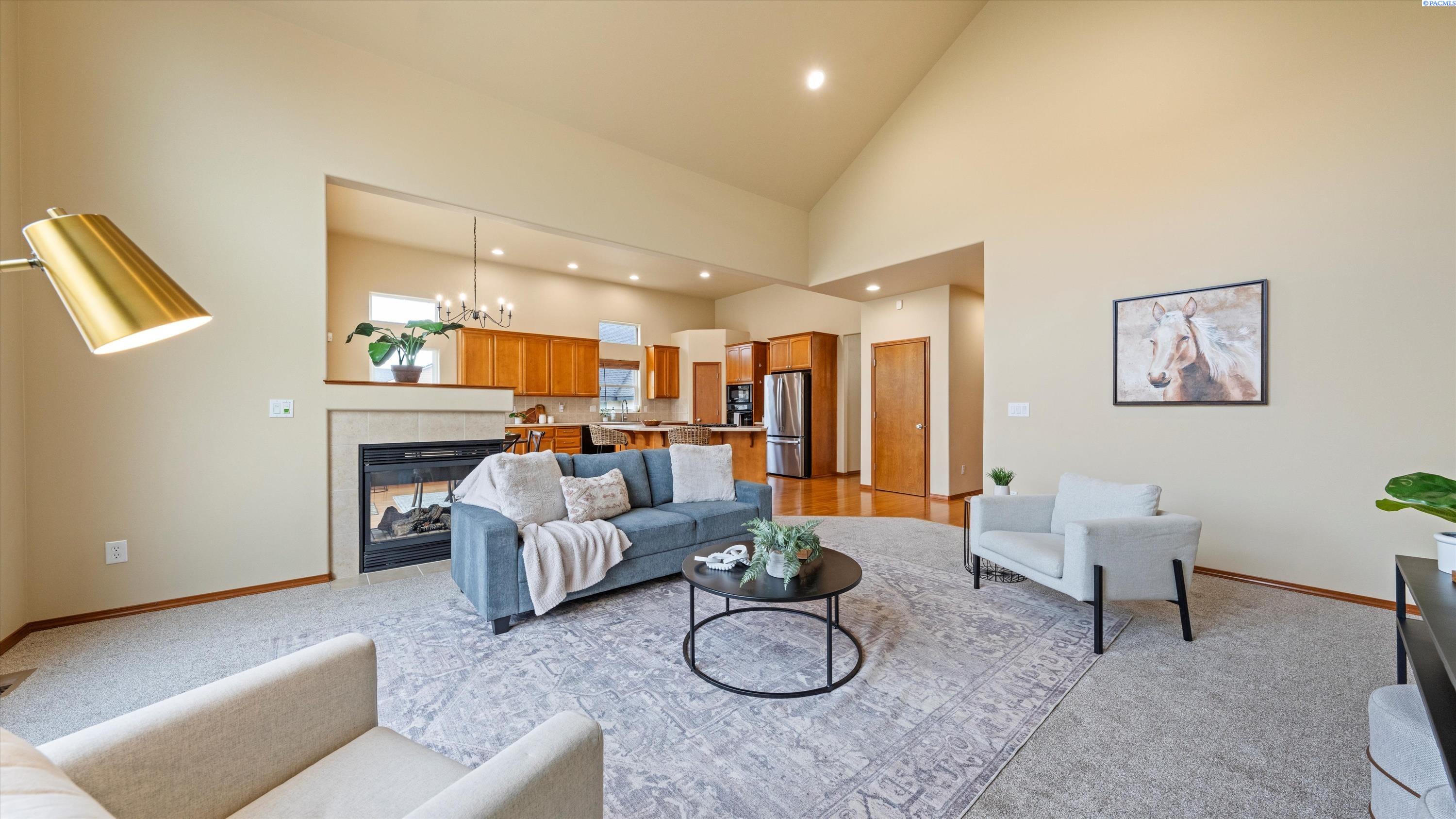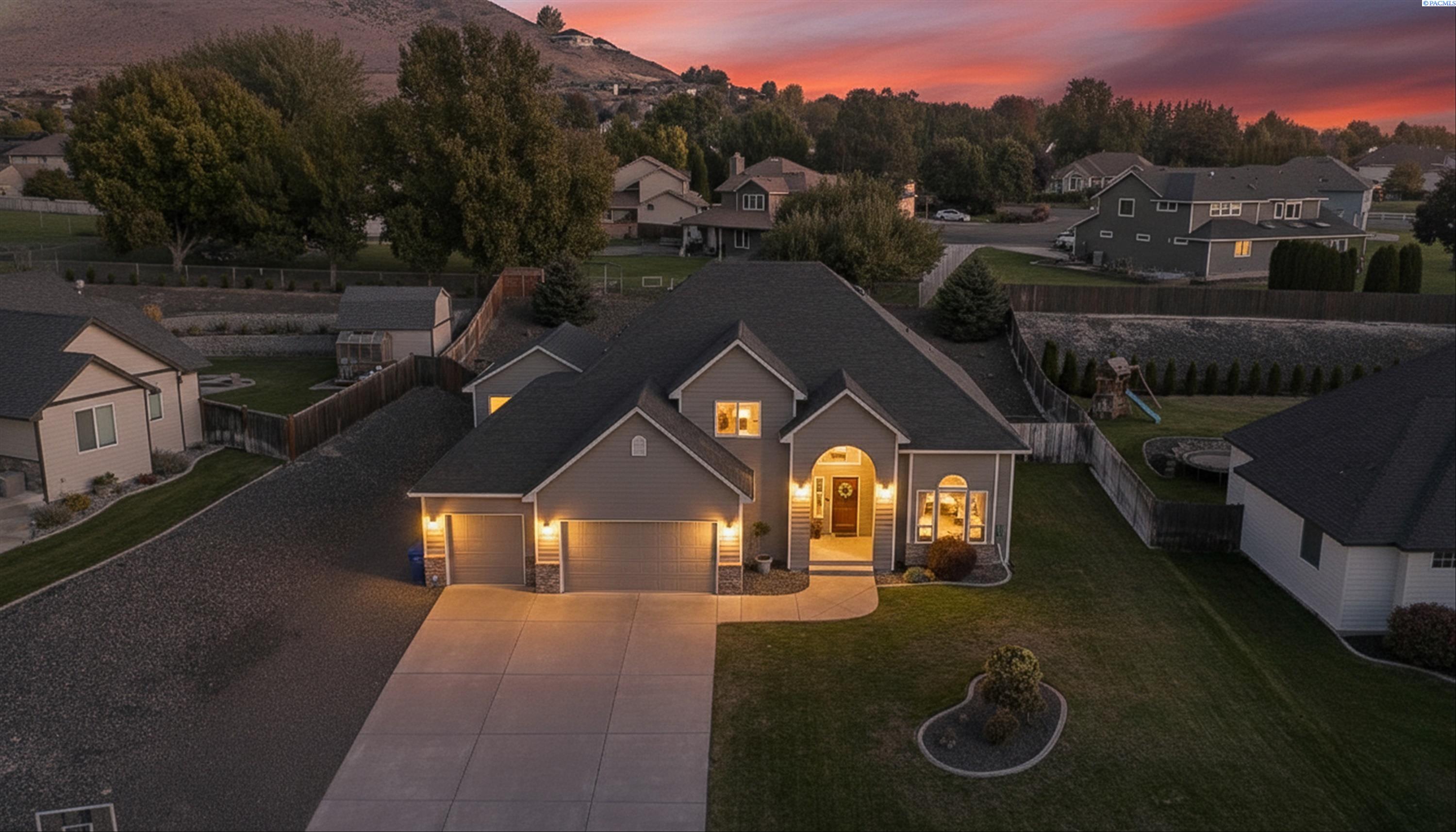 MLS# 290156 South Richland location, multi-suite layout, shop + garage capacity, and sunset views: a combination thatâs hard to beat. Set on over a half-acre in Meadow Parke Estates, this nearly 2,900 sq ft home offers a rare blend of space and flexibility. The main level features soaring ceilings, a living room, a dedicated office with French doors, powder bath, and a vaulted-ceiling great room filled with natural light, anchored by a double-sided fireplace connecting the kitchen and dining area. The kitchen is designed for gathering and hosting, featuring a large island with seating, generous cabinetry and pantry storage, a large stainless steel sink, and a gas cooktop. The main-floor primary suite includes an oversized walk-in closet and a spacious bathroom with a double vanity, soaking tub, separate shower, and private water closet. Upstairs adds versatility with a junior suite featuring its own ¾ bath, plus two additional bedrooms separated by a full bathroom. In total, the home offers 4 bedrooms, an office, 3.5 bathrooms, main-floor laundry, and two distinct living spaces - creating natural separation and modern household functionality. Outside, the property continues to impress with a fully finished attached 3-car garage with storage, an extended driveway with RV parking, and direct access to a temperature-controlled 20Ã24 shop and RV sewer output. The fenced and landscaped backyard includes two patios for outdoor living, a greenhouse-ready platform with water and electrical service, and a finished 4Ã8 shed tucked behind the shop. Sunset and territorial views can be enjoyed from multiple vantage points, and recent updates include brand new exterior paint and new carpet. Conveniently located near outdoor recreation, schools, grocery stores, restaurants, and I-82 commuter access, homes offering this level of care, square footage, flexibility, and shop + garage + parking capacity in South Richland are rare. A must-see, schedule your private tour today! (HOA = $300/year and includes road mainentance including snow removal!)