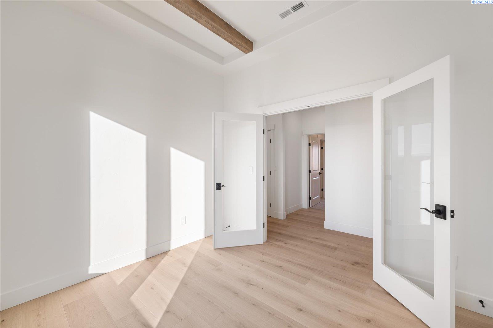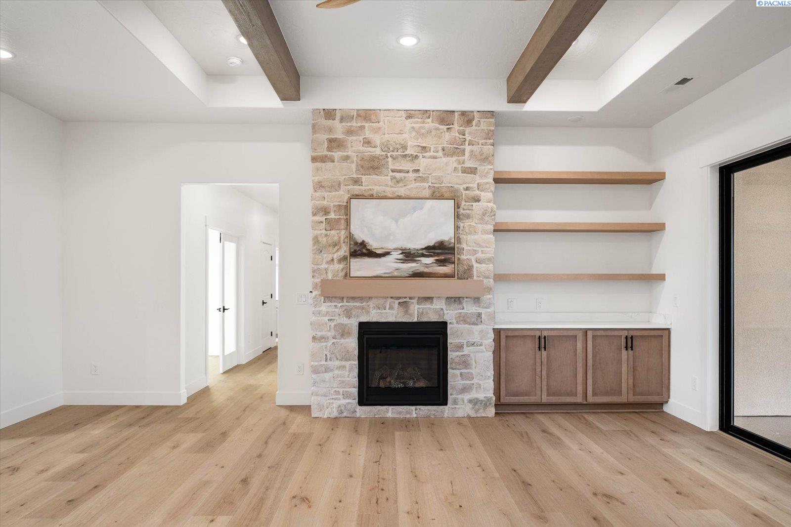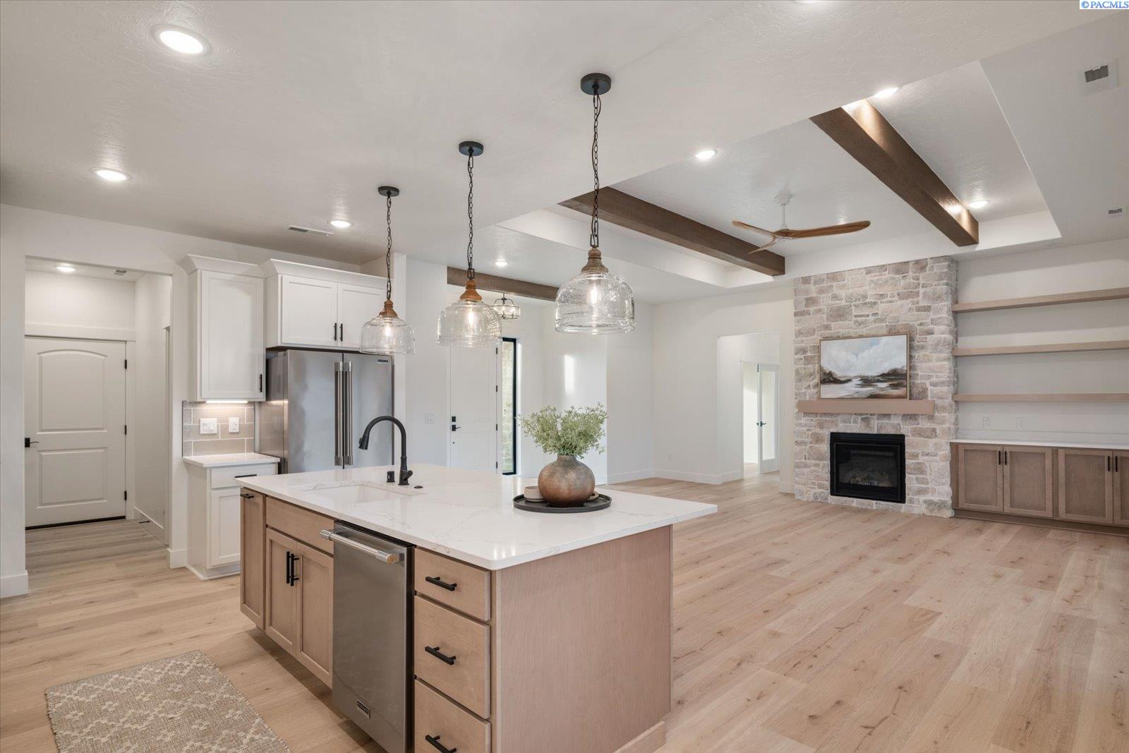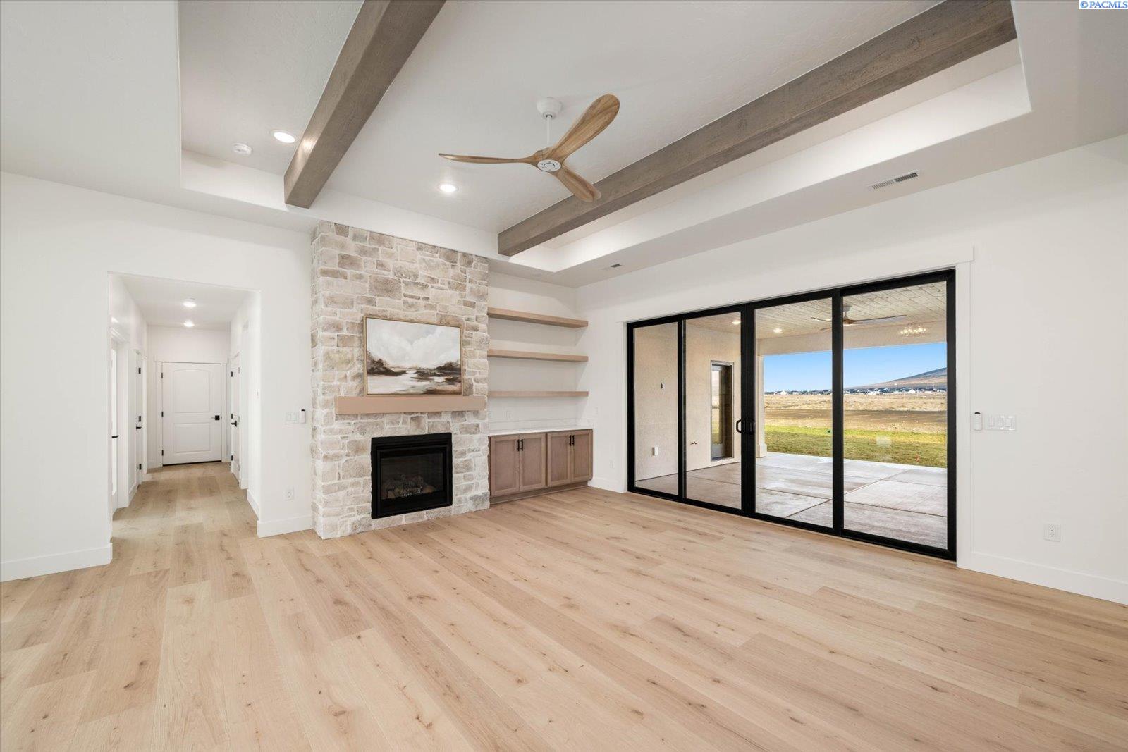 MLS# 290159 Exceptional new construction by Stellar Homes on a rare one-acre lot in desirable Harvest Ridge. This 2,420 sq ft home offers 3 bedrooms, a den, and 2.5 baths, thoughtfully designed with the elevated craftsmanship and refined attention to detail Stellar Homes is known for. The open-concept living space is both elegant and inviting, featuring dramatic ceiling beams, a gorgeous stone fireplace, quartz surfaces throughout, and an abundance of natural light. The kitchen is a true centerpiece, showcasing Huntwood cabinetry, a generous island with cabinetry on both sides, under-cabinet lighting, and a high-end Frigidaire Professional appliance package. A gas cooktop perfect for chefs at heart and a refrigerator complete this beautifully appointed space. The primary suite serves as a private retreat with his-and-hers closets, dual vanities, and custom built-in shelving. Additional highlights include a heated 47â RV bay with a 14â door and RV plug, an oversized two-car garage with an 18â wide door and EV plug, and an oversized driveway with ample parking providing exceptional versatility and space for all your toys. Set on an expansive one-acre lot with space for a future pool or shop, this home offers a rare opportunity in todayâs market. Enjoy the tranquility of country-style living while remaining close to amenities, easy interstate access, and walking paths to the Country Mercantile, a beloved local destination known for its fresh foods and charming atmosphere. This home won't disappoint!