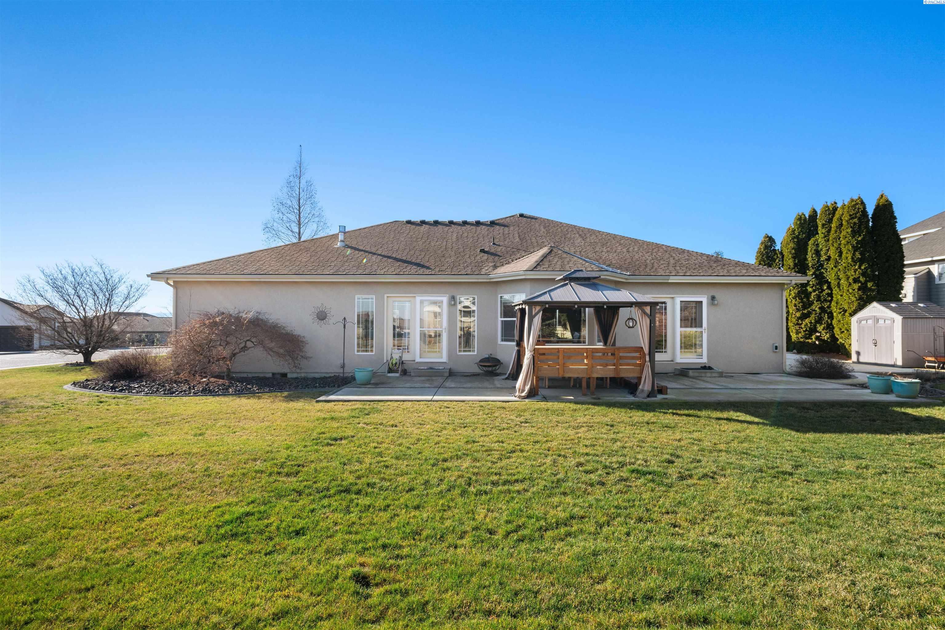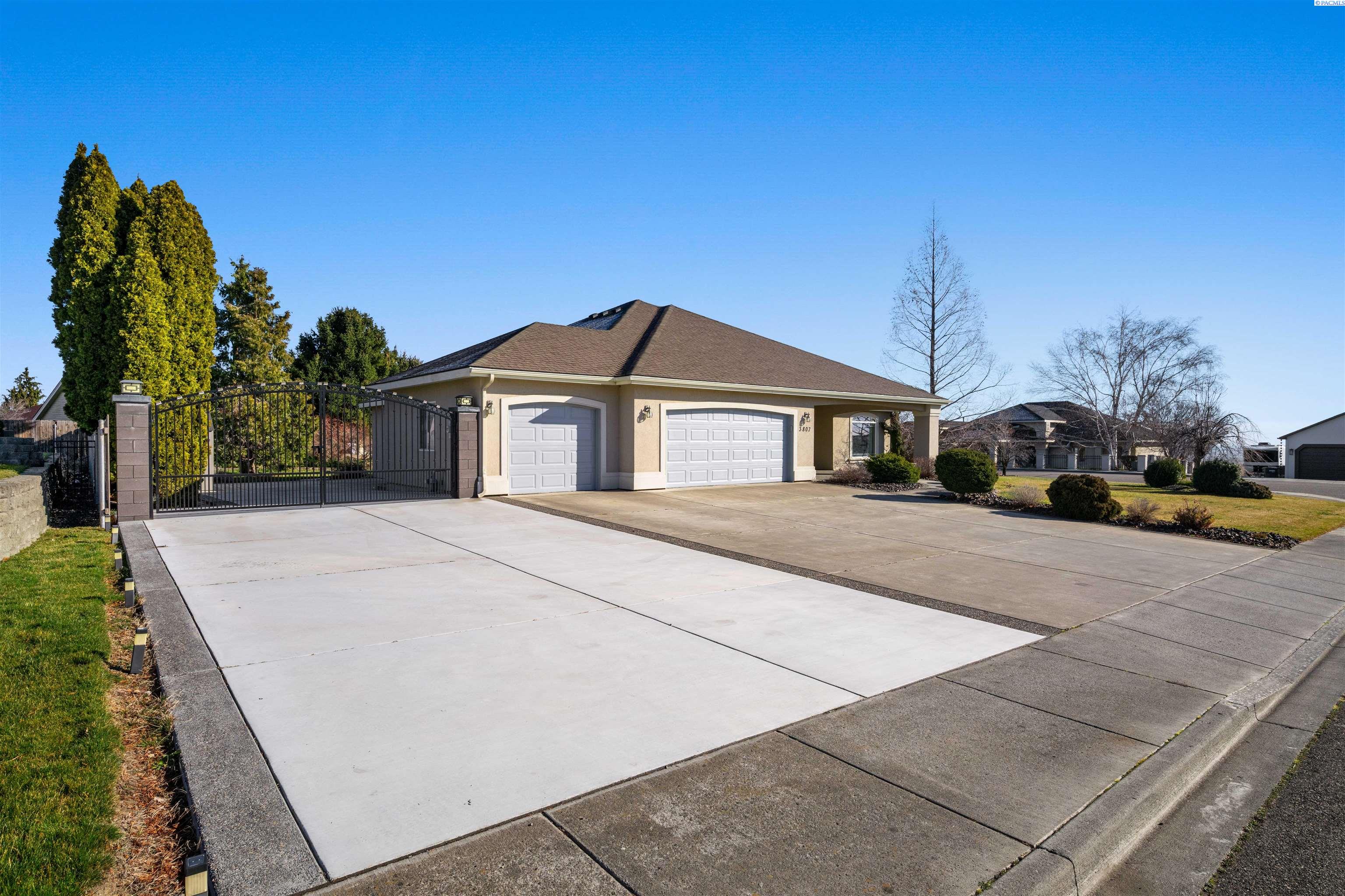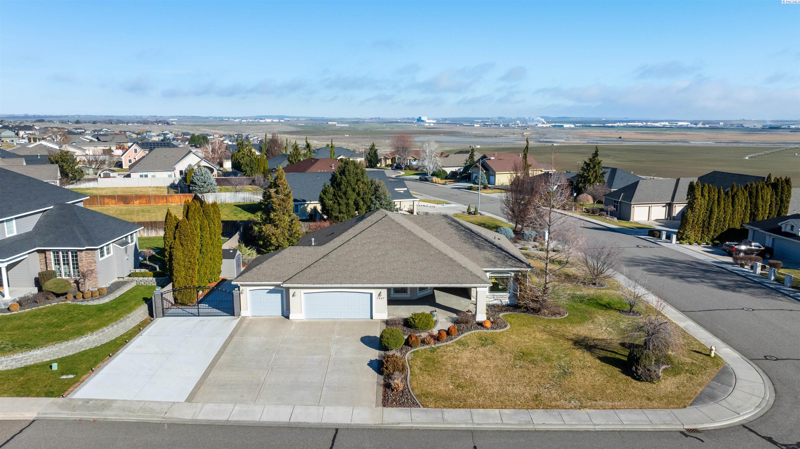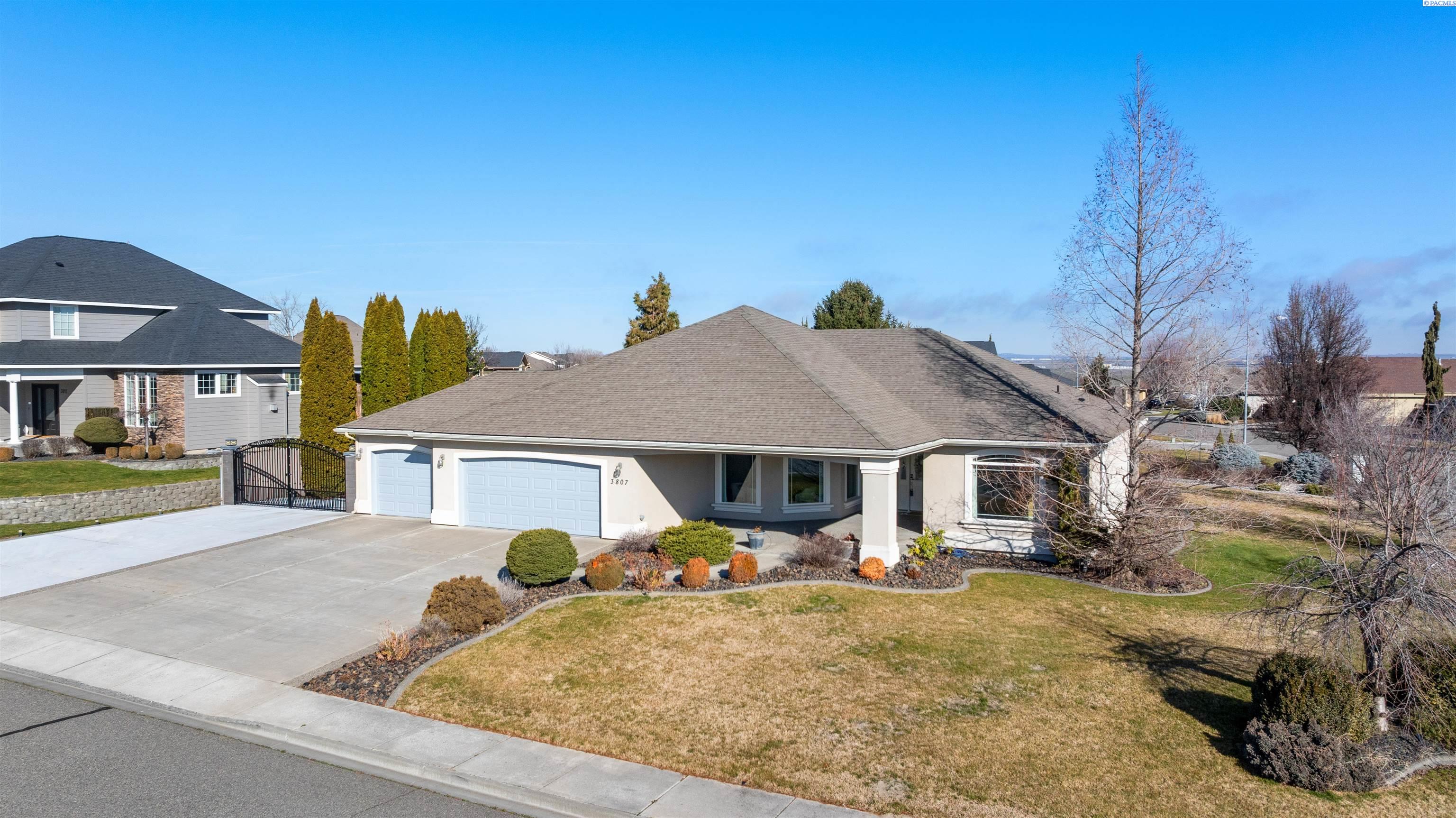 MLS# 290468 Tucked into the Desert Bluff neighborhood, this three bedroom, two bathroom single-level home sits proudly on a corner lot and offers a floor plan that simply makes sense. A sizable, gracious front porch welcomes you in and offers peaceful views stretching toward the distant mountains, the perfect place to unwind and take in the surroundings. The split bedroom design provides separation and privacy while keeping everyday living comfortable and connected. Inside, custom details add character throughout. The dining area is framed by archways and columns, giving it a touch of elegance without sacrificing warmth. The living room features built-ins and a gas fireplace, creating a cozy gathering space with views of the peaceful landscaped backyard. The kitchen is both functional and inviting, complete with detailed ceiling accents, tile flooring, and a bay window that feels made for slow mornings with coffee in hand. Step outside to a generous concrete patio that wraps around the home and connects to a newly paved RV parking area with a double gate installed just last year. Whether you have toys, trailers, or simply want extra flexibility, the added parking space alongside the three-car garage gives you options. The primary suite offers patio access for slow mornings outdoors and includes a spacious ensuite bath with a soaking tub, separate shower, double sinks, and a walk-in closet. Two additional bedrooms and a full bath round out the opposite wing of the home. Located just minutes from McGee Playfield, McGee Elementary, and the Tri-Cities Airport, this home offers both tranquility and accessibility. Solid, detailed, and carefully crafted, it is a home where quality is felt the moment you walk through the door.