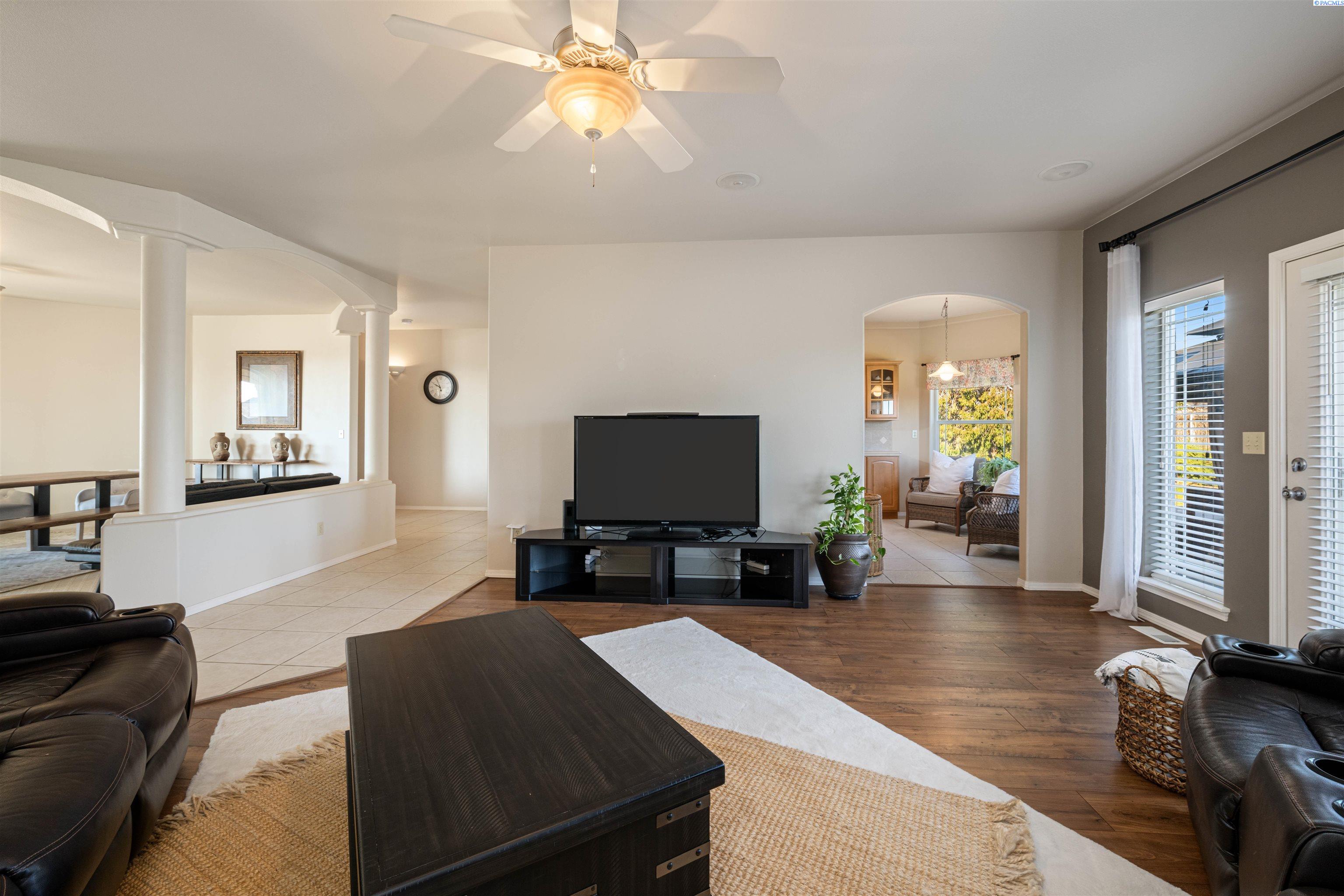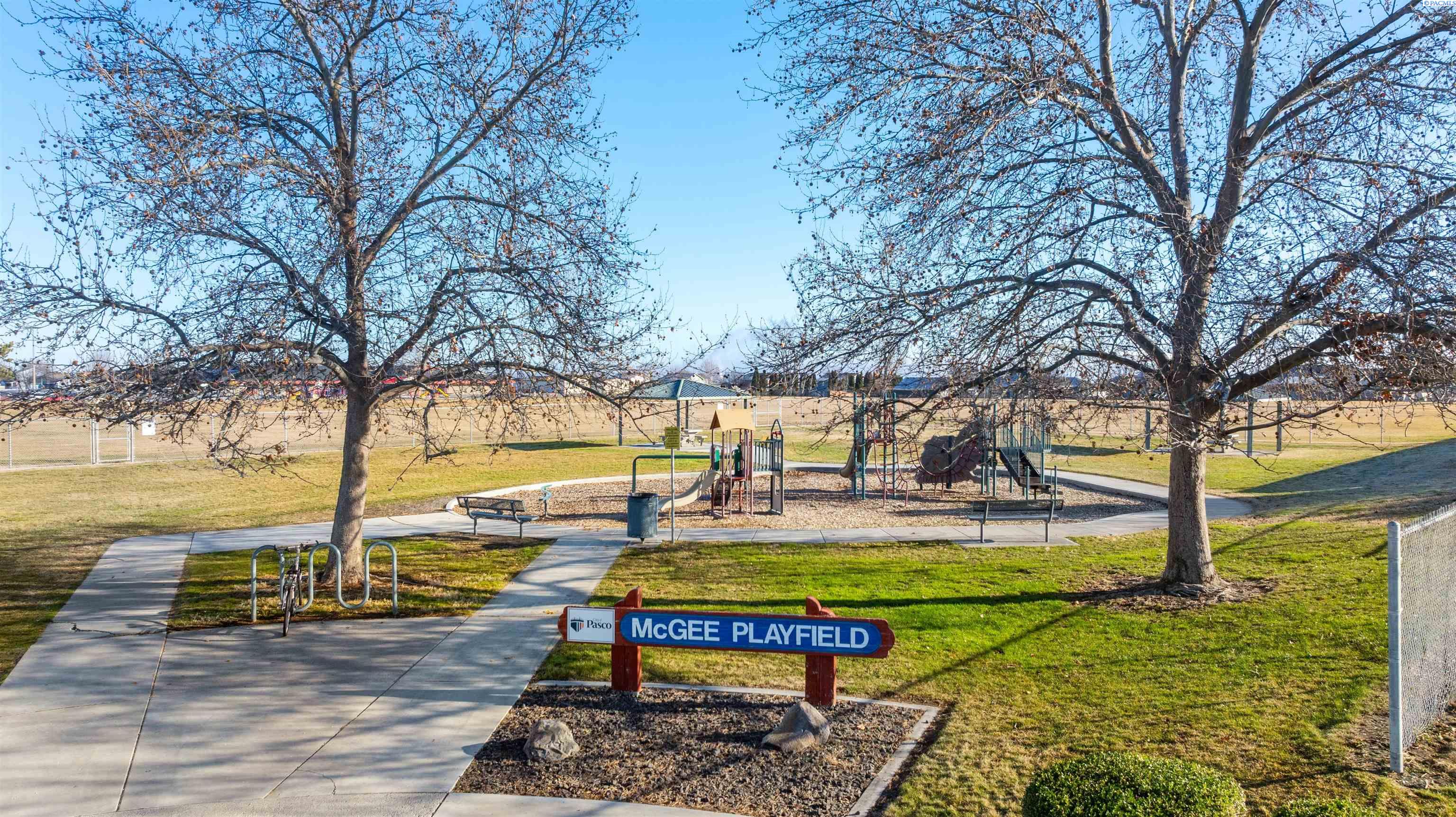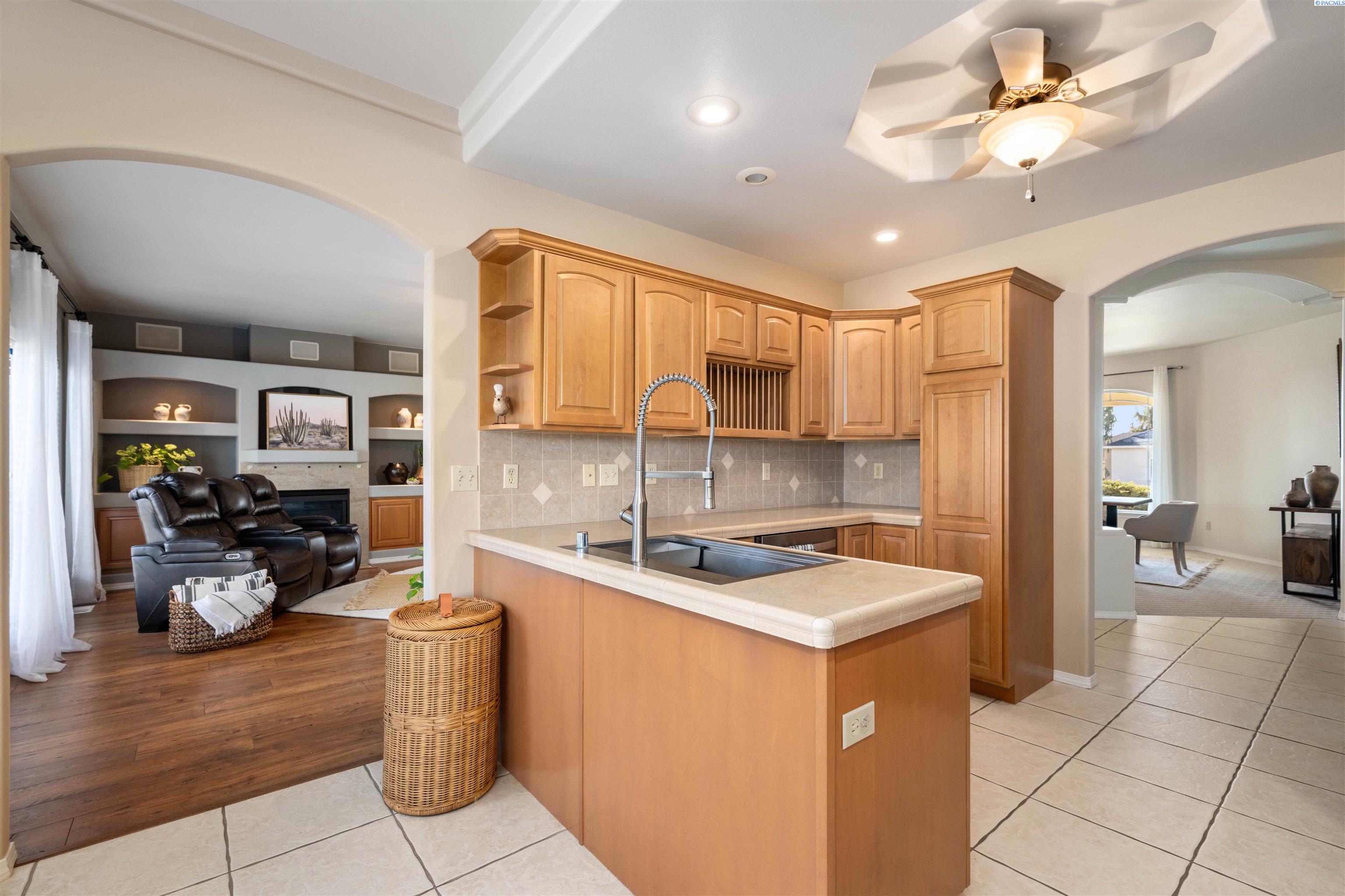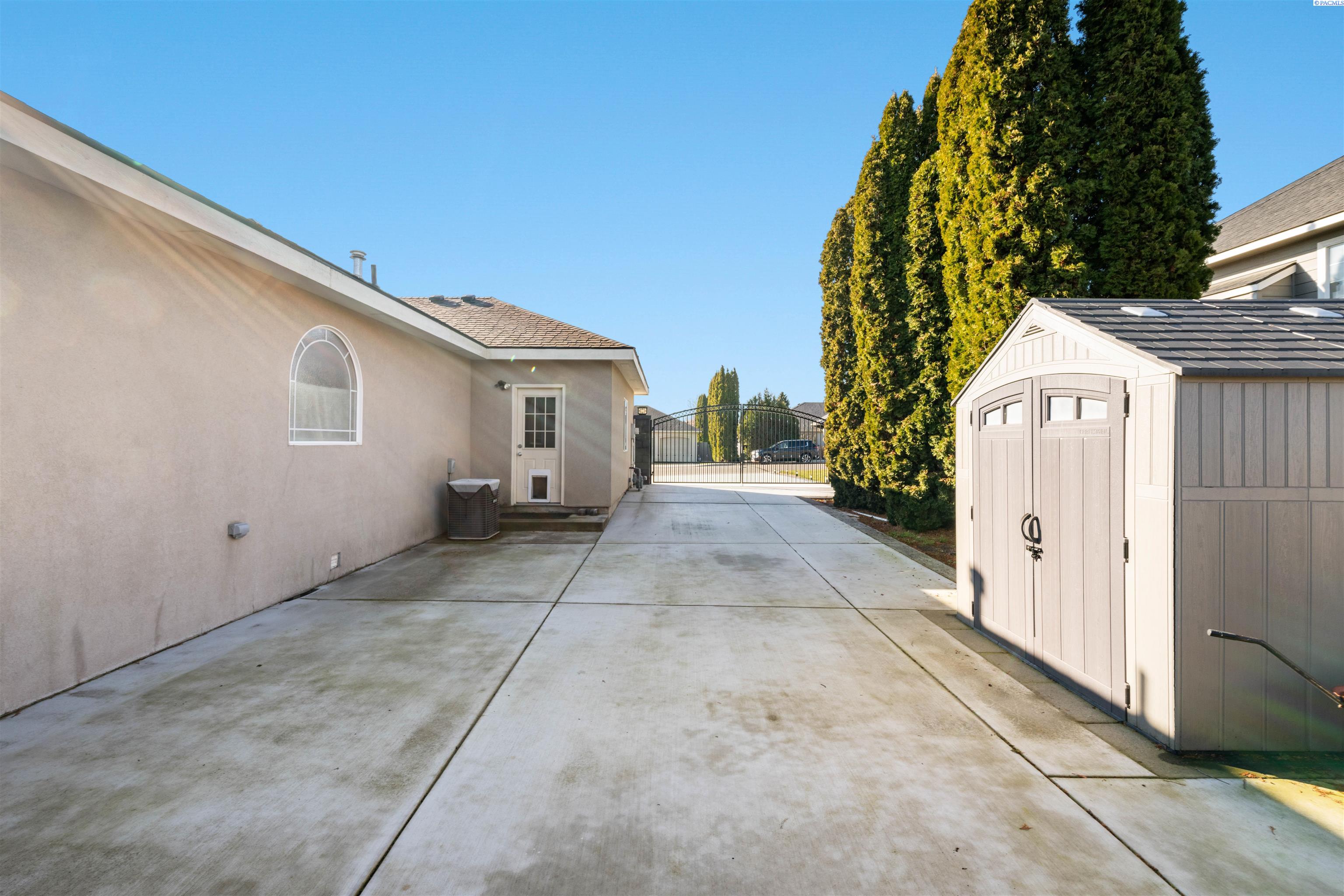 MLS# 290468 Tucked into the Desert Bluff neighborhood, this three bedroom, two bathroom single-level home sits proudly on a corner lot and offers a floor plan that simply makes sense. A sizable, gracious front porch welcomes you in and offers peaceful views stretching toward the distant mountains, the perfect place to unwind and take in the surroundings. The split bedroom design provides separation and privacy while keeping everyday living comfortable and connected. Inside, custom details add character throughout. The dining area is framed by archways and columns, giving it a touch of elegance without sacrificing warmth. The living room features built-ins and a gas fireplace, creating a cozy gathering space with views of the peaceful landscaped backyard. The kitchen is both functional and inviting, complete with detailed ceiling accents, tile flooring, and a bay window that feels made for slow mornings with coffee in hand. Step outside to a generous concrete patio that wraps around the home and connects to a newly paved RV parking area with a double gate installed just last year. Whether you have toys, trailers, or simply want extra flexibility, the added parking space alongside the three-car garage gives you options. The primary suite offers patio access for slow mornings outdoors and includes a spacious ensuite bath with a soaking tub, separate shower, double sinks, and a walk-in closet. Two additional bedrooms and a full bath round out the opposite wing of the home. Located just minutes from McGee Playfield, McGee Elementary, and the Tri-Cities Airport, this home offers both tranquility and accessibility. Solid, detailed, and carefully crafted, it is a home where quality is felt the moment you walk through the door.