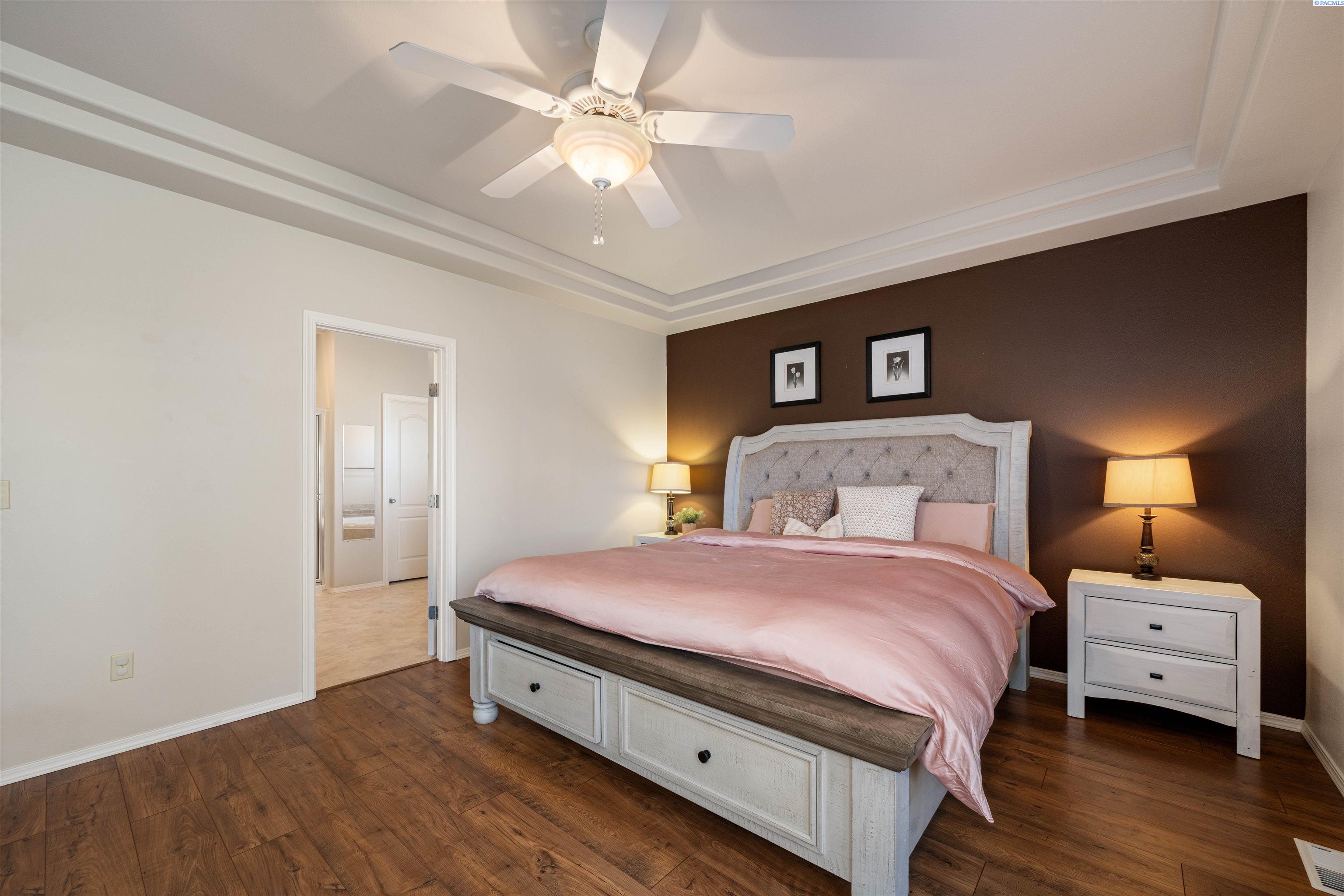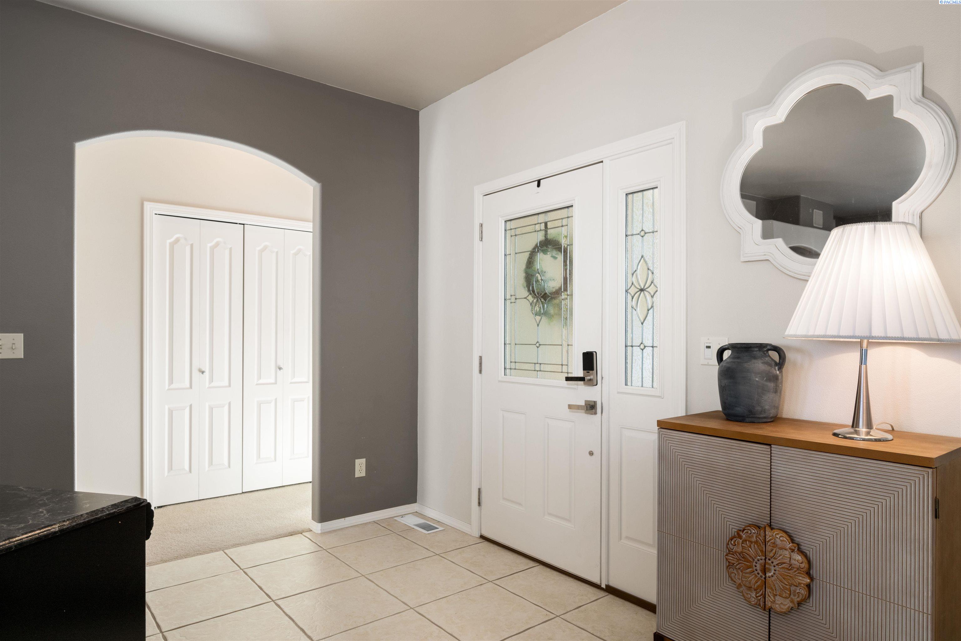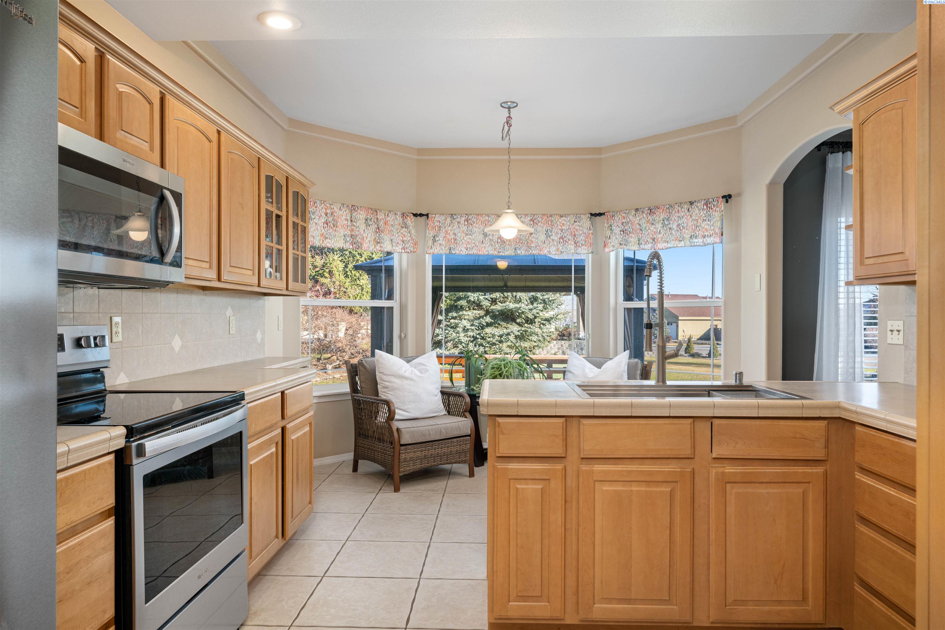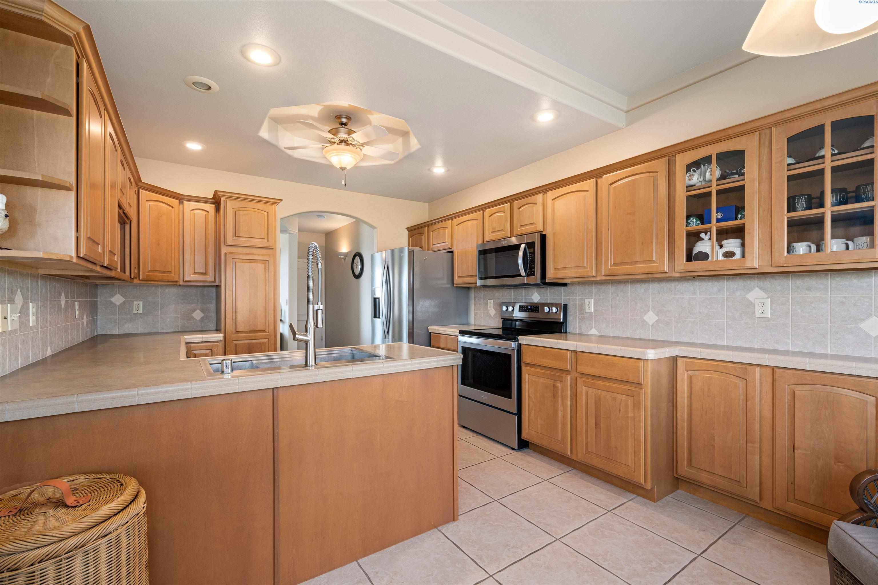 MLS# 290468 Tucked into the Desert Bluff neighborhood, this three bedroom, two bathroom single-level home sits proudly on a corner lot and offers a floor plan that simply makes sense. A sizable, gracious front porch welcomes you in and offers peaceful views stretching toward the distant mountains, the perfect place to unwind and take in the surroundings. The split bedroom design provides separation and privacy while keeping everyday living comfortable and connected. Inside, custom details add character throughout. The dining area is framed by archways and columns, giving it a touch of elegance without sacrificing warmth. The living room features built-ins and a gas fireplace, creating a cozy gathering space with views of the peaceful landscaped backyard. The kitchen is both functional and inviting, complete with detailed ceiling accents, tile flooring, and a bay window that feels made for slow mornings with coffee in hand. Step outside to a generous concrete patio that wraps around the home and connects to a newly paved RV parking area with a double gate installed just last year. Whether you have toys, trailers, or simply want extra flexibility, the added parking space alongside the three-car garage gives you options. The primary suite offers patio access for slow mornings outdoors and includes a spacious ensuite bath with a soaking tub, separate shower, double sinks, and a walk-in closet. Two additional bedrooms and a full bath round out the opposite wing of the home. Located just minutes from McGee Playfield, McGee Elementary, and the Tri-Cities Airport, this home offers both tranquility and accessibility. Solid, detailed, and carefully crafted, it is a home where quality is felt the moment you walk through the door.