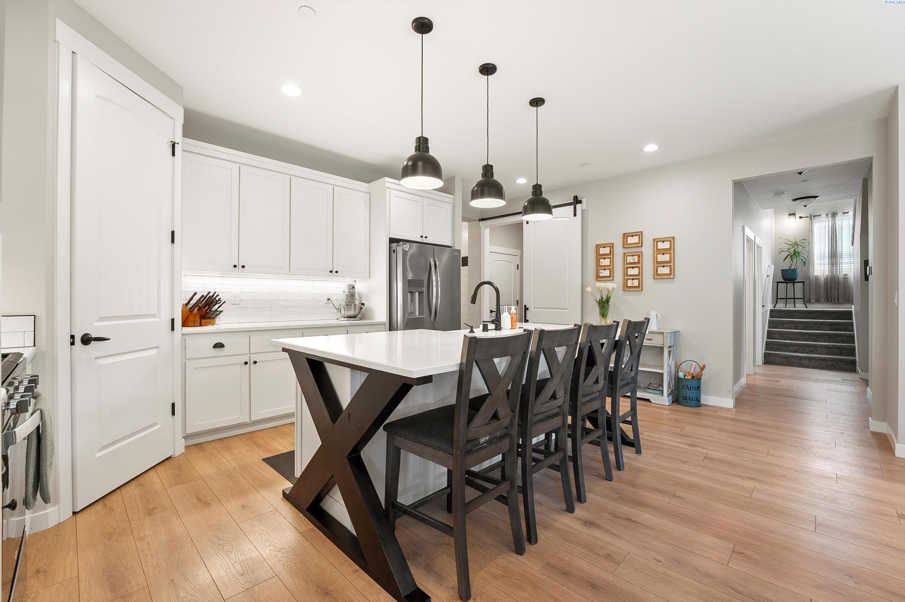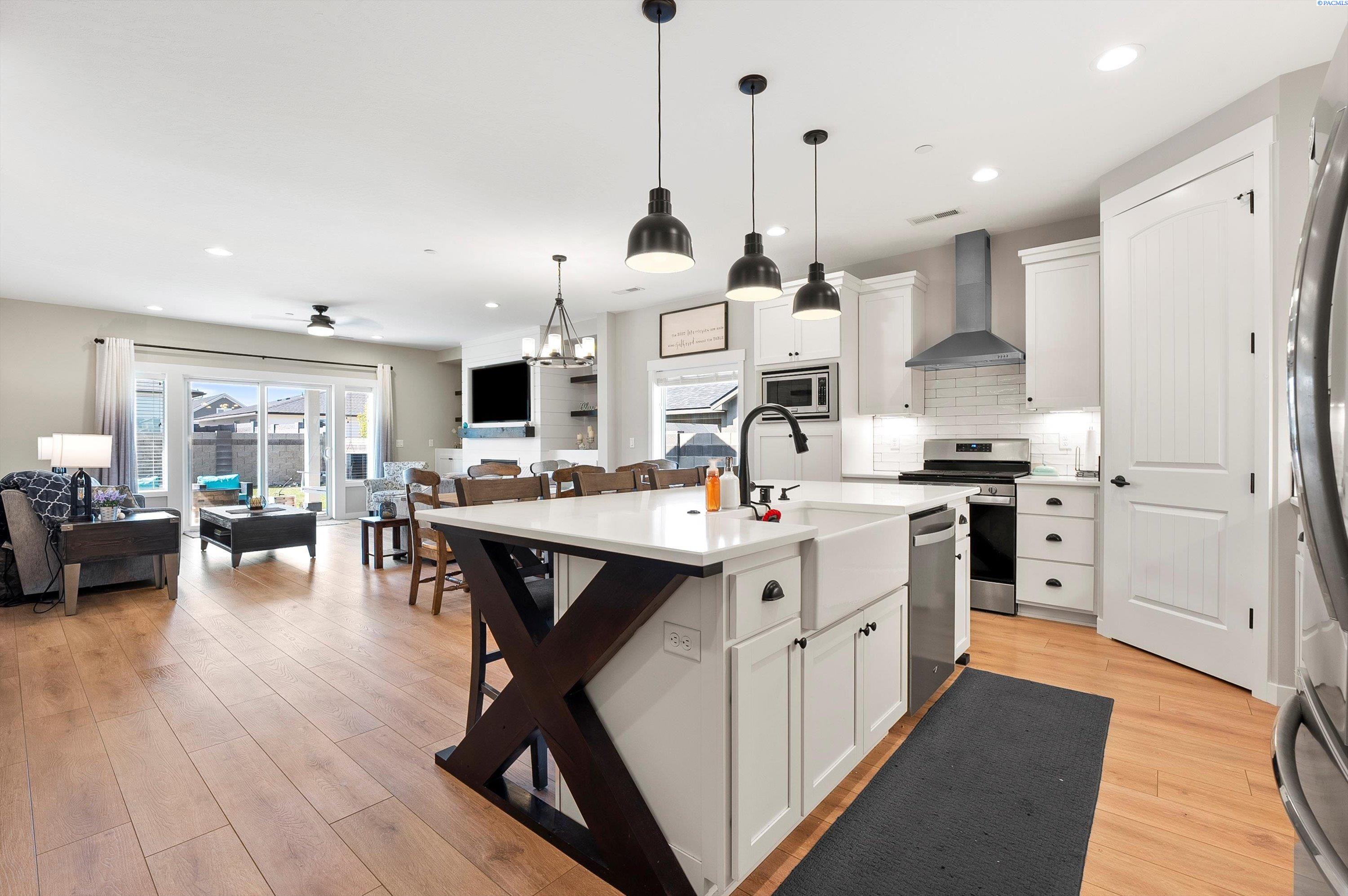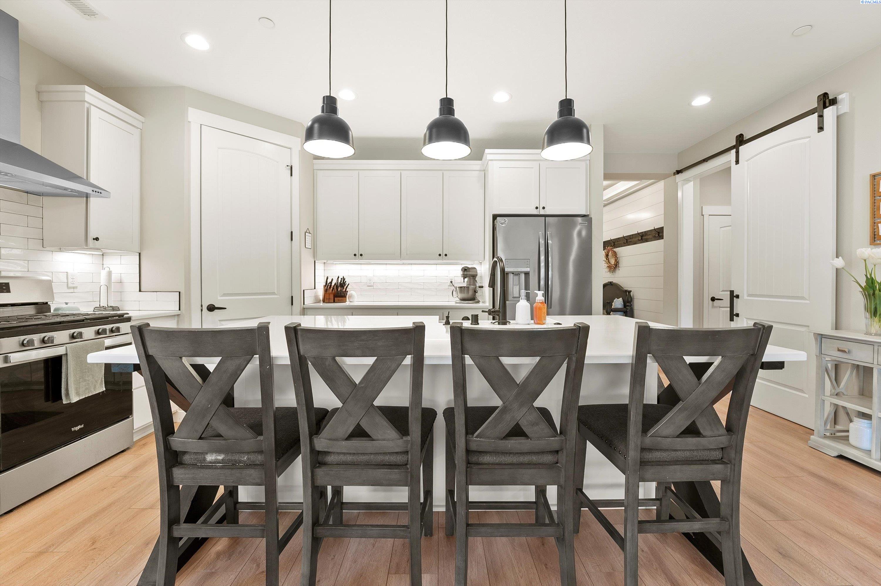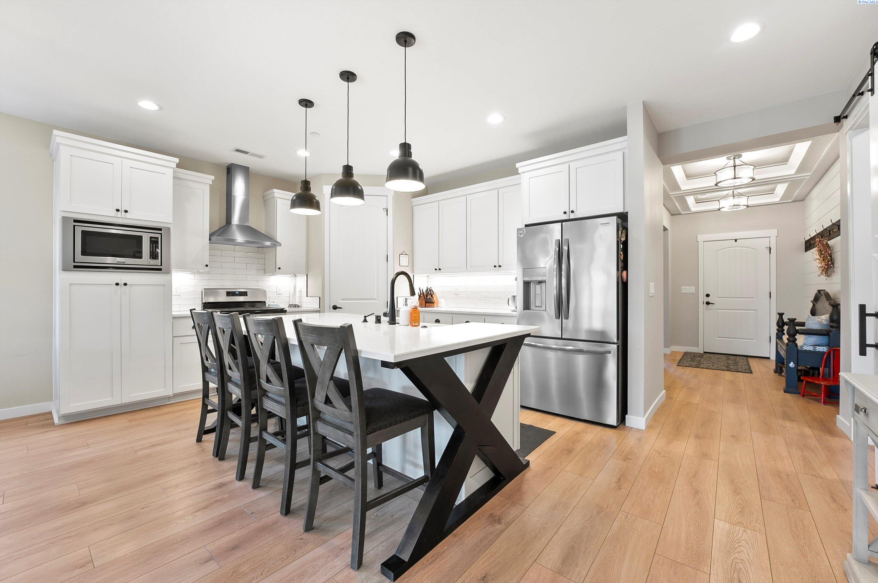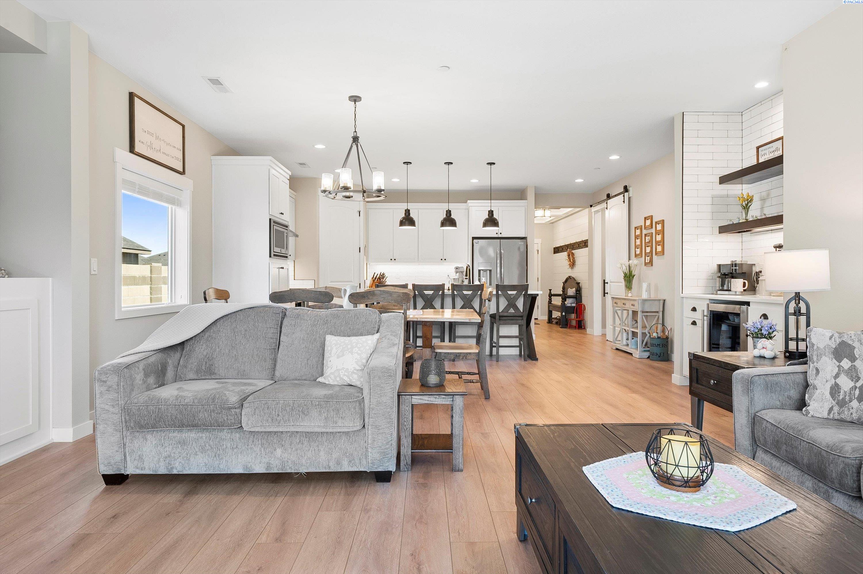 Welcome to this beautiful West Village home in highly desirable South Richland. This thoughtfully designed residence blends modern elegance with warm farmhouse charm. Featuring 4 bedrooms, 3.5 bathrooms, and a spacious upstairs bonus room, the flexible layout offers comfort and versatility, including a double primary suite ideal for multi generational living or guest accommodations. High end finishes throughout include custom kitchen island, a breakfast bar, wet bar with wine cooler, soft close cabinetry, gas appliances, and beautiful quartz countertops throughout. Luxury vinyl plank flooring, designer lighting, and a 2 car garage complete this well appointed home.
