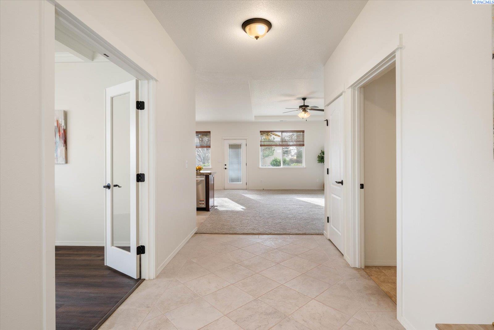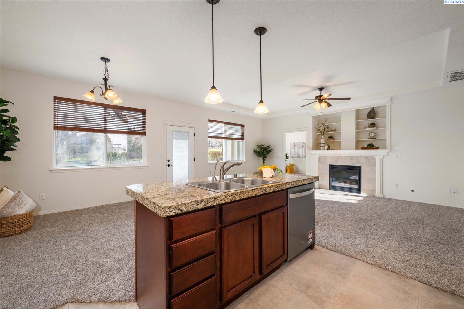 Welcome to 2601 Eaglewatch in Horn Rapids, a wonderful golfing community that includes courts to play tennis, pickleball, or basket ball! And don't forget the outdoor pool to relax in during those summer days, and that RV parking! This home has been "tuned-up", freshly painted, new carpet, tile cleaned, regrouted and sealed! Even a new dishwasher! Fireplace in great room is flanked with shelving and large lower cabinets, you can never have too much storage! This charming home has two bedrooms and multi-flex room, which can be whatever you need, you'll love the box ceiling in this room! Owner's suite is generous with private bath which offers walk-in shower and closet. One of it's attractions is also the fact that you have a neighbor on only one side, also. Partial rod-iron fencing, covered patio and mature landscape surround this home. Oh and this home is close to work, local grocery, eateries, and much more! Truly a wonderful home, to make your very own.