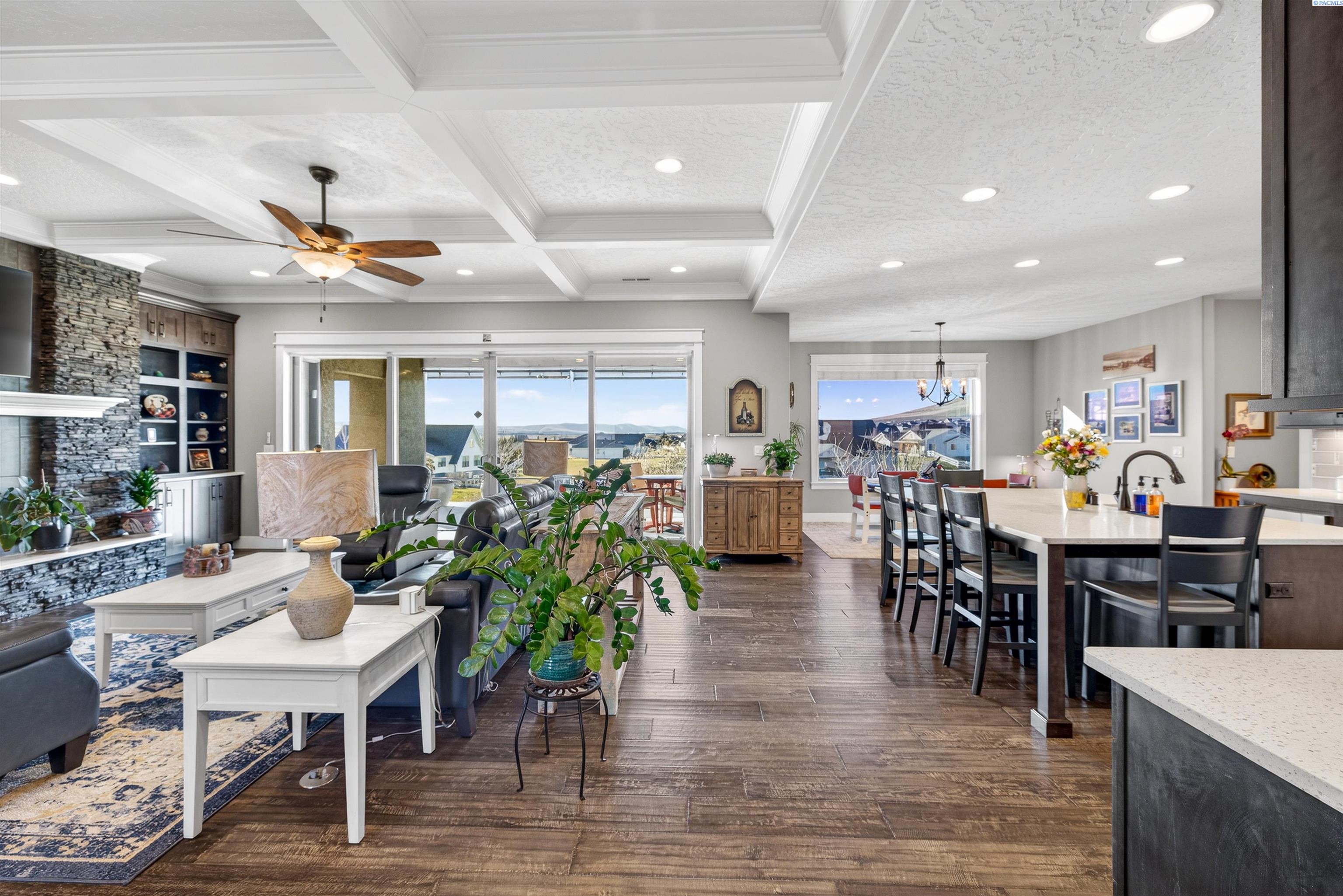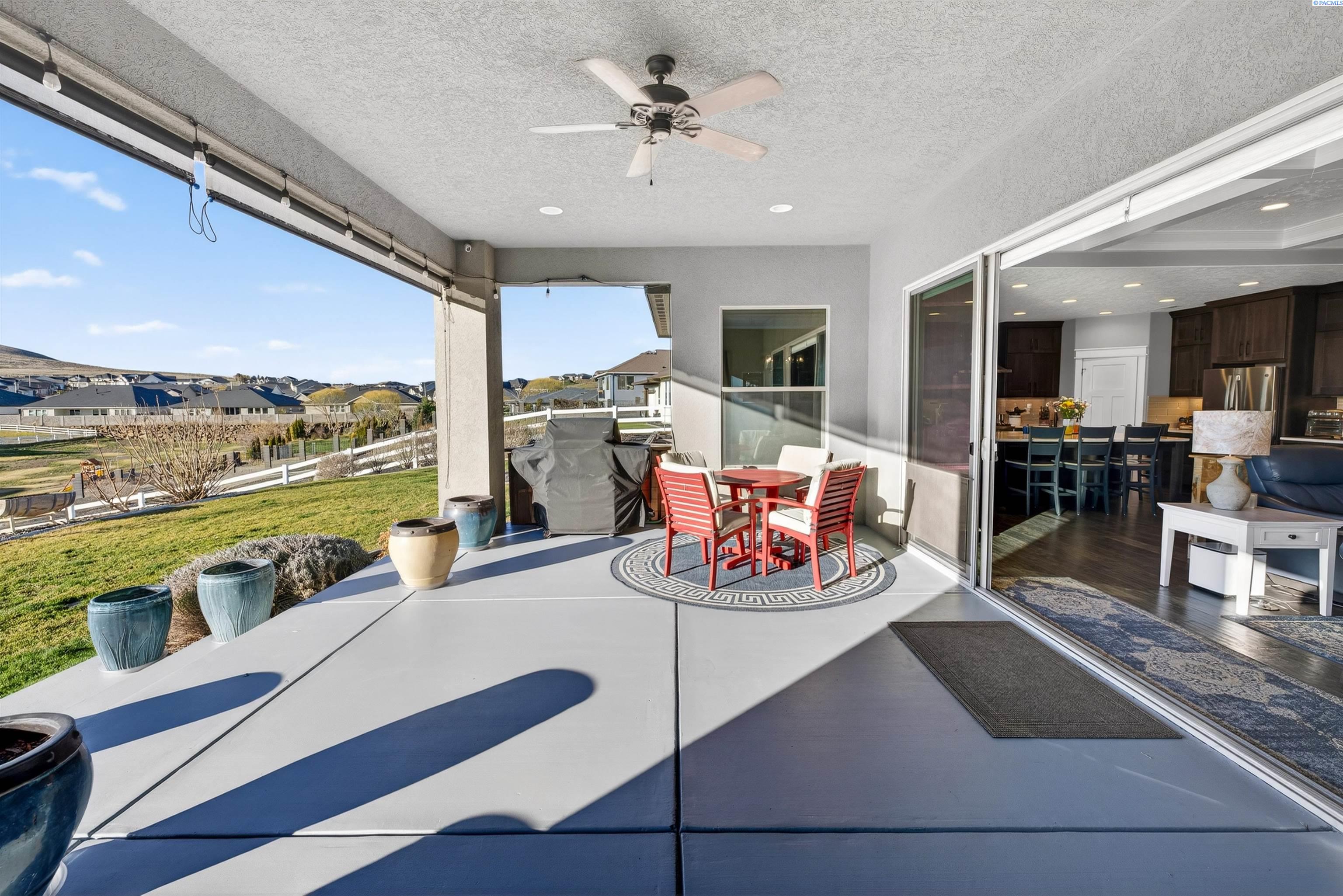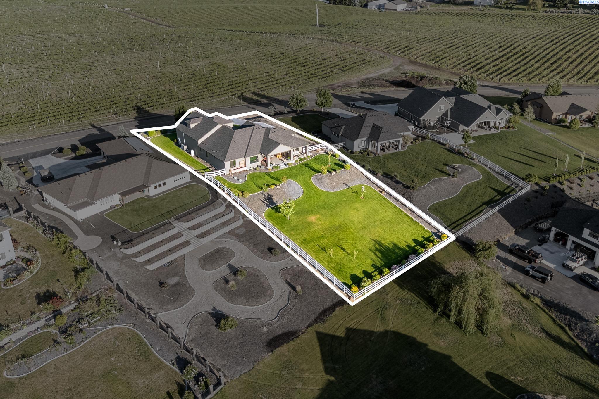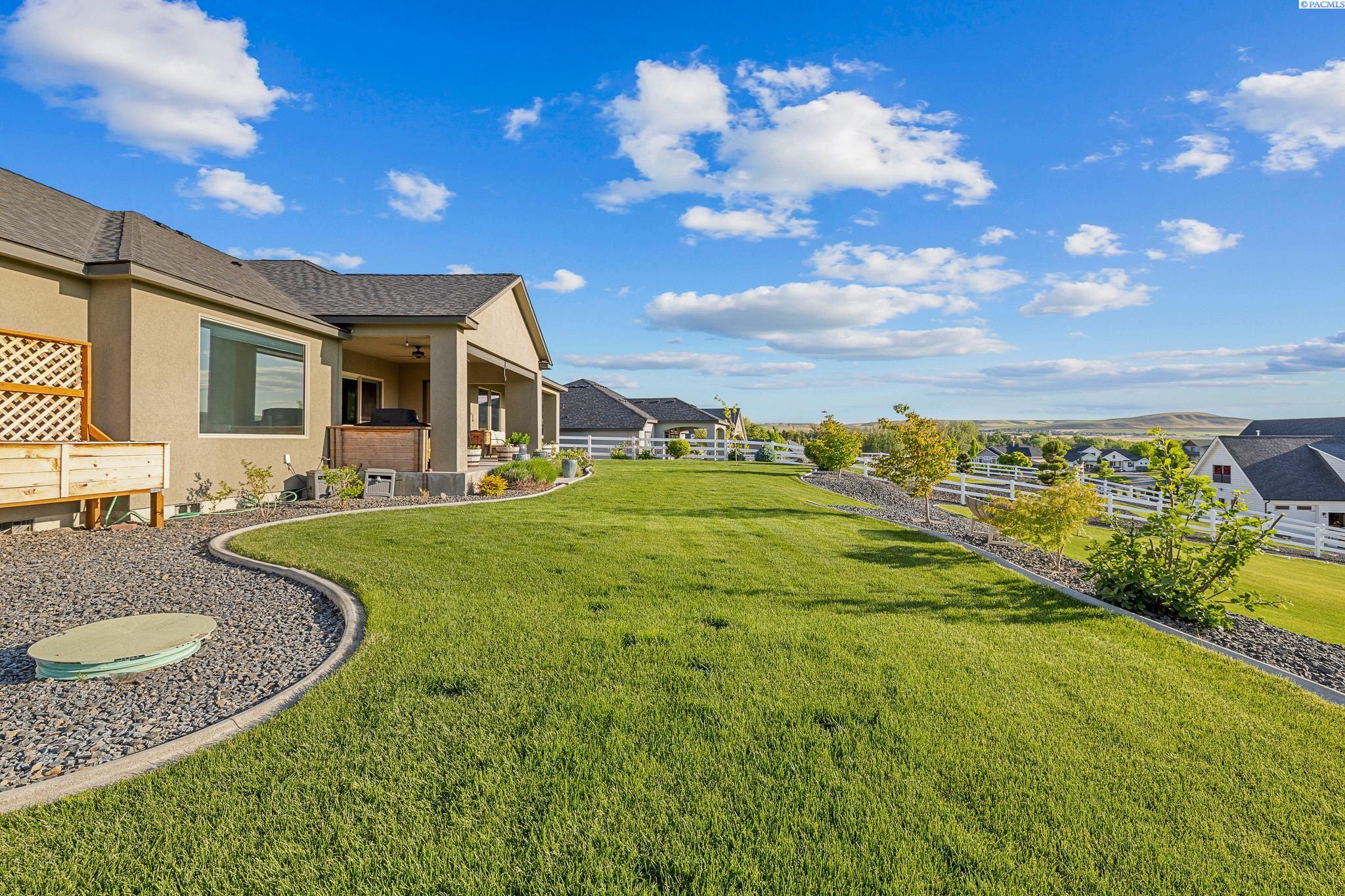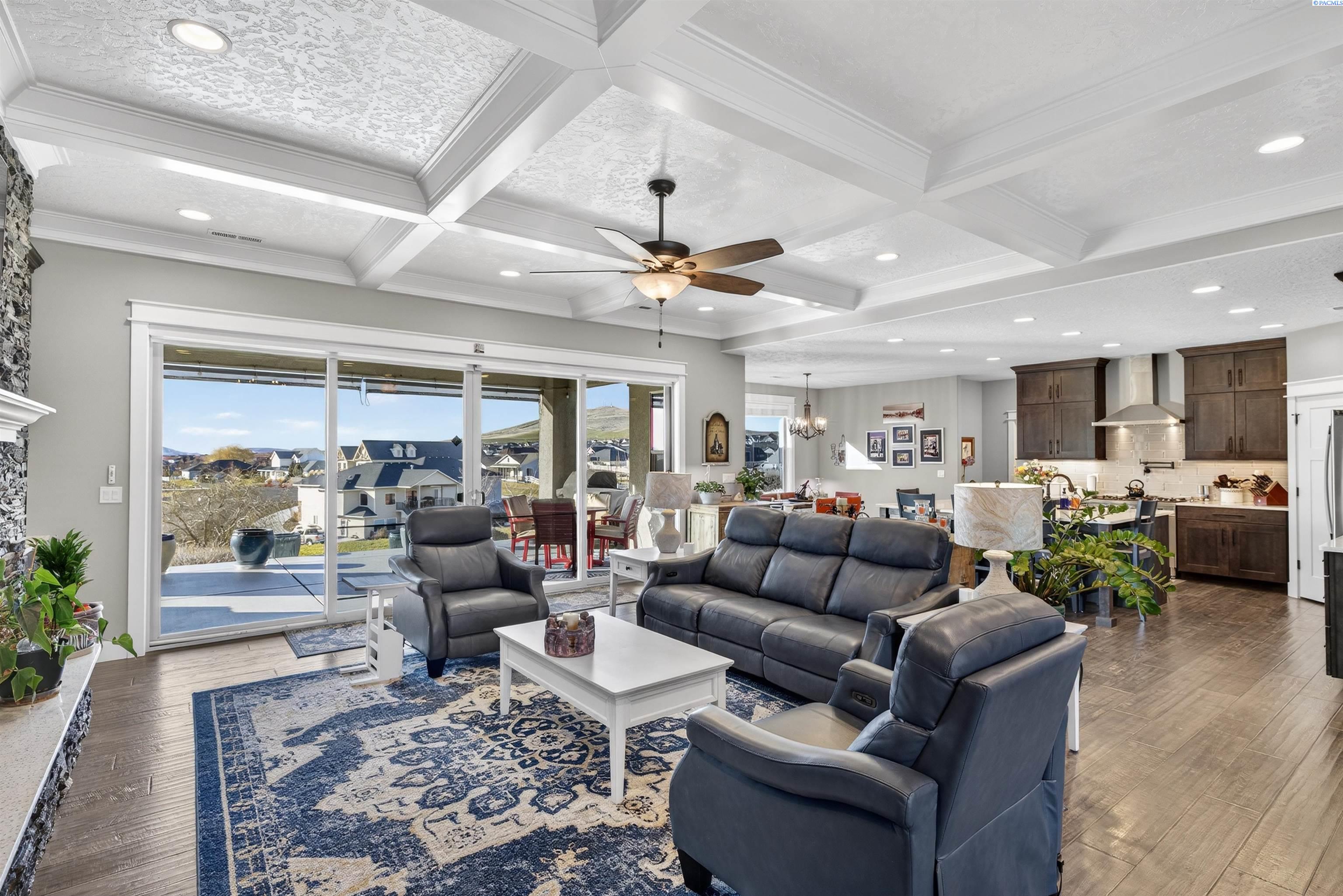 MLS#290743 | OPEN HOUSE - SATURDAY, MARCH 21 from 12-2pm! | Additional 1% Buyer Savings Available with Our Trusted Lender. Tucked away in the coveted Hidden Hills neighborhood, this custom-built 2018 home sits on a spacious .64 acre lot and boasts over 3,200 sq ft of beautifully crafted living space, including a versatile bonus retreat above the garage. The light-filled great room features soaring 12-ft coffered ceilings and an impressive floor-to-ceiling stone fireplace. Enjoy time in the thoughtfully designed kitchen, complete with a Verona dual-fuel oven and expansive island, as the sunset bathes the dining room in warm light. The primary suite offers a spa-like escape with a luxurious soaking tub, a tiled walk-in shower, and a generous closet for all your storage needs. You will enjoy stunning vineyard views from your front door, while vibrant sunset views from your back patio, creating a picturesque backdrop for your evenings. Upstairs, a private bonus suite with its own bathroom and office nook overlooks Badger Mountain Vineyard - perfect for guests, a home theater, or flexible workspace. Meticulously maintained, this home also features a 37x39 finished garage with 10-ft doors, an expansive covered back patio, and a fully fenced backyard that completes this exceptional property.