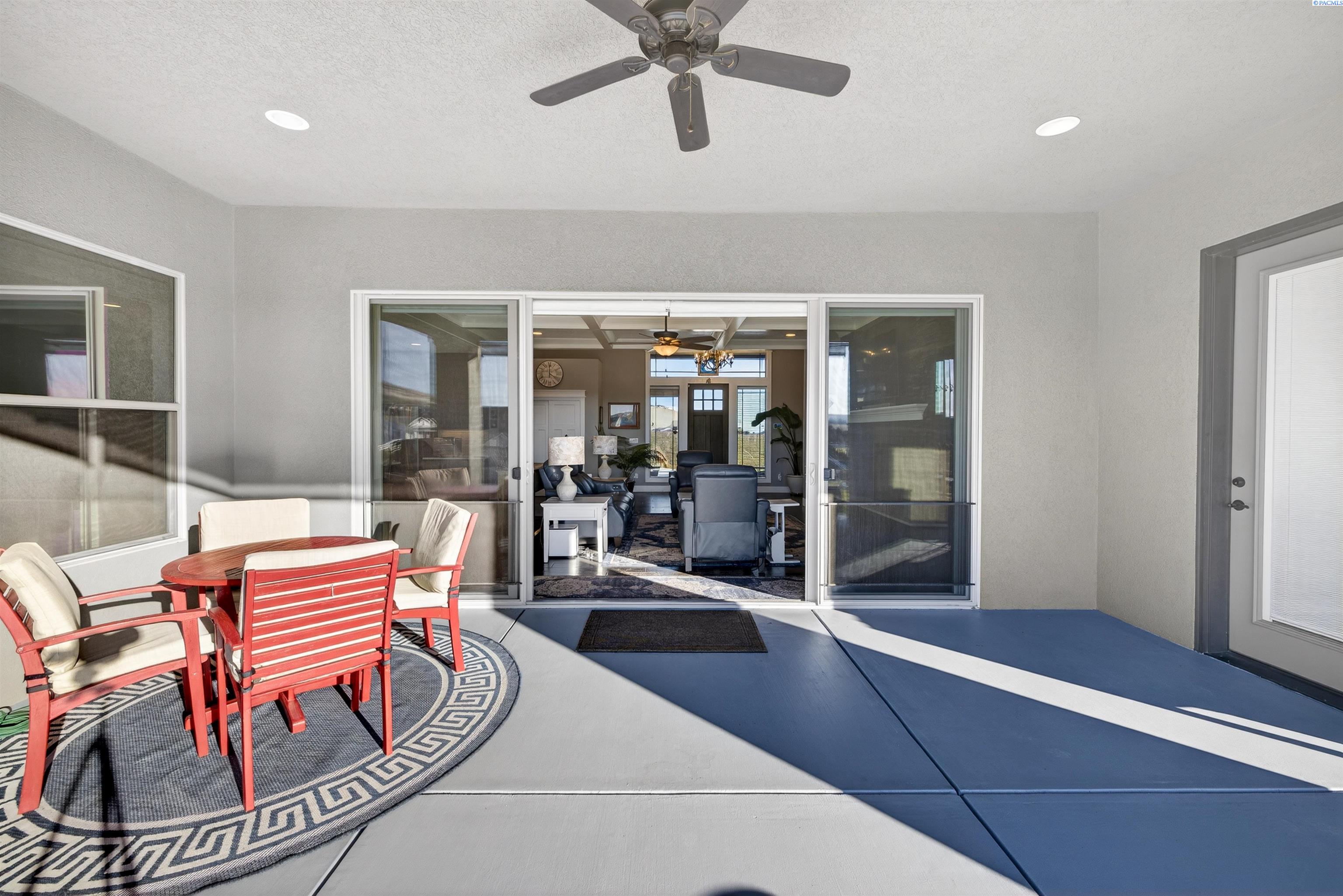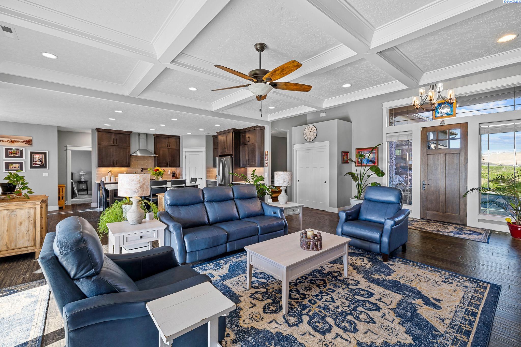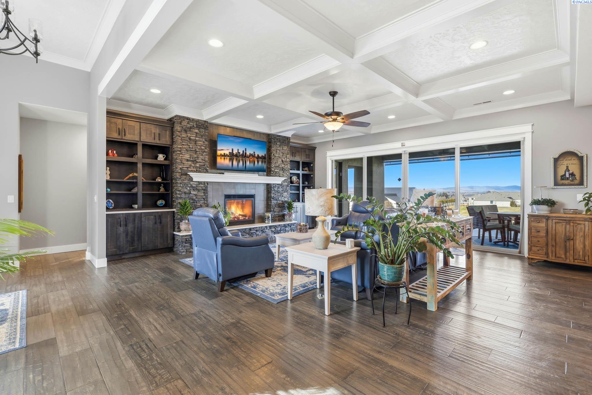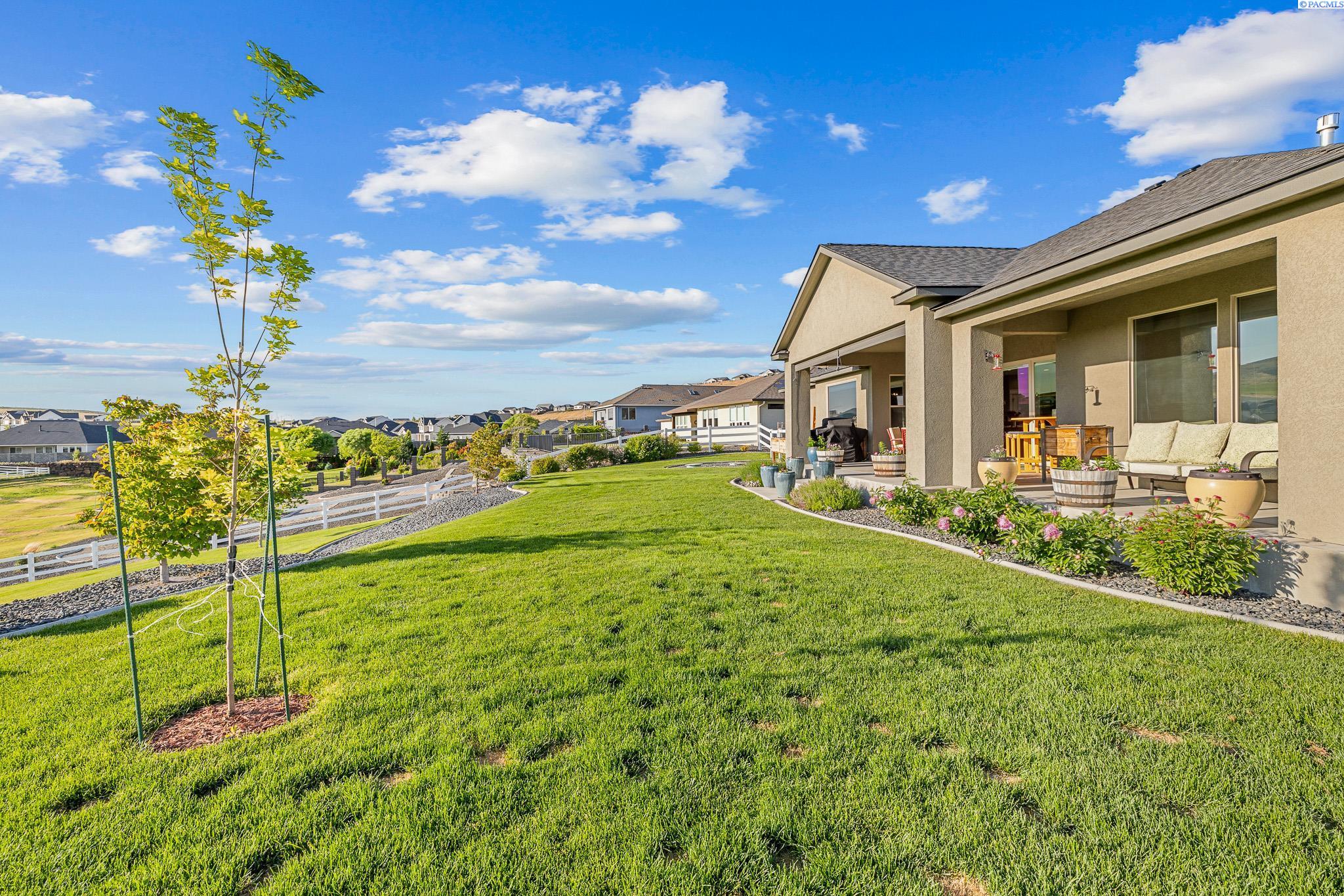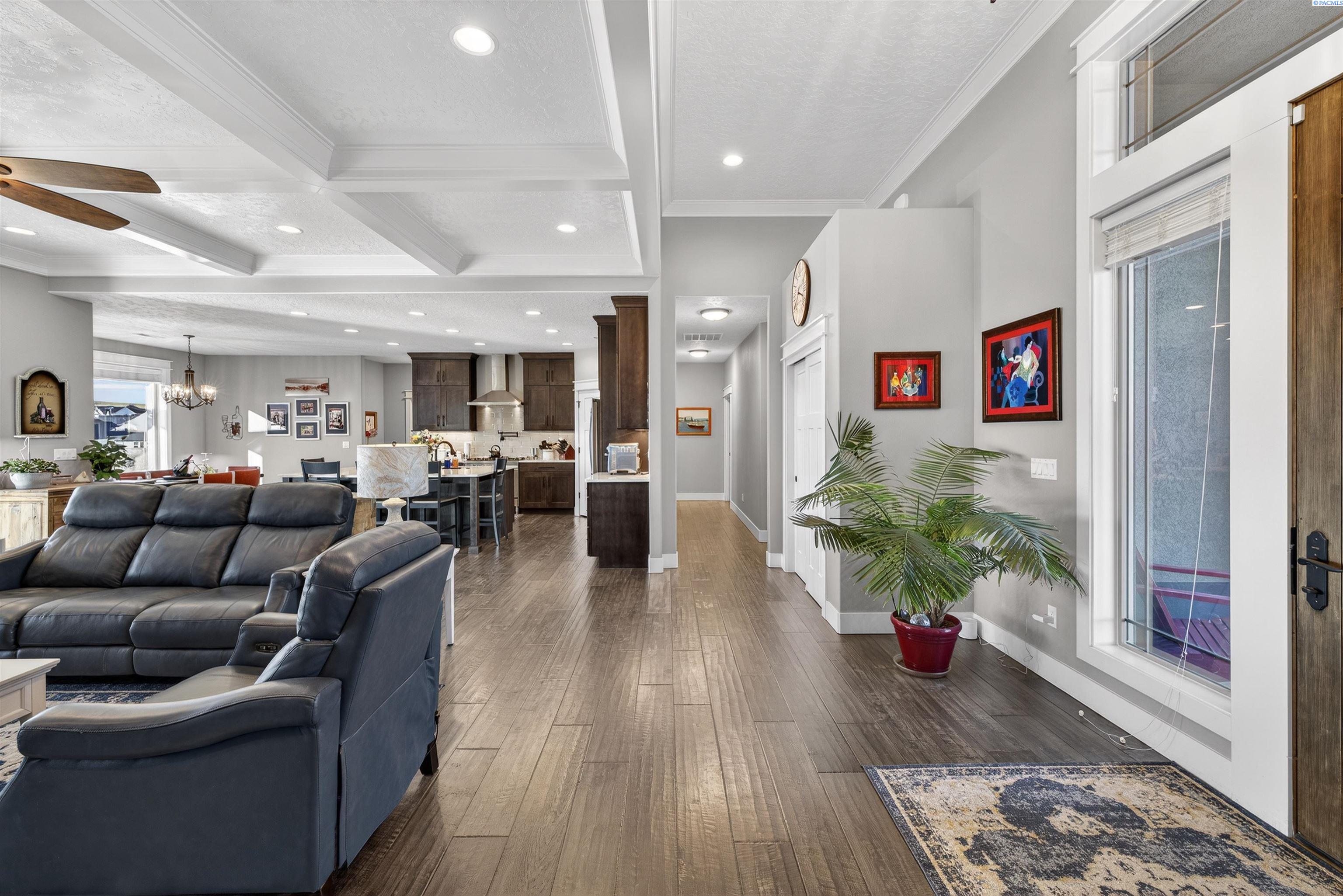MLS#290743 | OPEN HOUSE - SATURDAY, MARCH 21 from 12-2pm! | Additional 1% Buyer Savings Available with Our Trusted Lender. Tucked away in the coveted Hidden Hills neighborhood, this custom-built 2018 home sits on a spacious .64 acre lot and boasts over 3,200 sq ft of beautifully crafted living space, including a versatile bonus retreat above the garage. The light-filled great room features soaring 12-ft coffered ceilings and an impressive floor-to-ceiling stone fireplace. Enjoy time in the thoughtfully designed kitchen, complete with a Verona dual-fuel oven and expansive island, as the sunset bathes the dining room in warm light. The primary suite offers a spa-like escape with a luxurious soaking tub, a tiled walk-in shower, and a generous closet for all your storage needs. You will enjoy stunning vineyard views from your front door, while vibrant sunset views from your back patio, creating a picturesque backdrop for your evenings. Upstairs, a private bonus suite with its own bathroom and office nook overlooks Badger Mountain Vineyard - perfect for guests, a home theater, or flexible workspace. Meticulously maintained, this home also features a 37x39 finished garage with 10-ft doors, an expansive covered back patio, and a fully fenced backyard that completes this exceptional property.