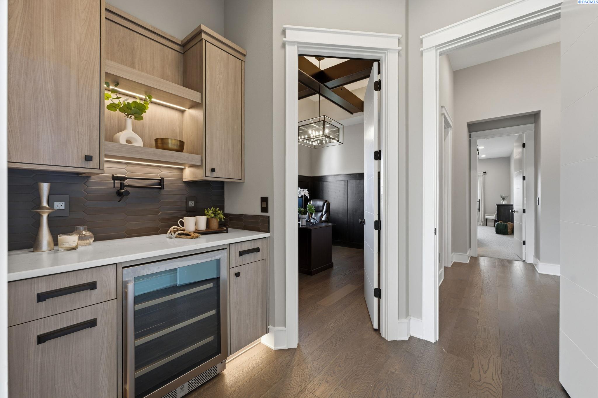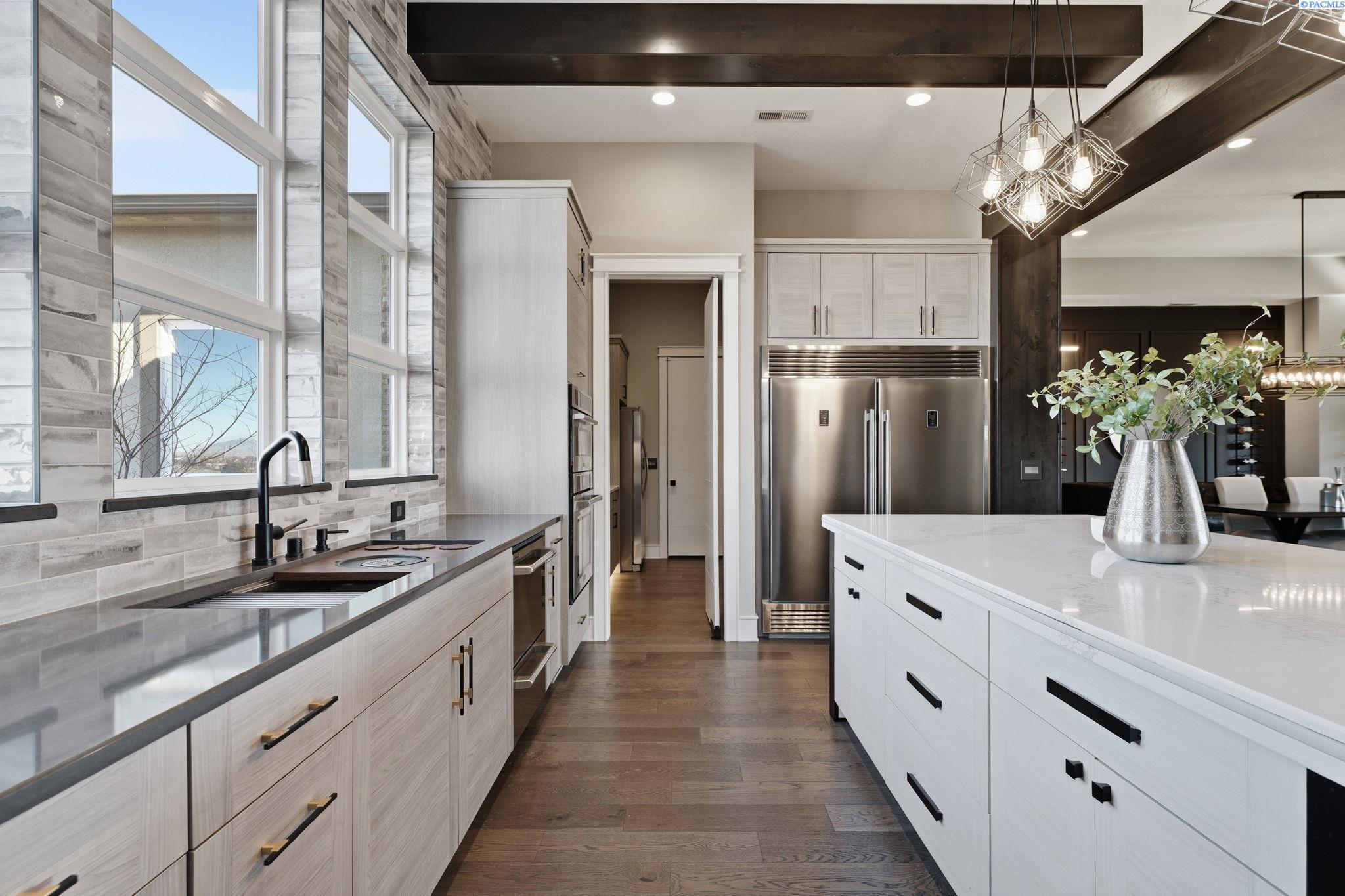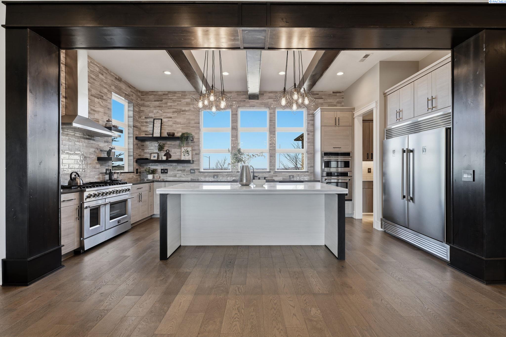 MLS# 290858 Introducing the 2023 Parade of Homes Winner, a stunning custom masterpiece showcasing award-winning design and impeccable attention to detail. This 4-bed, 3-bath rambler offers breathtaking panoramic views rarely found in the Tri-Cities, all just minutes from top wineries. The moment you enter, custom wood detailing, masterful millwork, and ambient lighting set the stage for a home defined by refined luxury. Subtle toe-kick lighting highlights the cabinetry, while integrated surround sound provides an immersive experience. At the heart of the home, the great room features a floor-to-ceiling dual-sided fireplace wrapped in tile and wood beams, complemented by a custom built-in entertainment wall. Oversized sliding doors frame sweeping views and open to the covered patio, seamlessly blending indoor and outdoor living. The gourmet chefâs kitchen is designed to impress. A Forno professional gas range is paired with professional-grade appliances, a Ruvati designer sink with elevated fixtures, and custom cabinetry. The oversized LED-lit island serves as the gathering place, while the butlerâs pantry, complete with a second refrigerator, ensures effortless hosting. A formal dining room provides the perfect setting for intimate dinners or grand gatherings, featuring a custom bar, built-in wine racks, ambient lighting, and pot filler, all seamlessly connecting to the kitchen and great room. Between the primary and guest suites, the office features rich wood-paneled wainscoting, a box beam ceiling, a custom bookcase, and stunning views. The luxury primary suite is a private sanctuary with a custom coffered ceiling and a coffee and beverage bar with pot filler. The expansive walk-in closet includes integrated laundry for convenience, while the homeâs dedicated laundry room adds functionality. The spa-inspired bath boasts heated floors, a soaking tub, bidet, dual sinks, and a dedicated vanity with backlit mirror. On the opposite side of the home, youâll find the secondary bedrooms and a full bathroom. Outside, the expansive covered patio features a tongue-and-groove ceiling with ample lighting and a fully equipped outdoor kitchen with built-in traditional and flat-top grills, bar seating, and TV hookup. A gas fire pit invites evening gatherings, while the professionally landscaped grounds showcase a tranquil koi pond water feature with koi fish. This home defines luxury living, framed by unparalleled vistas.