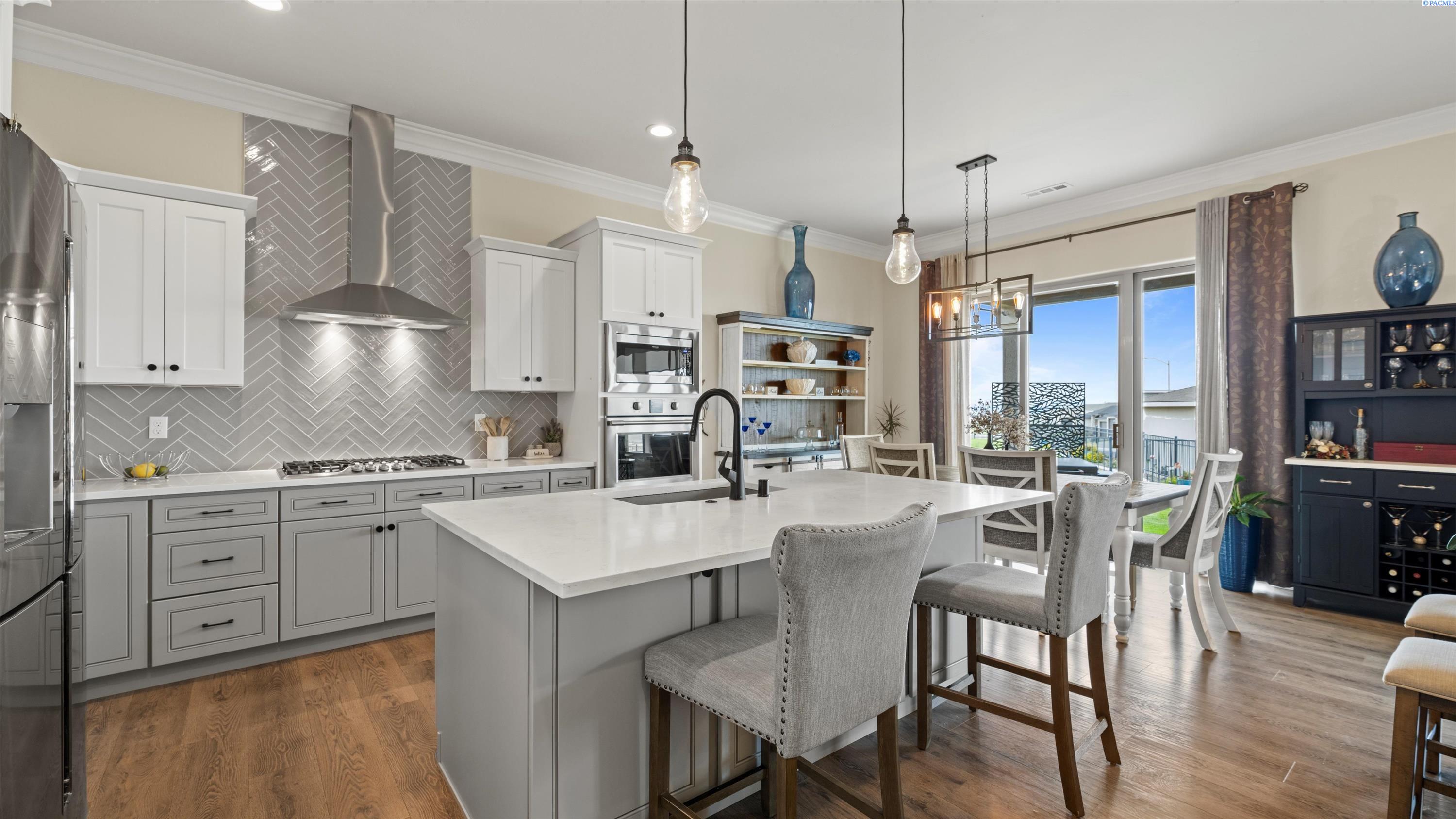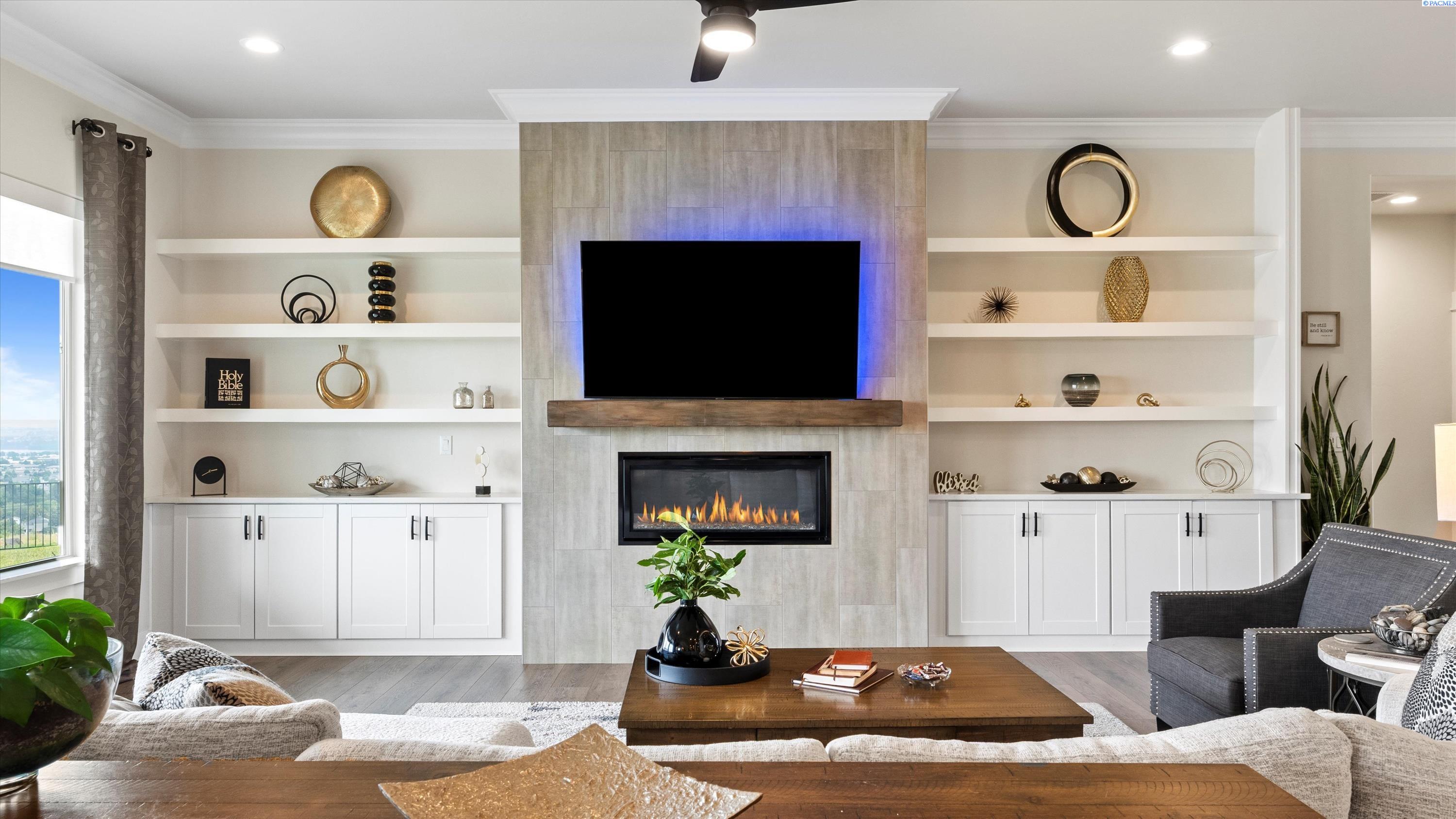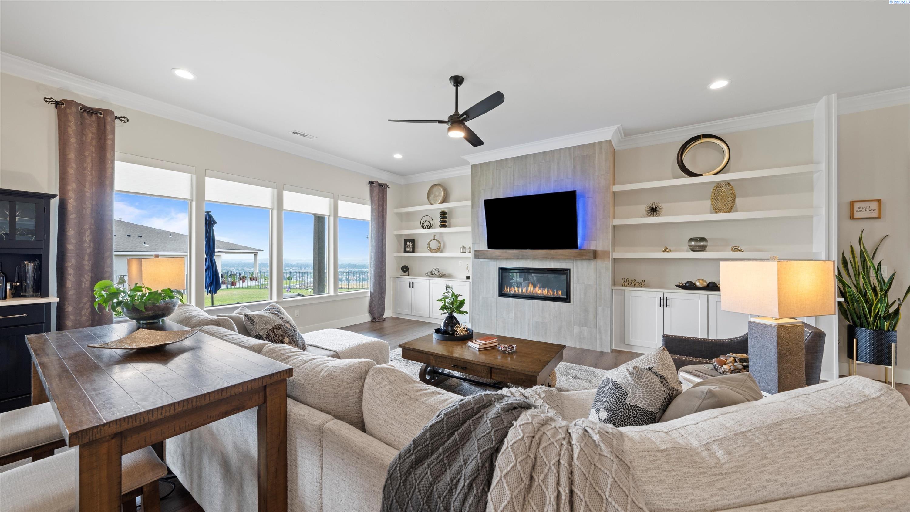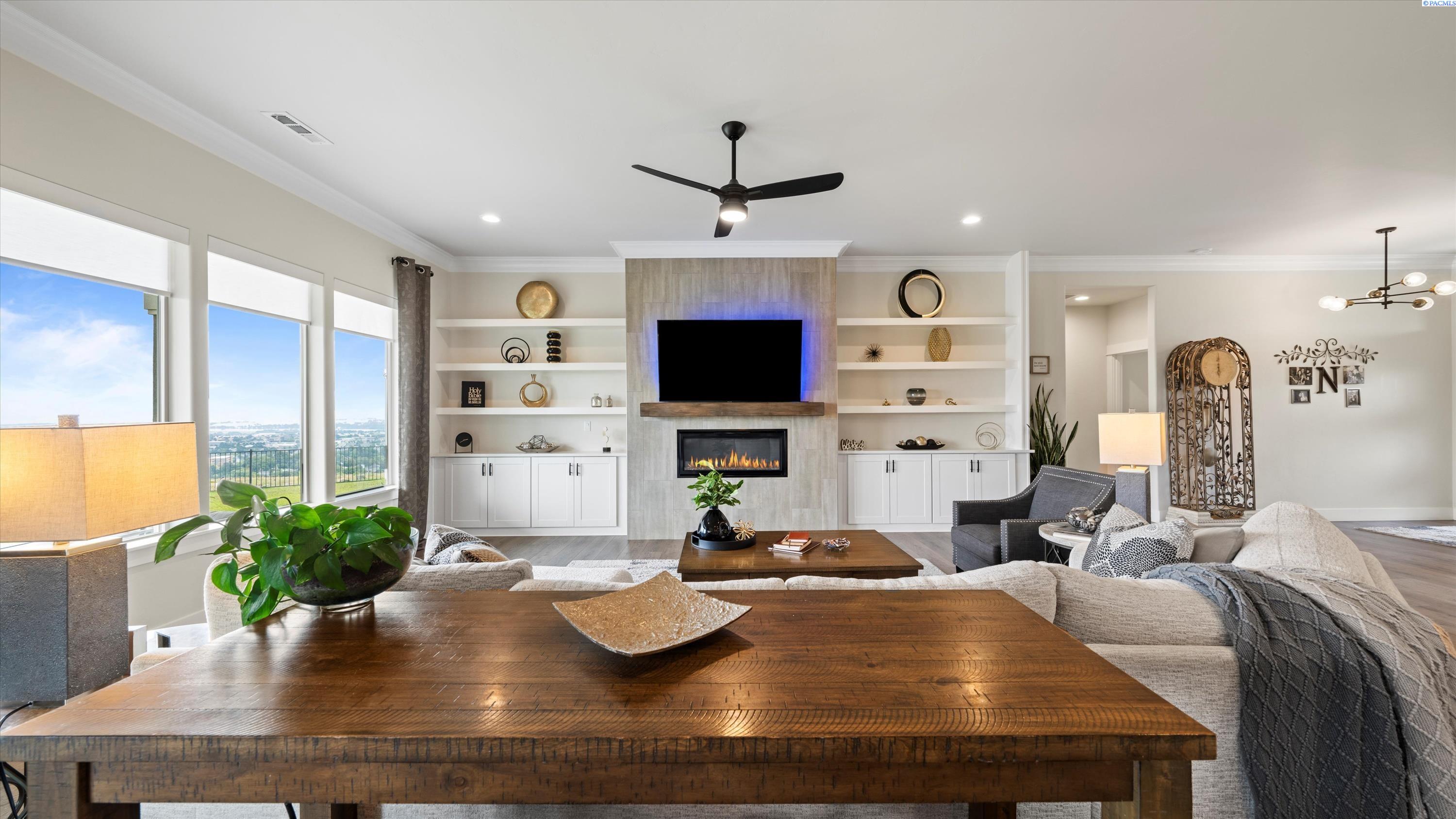 MLS#290887 Welcome to 2284 S Alaska St in Kennewick, a beautiful Southcliffe home designed with the views in mind! You'll be impressed by the raised ceilings, crown molding, and oversized windows that flood the interior with natural light. The open-concept layout connects the living, dining, and kitchen spaces, highlighted by a striking floor-to-ceiling linear fireplace with custom built-ins. The kitchen is both stylish and functional, offering a gas cooktop with vent hood, wall oven, large island, full tile backsplash, quartz counters, and soft-close cabinetry throughout. A thoughtful split-bedroom design ensures privacy for the primary suite, which showcases modern rope lighting, a spa-like bath with a soaking tub, fully tiled walk-in shower, private toilet room, and a huge walk-in closet. With three bedrooms- one of which is a Jr. Suite with its own attached bathroom- plus an office and an additional full hall bath, the home easily accommodates family and guests. Practical touches include a spacious laundry room with cabinetry and utility sink, as well as a 4-car fully finished garage with overhead racks and New Age storage cabinets with work tops for abundant storage. Step outside to enjoy breathtaking CITY LIGHTS VIEWS from the covered patio and fenced backyardâlow-maintenance yet perfect for kids or pets. And the nicest neighbors to share it with. Complete with geothermal heating and cooling for energy efficiency, this home blends modern elegance with cost-effective living!