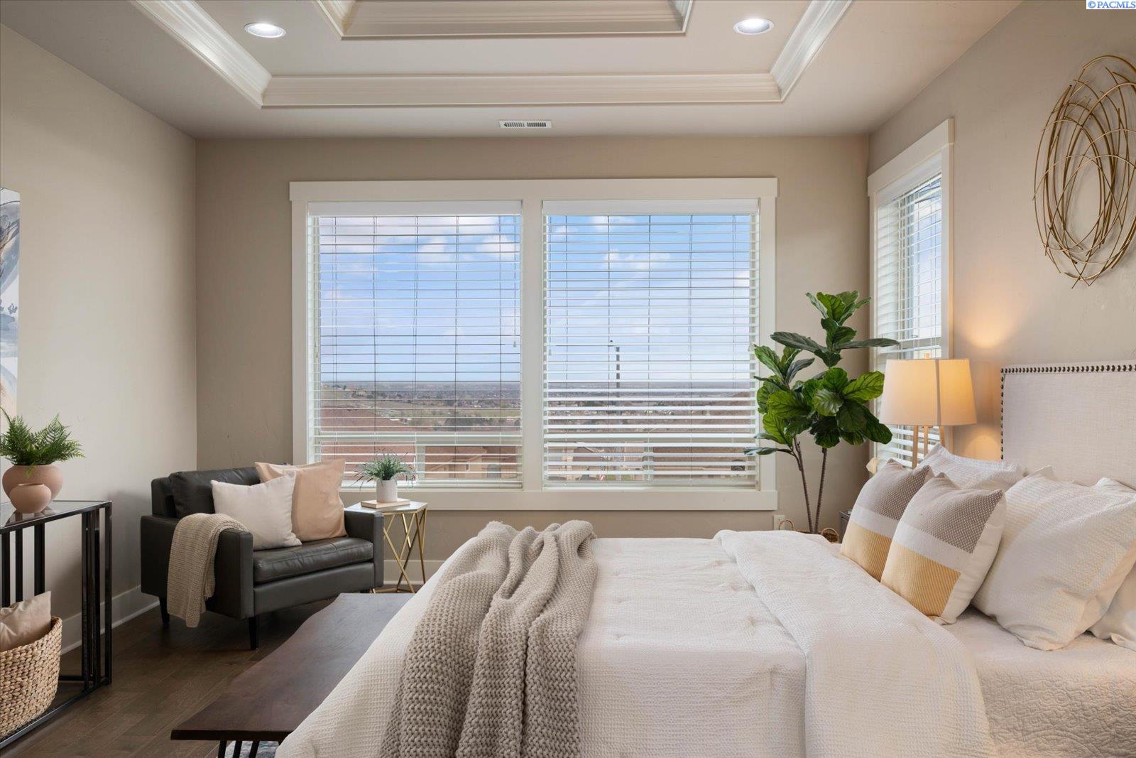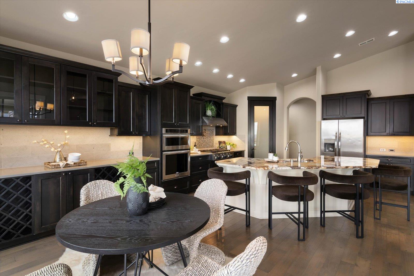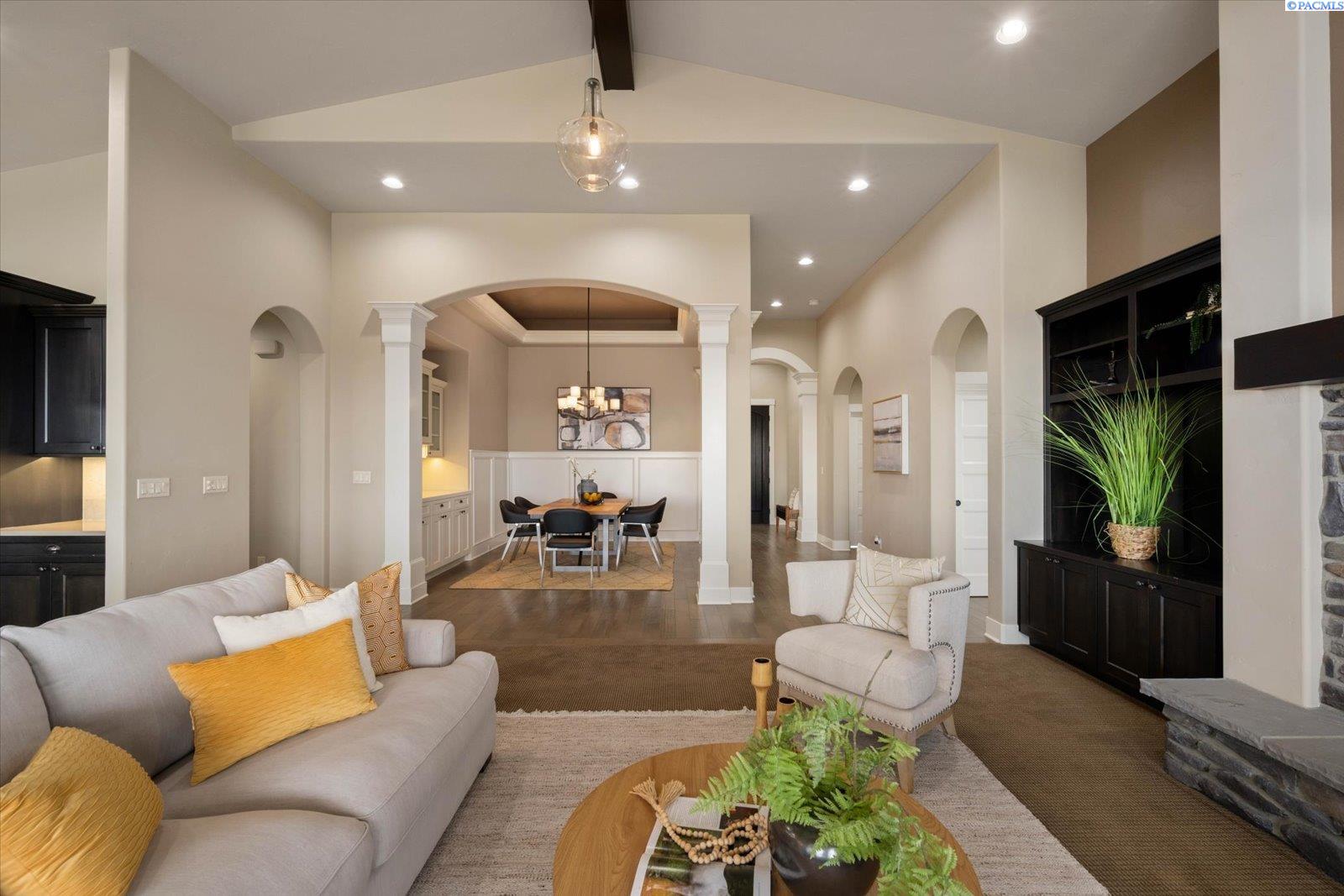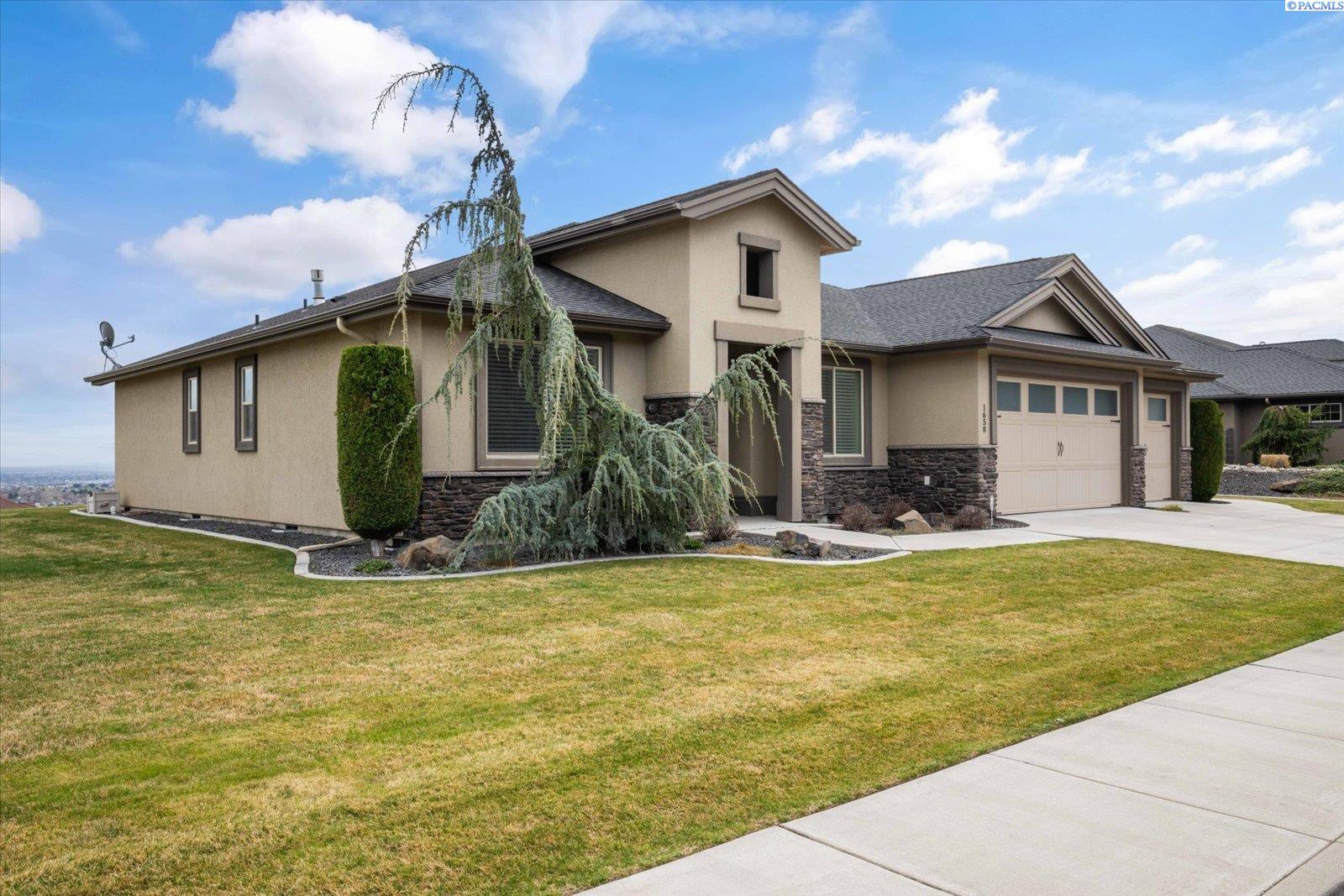 Set in South Richlandâs highly sought-after Italy streets, this stunning home was designed to capture panoramic river and city views from the moment you walk in. Step inside and youâre welcomed by soaring vaulted ceilings, engineered hardwood flooring, wood-wrapped windows, and a warm, neutral palette that perfectly frames the views beyond, while the dining area makes a beautiful first impression with its coved, lit ceiling and built-in buffet, creating an inviting space for gatherings. From there, the home opens into a breathtaking great room featuring wood beams, custom built-ins, and a floor-to-ceiling stone fireplace, all designed to take in the sunsets and evening city lights. The kitchen flows seamlessly off the main living area and truly is the heart of the home, anchored by a massive granite slab island with abundant seating, stainless KitchenAid appliances, a six-burner range with vent hood, pot filler, mosaic tile backsplash, and a frosted glass walk-in pantry, plus a built-in wine station with chiller for effortless entertaining. Privately tucked away, the primary suite offers a quiet retreat with a tray ceiling and stunning river views, where you can imagine waking up to sunrises each morning, while the ensuite features a soaking tub, dual-head glass tile shower, and expansive counter space. The split-bedroom design continues with two additional bedrooms, including a front bedroom with its own private ensuite ideal for guests, along with a dedicated office and a total of three bathrooms. Step outside to a generously sized lot with a large, flat grassy side yard and a covered patio, perfect for relaxing or entertaining on a quiet street. Additional features include a tankless water heater and wired security system. Thoughtfully designed, beautifully maintained, and truly move-in ready with unforgettable views.