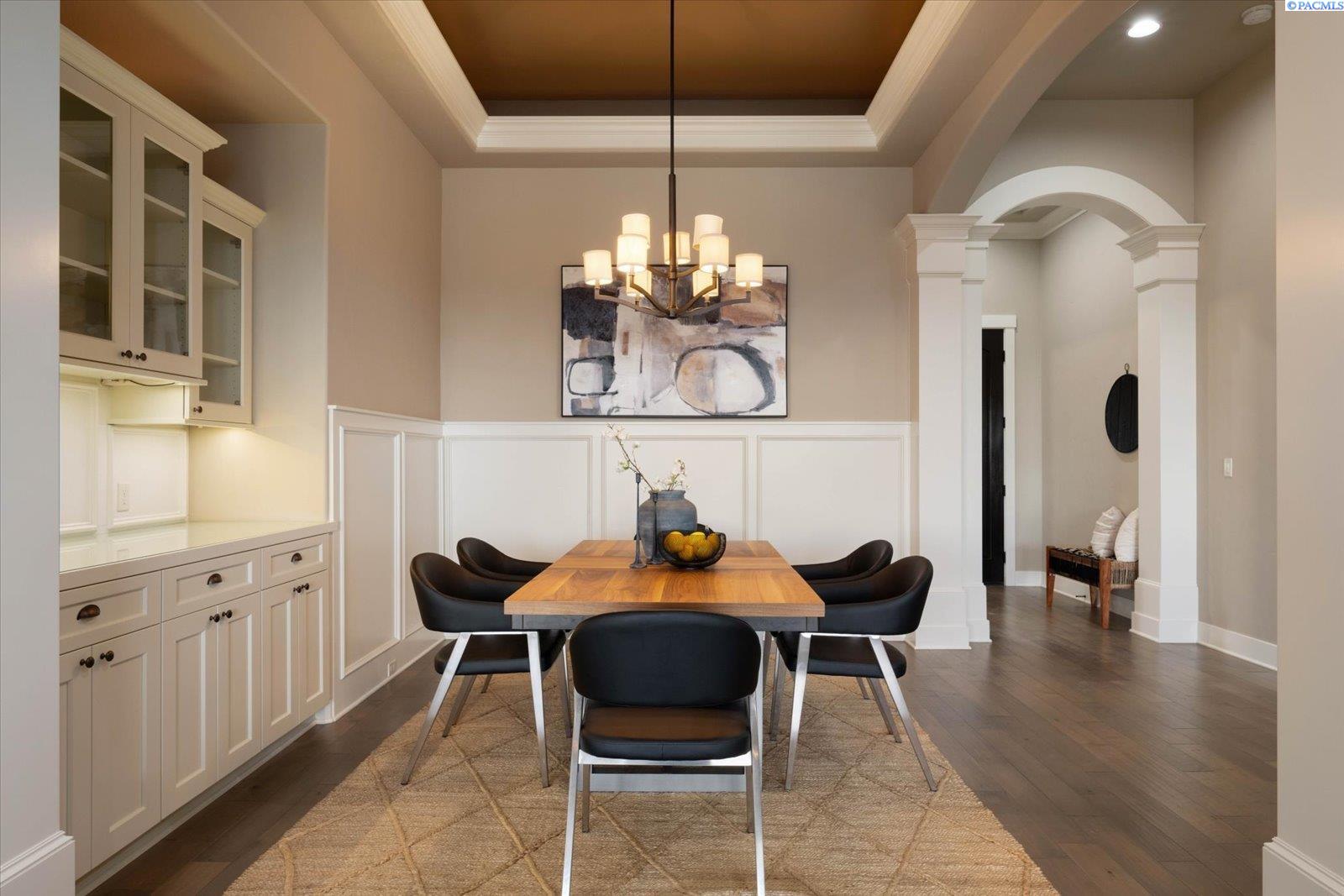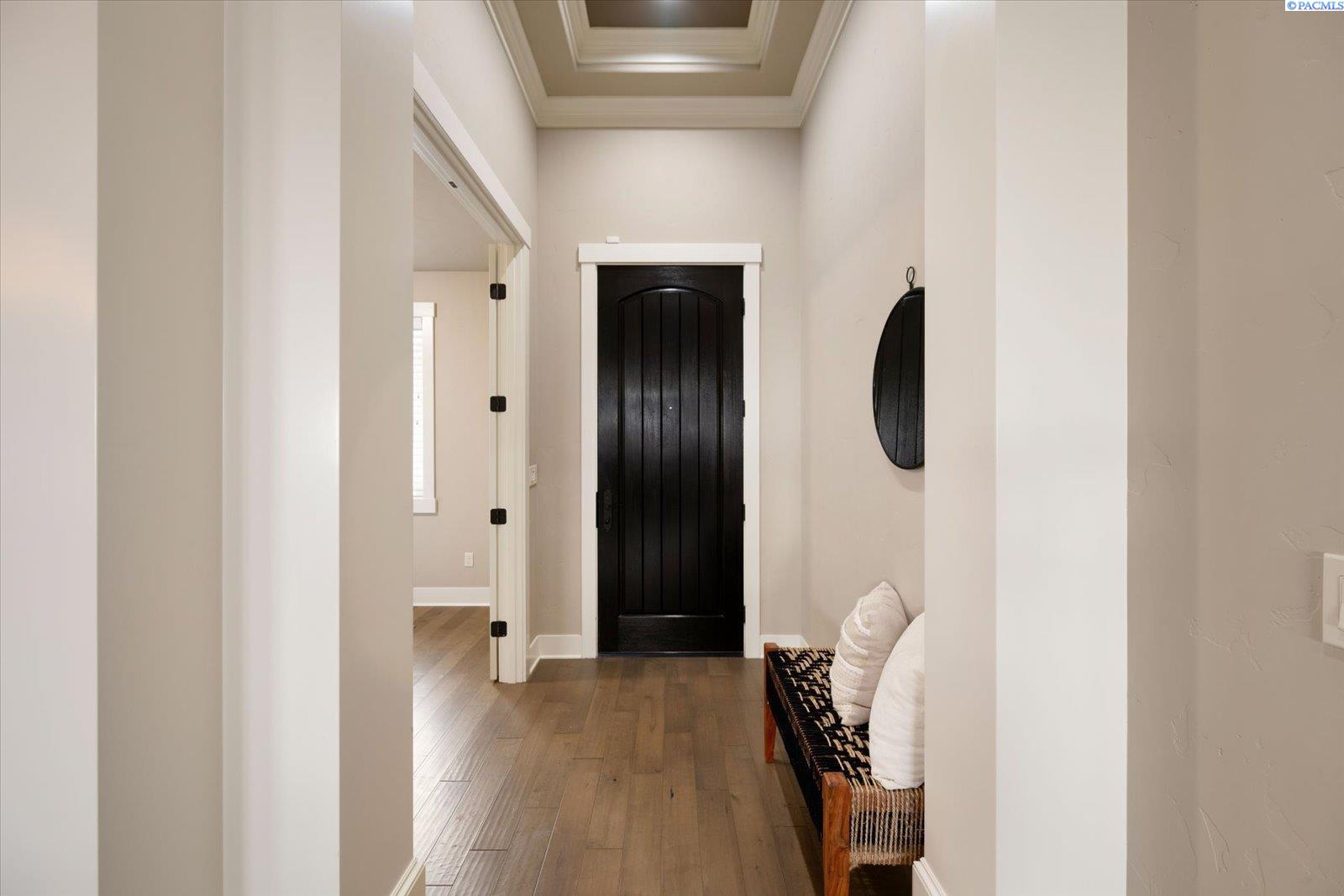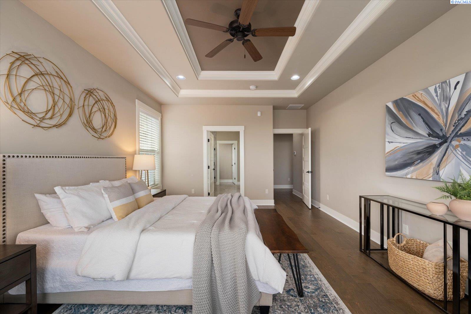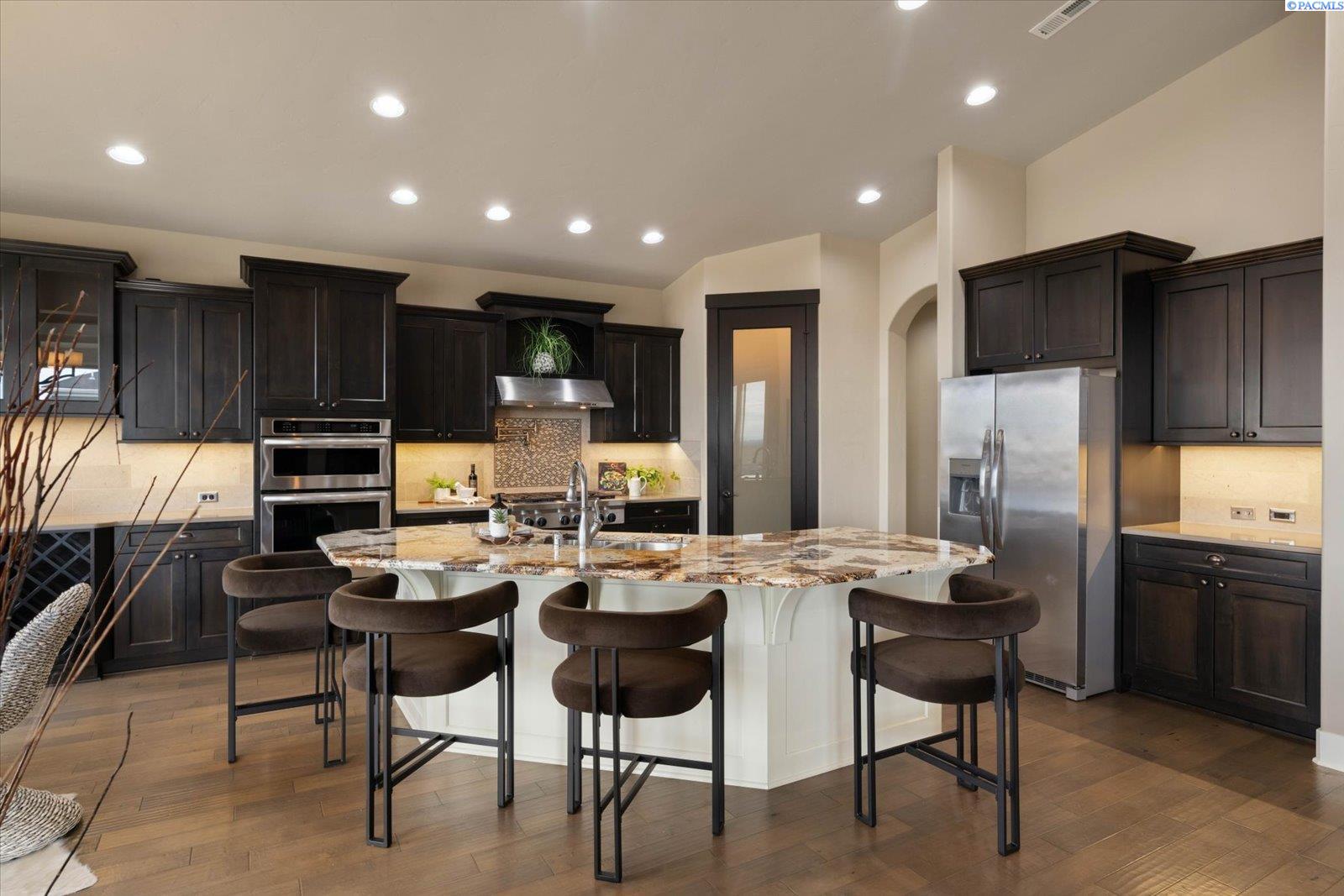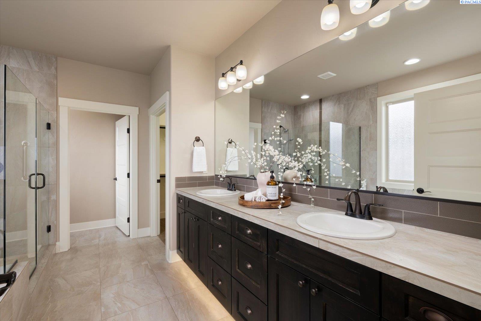 Set in South Richlandâs highly sought-after Italy streets, this stunning home was designed to capture panoramic river and city views from the moment you walk in. Step inside and youâre welcomed by soaring vaulted ceilings, engineered hardwood flooring, wood-wrapped windows, and a warm, neutral palette that perfectly frames the views beyond, while the dining area makes a beautiful first impression with its coved, lit ceiling and built-in buffet, creating an inviting space for gatherings. From there, the home opens into a breathtaking great room featuring wood beams, custom built-ins, and a floor-to-ceiling stone fireplace, all designed to take in the sunsets and evening city lights. The kitchen flows seamlessly off the main living area and truly is the heart of the home, anchored by a massive granite slab island with abundant seating, stainless KitchenAid appliances, a six-burner range with vent hood, pot filler, mosaic tile backsplash, and a frosted glass walk-in pantry, plus a built-in wine station with chiller for effortless entertaining. Privately tucked away, the primary suite offers a quiet retreat with a tray ceiling and stunning river views, where you can imagine waking up to sunrises each morning, while the ensuite features a soaking tub, dual-head glass tile shower, and expansive counter space. The split-bedroom design continues with two additional bedrooms, including a front bedroom with its own private ensuite ideal for guests, along with a dedicated office and a total of three bathrooms. Step outside to a generously sized lot with a large, flat grassy side yard and a covered patio, perfect for relaxing or entertaining on a quiet street. Additional features include a tankless water heater and wired security system. Thoughtfully designed, beautifully maintained, and truly move-in ready with unforgettable views.