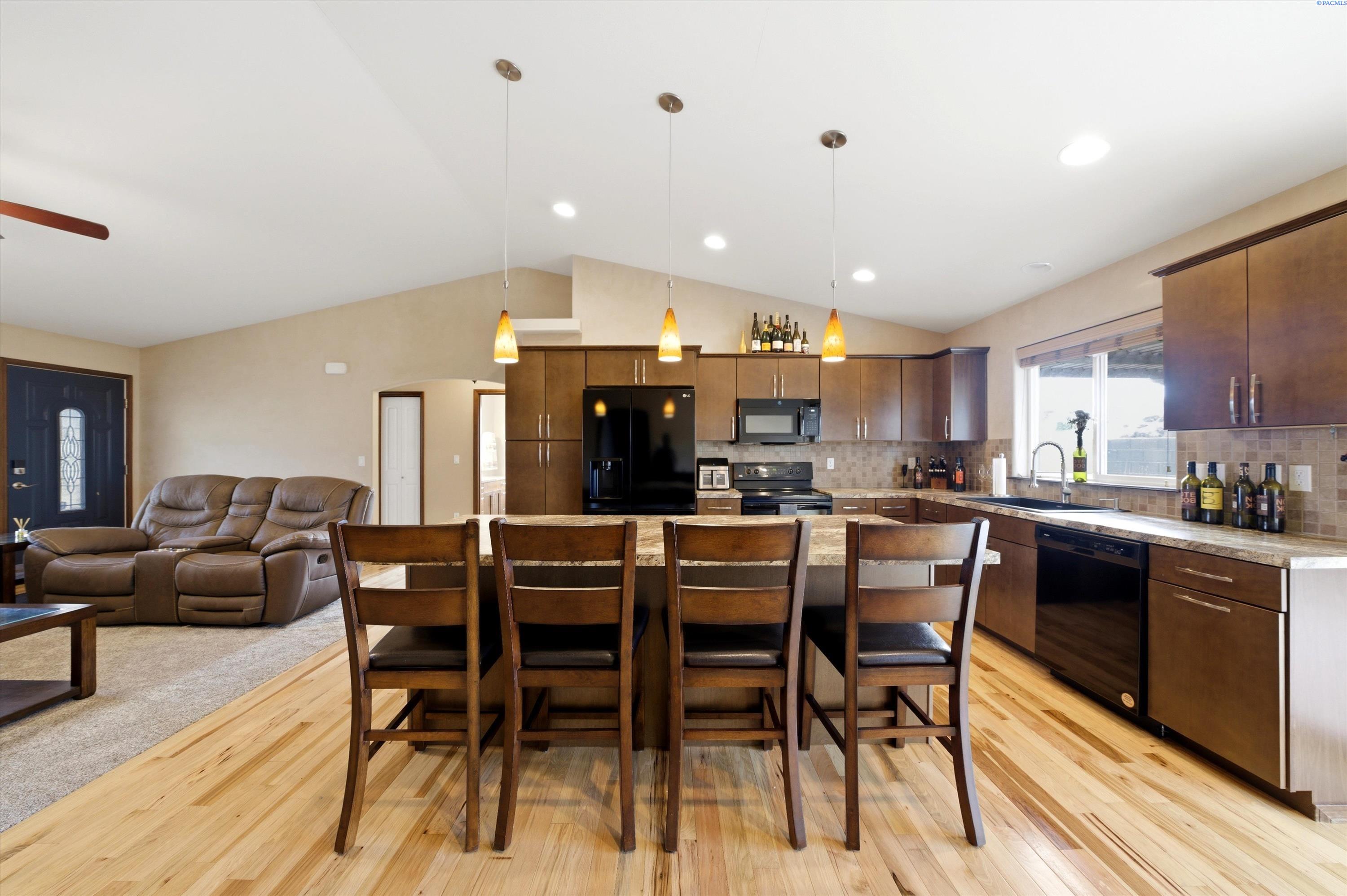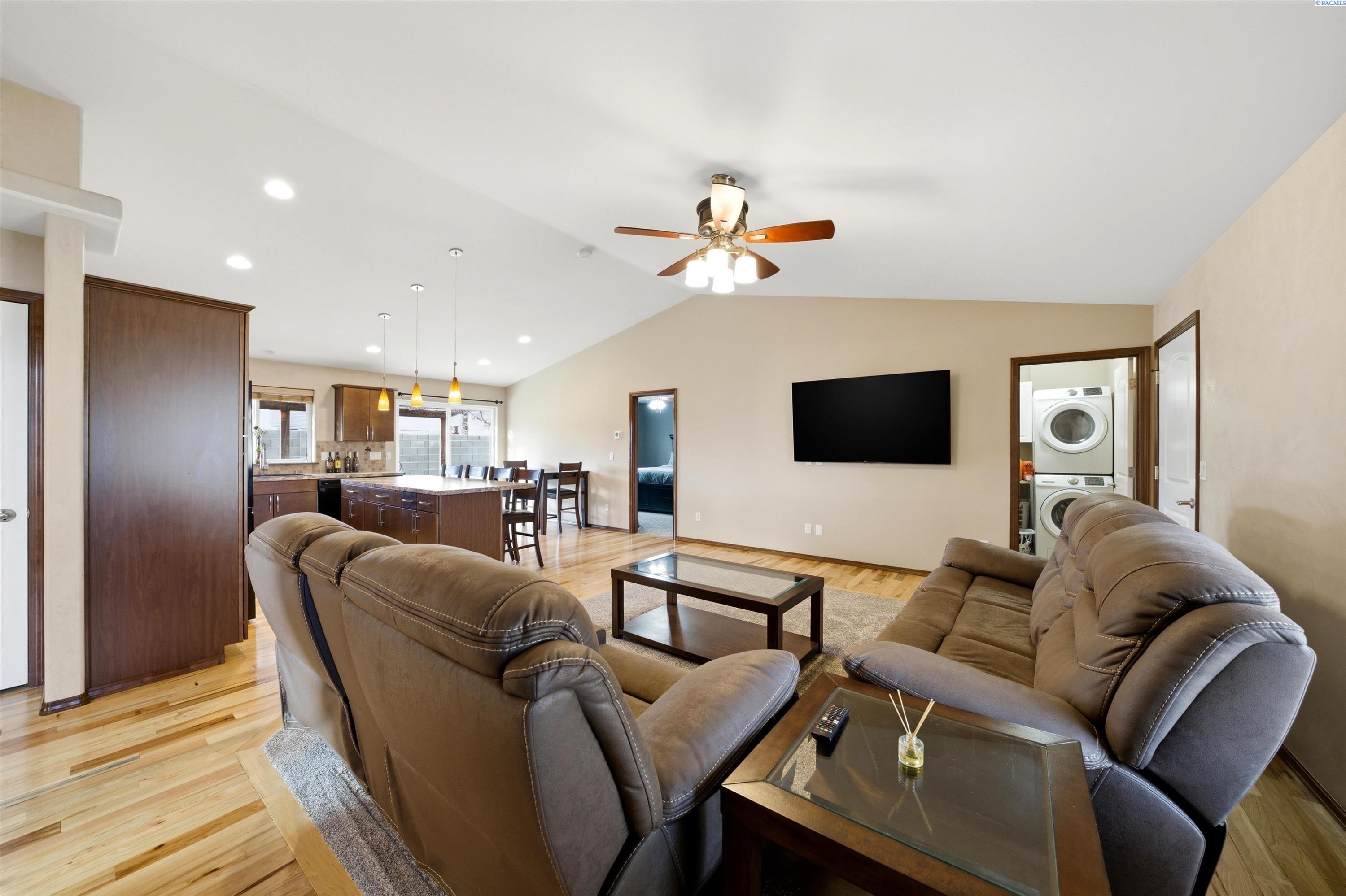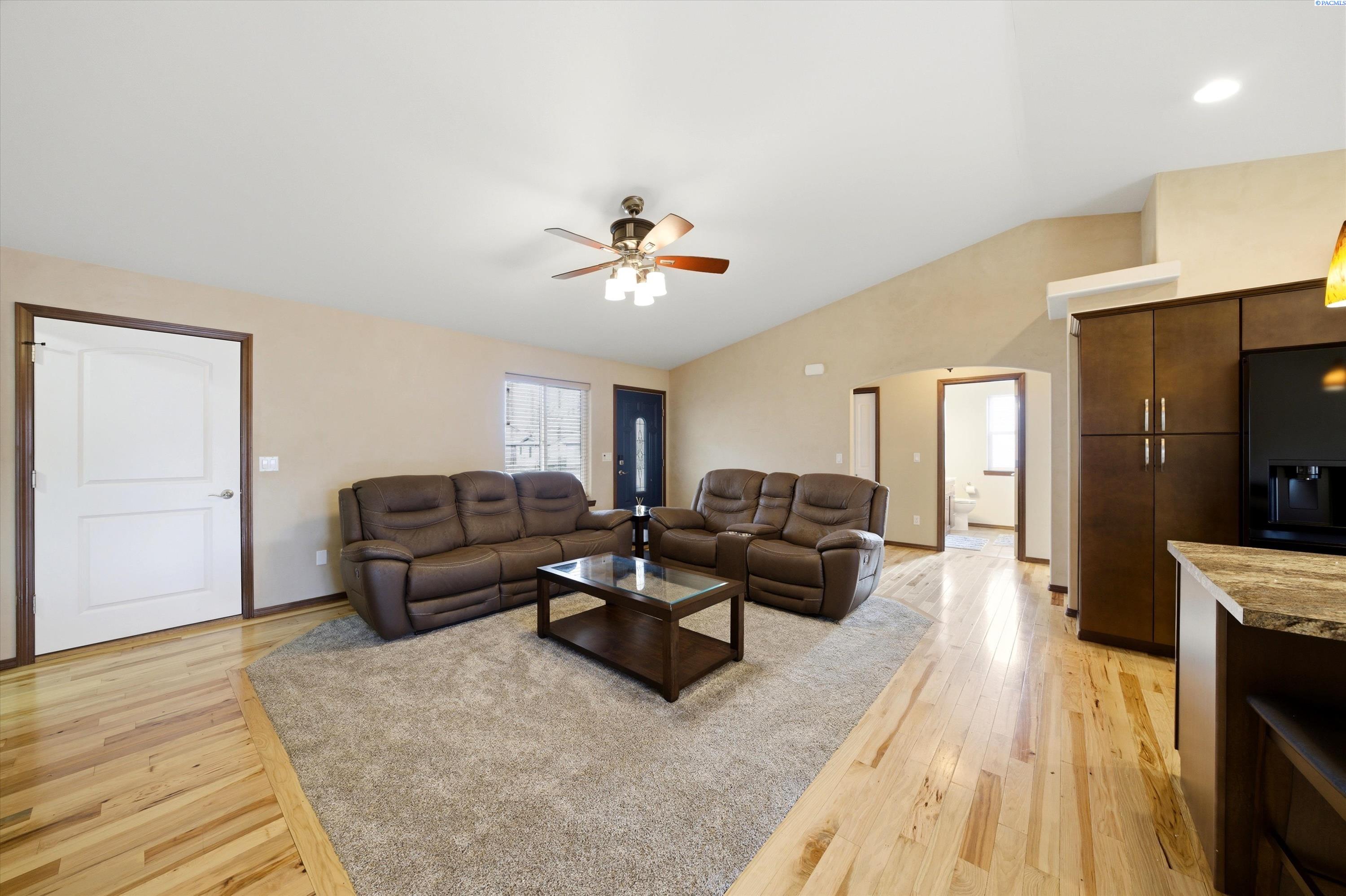 MLS# 291547 Welcome to this beautifully maintained home, ideally located in the heart of Central Kennewick. Thoughtfully updated with fresh interior paint and updated modern appliances, this home offers a clean, move-in-ready feel with stylish touches throughout. Step inside to an inviting open-concept floor plan with vaulted ceilings throughout, designed for both everyday living and effortless entertaining, and a large master suite. The spacious kitchen is the centerpiece of the home, featuring an oversized island that provides ample prep space, tiled backsplash with substantial amount of cabinetry, seating, and a natural gathering place for family and guests. Step out back to a private back patio with a large pergola and low maintenance astroturf that is pet friendly. The seamless flow between the kitchen, dining, and living areas creates a bright and airy atmosphere. Carpet is less than one year old and you will find tile in the bathrooms. Master bedroom included 2 walk-in closets. The laundry room is tiled and includes extra counter space and cabinets above for optimal storage. This home is move in ready, call your favorite realtor today!