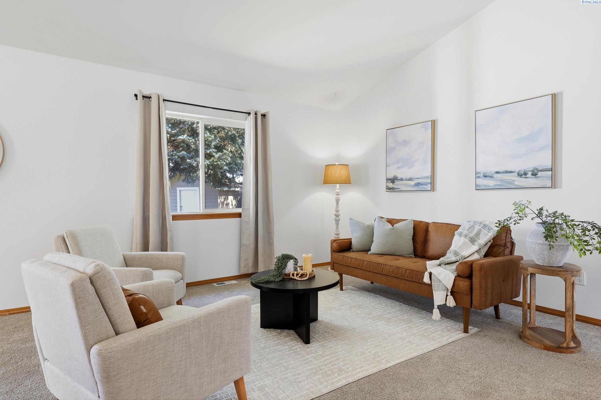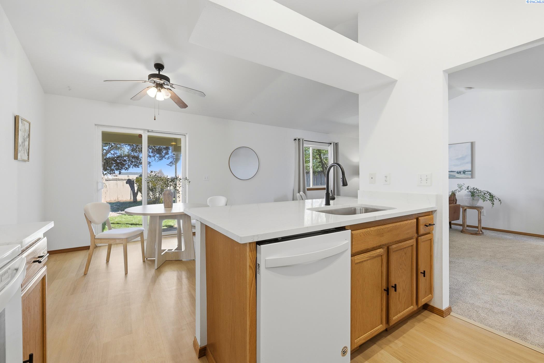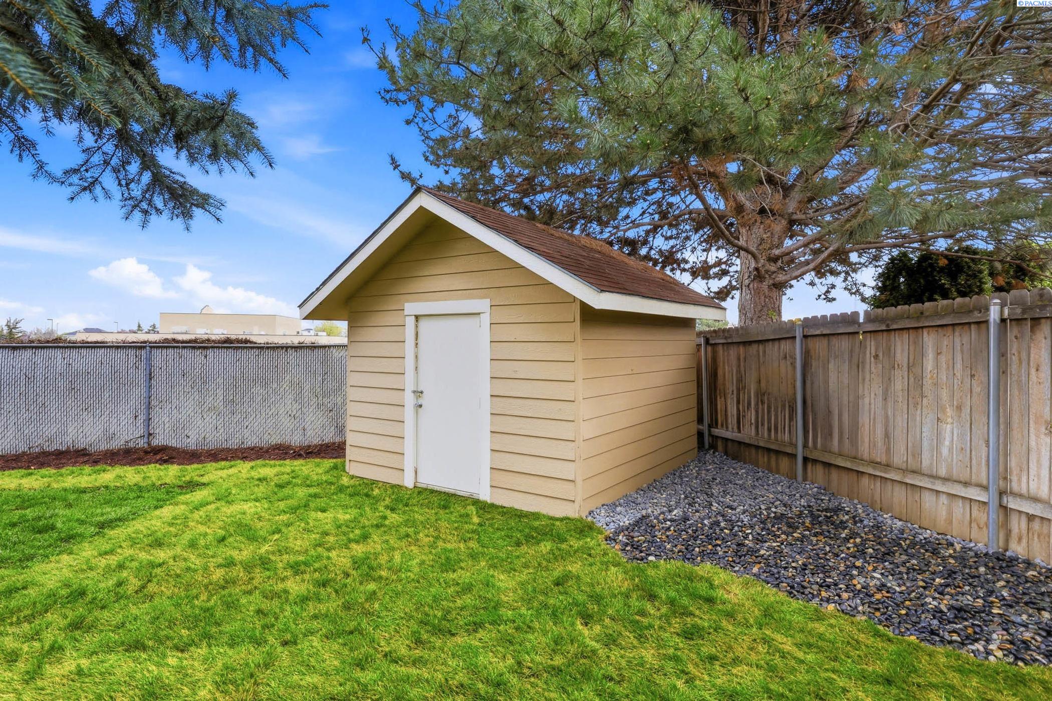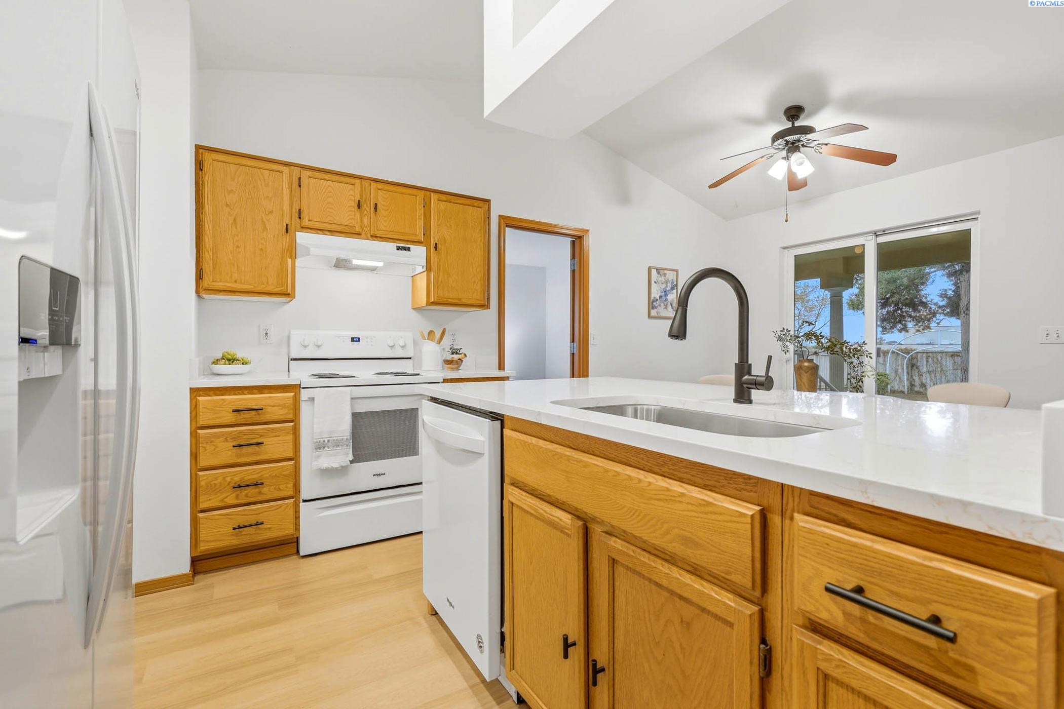 Welcome to 2303 S. Arthur Loop, a meticulously refreshed haven in the heart of Kennewick. This charming 3 bedroom, 2 bathroom rambler offers 1,120 square feet of updated living space. Step inside to brand new interior paint that brightens every corner, complimented by all new carpet and sleek laminate floors. The kitchen boasts gorgeous new quartz countertops and modern fixtures, thoughtfully designed with an open dining area. All bathrooms have quartz counters, new lighting, and fixtures. Outside enjoy a beautifully landscaped and large fully fenced yard with a covered patio perfect for entertaining or relaxing. The property also contains a 80 square foot shed built on a concrete slab perfect for storage or a some fun projects and backs up to a serene green belt offering a private peaceful backdrop with no neighbors behind you. The spacious two car garage includes built in shelving, providing ample storage and organization. This home really is move in ready, complete with all major appliances including washer, dryer, and refrigerator!