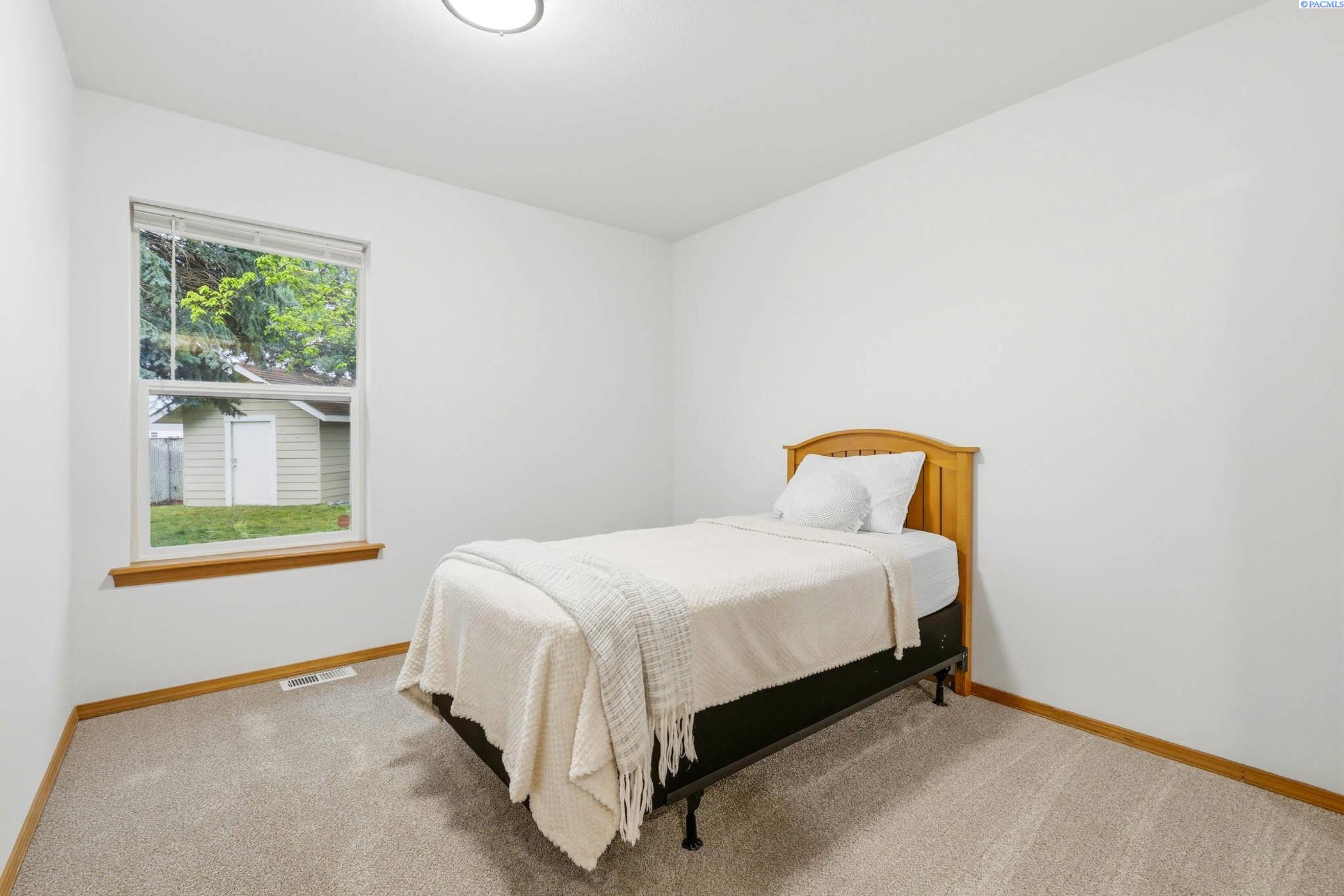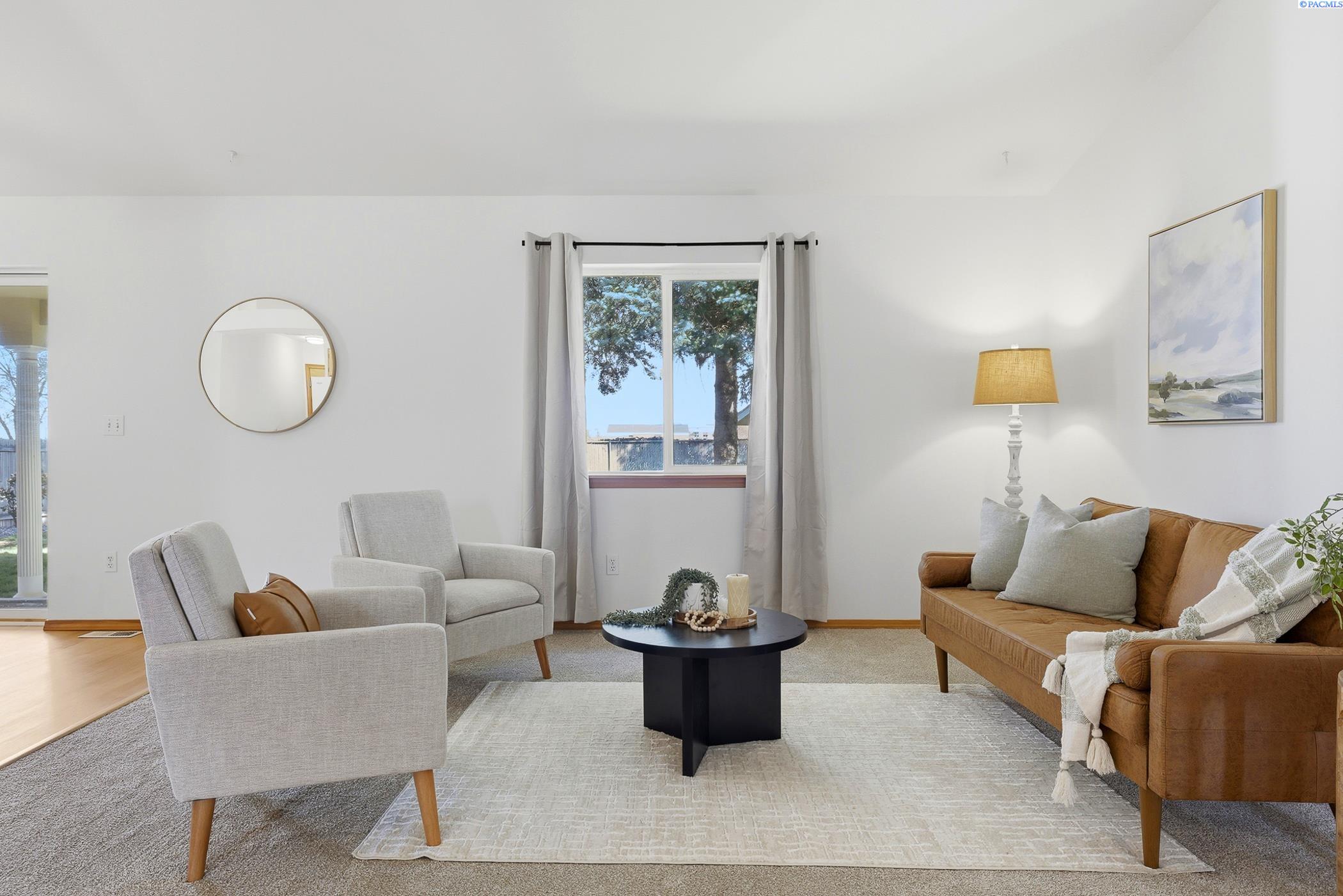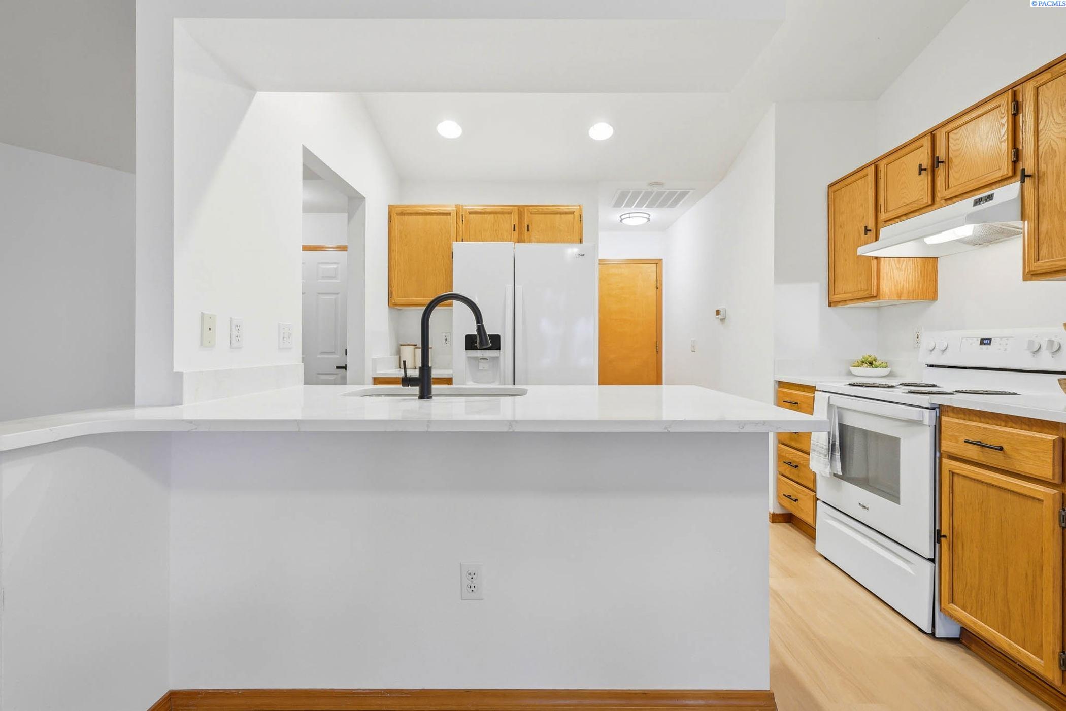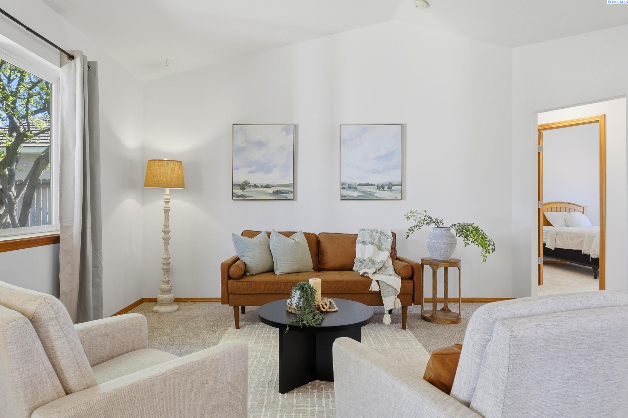 Welcome to 2303 S. Arthur Loop, a meticulously refreshed haven in the heart of Kennewick. This charming 3 bedroom, 2 bathroom rambler offers 1,120 square feet of updated living space. Step inside to brand new interior paint that brightens every corner, complimented by all new carpet and sleek laminate floors. The kitchen boasts gorgeous new quartz countertops and modern fixtures, thoughtfully designed with an open dining area. All bathrooms have quartz counters, new lighting, and fixtures. Outside enjoy a beautifully landscaped and large fully fenced yard with a covered patio perfect for entertaining or relaxing. The property also contains a 80 square foot shed built on a concrete slab perfect for storage or a some fun projects and backs up to a serene green belt offering a private peaceful backdrop with no neighbors behind you. The spacious two car garage includes built in shelving, providing ample storage and organization. This home really is move in ready, complete with all major appliances including washer, dryer, and refrigerator!