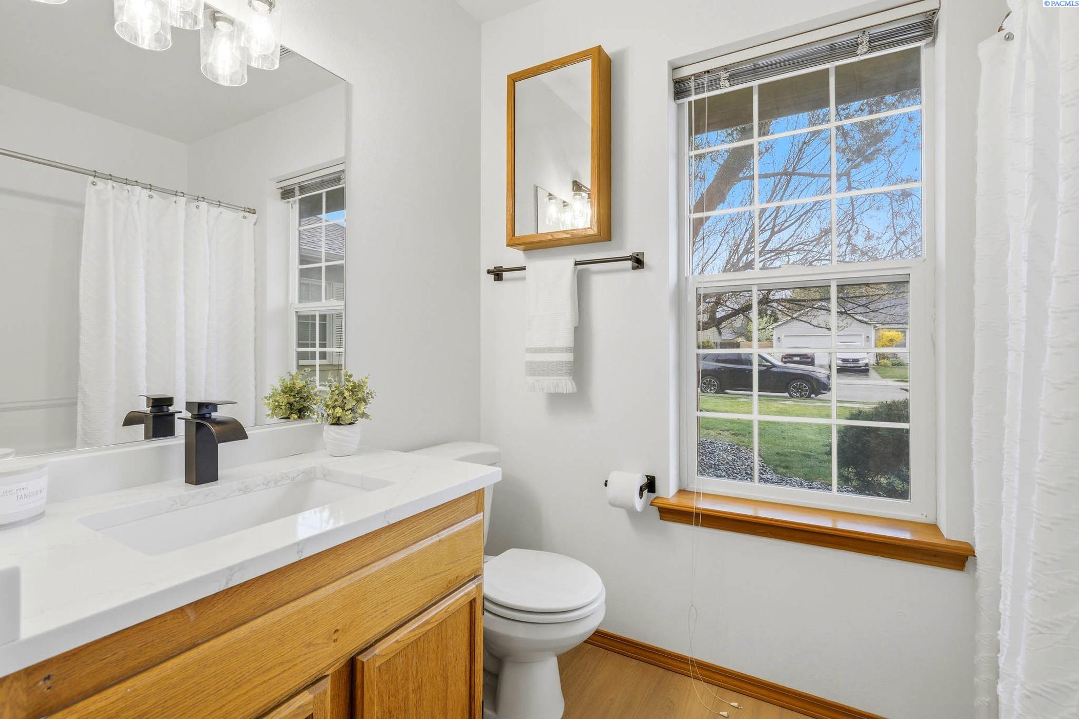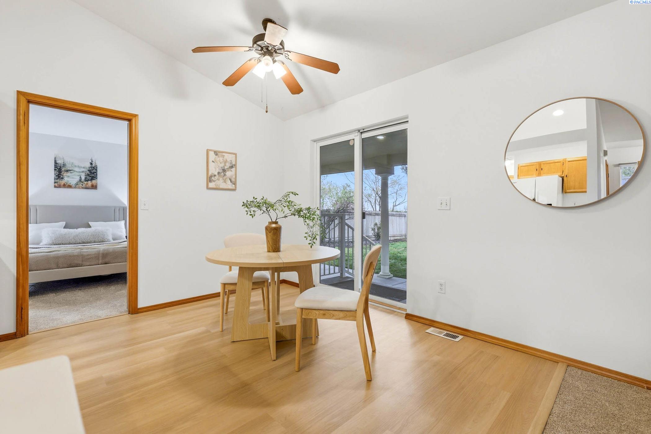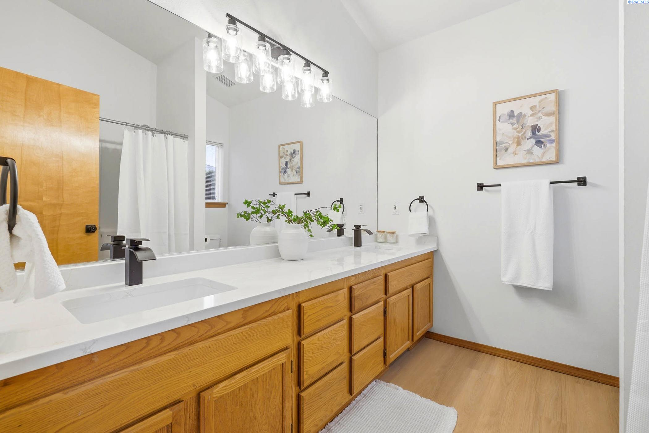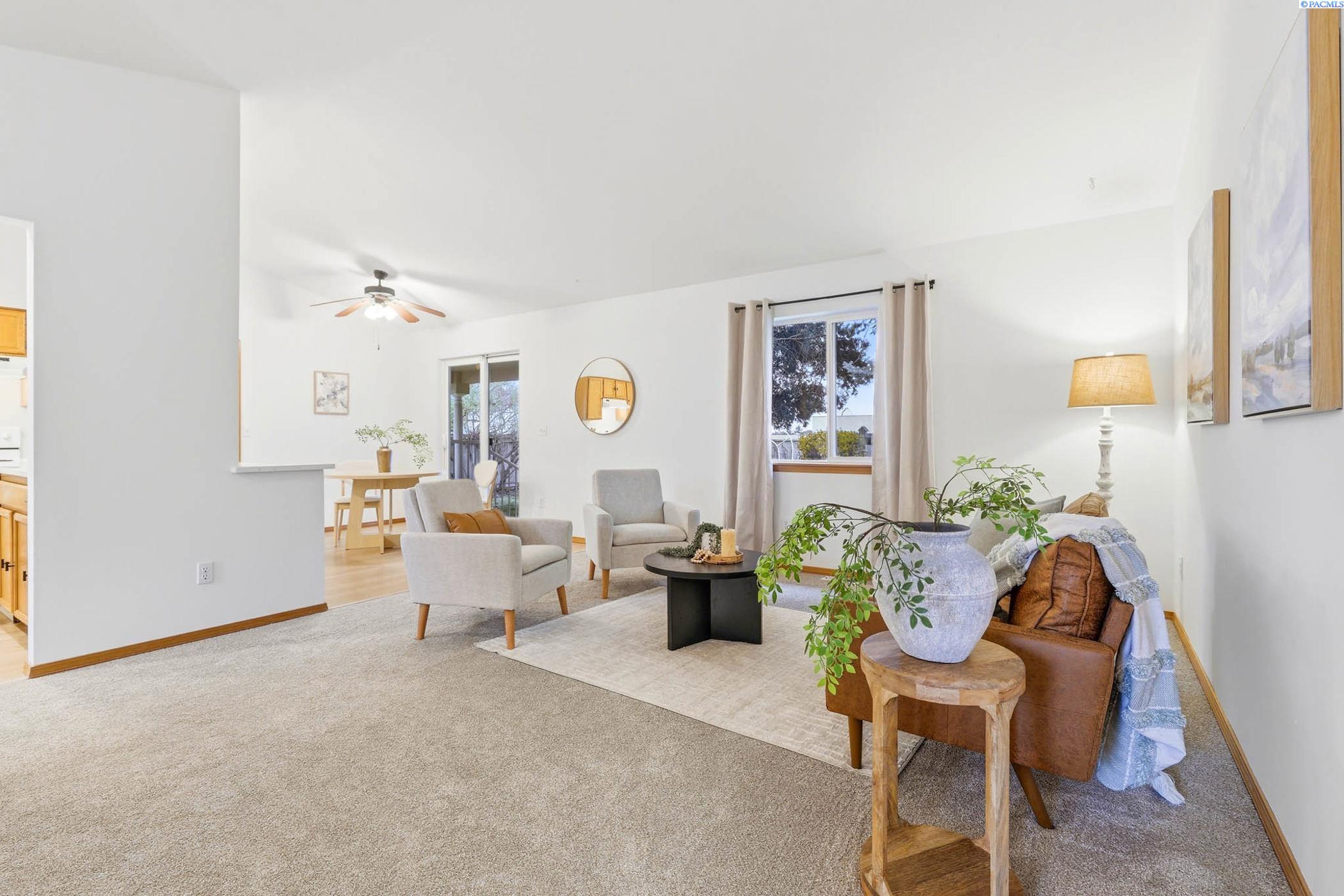 Welcome to 2303 S. Arthur Loop, a meticulously refreshed haven in the heart of Kennewick. This charming 3 bedroom, 2 bathroom rambler offers 1,120 square feet of updated living space. Step inside to brand new interior paint that brightens every corner, complimented by all new carpet and sleek laminate floors. The kitchen boasts gorgeous new quartz countertops and modern fixtures, thoughtfully designed with an open dining area. All bathrooms have quartz counters, new lighting, and fixtures. Outside enjoy a beautifully landscaped and large fully fenced yard with a covered patio perfect for entertaining or relaxing. The property also contains a 80 square foot shed built on a concrete slab perfect for storage or a some fun projects and backs up to a serene green belt offering a private peaceful backdrop with no neighbors behind you. The spacious two car garage includes built in shelving, providing ample storage and organization. This home really is move in ready, complete with all major appliances including washer, dryer, and refrigerator!
